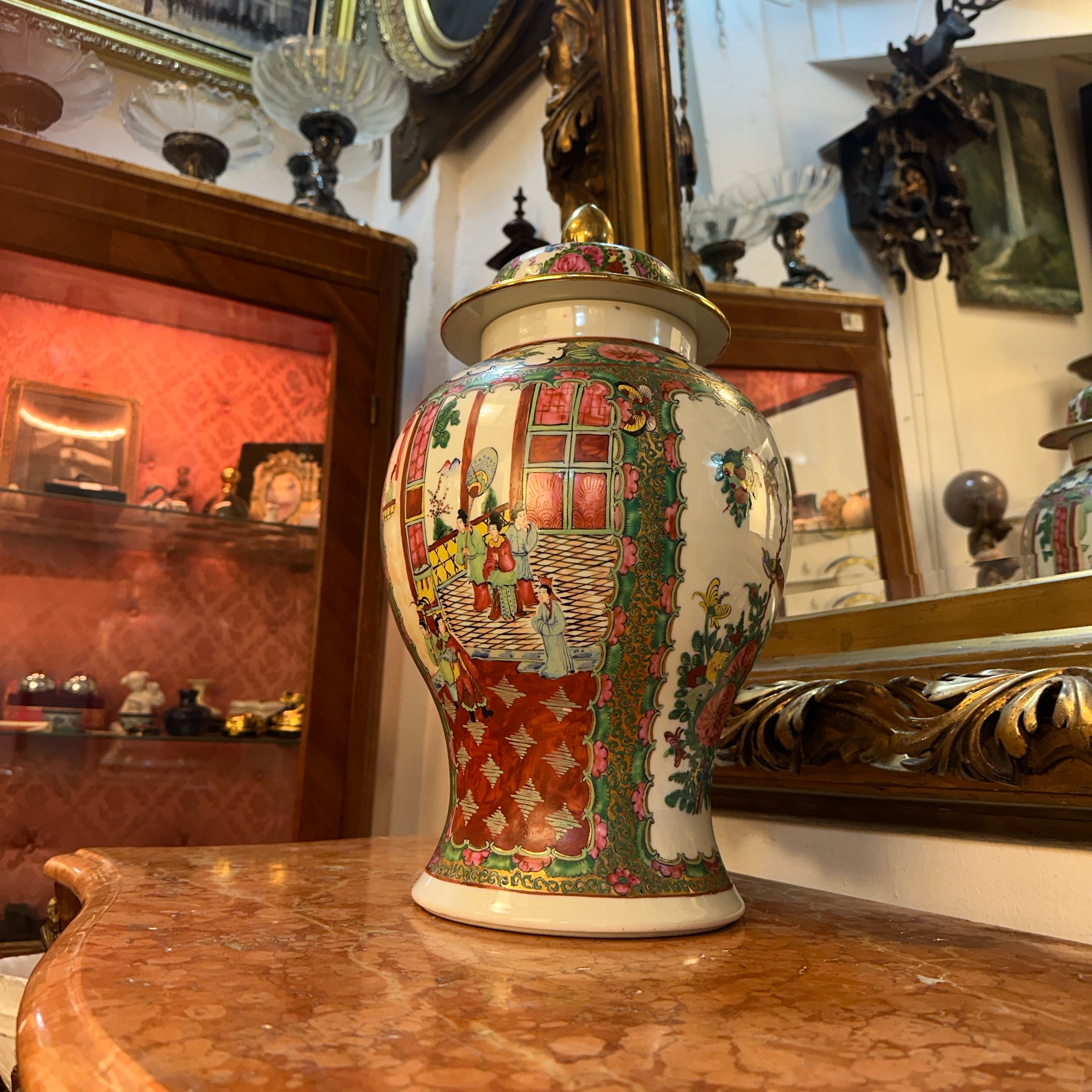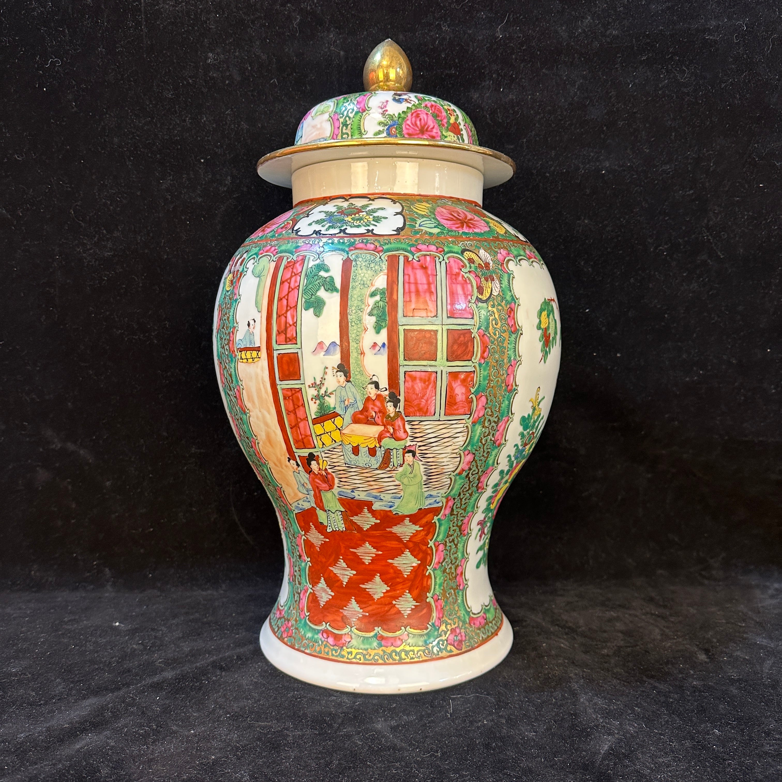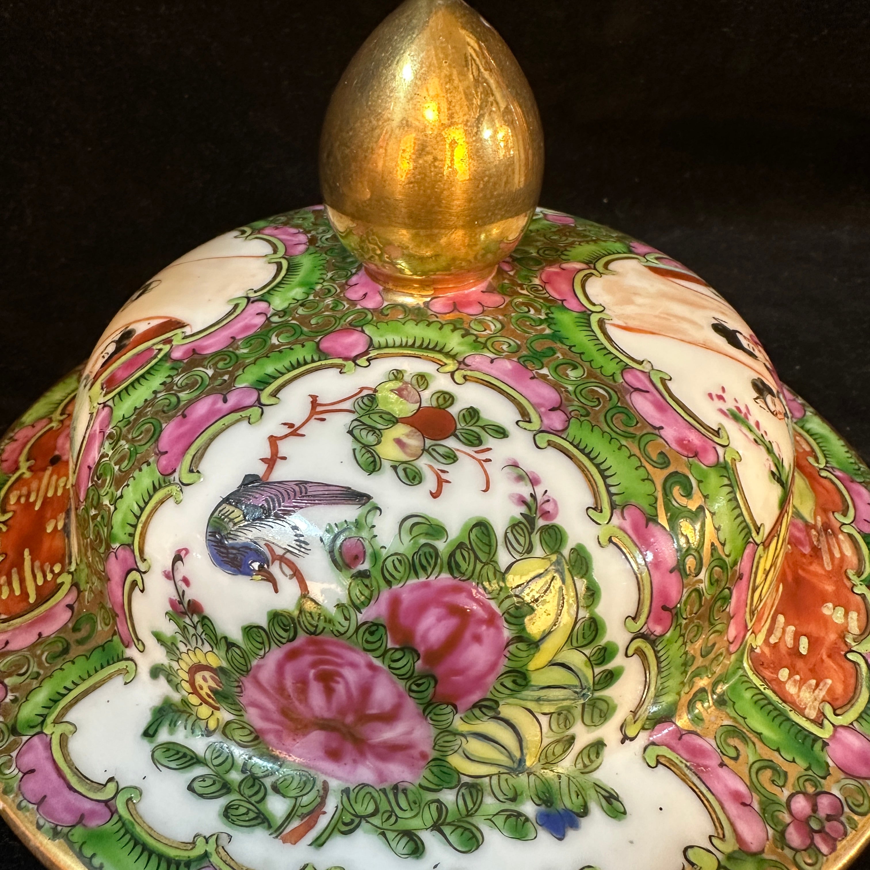 Espectacular potiche hecho de porcelana, de origen chino, con un esmaltado policromado y detalles pintados a mano, con diseños de flores, aves, en tonos verdes, amarillos y rosas, y detalles en dorado. Familia Rosa Medallion.