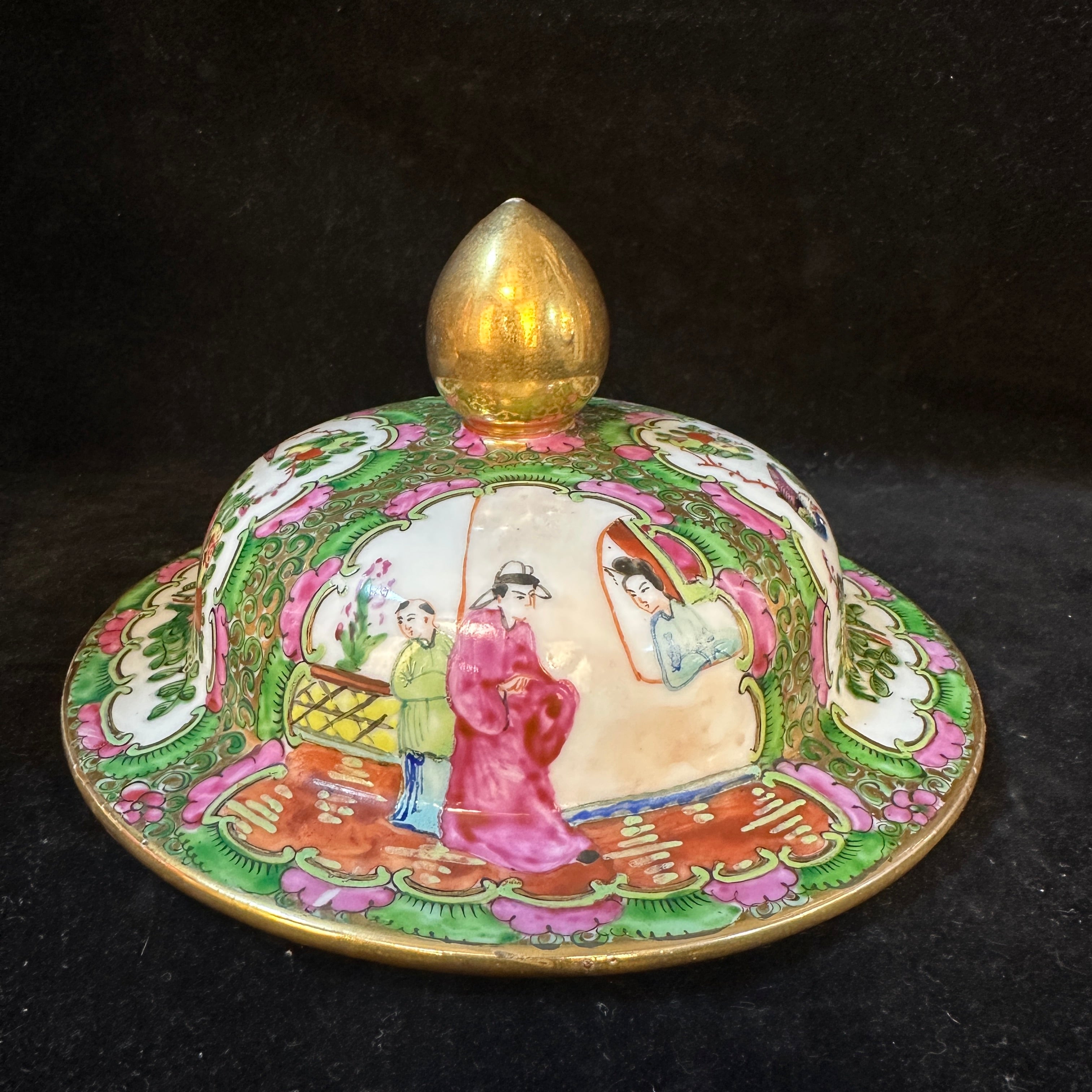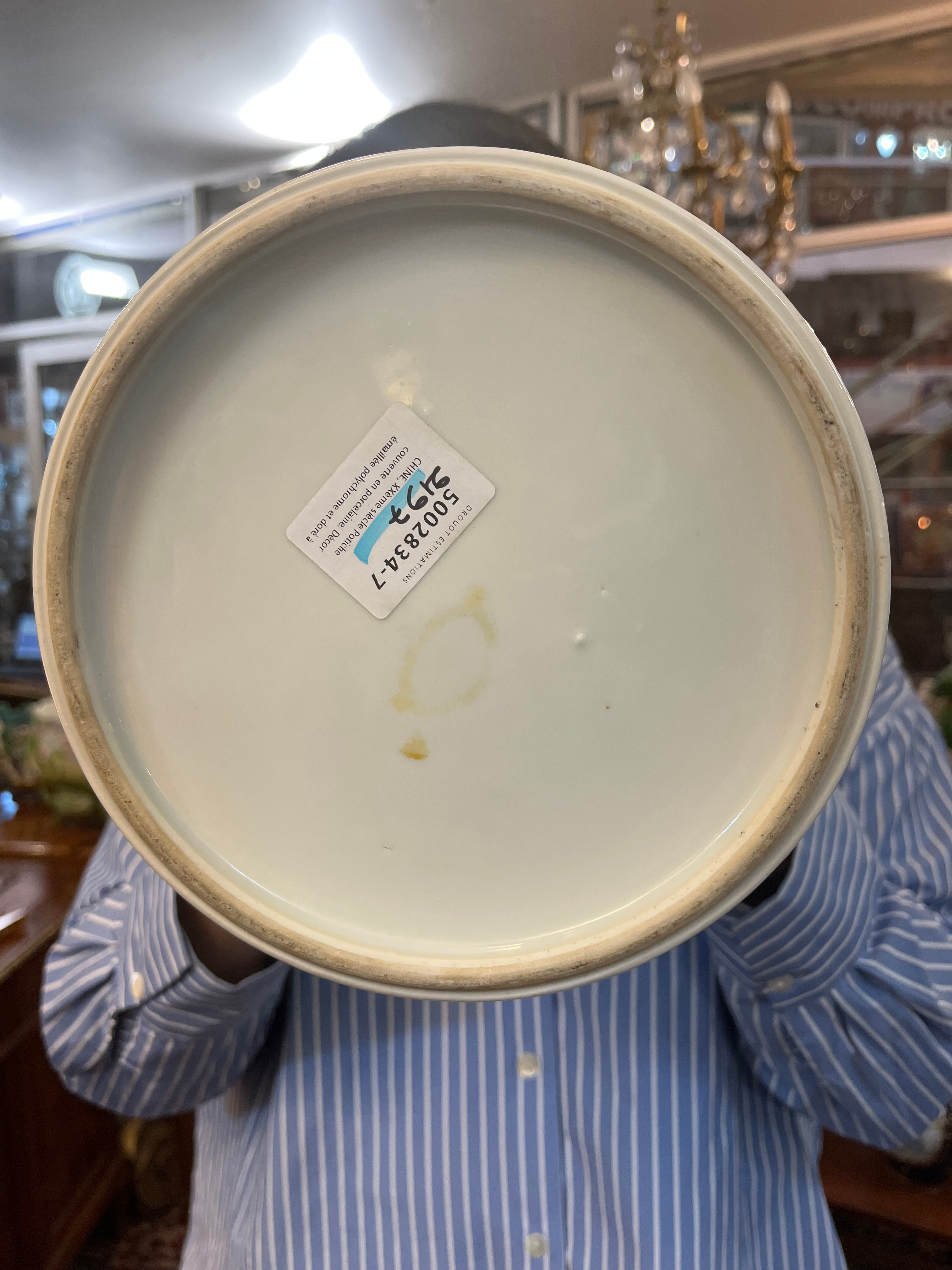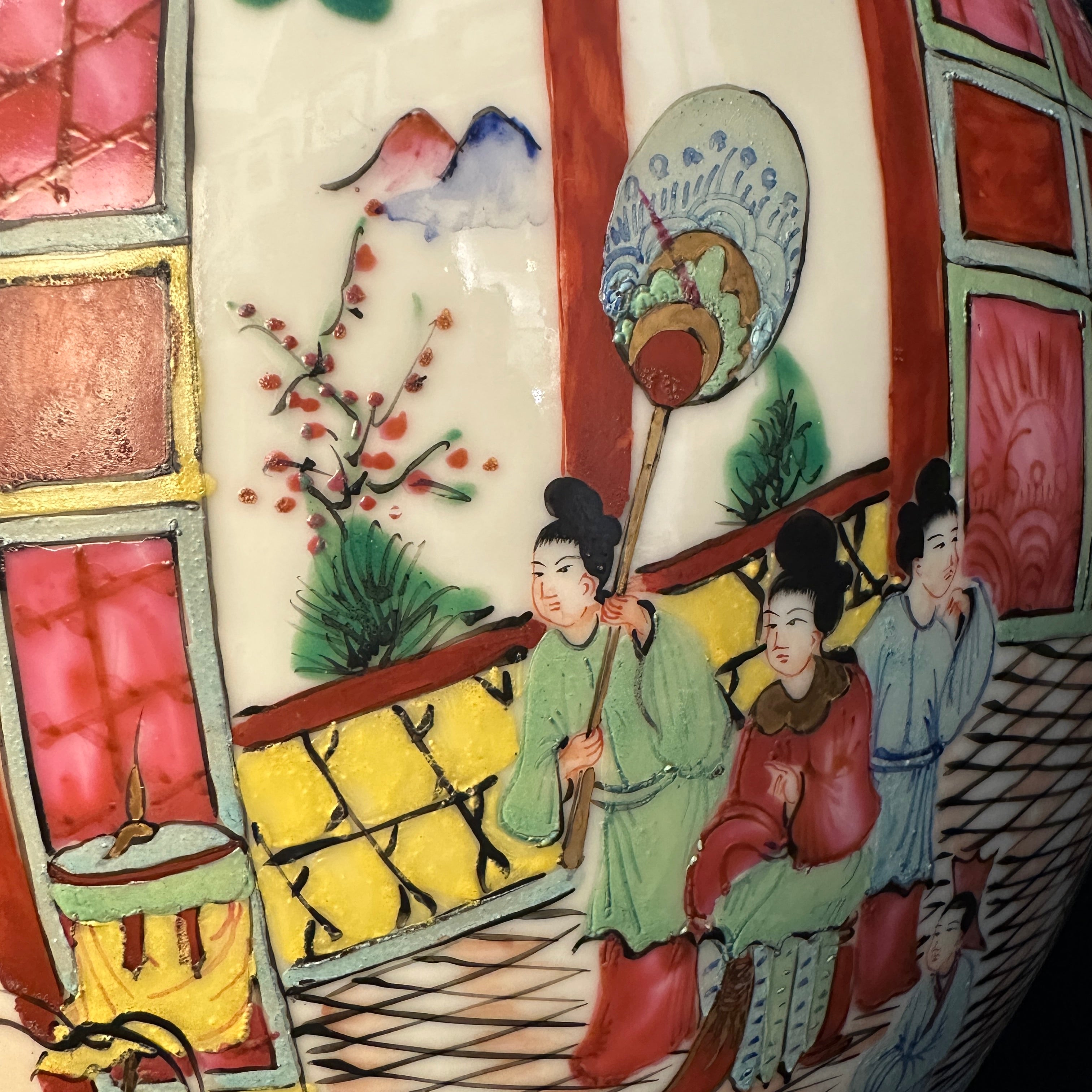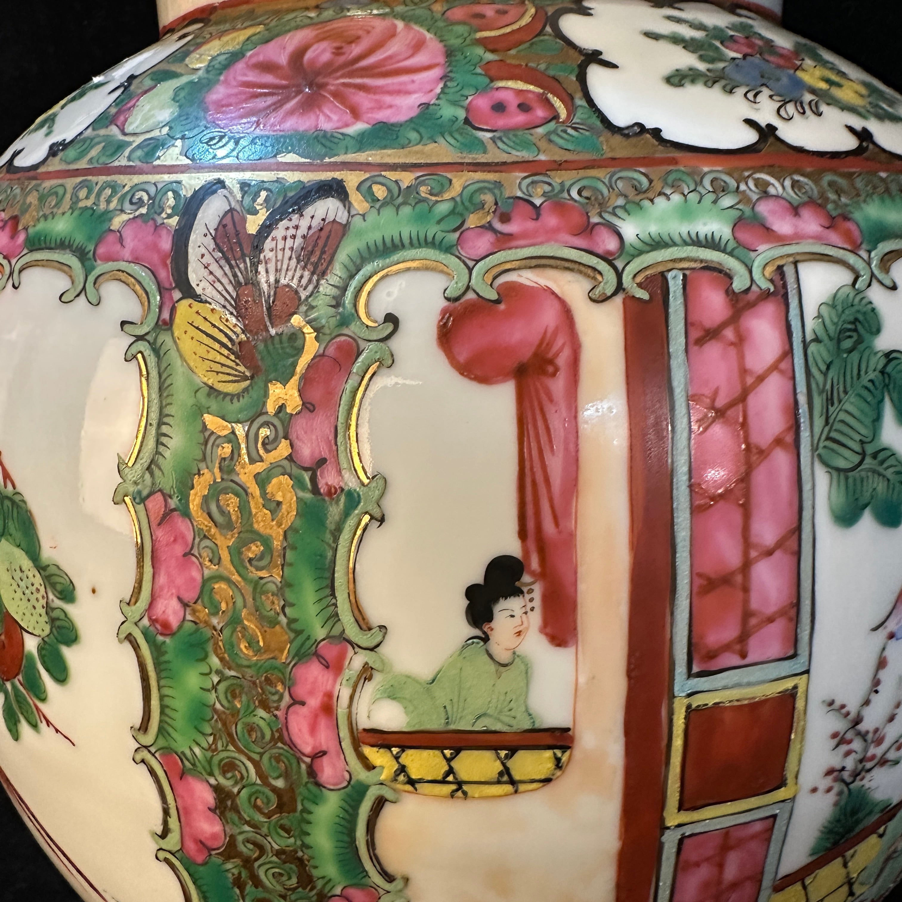 Espectacular potiche hecho de porcelana, de origen chino, con un esmaltado policromado y detalles pintados a mano, con diseños de flores, aves, en tonos verdes, amarillos y rosas, y detalles en dorado. Familia Rosa Medallion.