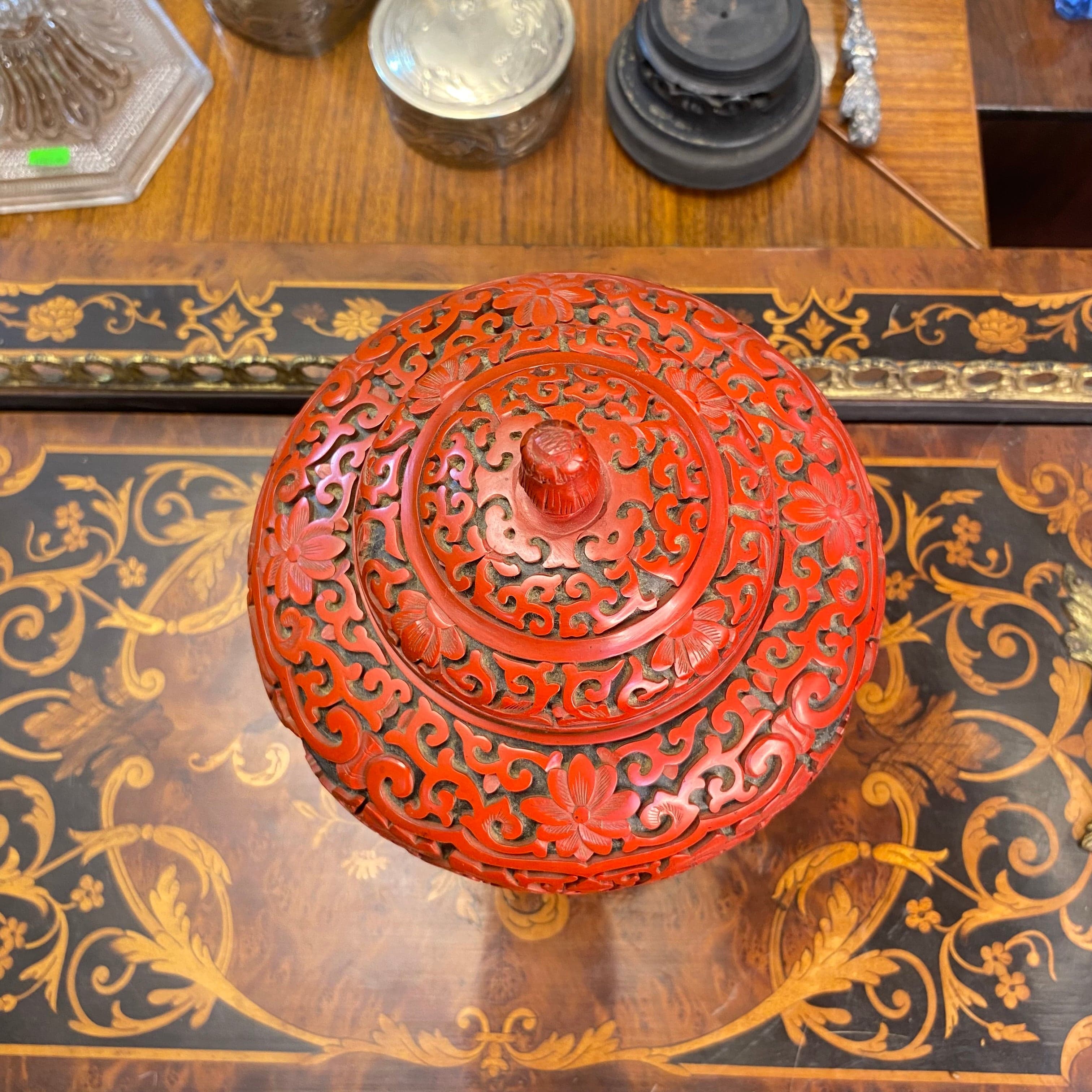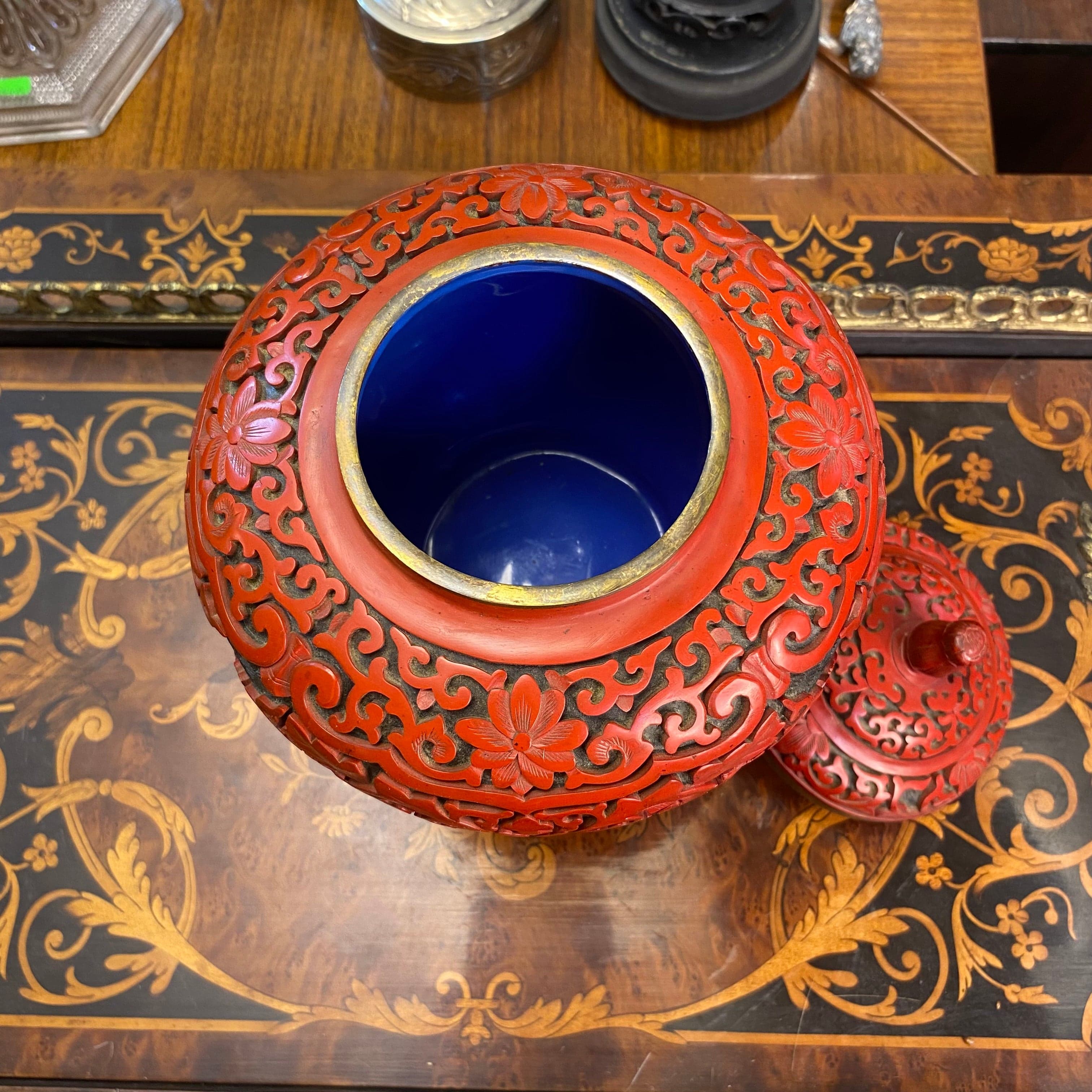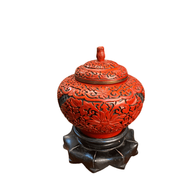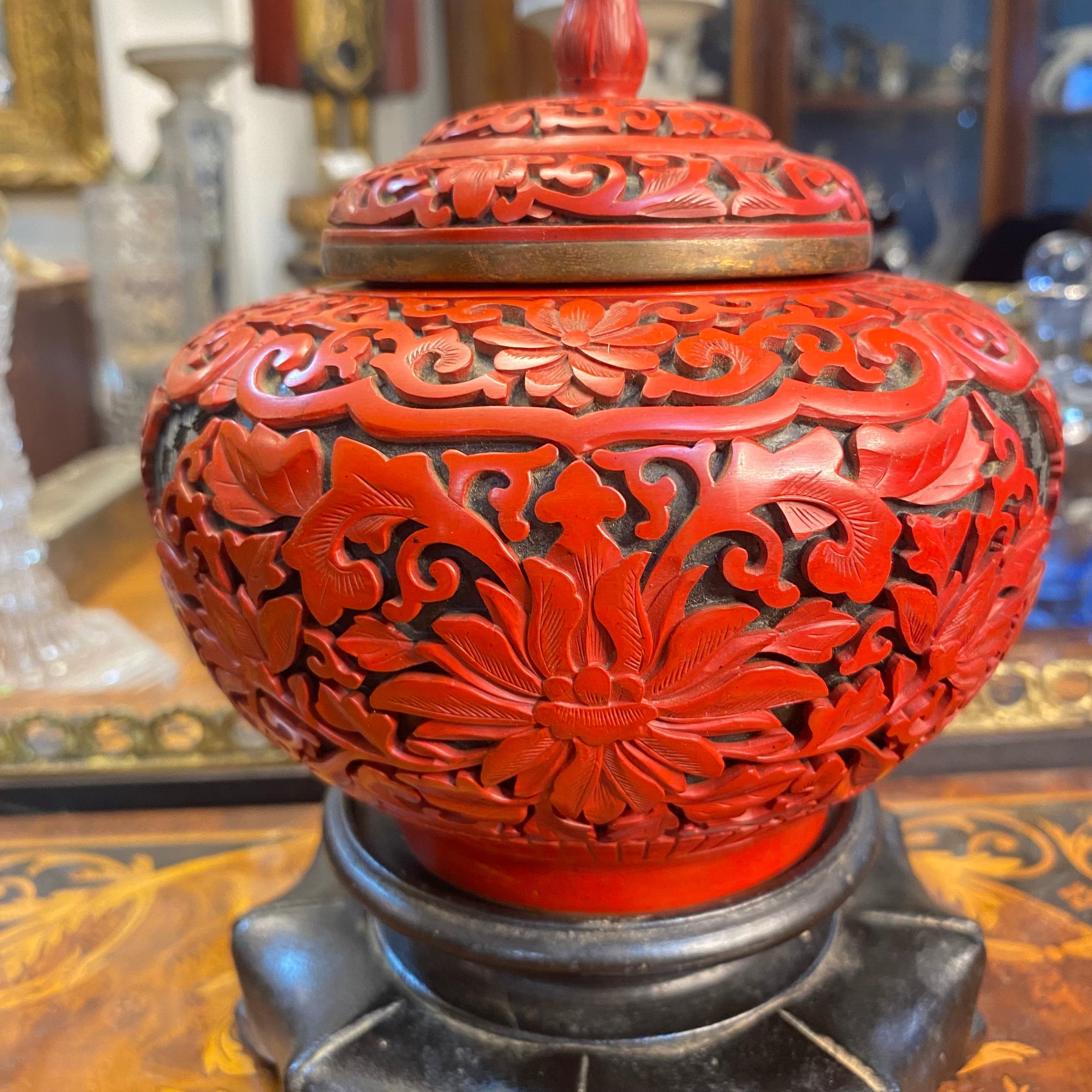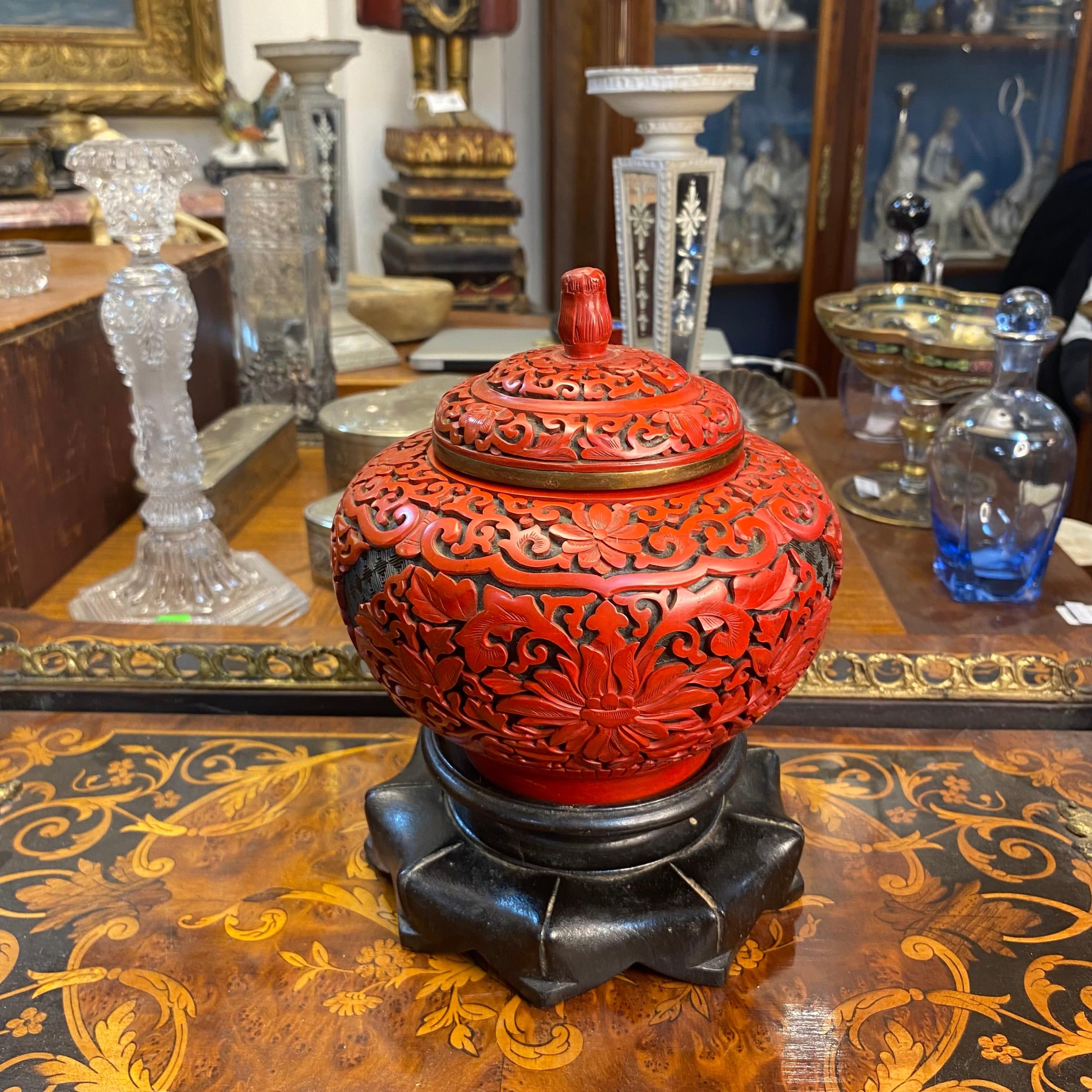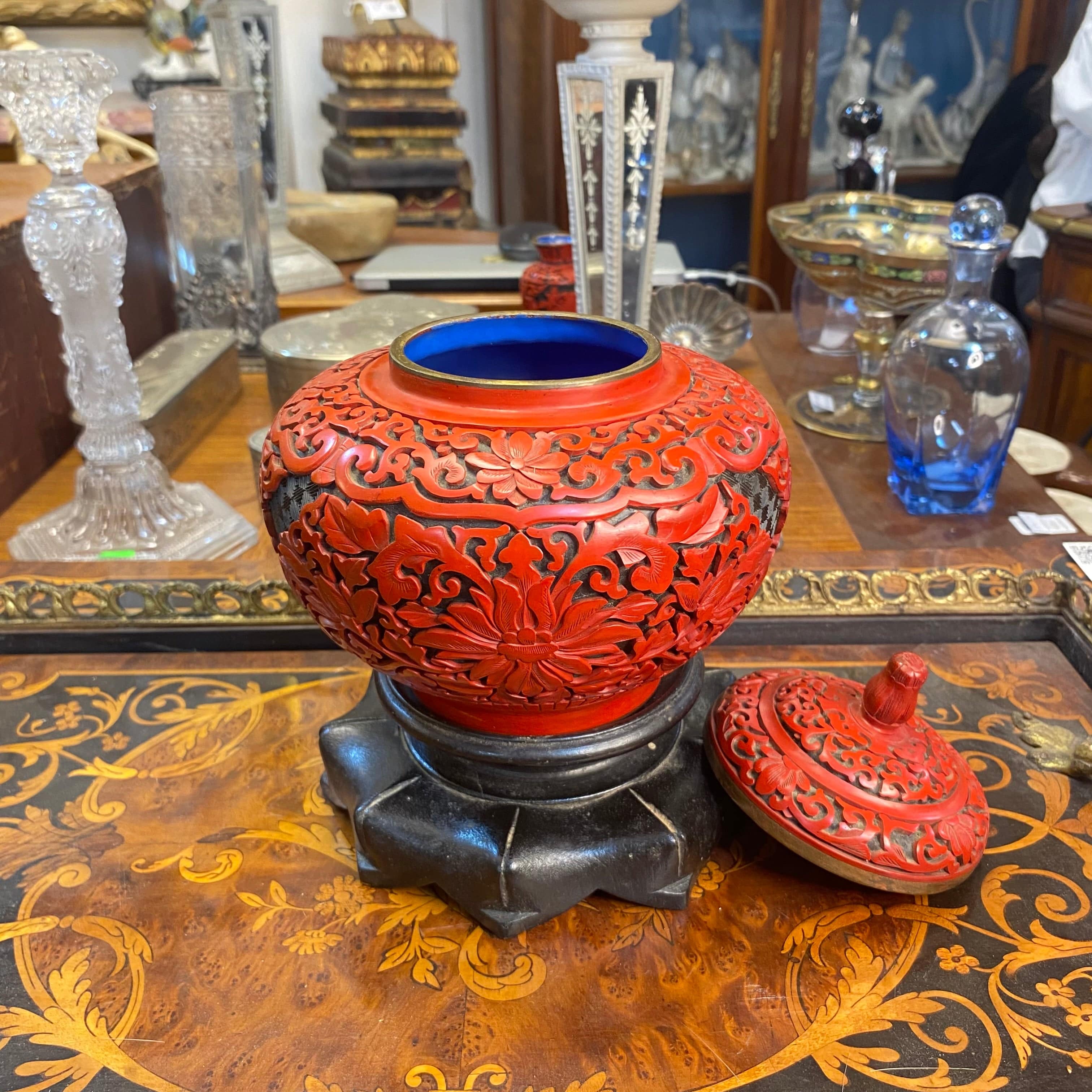 Hermoso potiche lacado en rojo chino, con peana de madera desmontable, diseño de flores y paisajes, interior azul.
