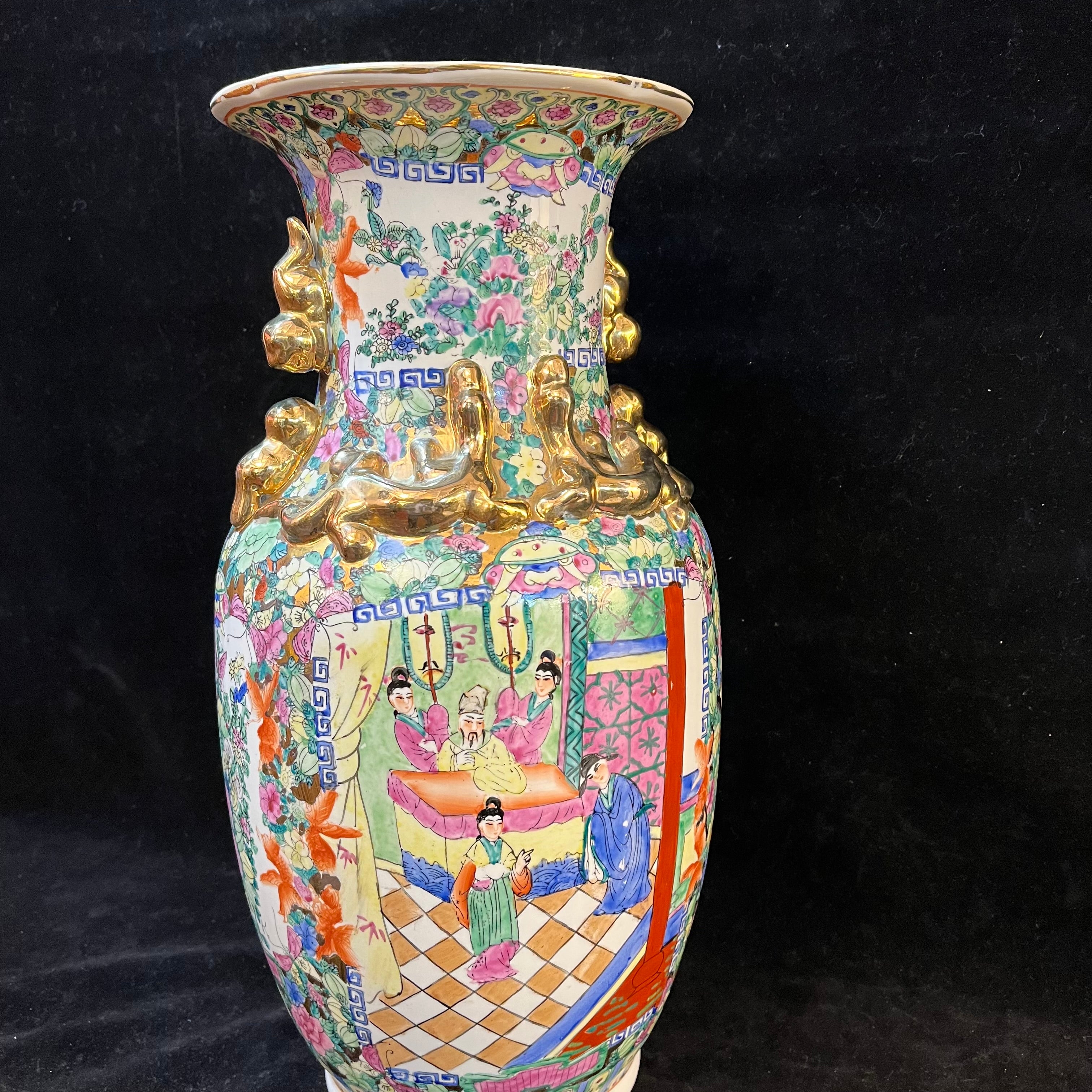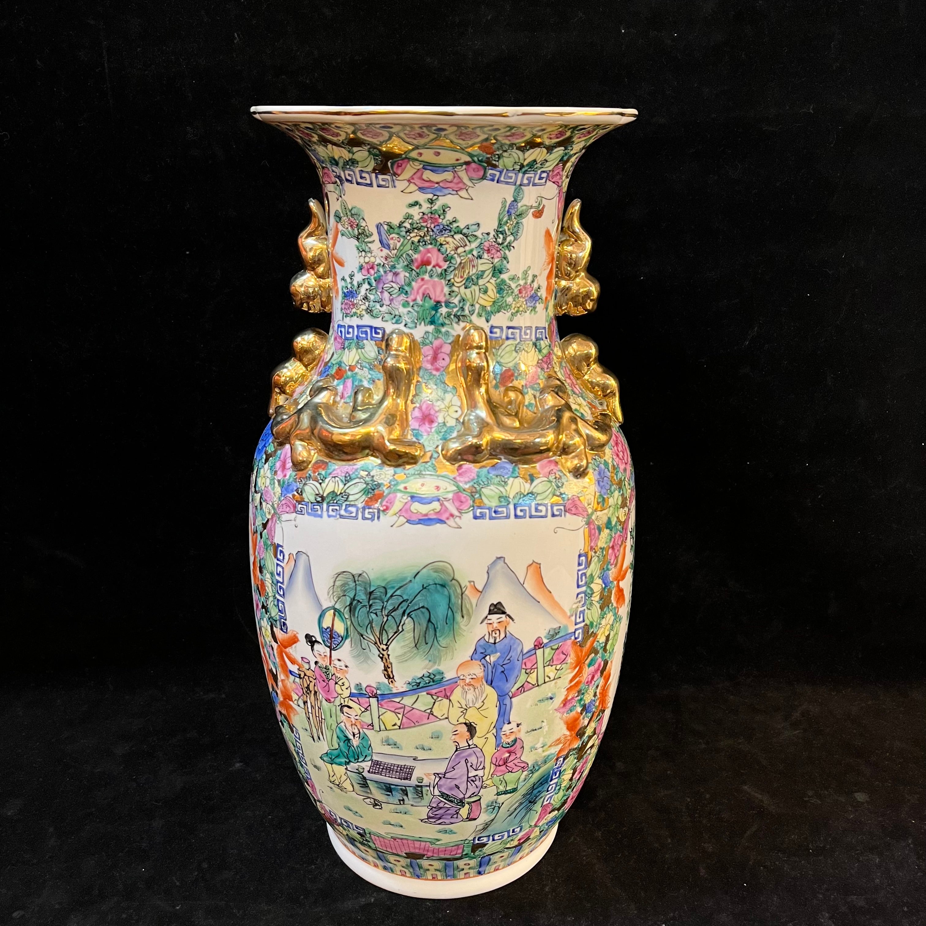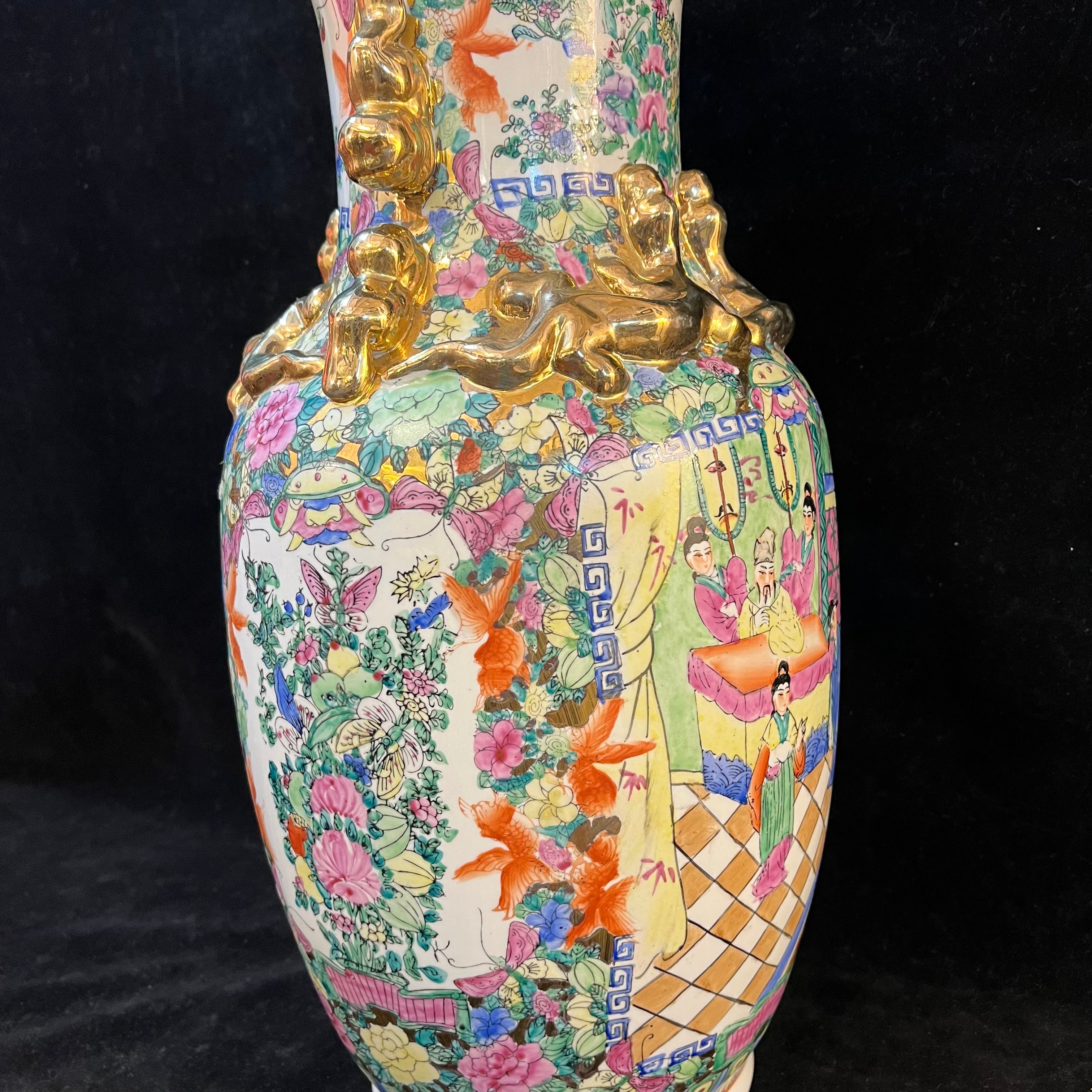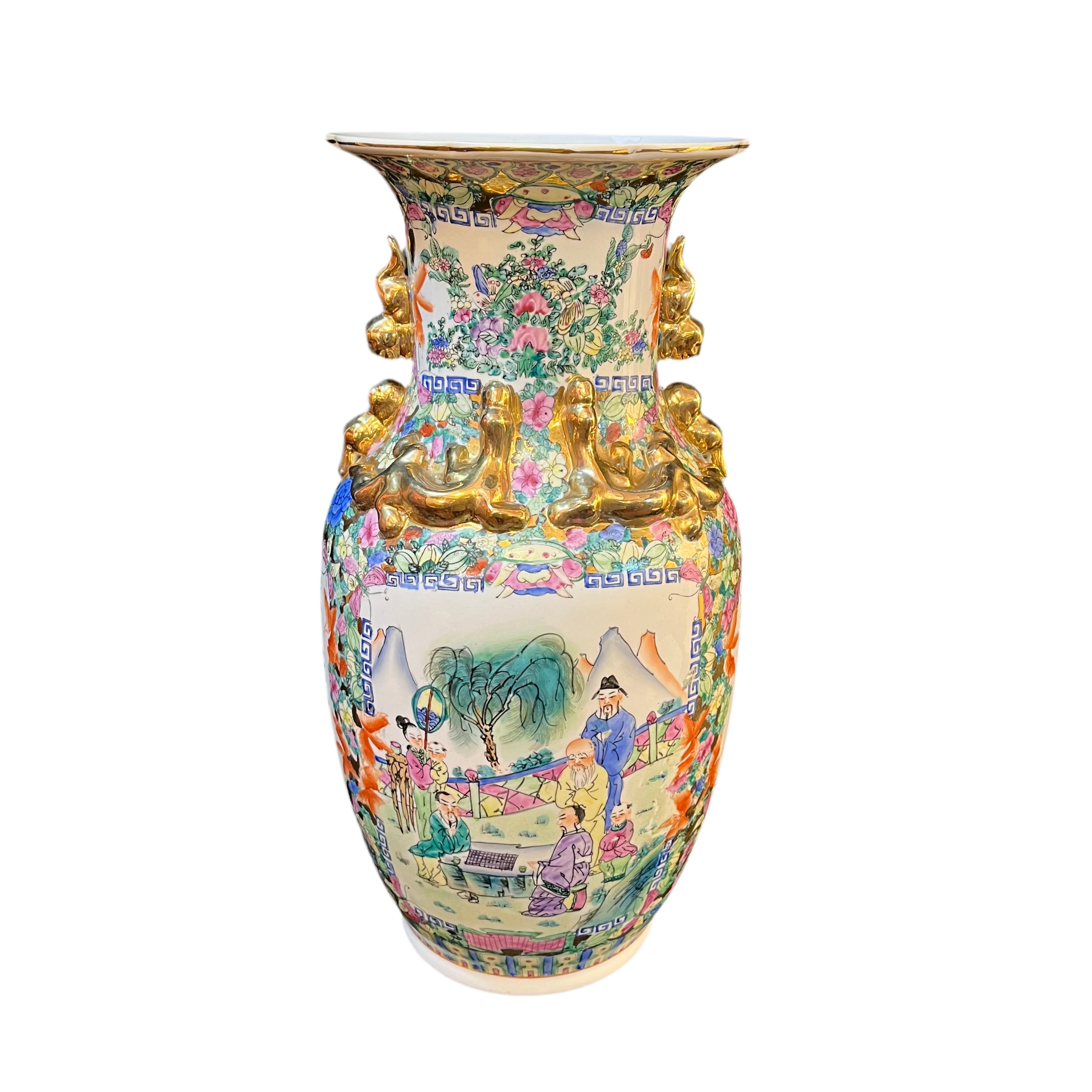 Espectacular potiche de porcelana, de origen chino, correspondiente al estilo Famille Rose, como se puede ver por la predominancia del color rosa en su composición, acompañado de verdes, amarillos, azules y preciosas terminaciones en dorado para sus asas. Sus escenas, pintadas a mano, representan el interior de un palacio en el que está un hombre noble con su servidumbre y composiciones de naturaleza, con plantas, flores y pajaritos.