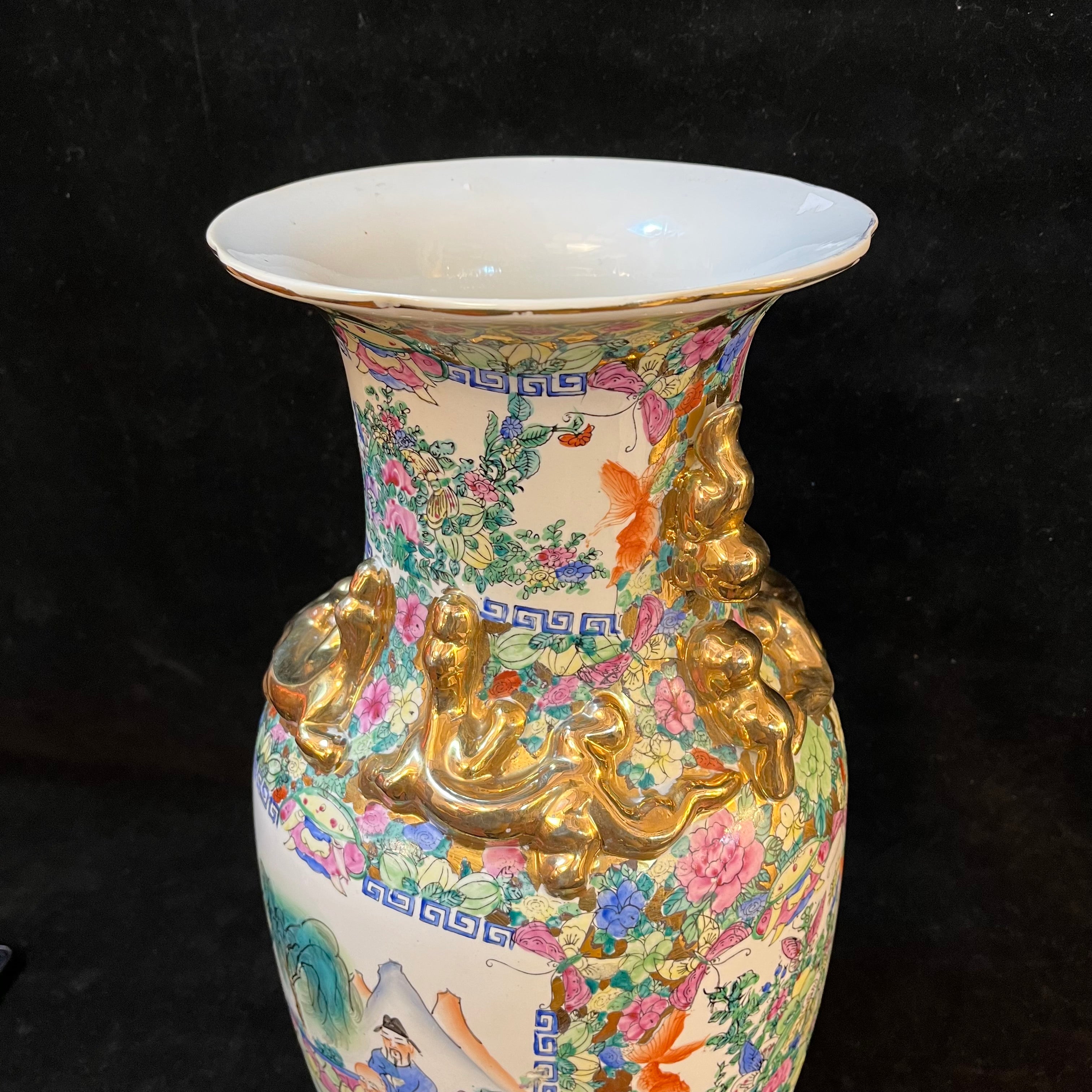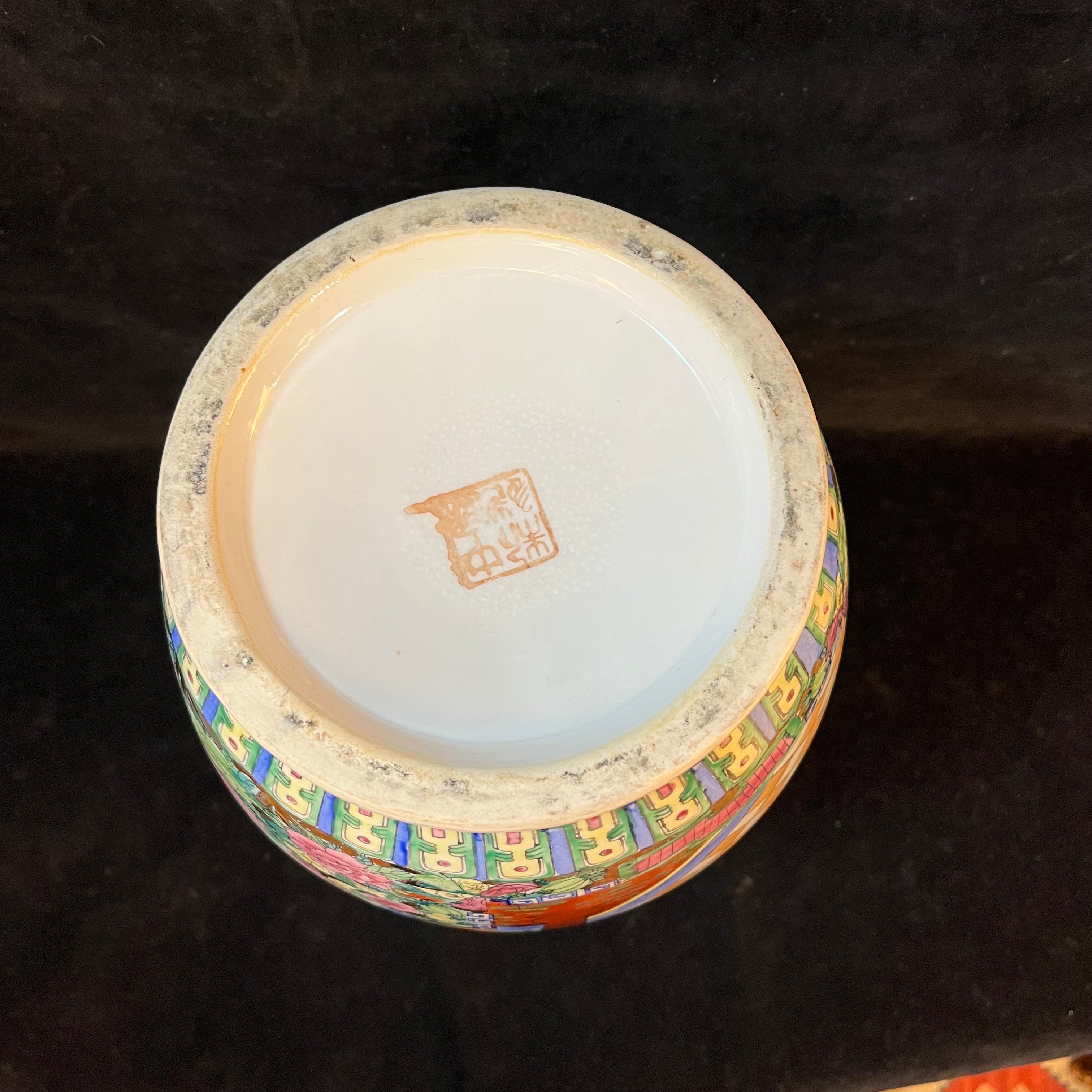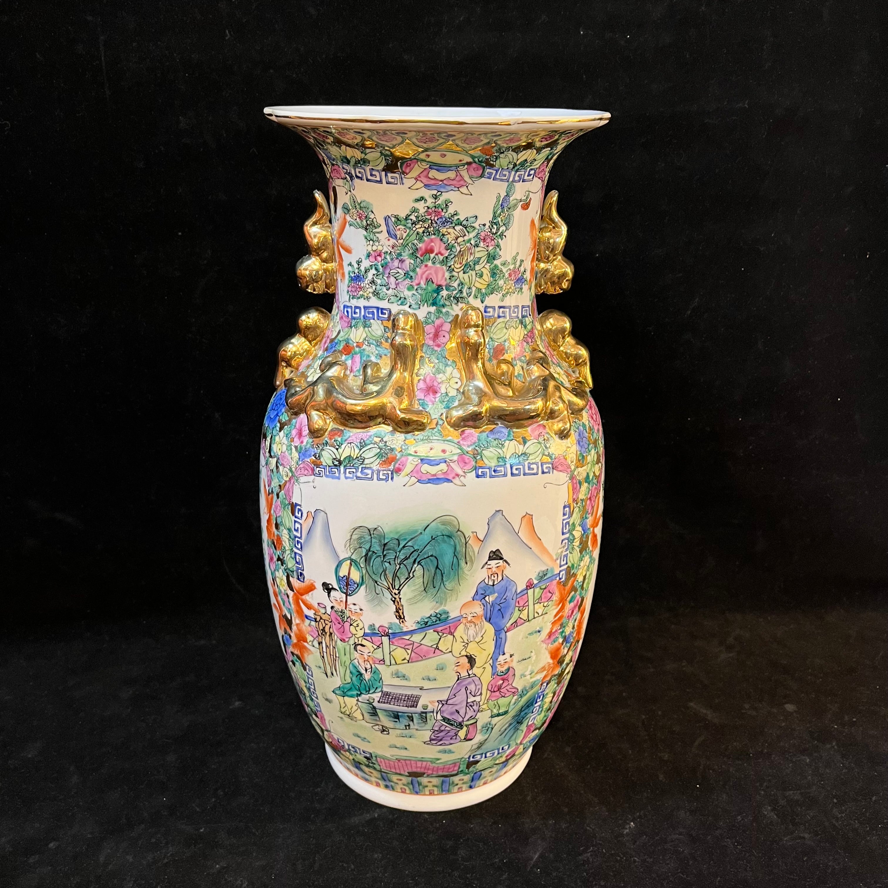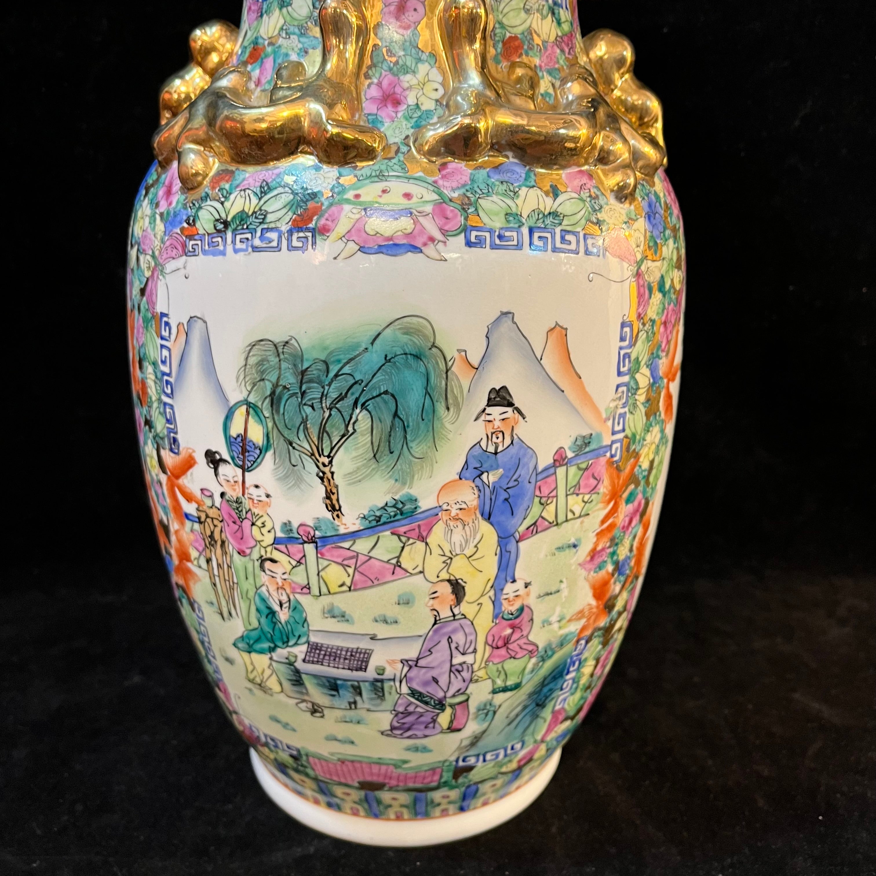 Espectacular potiche de porcelana, de origen chino, correspondiente al estilo Famille Rose, como se puede ver por la predominancia del color rosa en su composición, acompañado de verdes, amarillos, azules y preciosas terminaciones en dorado para sus asas. Sus escenas, pintadas a mano, representan el interior de un palacio en el que está un hombre noble con su servidumbre y composiciones de naturaleza, con plantas, flores y pajaritos.