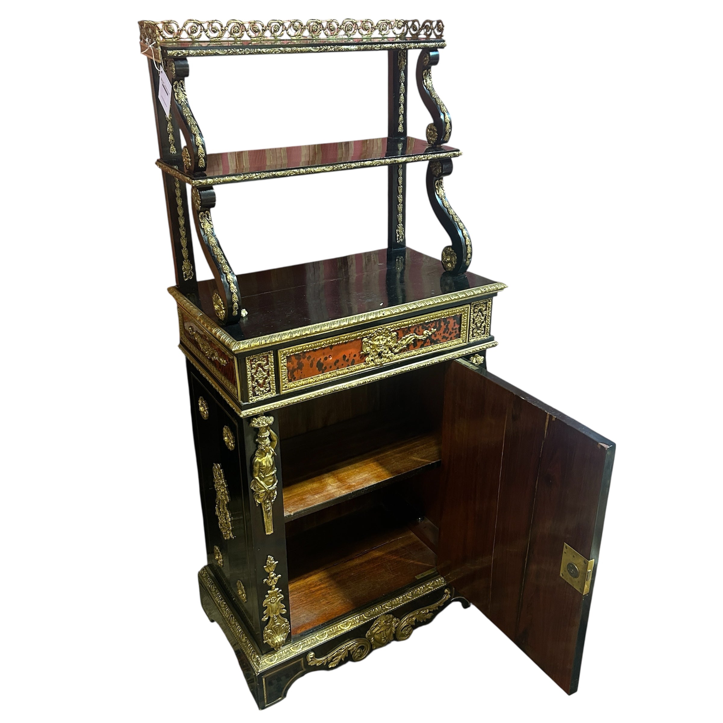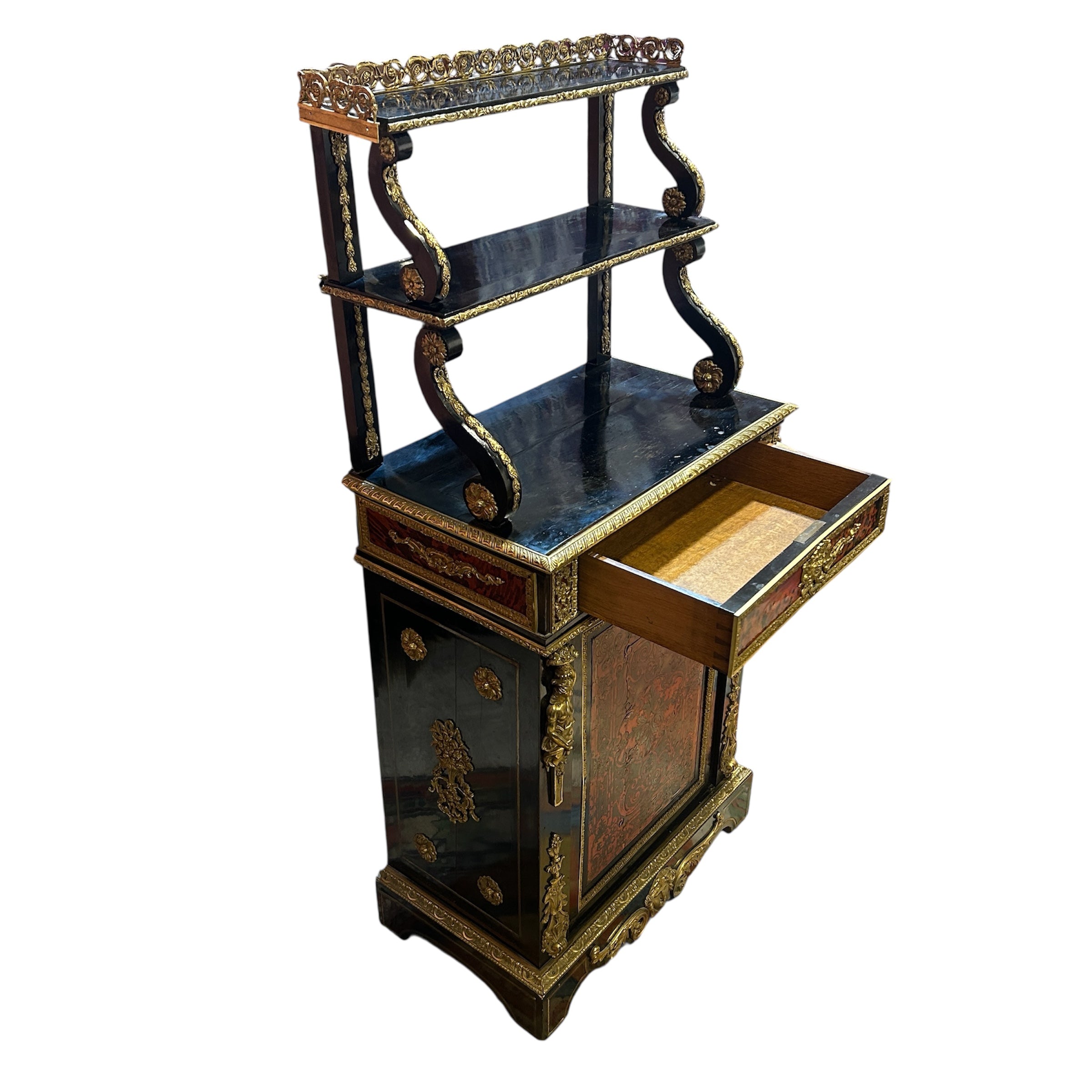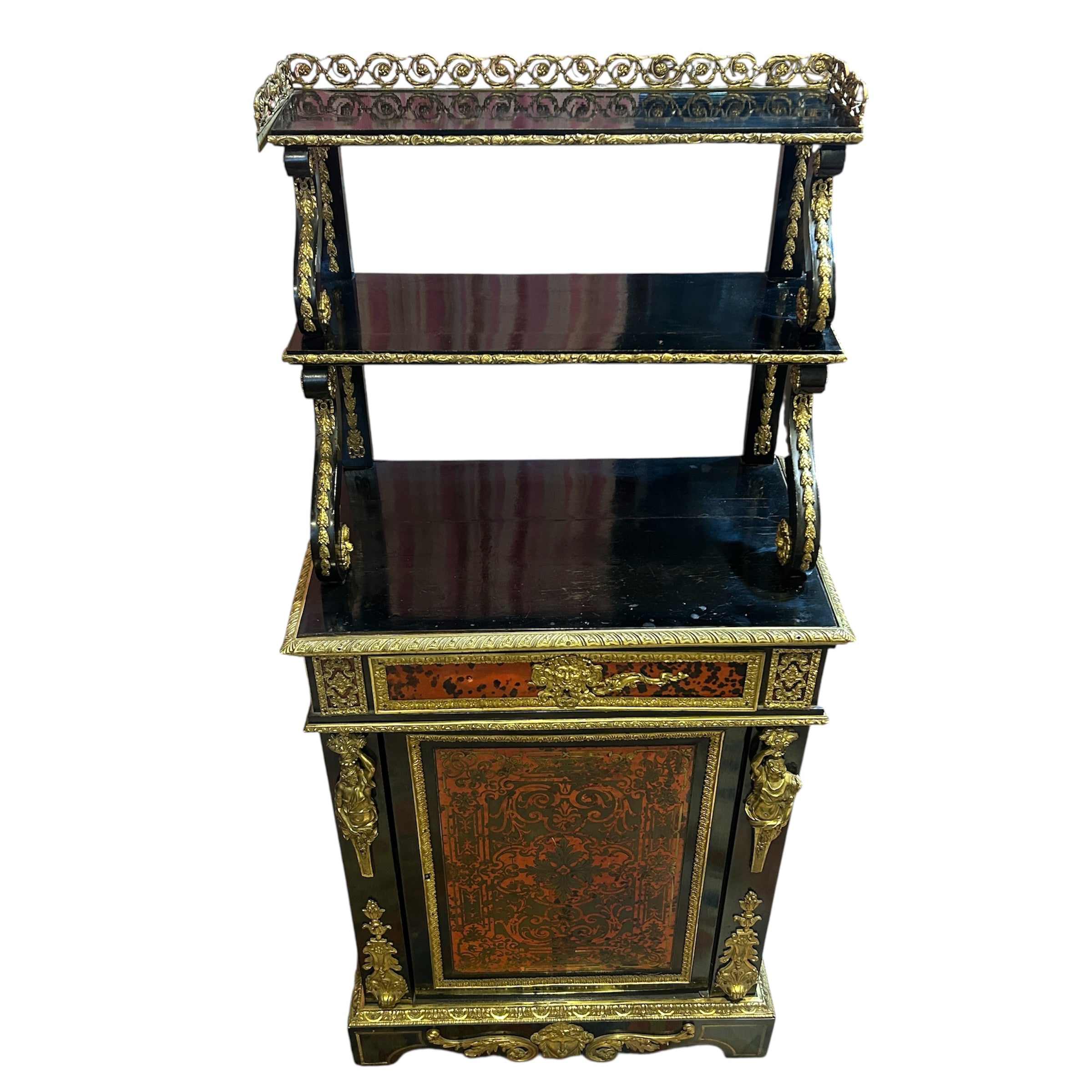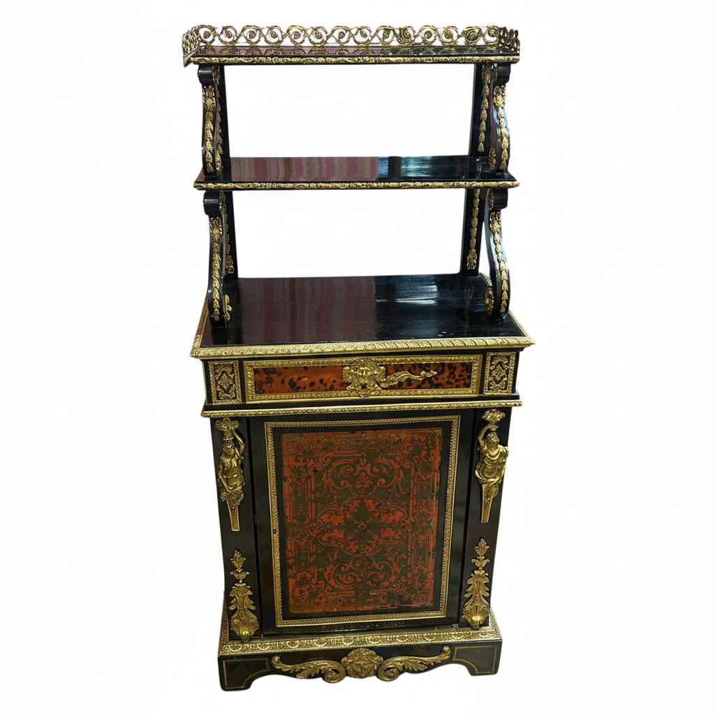 Hermoso vajillero de madera estilo Napoleón III con aplicaciones e incrustaciones en bronce y carey. La parte superior destacan dos repisas con un bello balcón de bronce y soportes curvos de diferentes tamaños, cada repisa viene decorada con un detallado borde de bronce cincelado en motivo vegetal, al igual que los pilares traseros que sostienen la estructura superior. En el centro tiene un cajón extenso también con aplicaciones en bronce y figuras angelicales. La parte inferior es un maravilloso boulle enmarcado en coronas de bronce y aplicaciones de figuras femeninas en ambos costados. En su centro mezcla el bronce con un delicado carey rojo.