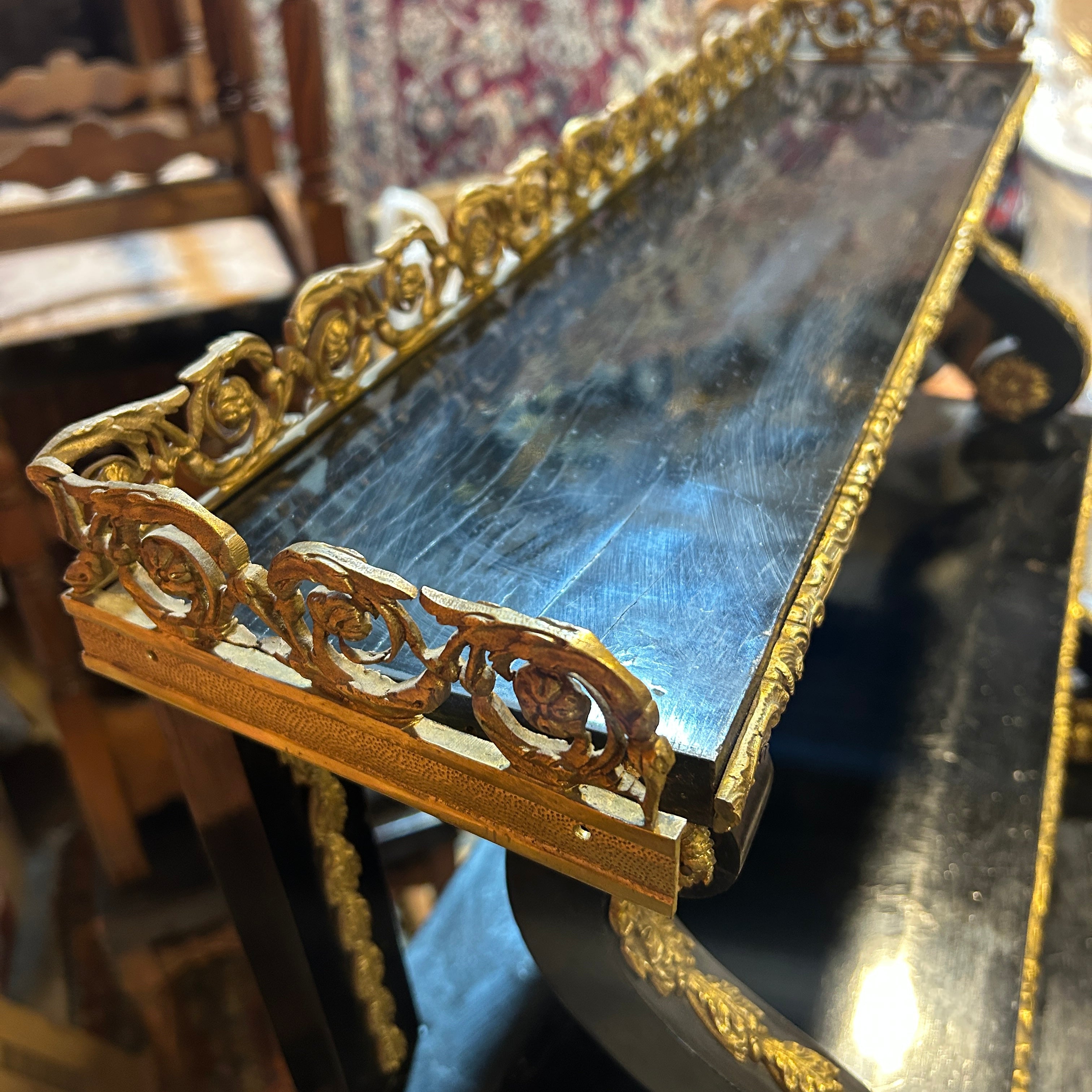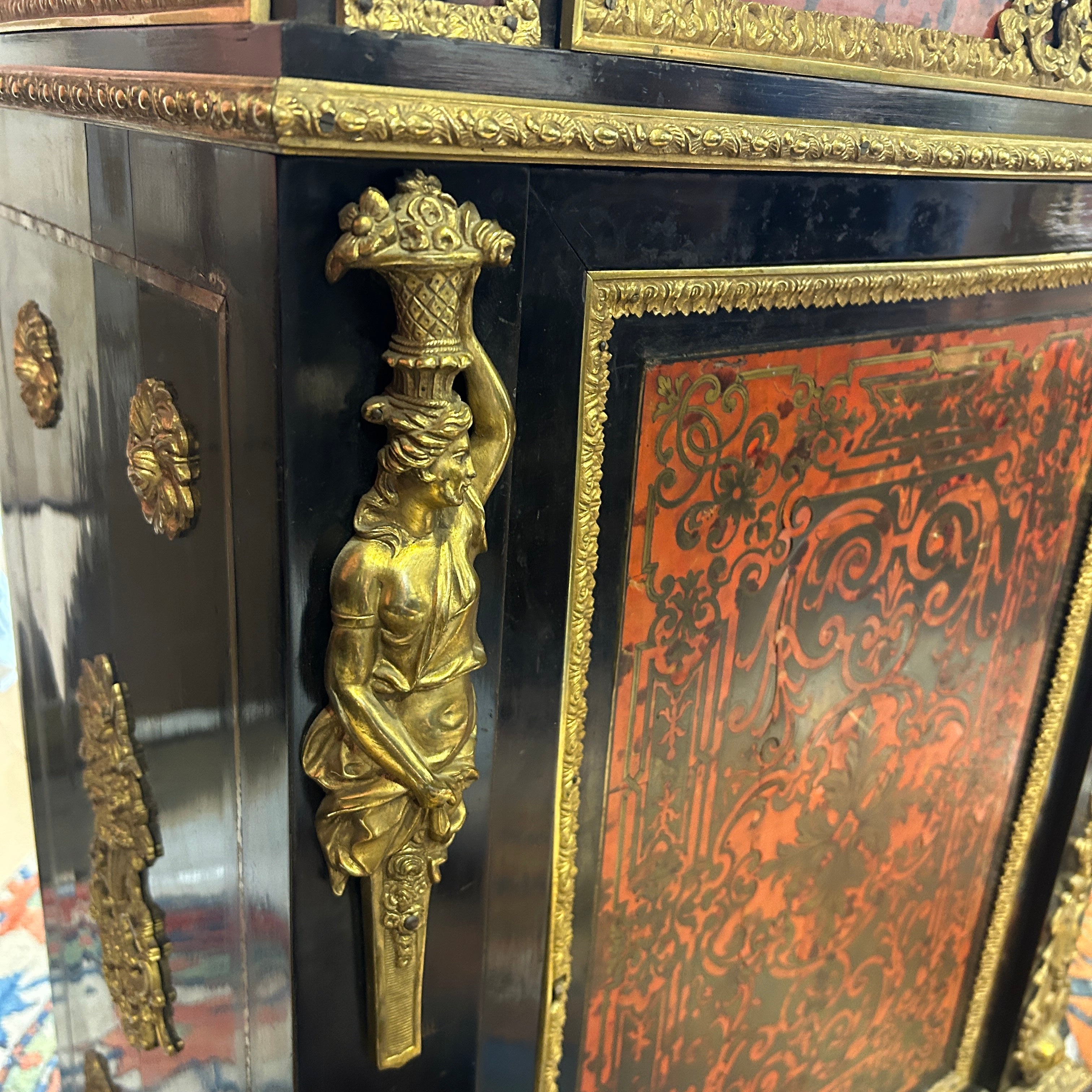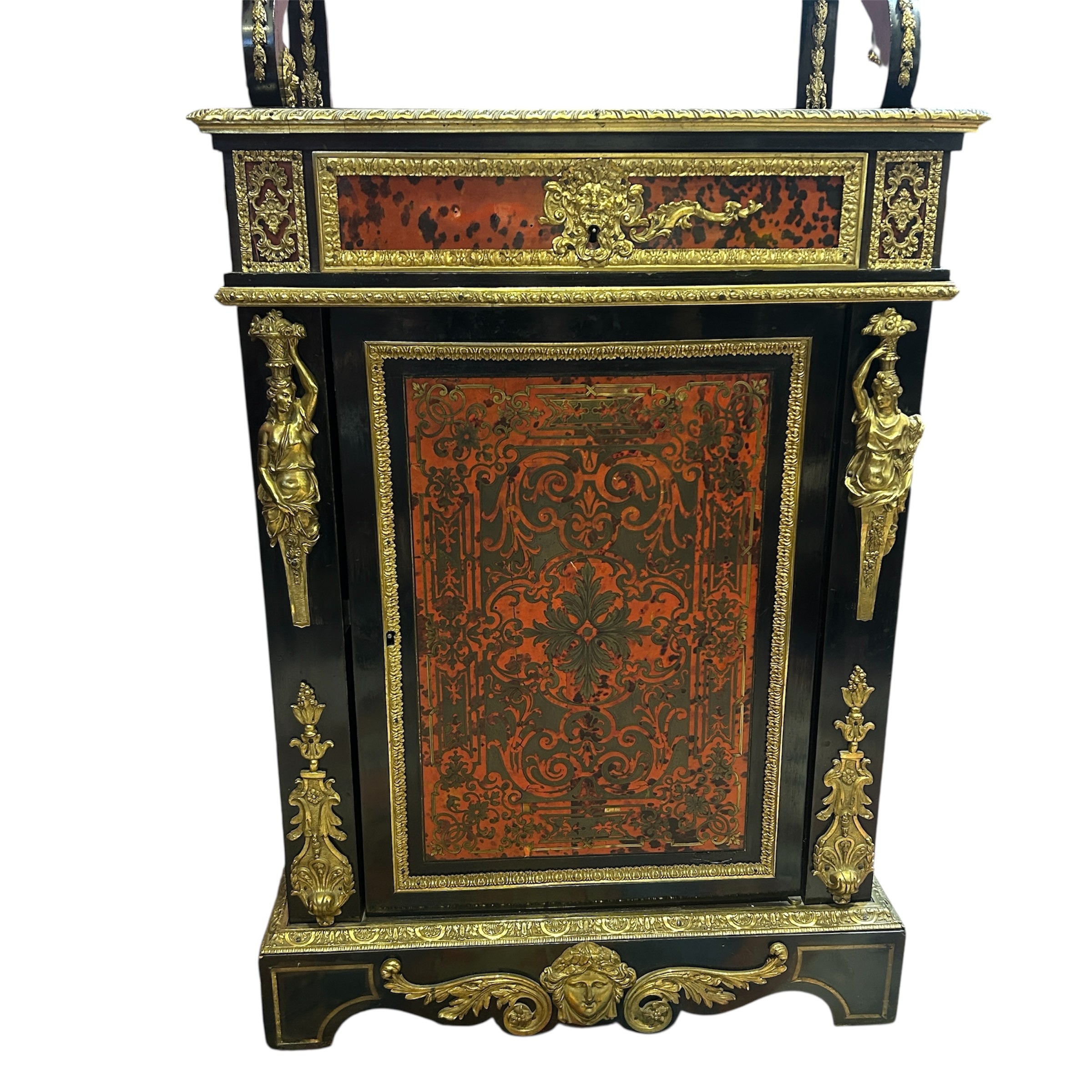 Hermoso vajillero de madera estilo Napoleón III con aplicaciones e incrustaciones en bronce y carey. La parte superior destacan dos repisas con un bello balcón de bronce y soportes curvos de diferentes tamaños, cada repisa viene decorada con un detallado borde de bronce cincelado en motivo vegetal, al igual que los pilares traseros que sostienen la estructura superior. En el centro tiene un cajón extenso también con aplicaciones en bronce y figuras angelicales. La parte inferior es un maravilloso boulle enmarcado en coronas de bronce y aplicaciones de figuras femeninas en ambos costados. En su centro mezcla el bronce con un delicado carey rojo.