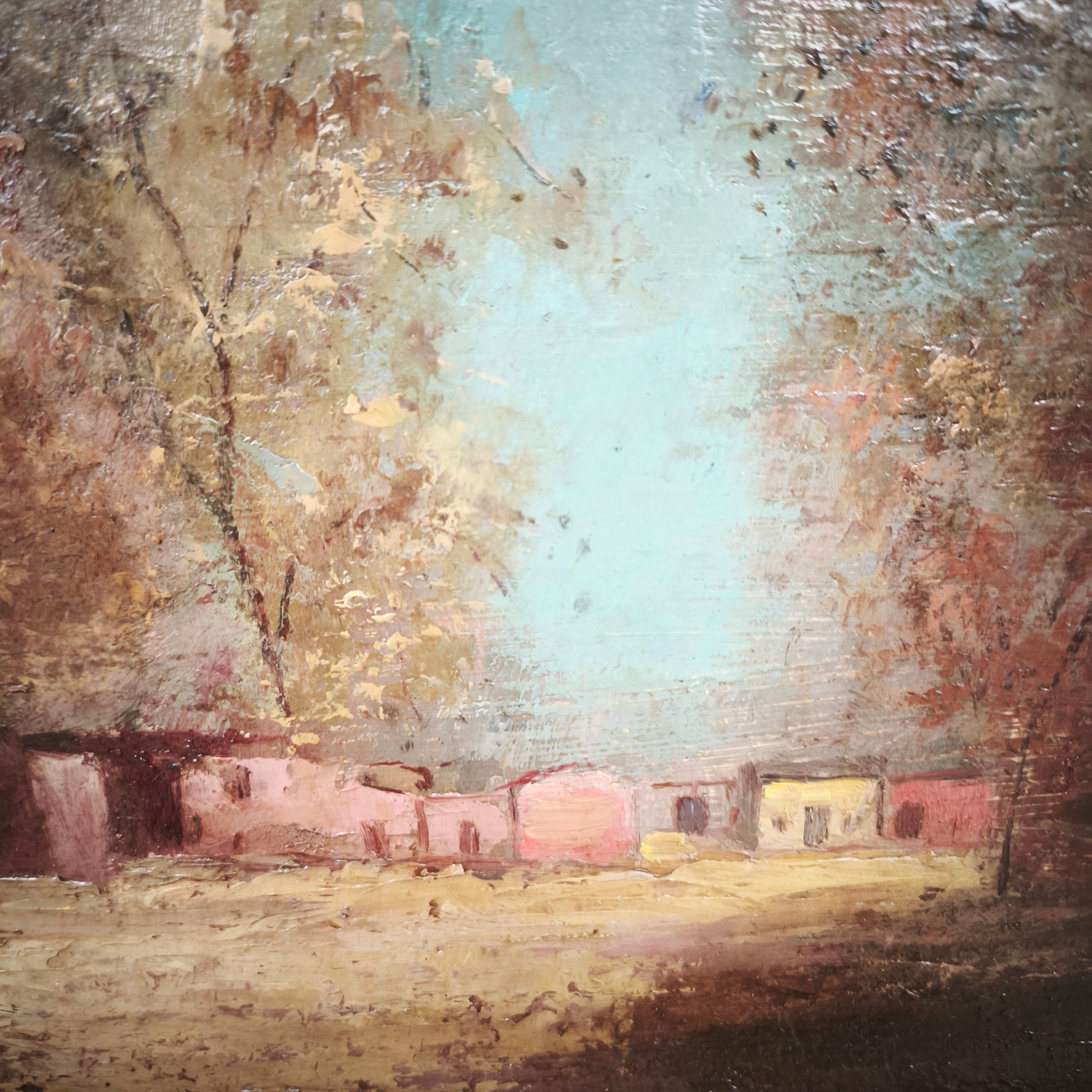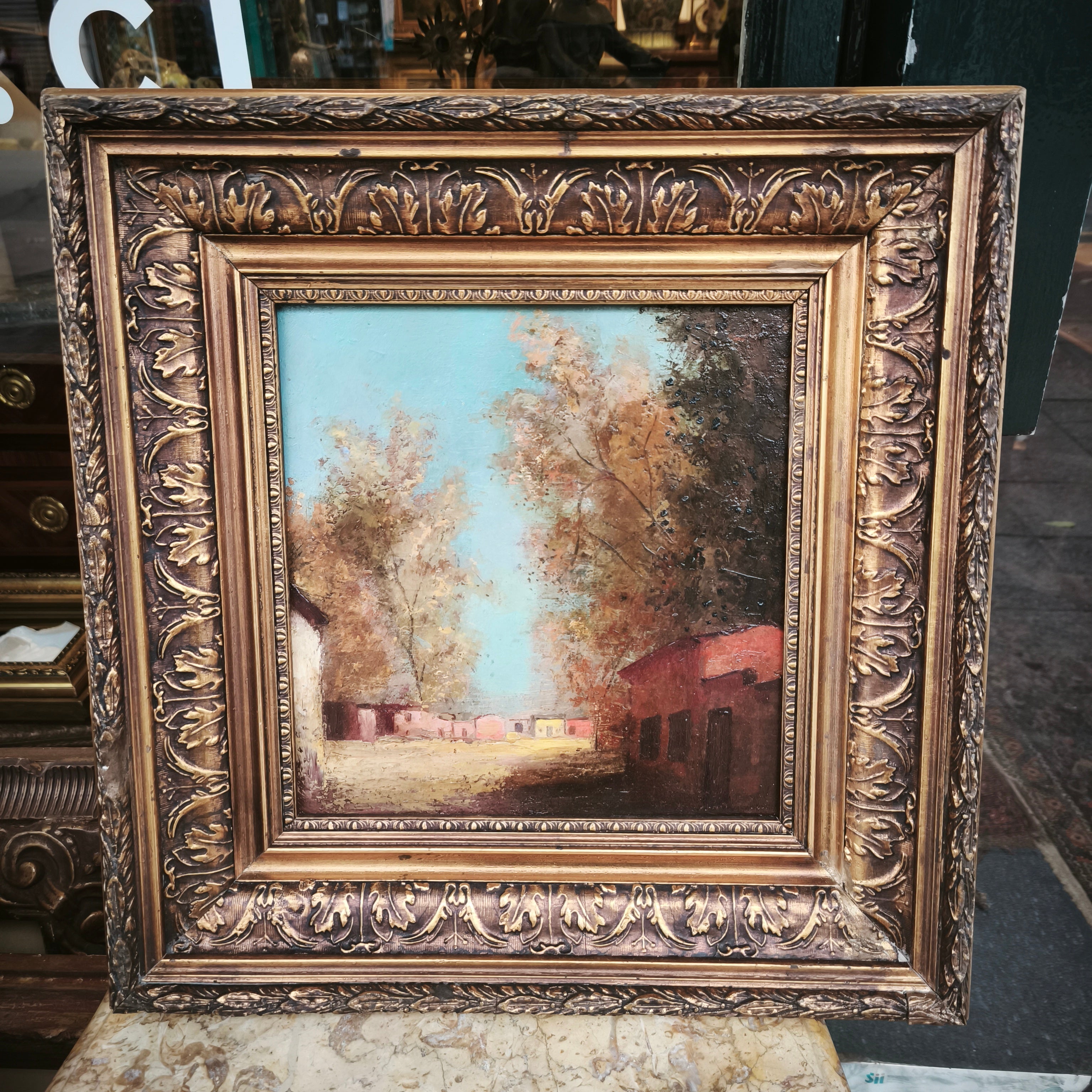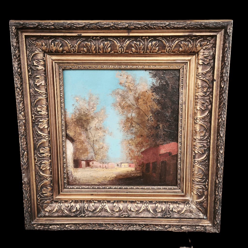 Óleo sobre madera, de un artista anónimo, representando un paisaje rural, posiblemente de una calle o la plaza de un pueblo, en el que se ven algunas casas de adobe junto a grandes árboles que le dan sombra a algunas casas, haciendo que la composición tenga un bello juego de luces y sombras. La obra está enmarcada en madera tallada con relieves y pintada de elegante dorado.