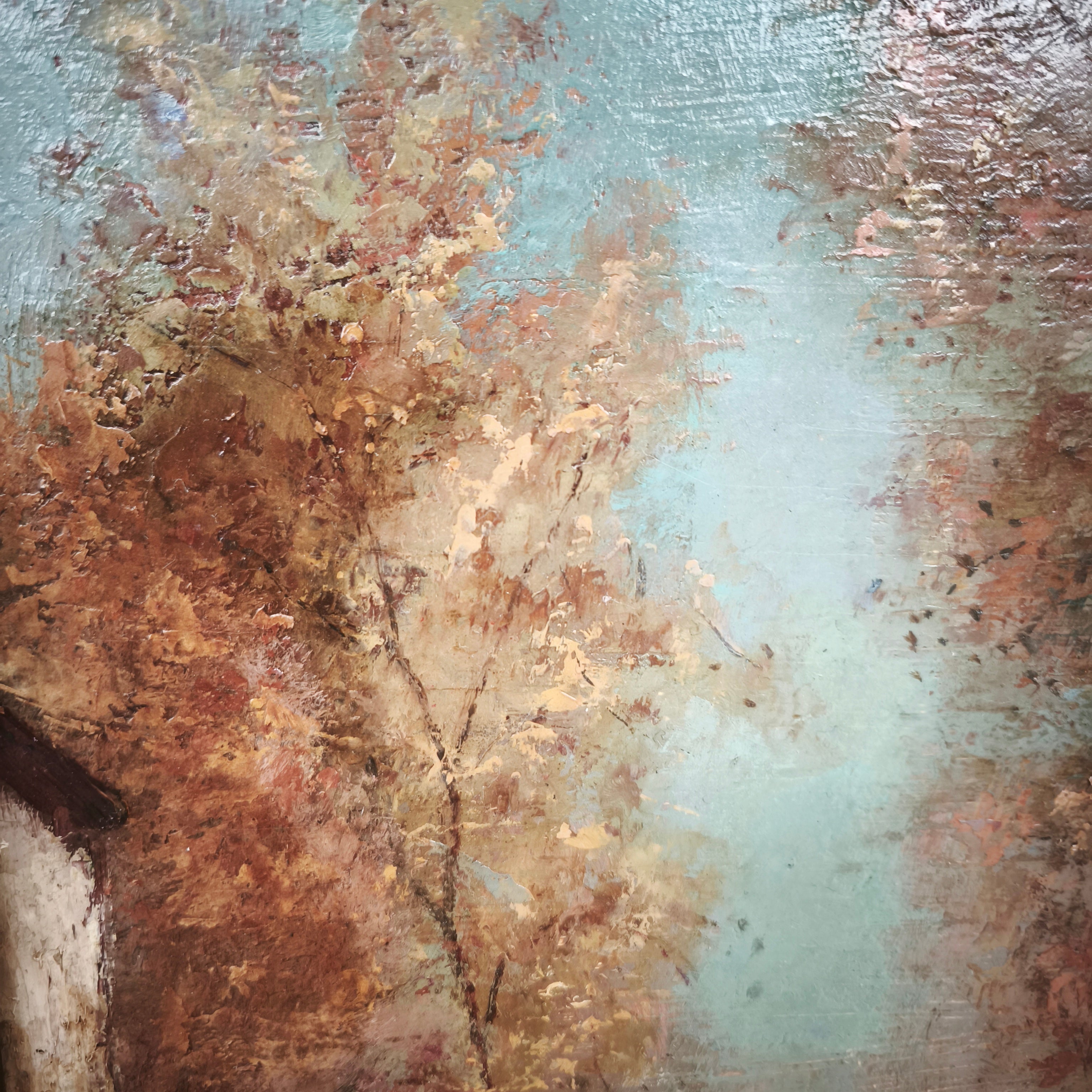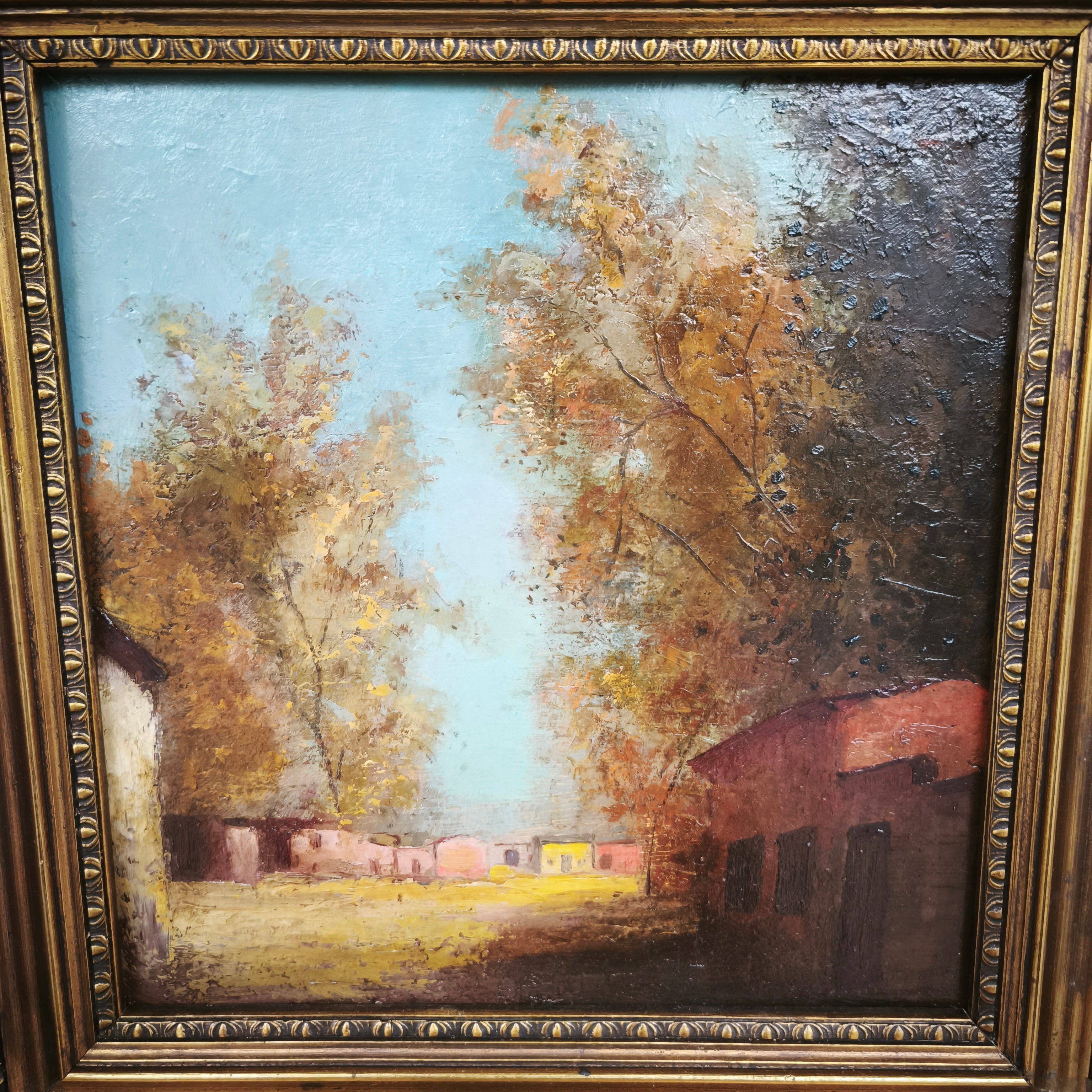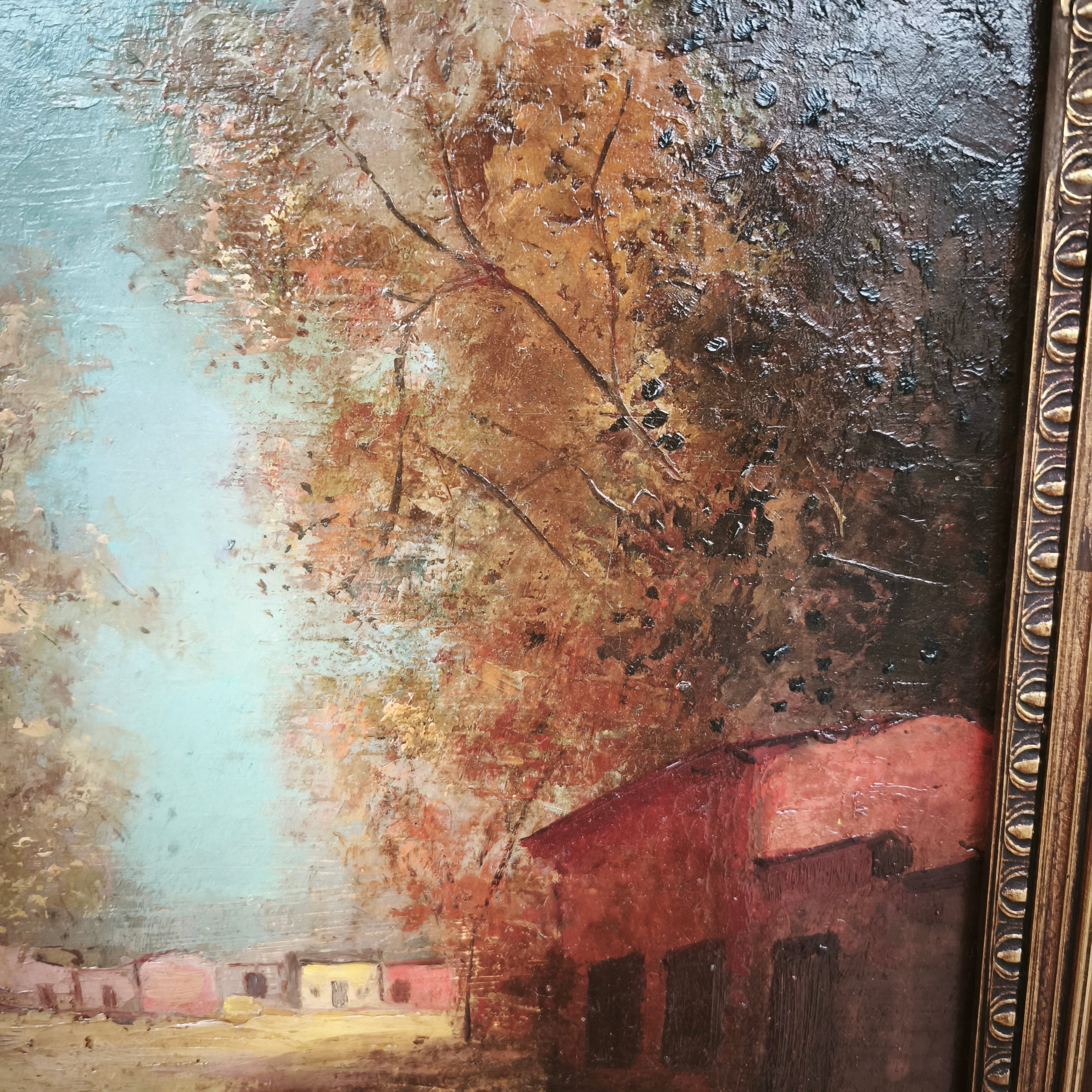 Óleo sobre madera, de un artista anónimo, representando un paisaje rural, posiblemente de una calle o la plaza de un pueblo, en el que se ven algunas casas de adobe junto a grandes árboles que le dan sombra a algunas casas, haciendo que la composición tenga un bello juego de luces y sombras. La obra está enmarcada en madera tallada con relieves y pintada de elegante dorado.