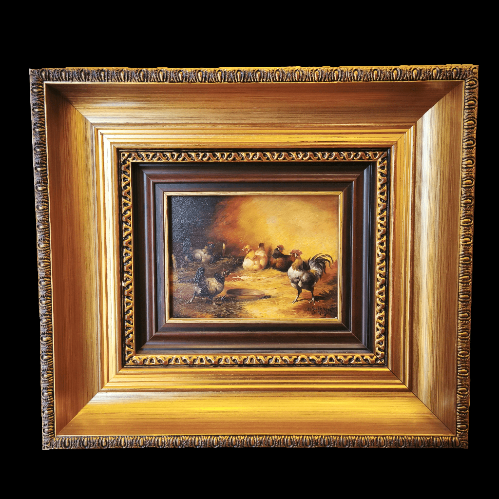 Óleo sobre madela del pintor chileno, nacido en Santiago, Aristodemo Lattanzi Villela (1952). En esta obra vemos unas gallinas reunidas junto a un plato en su gallinero, capturadas con un hermoso trabajo de la luz. La obra, con la temática tan reconocible de este artista, tiene un elegante marco de madera, con bordes tallados en relieves, y terminado en dorado.