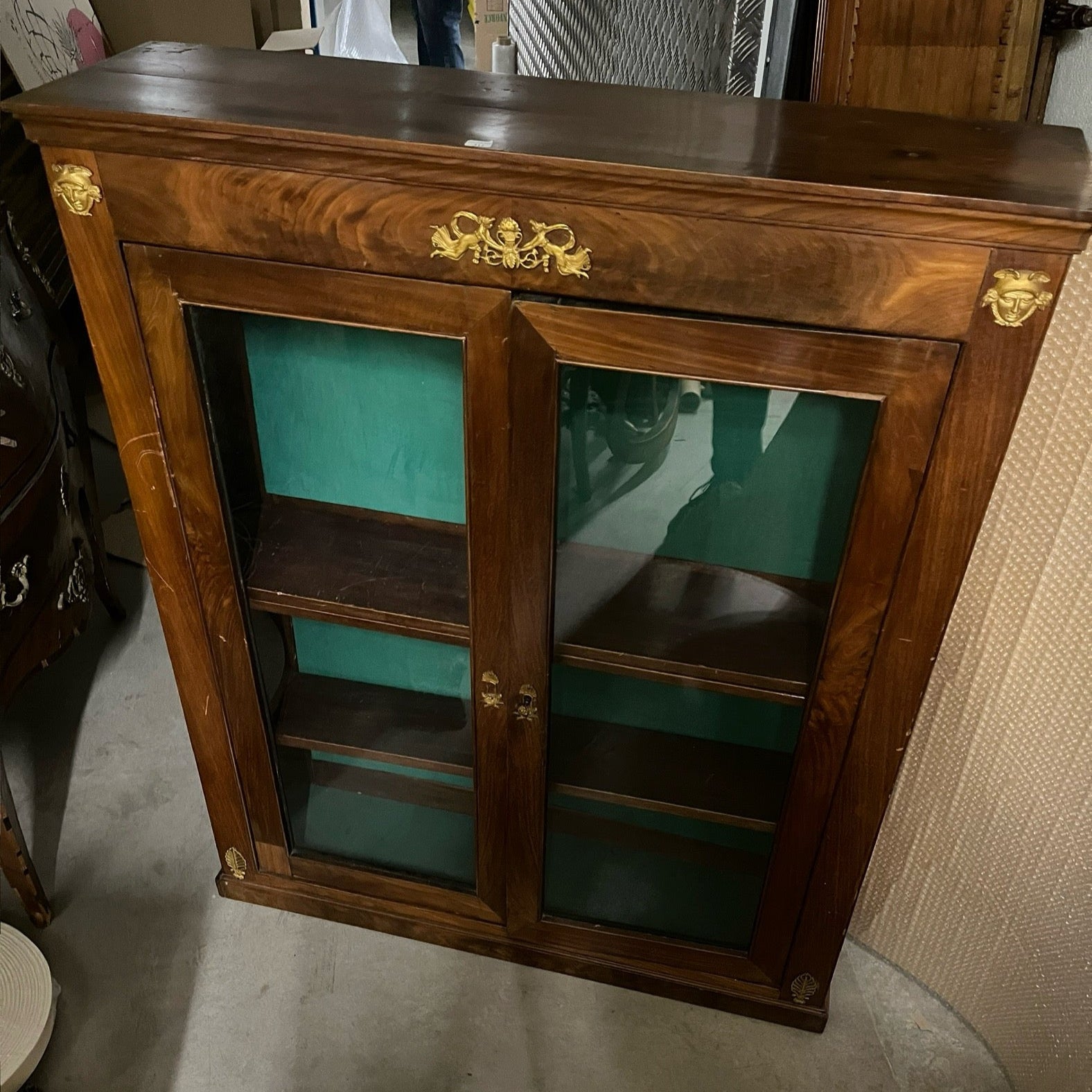 De madera enchapada, abre con dos puertas de vidrio y ornamentos de bronce dorado. Se entrega rebarnizada.