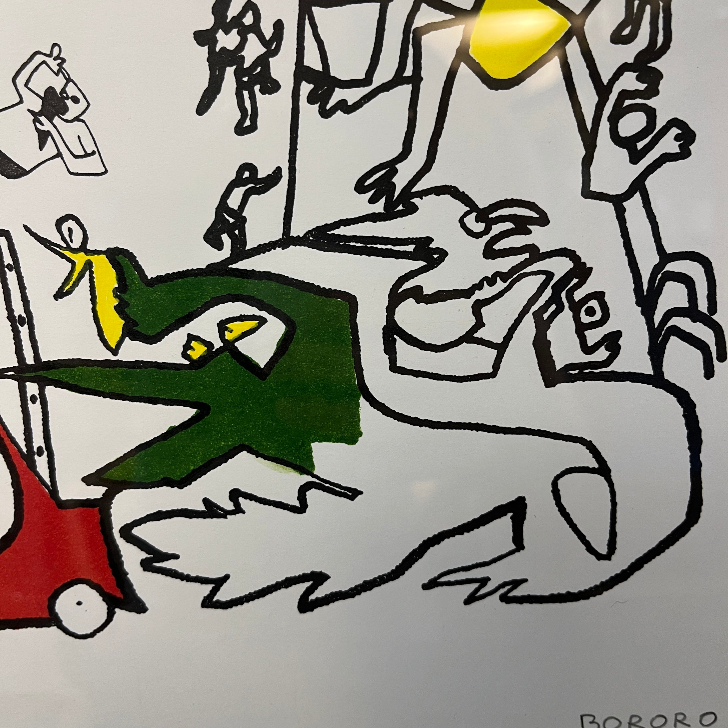 Litografía en aluminio del artista chileno Bororo, nacido en 1953 en Santiago de Chile. Conocido por su estilo expresionista y su uso vibrante del color, Bororo fue parte del grupo de artistas chilenos de los años 80 llamados “Los 80”, que revitalizaron el arte contemporáneo en el país. Su trabajo se caracteriza por composiciones dinámicas, con influencias del pop art, la abstracción y el surrealismo, creando imágenes complejas y llenas de energía. Su obra explora temas de la identidad, la naturaleza y la cultura popular.