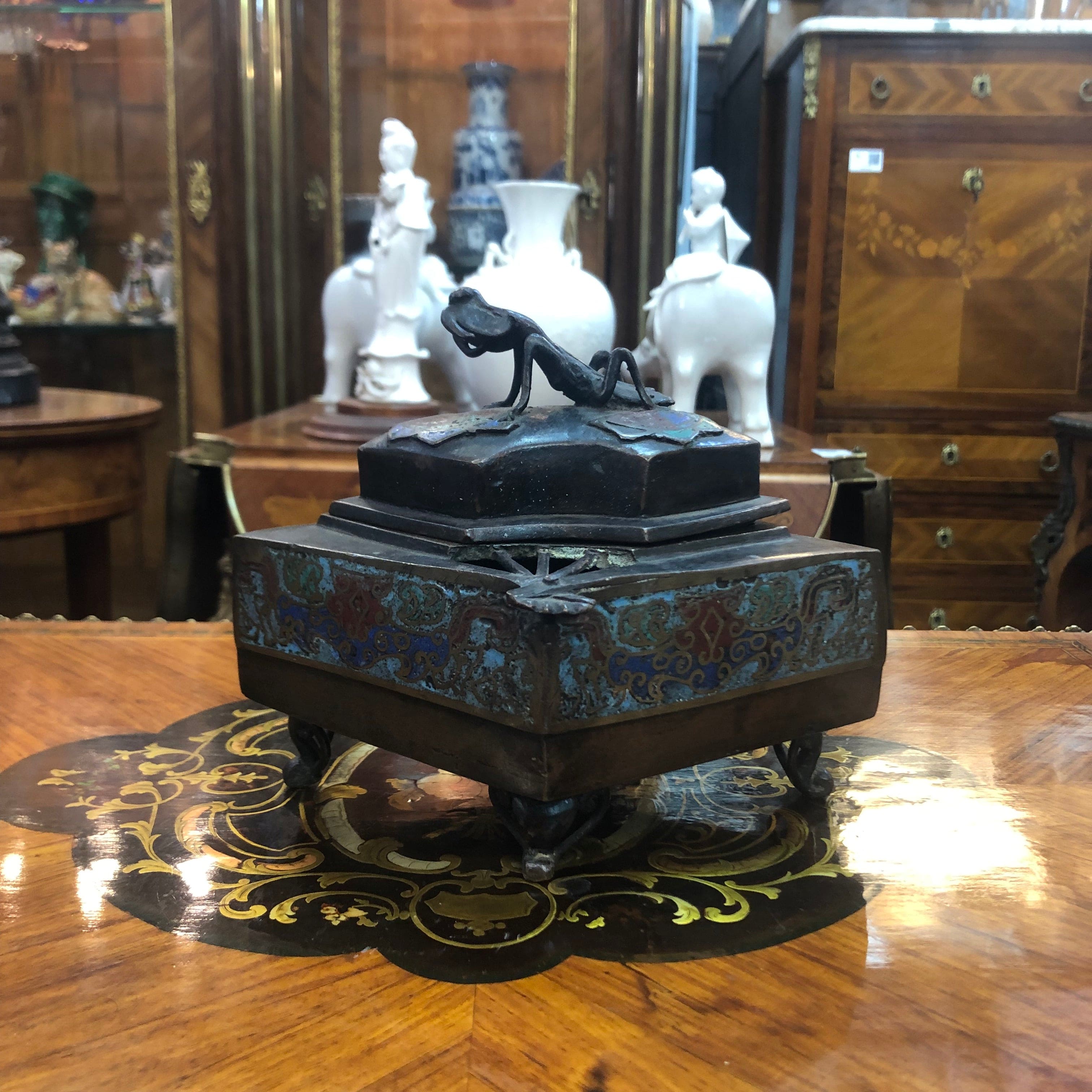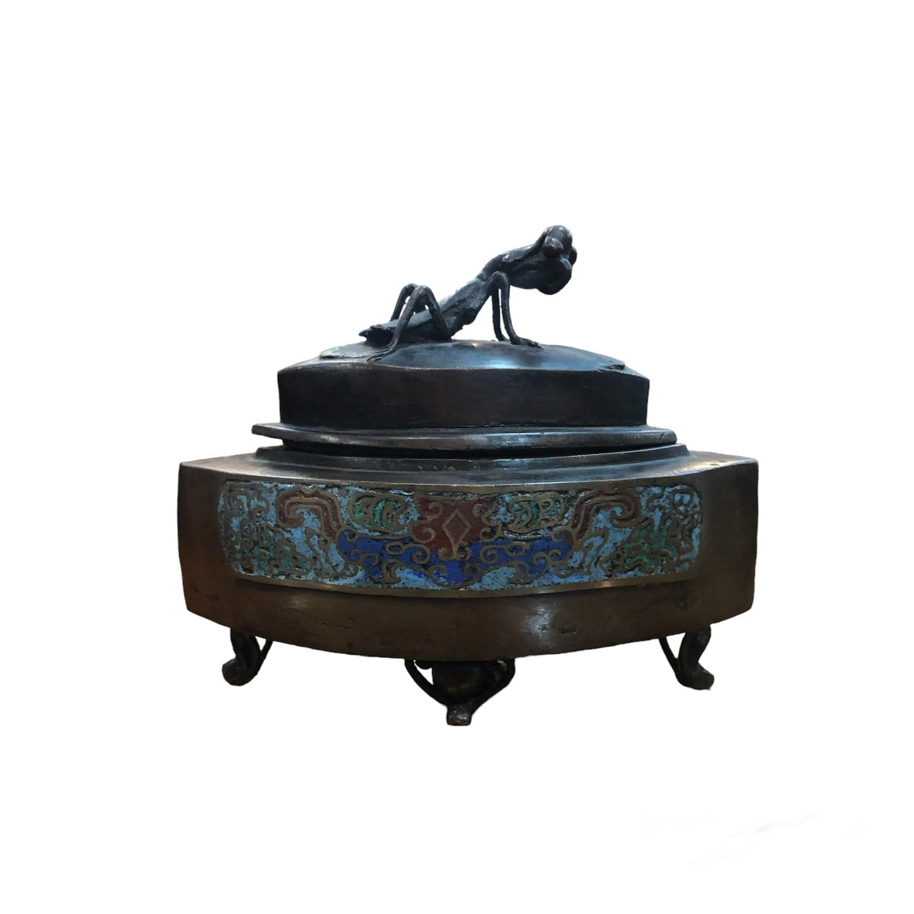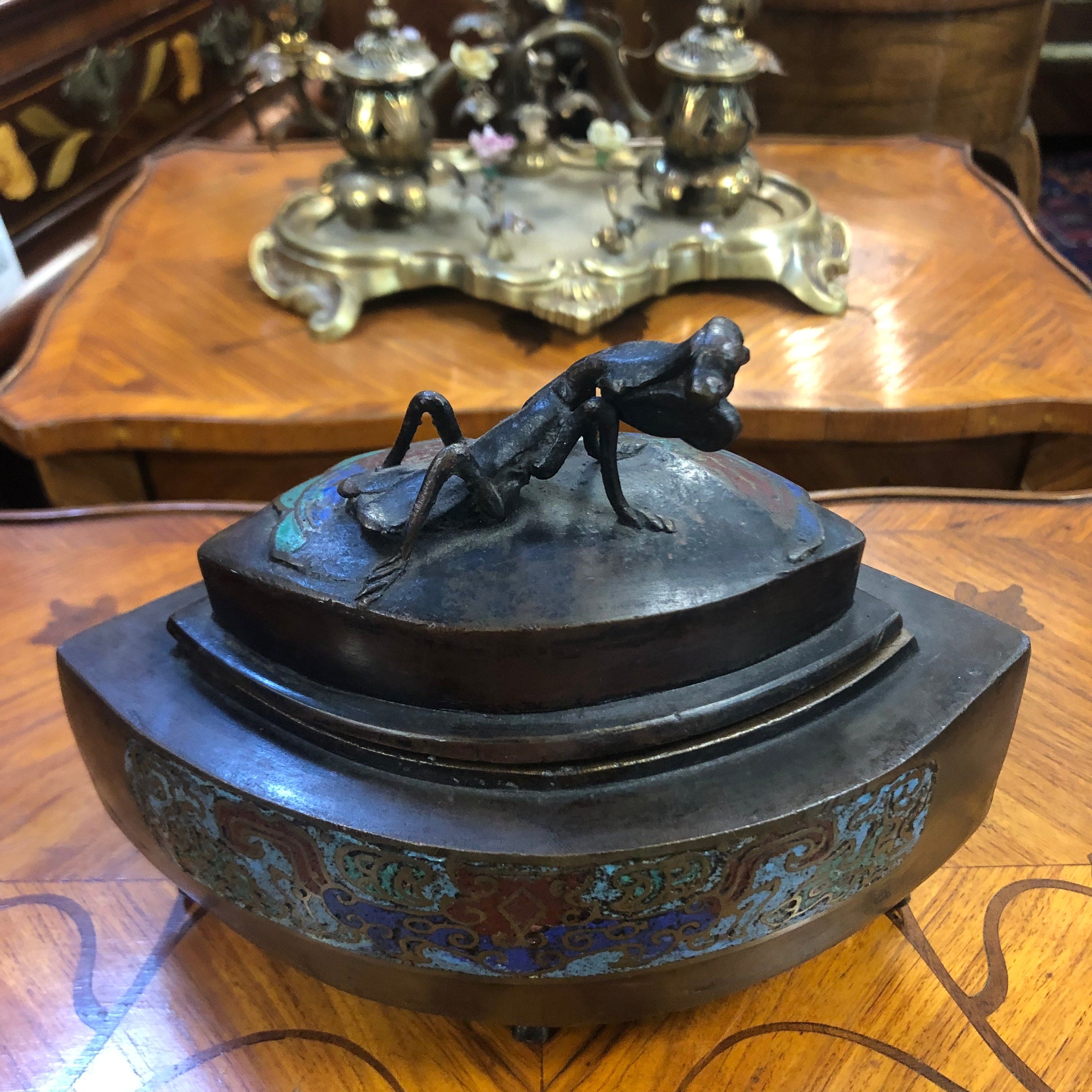Hermoso sahumador cloissoné con Mantis religiosa en la tapa de bronce.