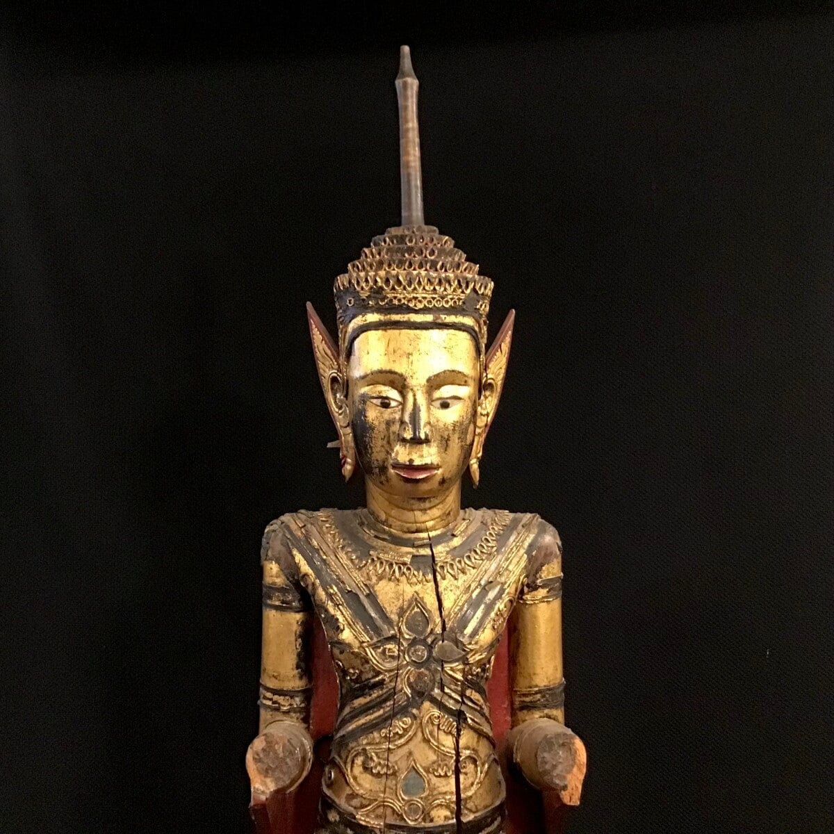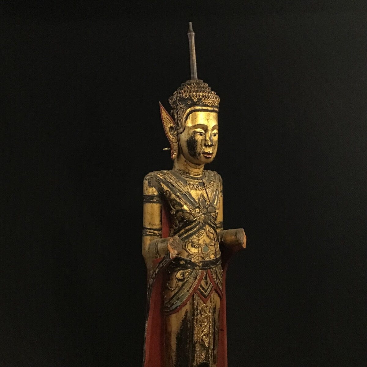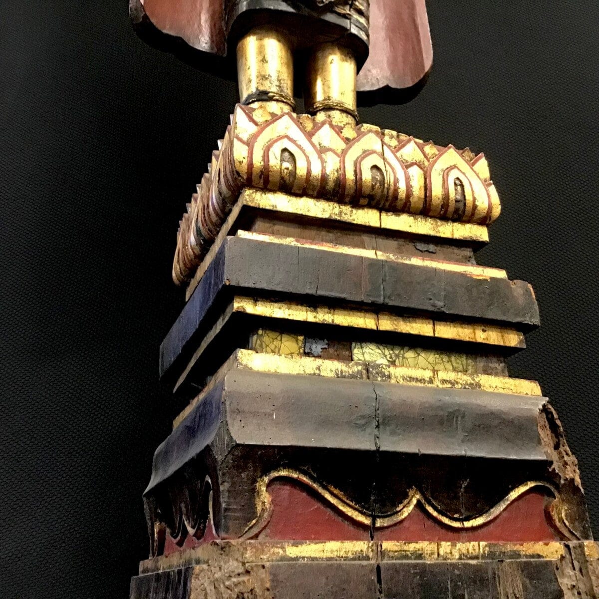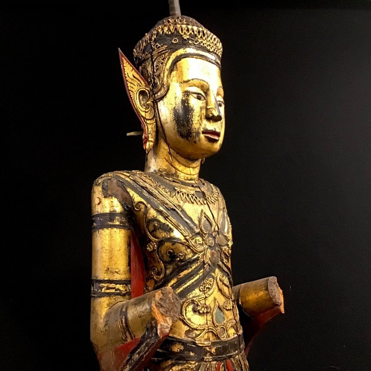 Figura de gran formato que representa una divinidad del hinduismo. Hecha de madera policromada en dorado.