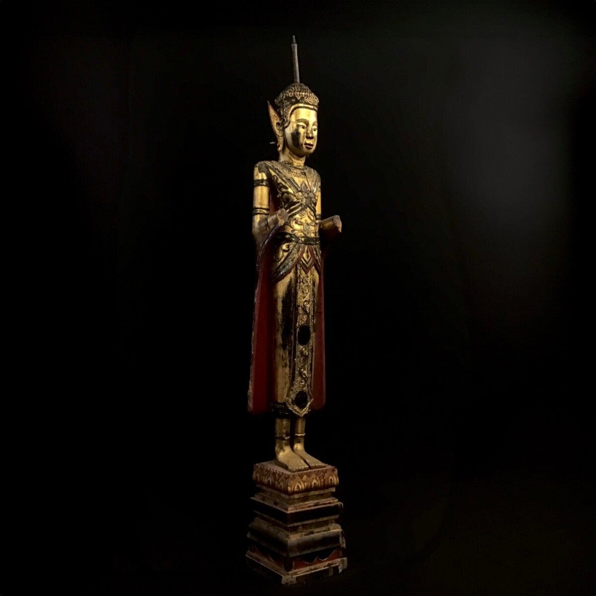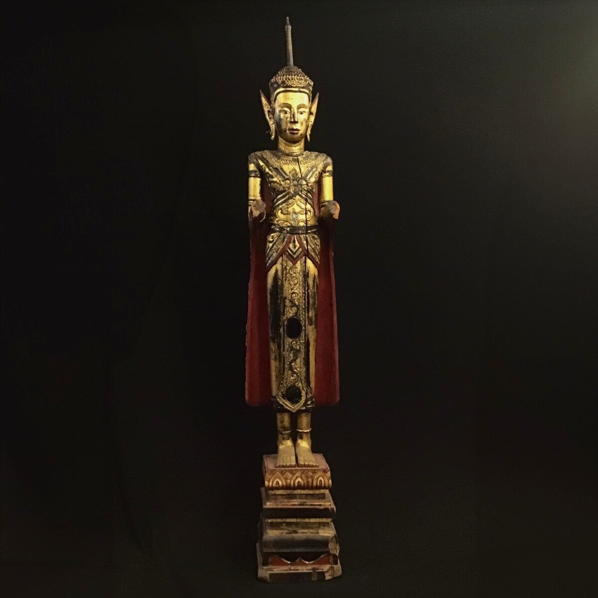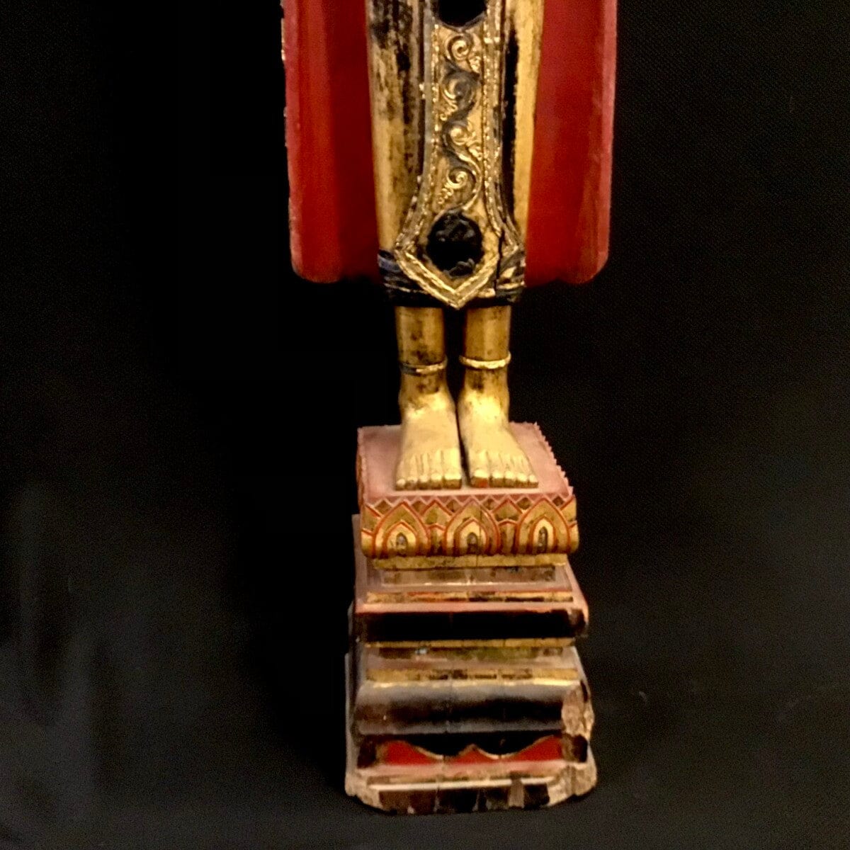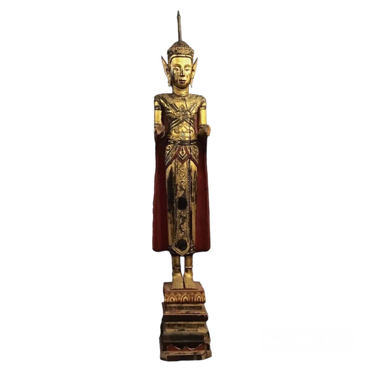 Figura de gran formato que representa una divinidad del hinduismo. Hecha de madera policromada en dorado.