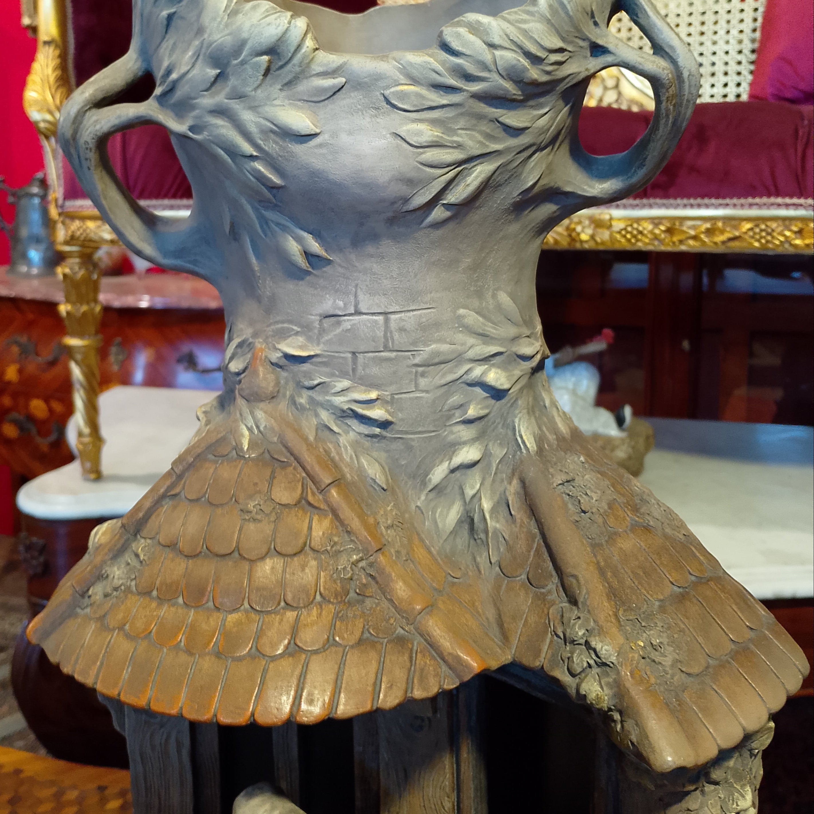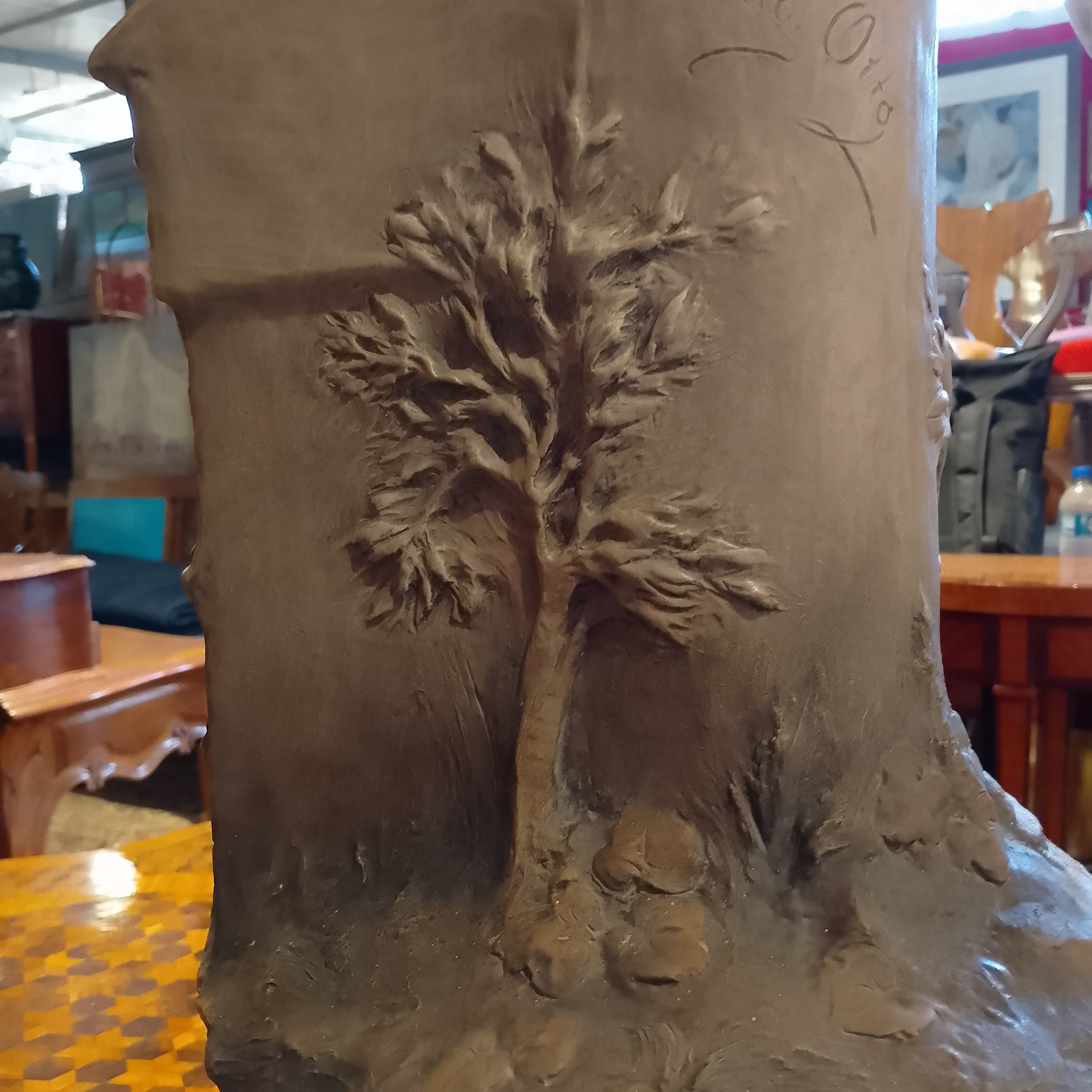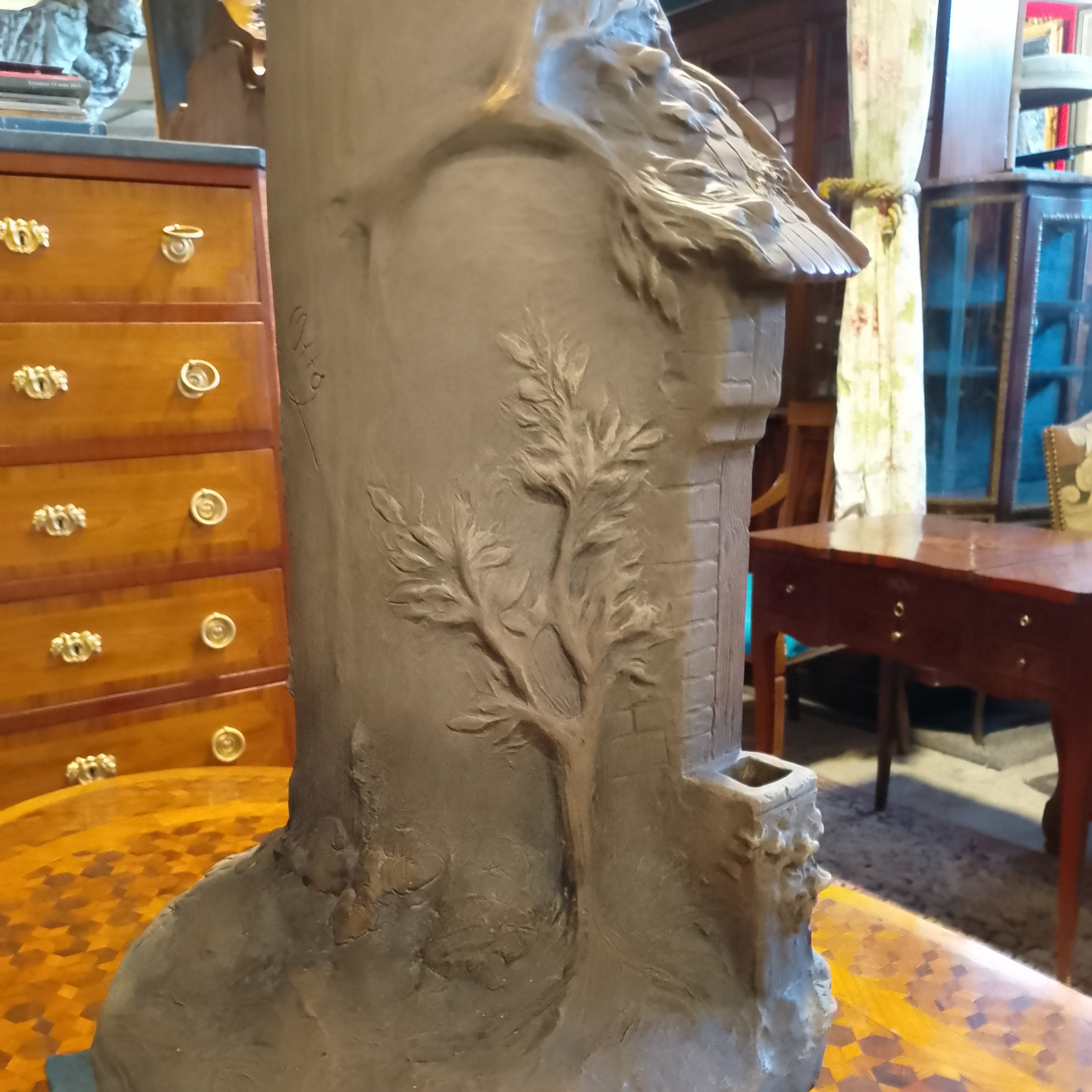 Especial escultura en terracota del escultor August Otto, representando una escena doméstica de Europa central en que el hogar se hibrida con un tronco de árbol, dando un carácter fantástico al conjunto, que remite a los cuentos y leyendas tradicionales de la región.