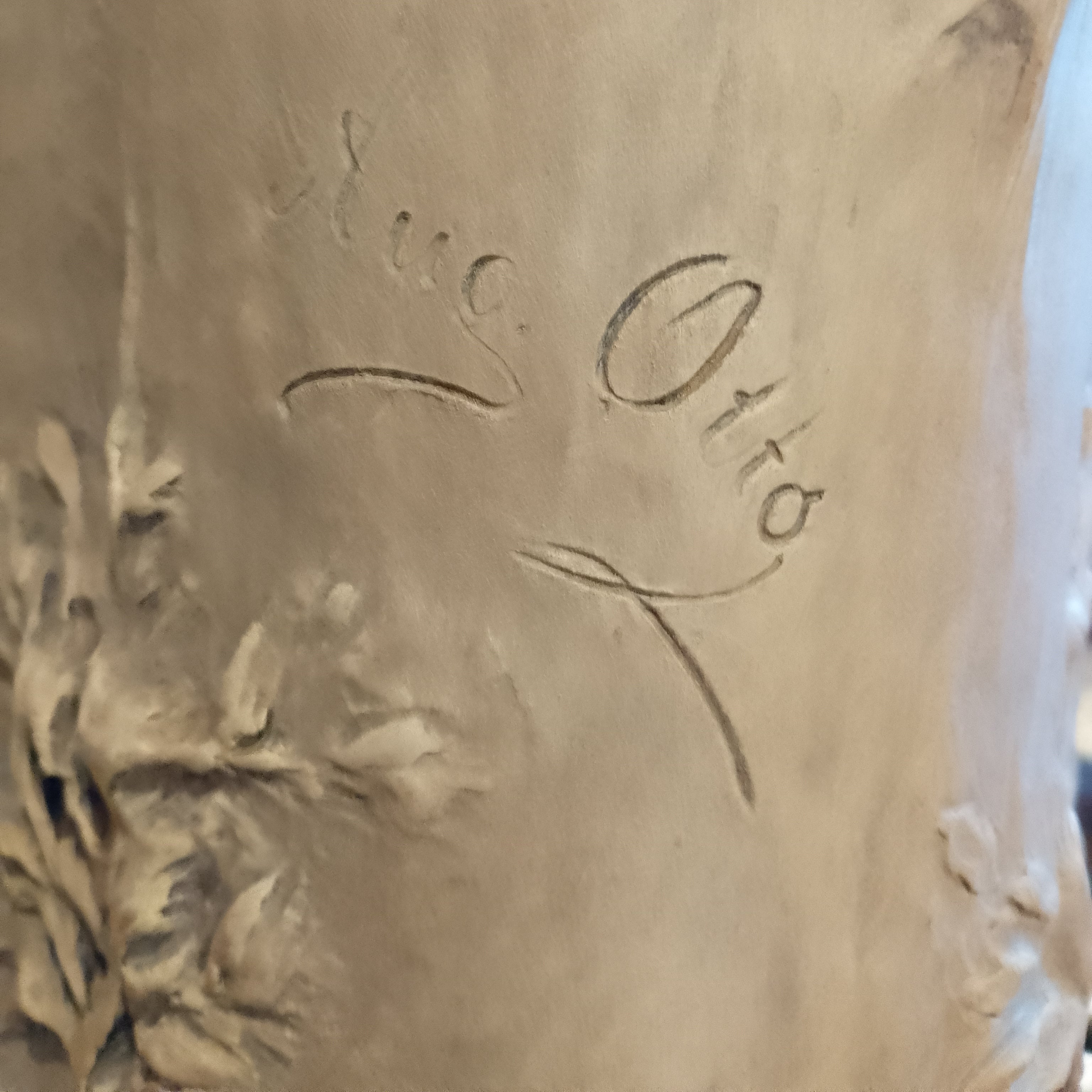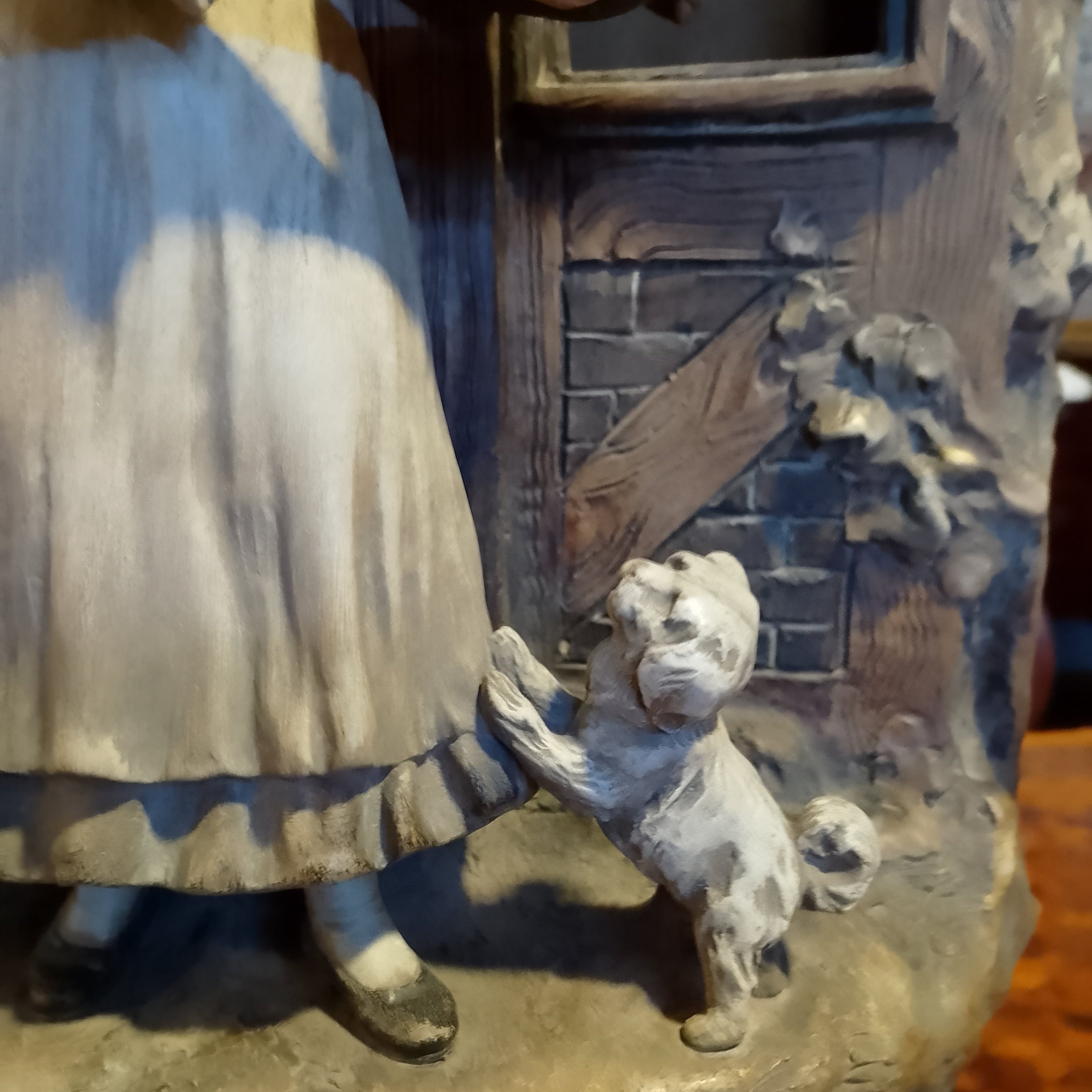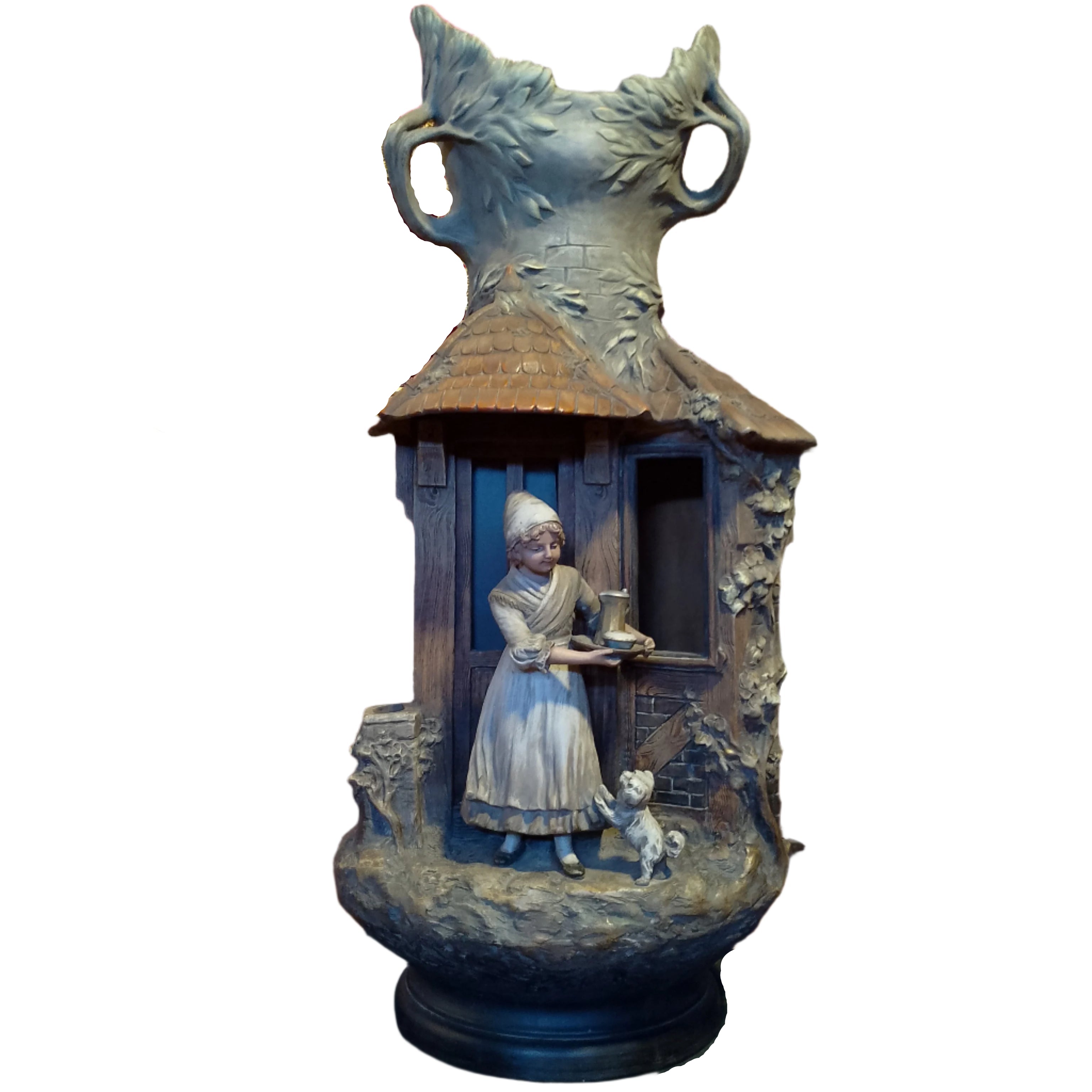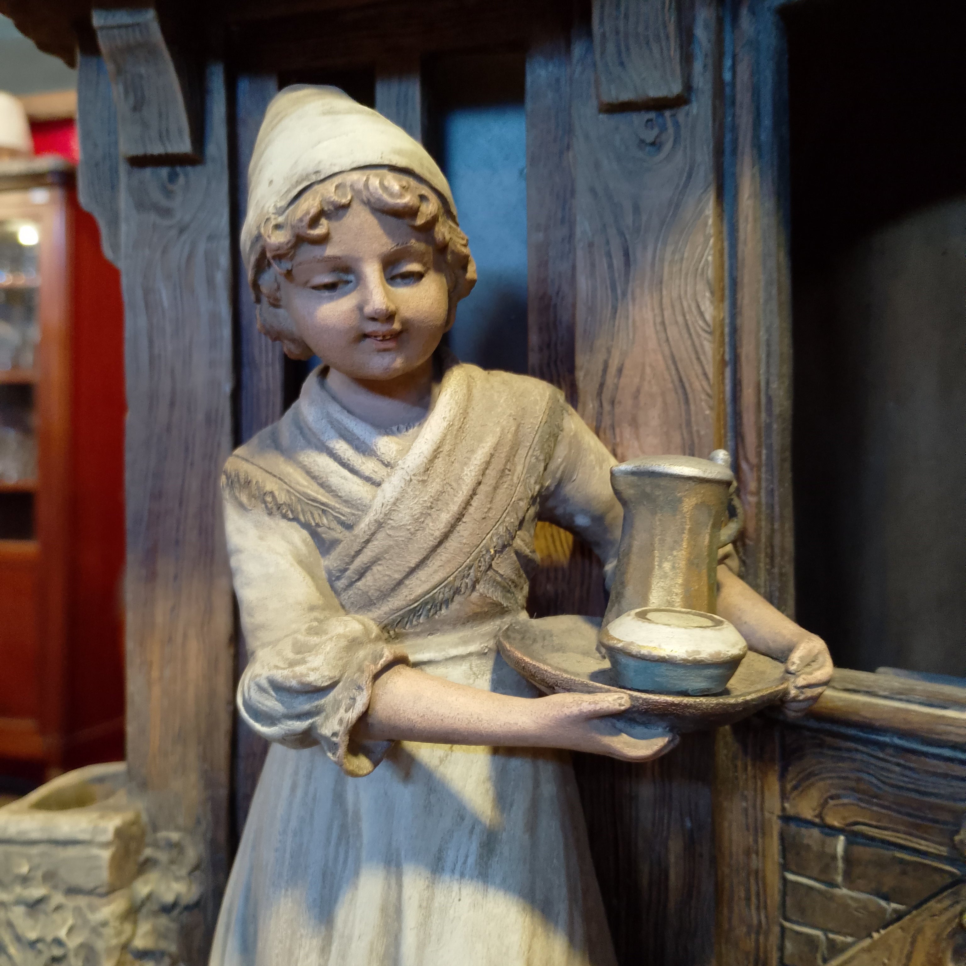Especial escultura en terracota del escultor August Otto, representando una escena doméstica de Europa central en que el hogar se hibrida con un tronco de árbol, dando un carácter fantástico al conjunto, que remite a los cuentos y leyendas tradicionales de la región.