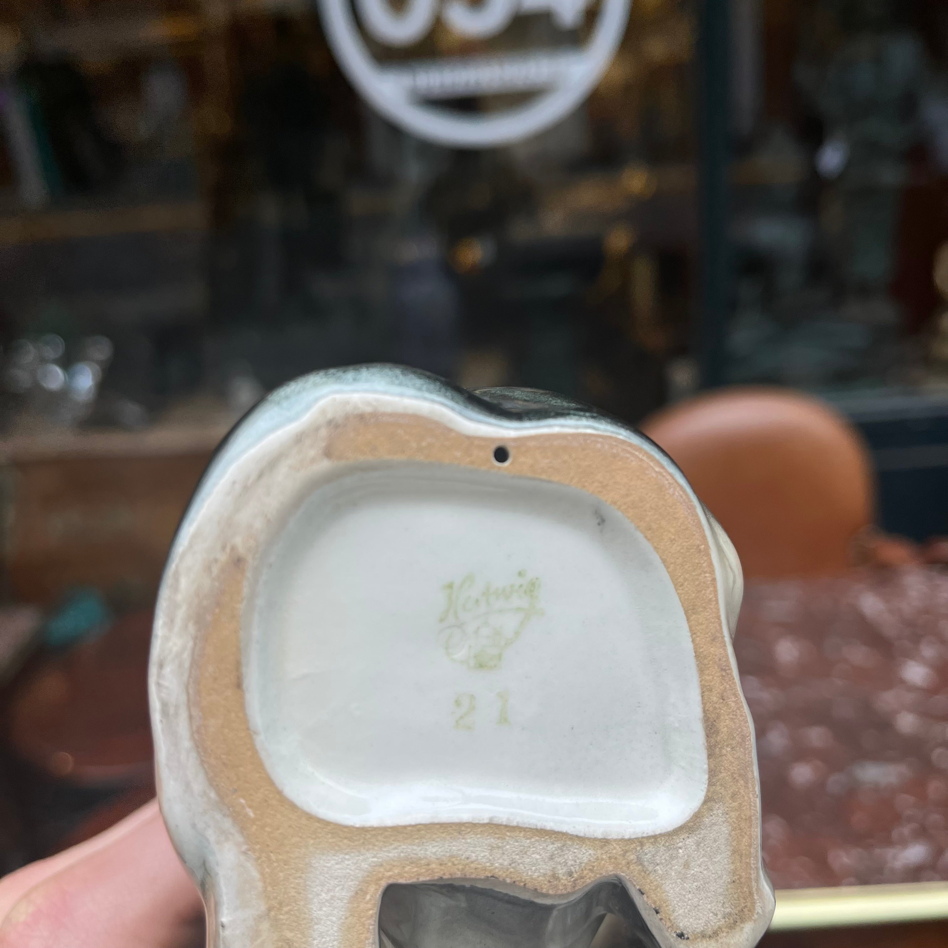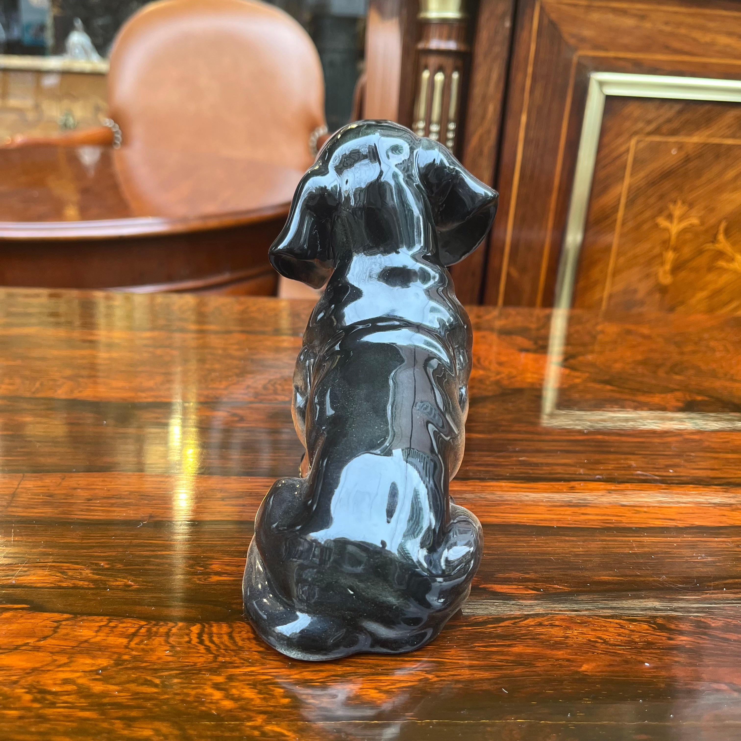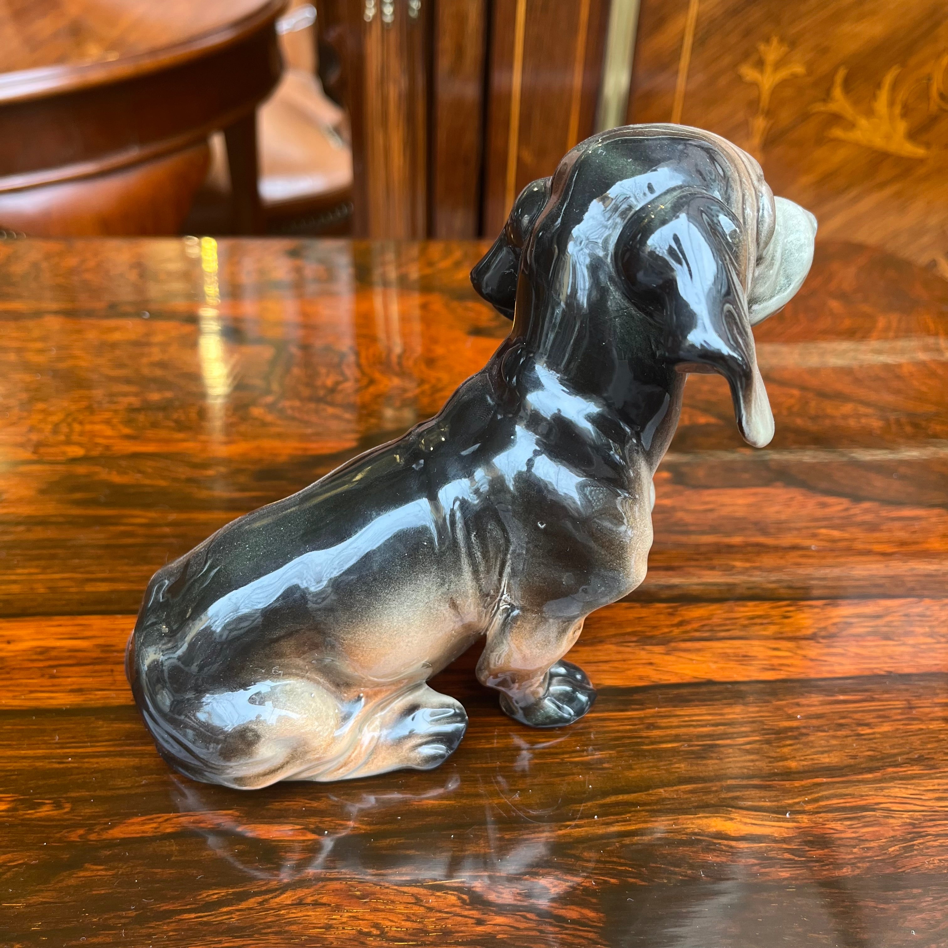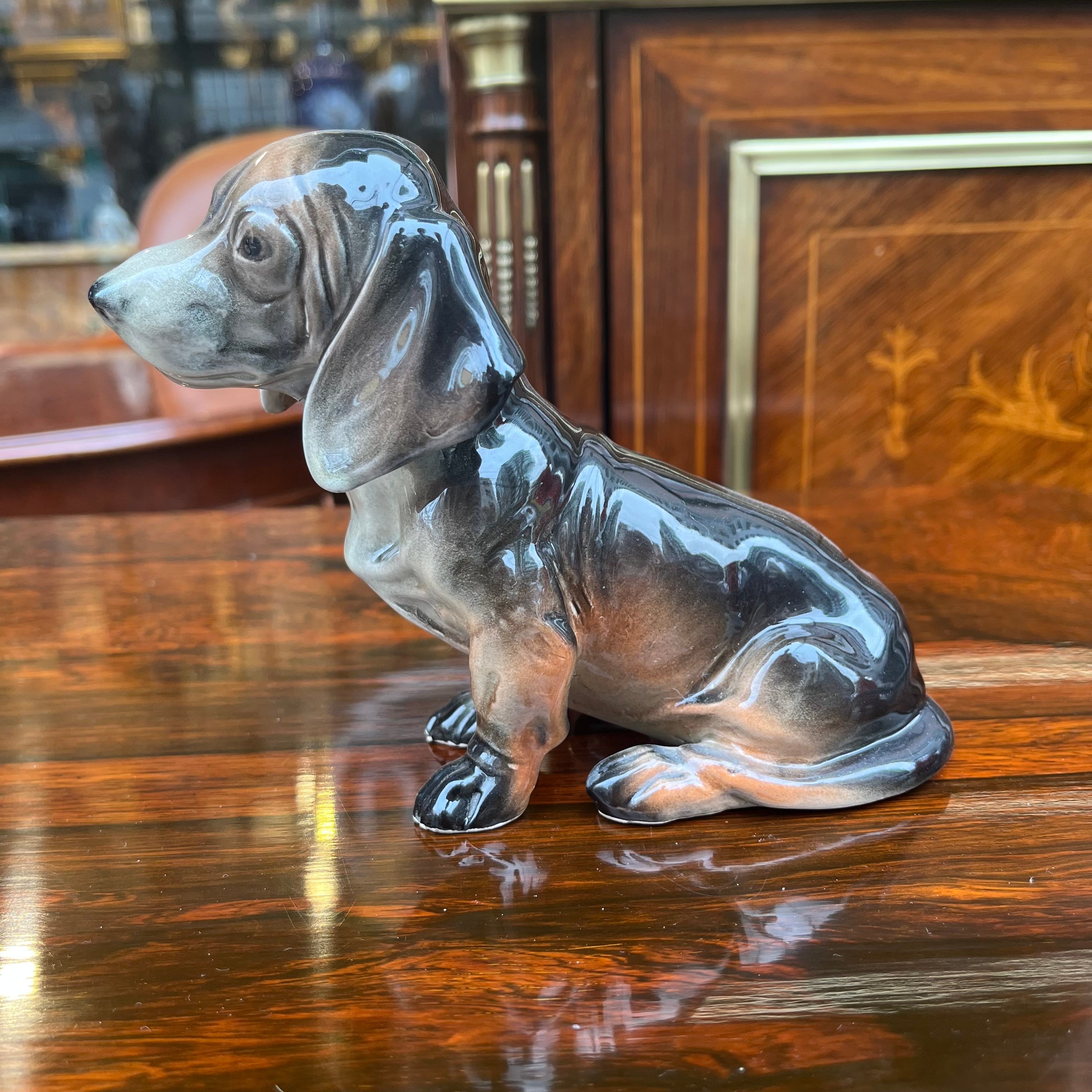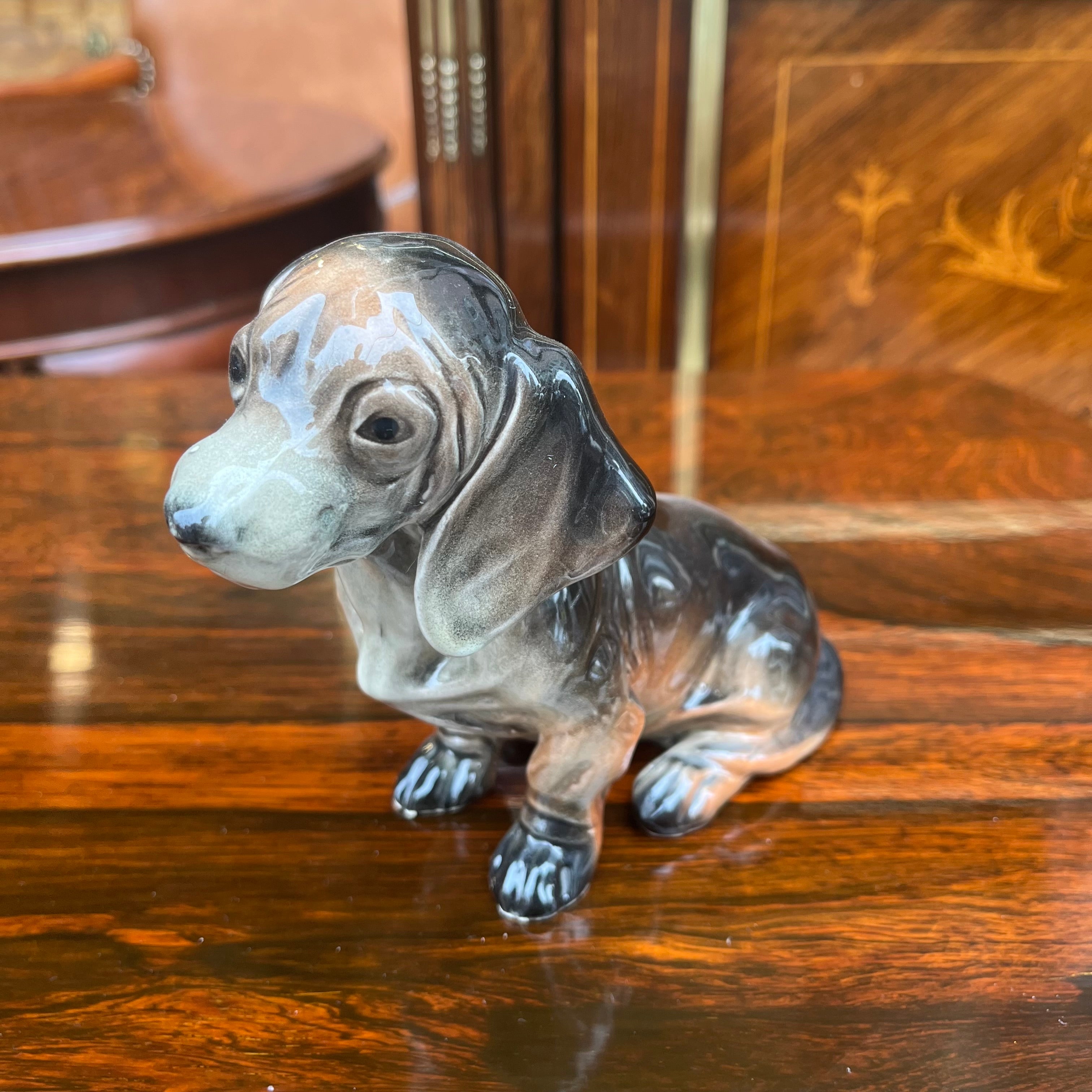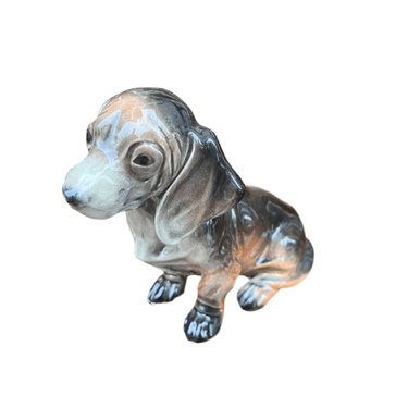 Bella figurita hecha de porcelana de origen checo, de la marca König, representando a un tierno cachorro de perro salchicha esmaltado en tres tonos: negro, café y gris.