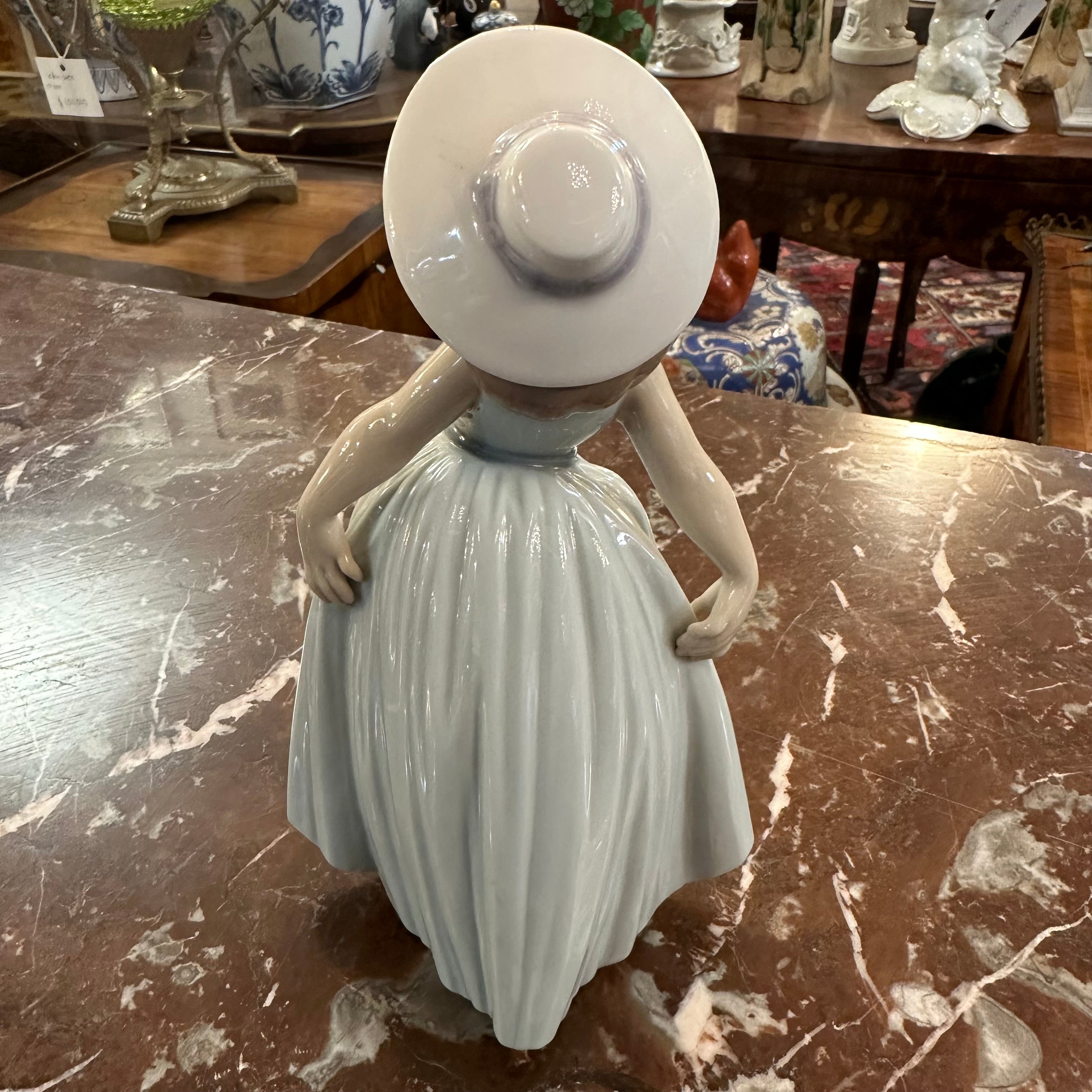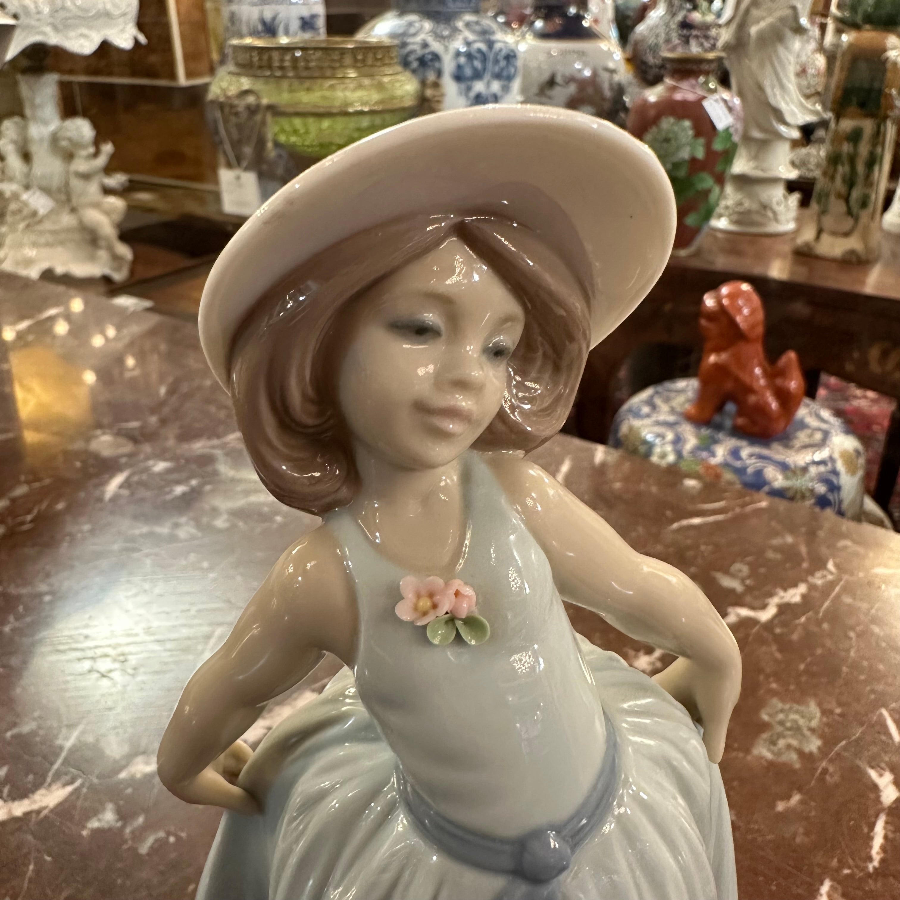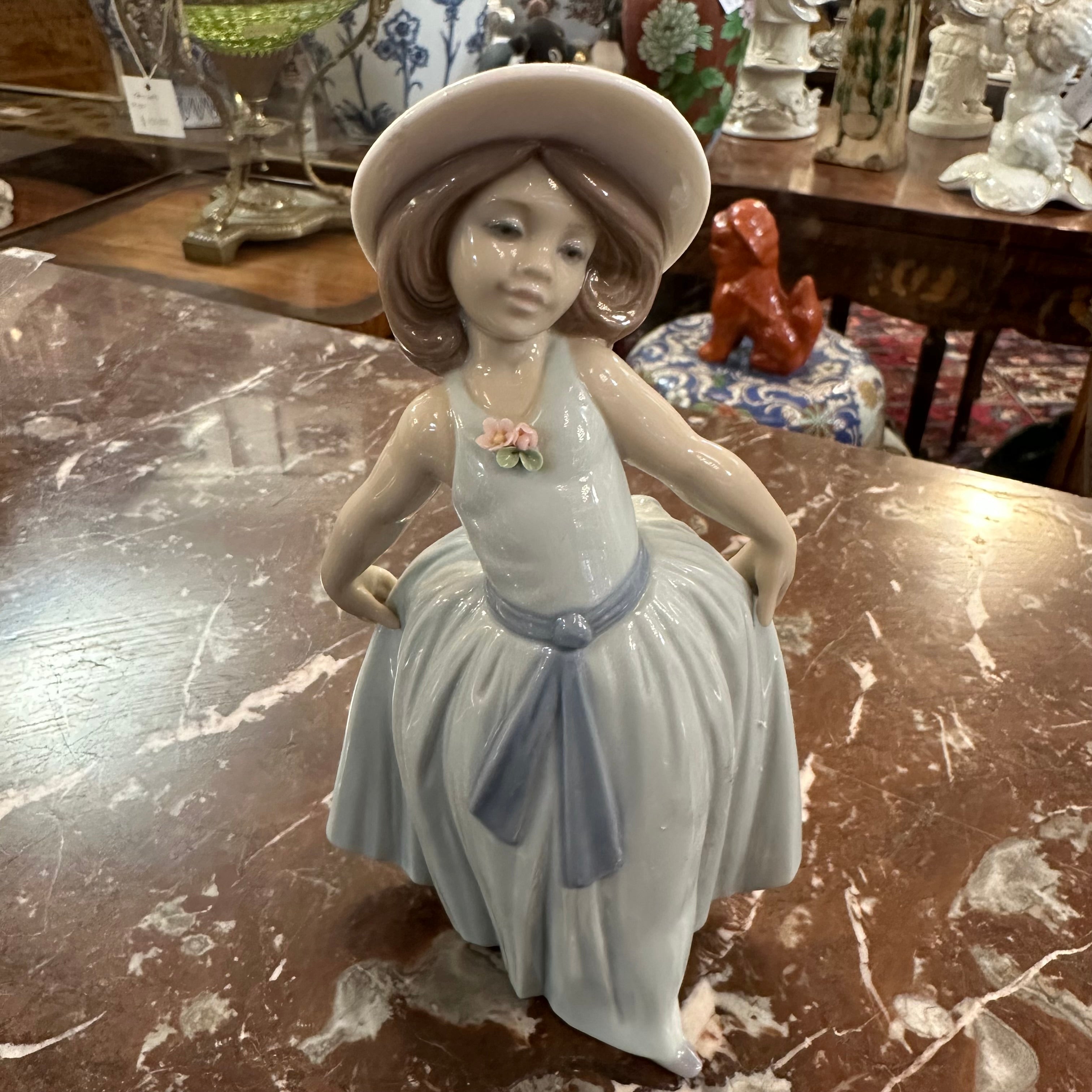 Figura de porcelana de la reconocida marca de origen español, Lladró. La figura representa a una tierna niña con vestido y sombrero, haciendo un gesto de presentación, como mostrando su vestido nuevo. La pieza está capturada con ternura y está llena de detalles, como la flor rosada que está en su cuello. La figura viene con su caja original.