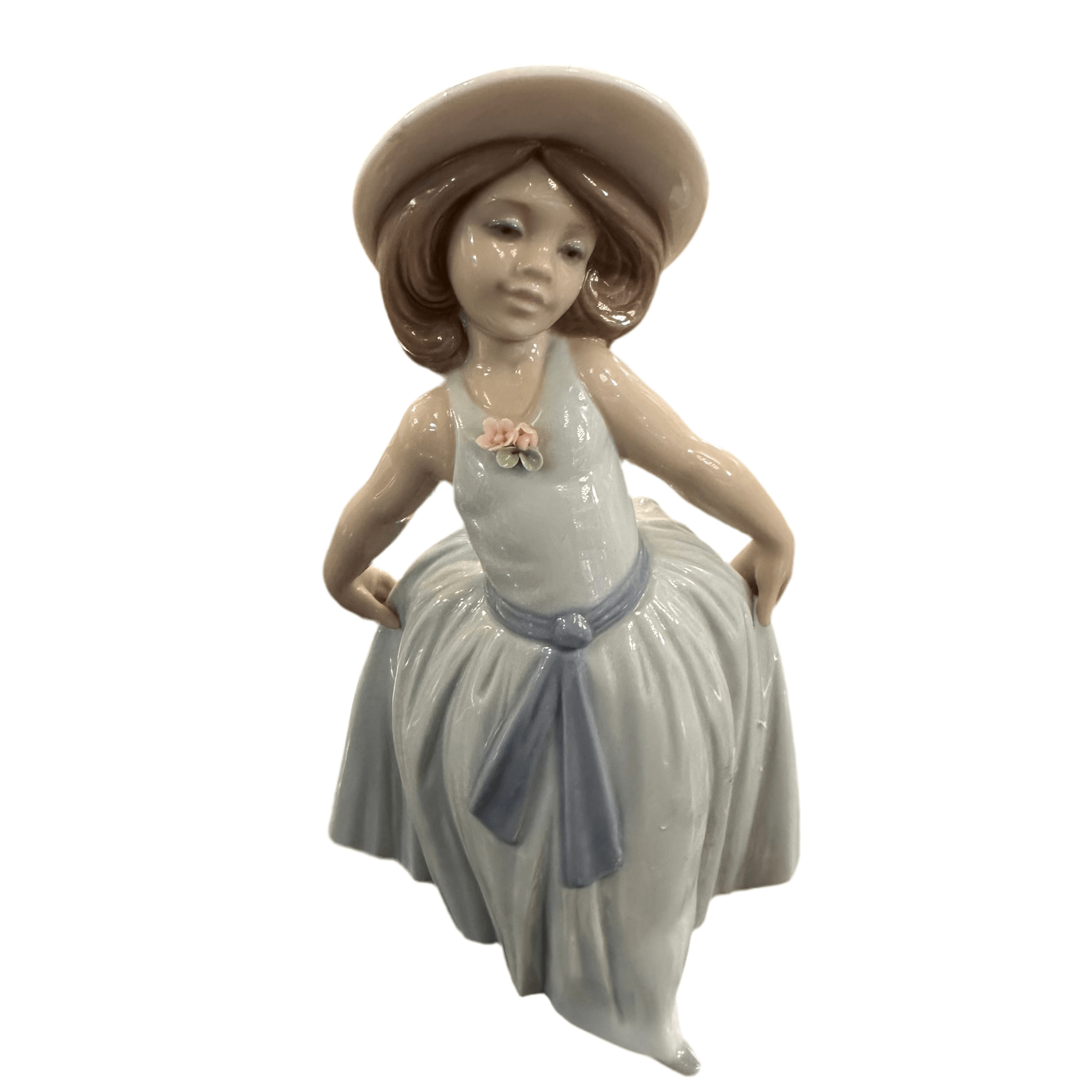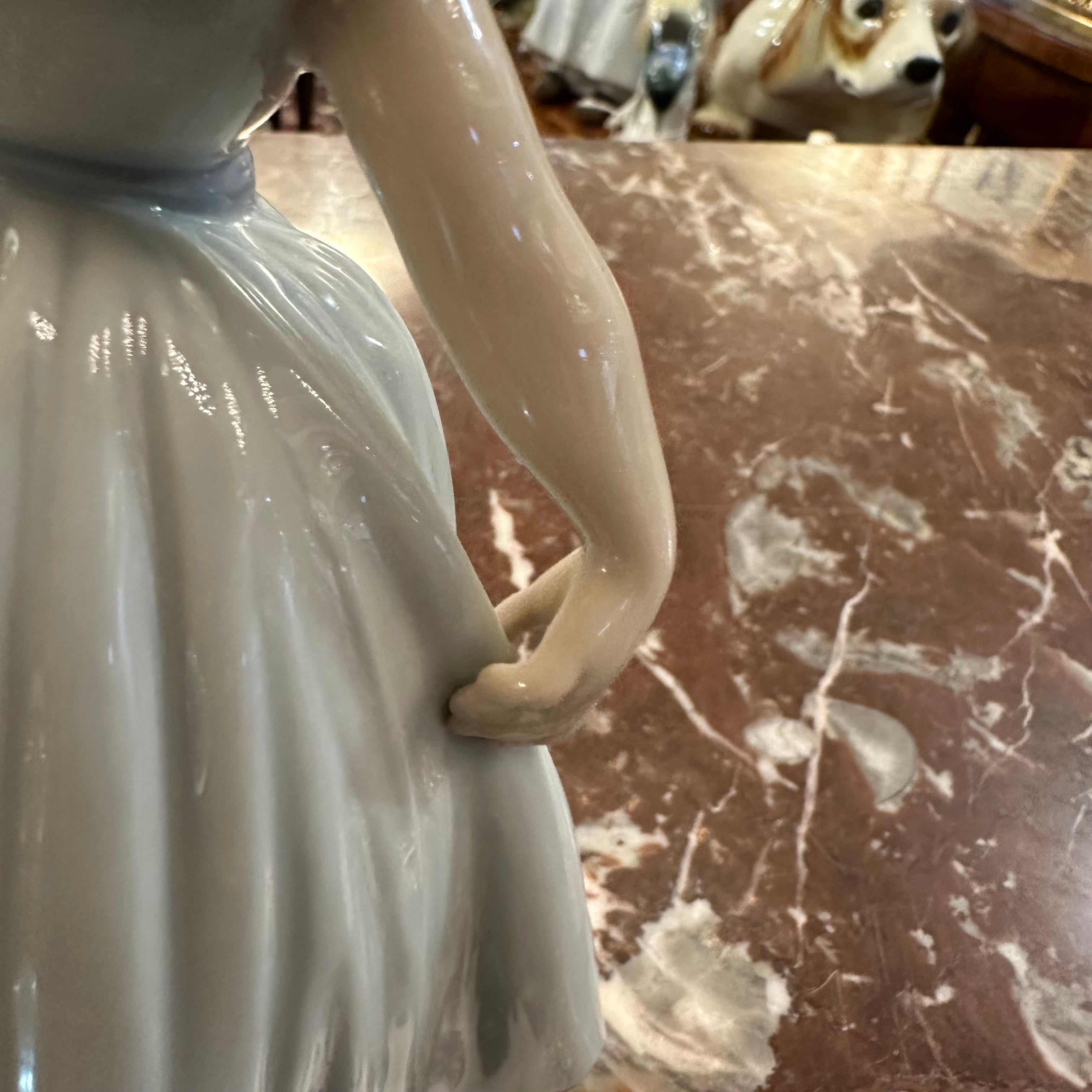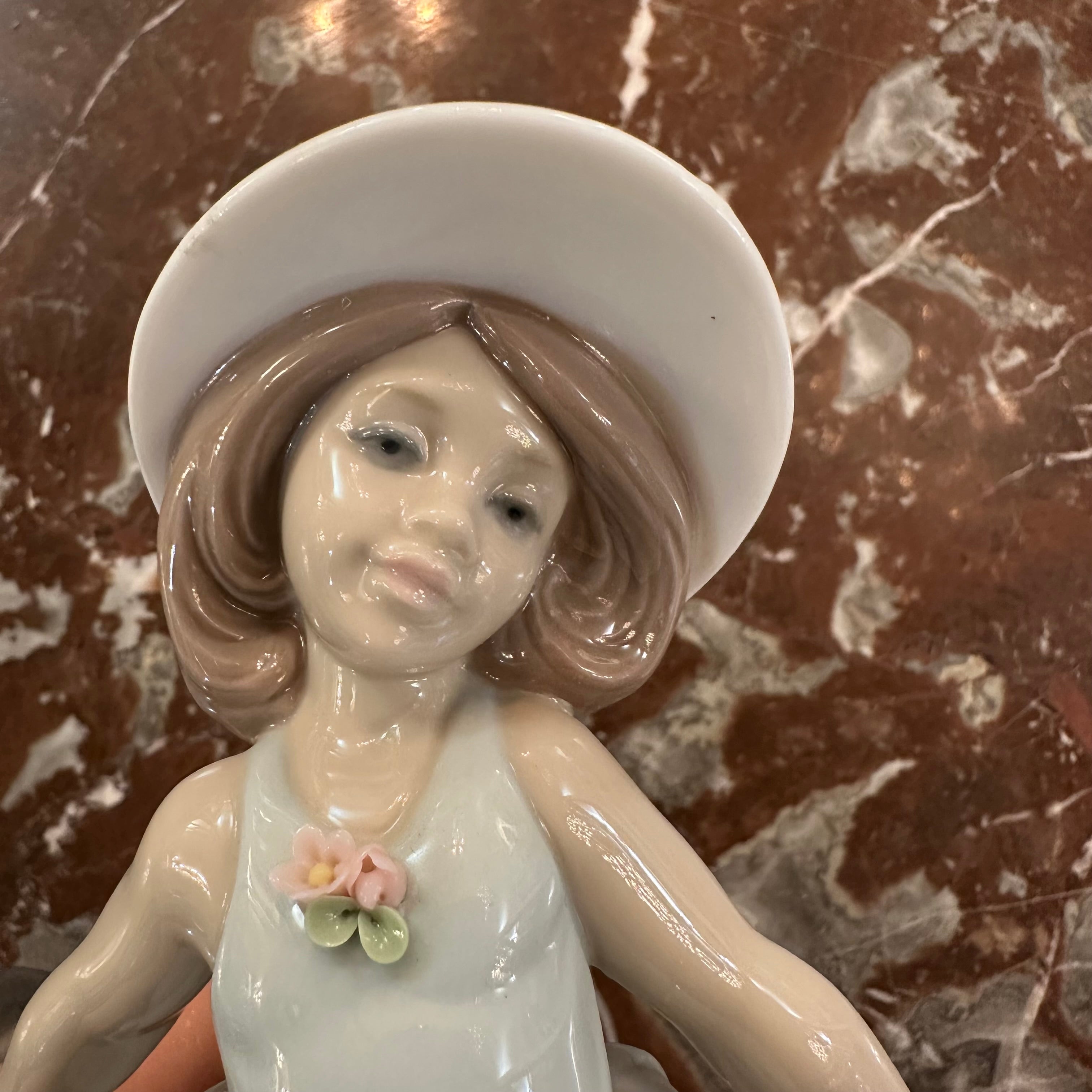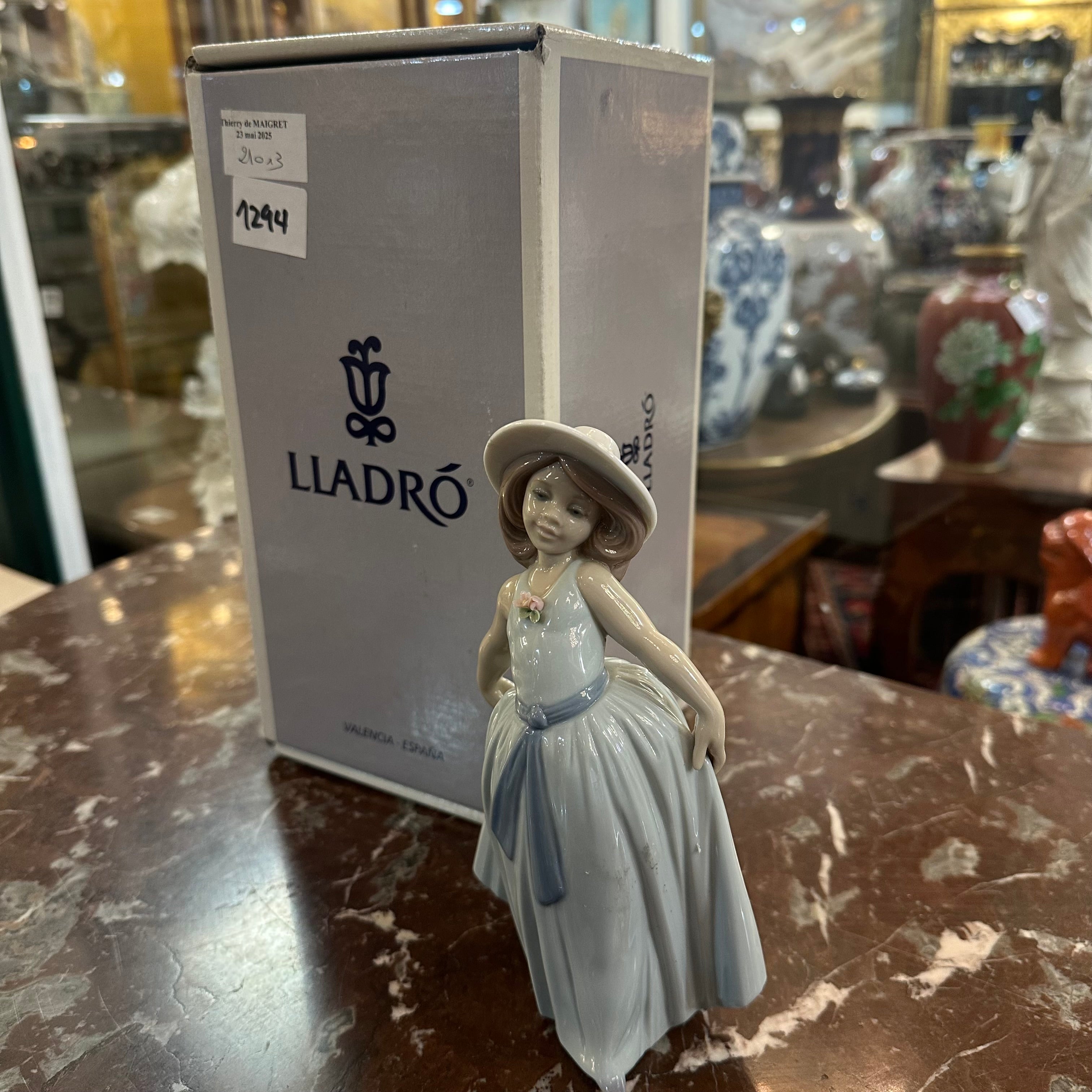 Figura de porcelana de la reconocida marca de origen español, Lladró. La figura representa a una tierna niña con vestido y sombrero, haciendo un gesto de presentación, como mostrando su vestido nuevo. La pieza está capturada con ternura y está llena de detalles, como la flor rosada que está en su cuello. La figura viene con su caja original.