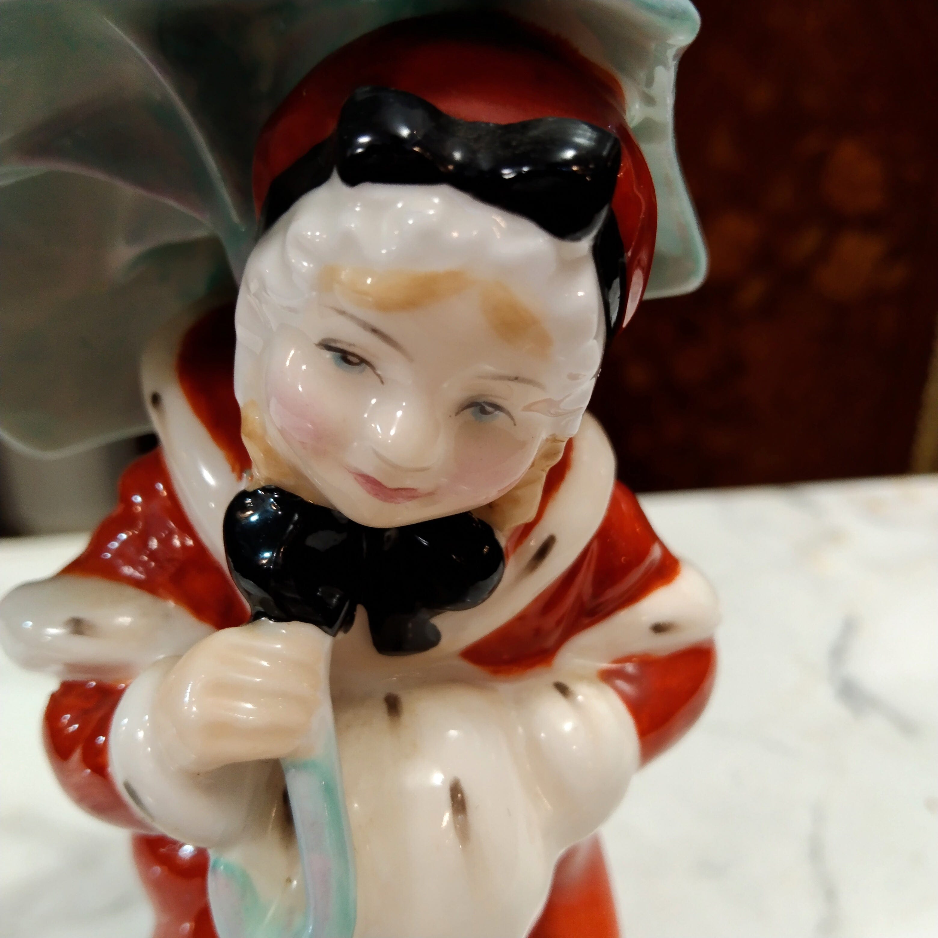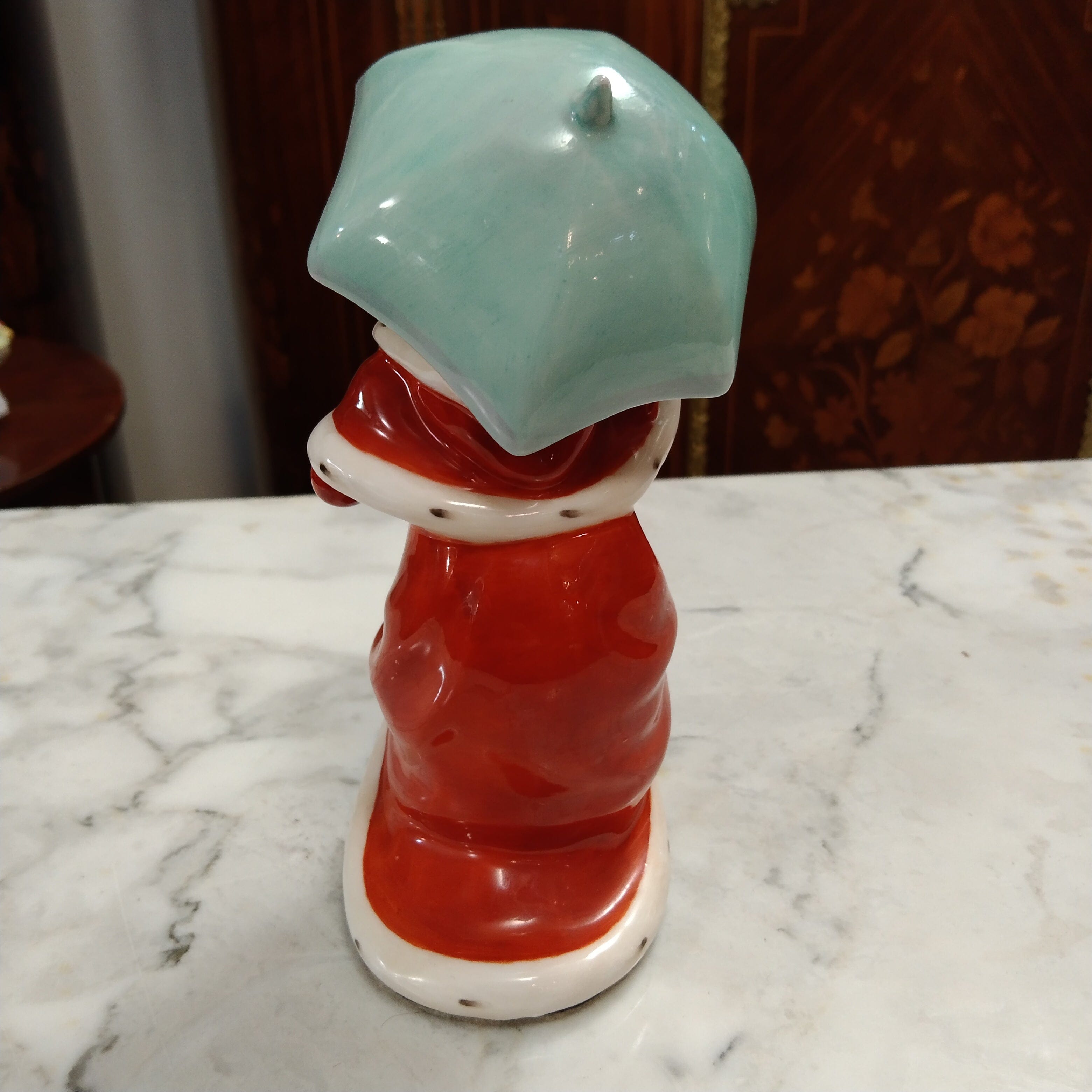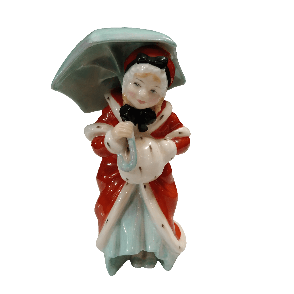 Linda figura de porcelana inglesa de la marca Royal Doulton, fabricada y pintada a mano. La figura representa a una mujer con un abrigo de invierno rojo, muy similar al de la conocida Señora Claus. La mujer lleva además un paraguas celeste.