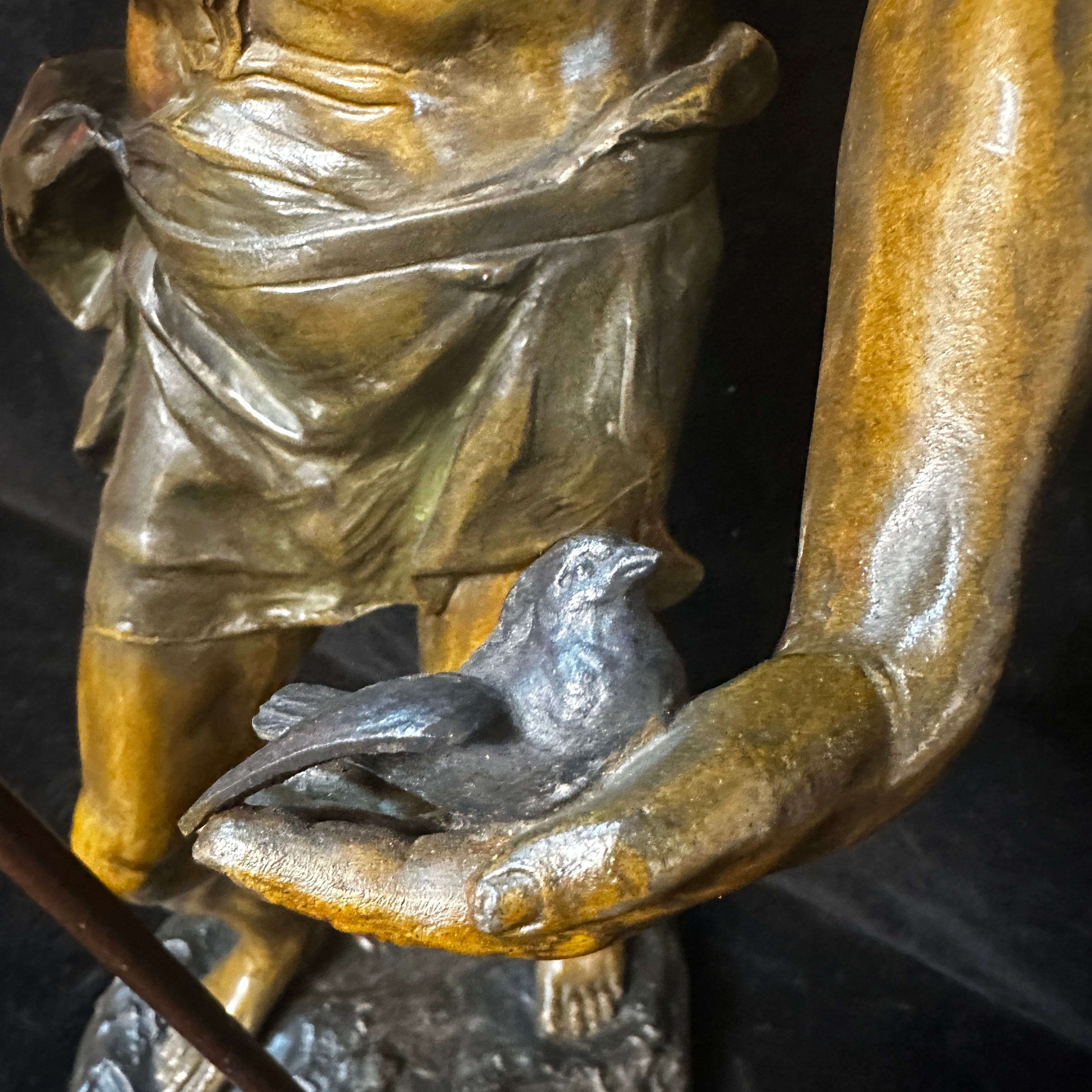 Hermosa escultura de peltre trabajada con gran detalle titulada 'El viejo caminante', representando a un hombre de edad avanzada caminando descalzo apoyado en un báculo y cargando un ave en su mano, símbolo de la libertad. La obra contiene una placa en su base con el título y la firma del autor.