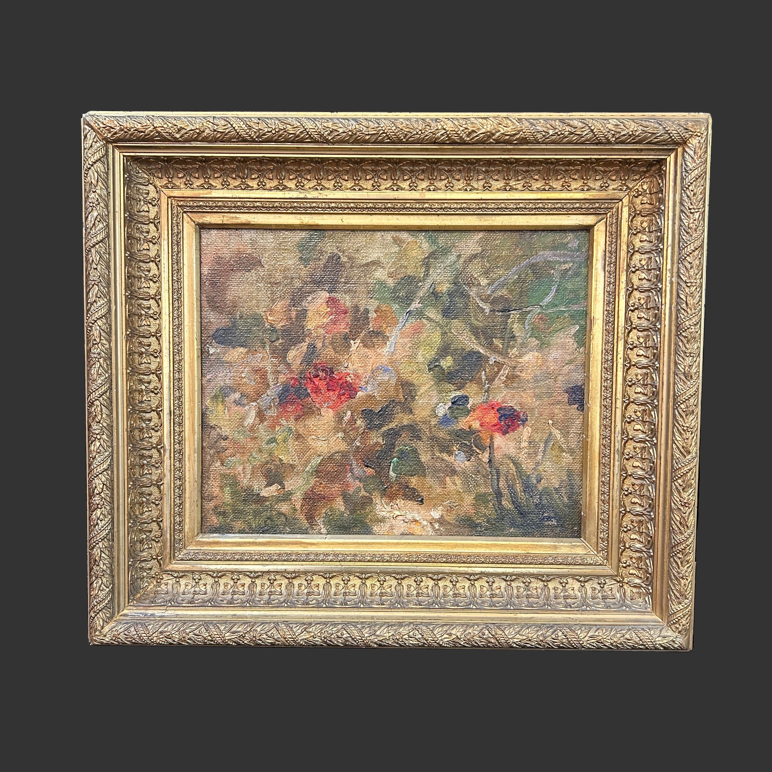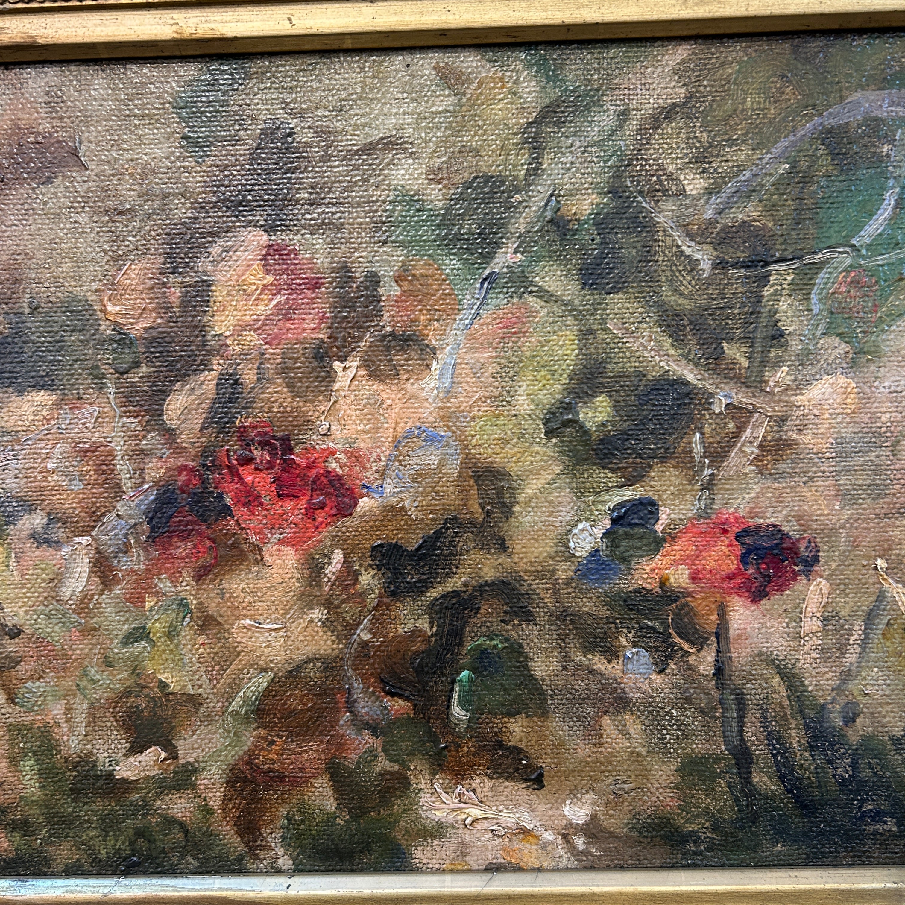 Precioso óleo del pintor chileno Juan Francisco González. Se puede apreciar lo que al parecer es una imagen de flores silvestres multicolor. Dos flores probablemente amapolas en tono rojo intenso resaltan por sobre el resto. Con un fondo difuminado y enmarcado en un marco dorado, hace que está pieza se vuelta muy atractiva para exhibir en un salón o pasillo.