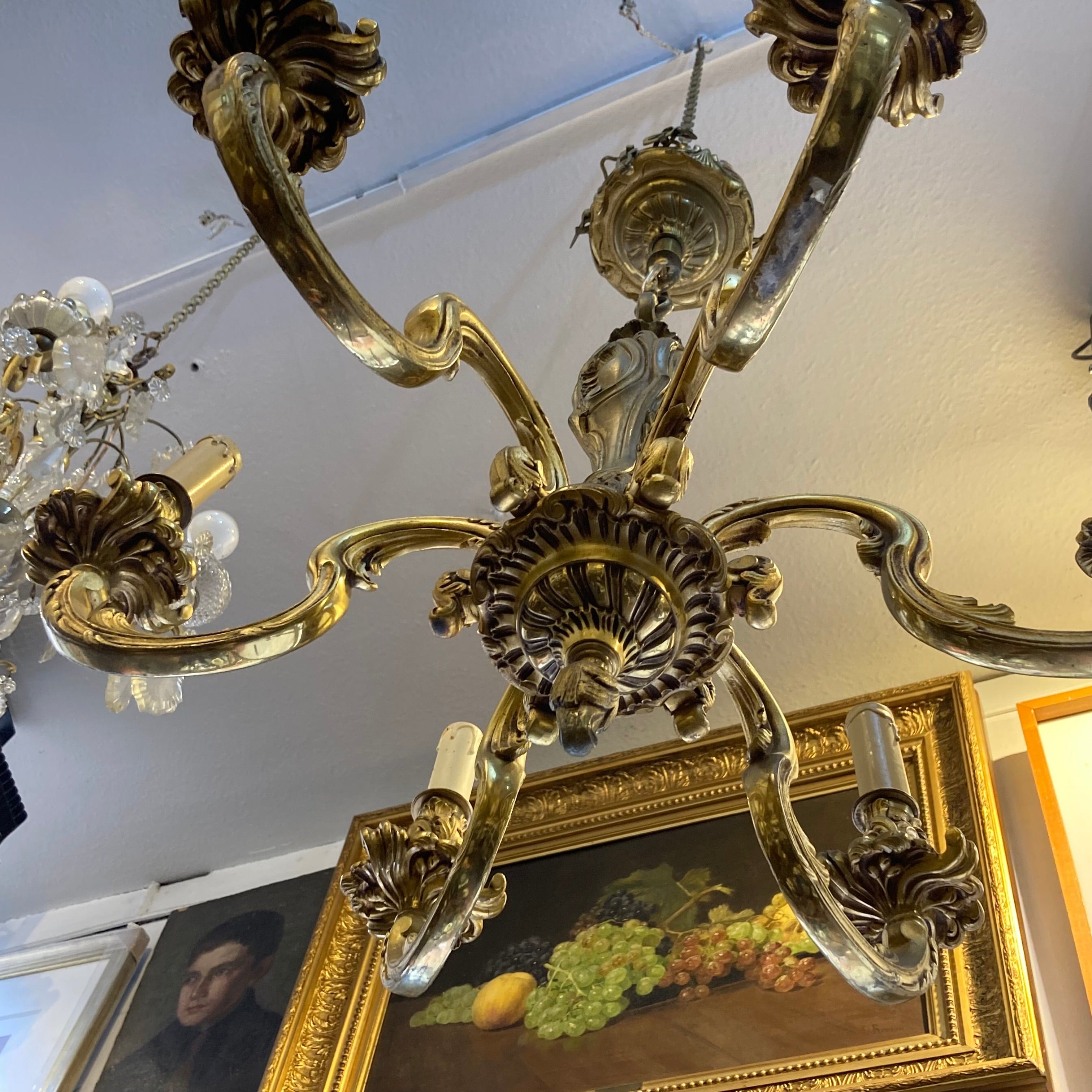 Elegante lámpara de bronce Luis XV. Cuenta con 6 brazos y respectivas luces.  Refinados detalles característicos del estilo Luis VX, son parte de su diseño.