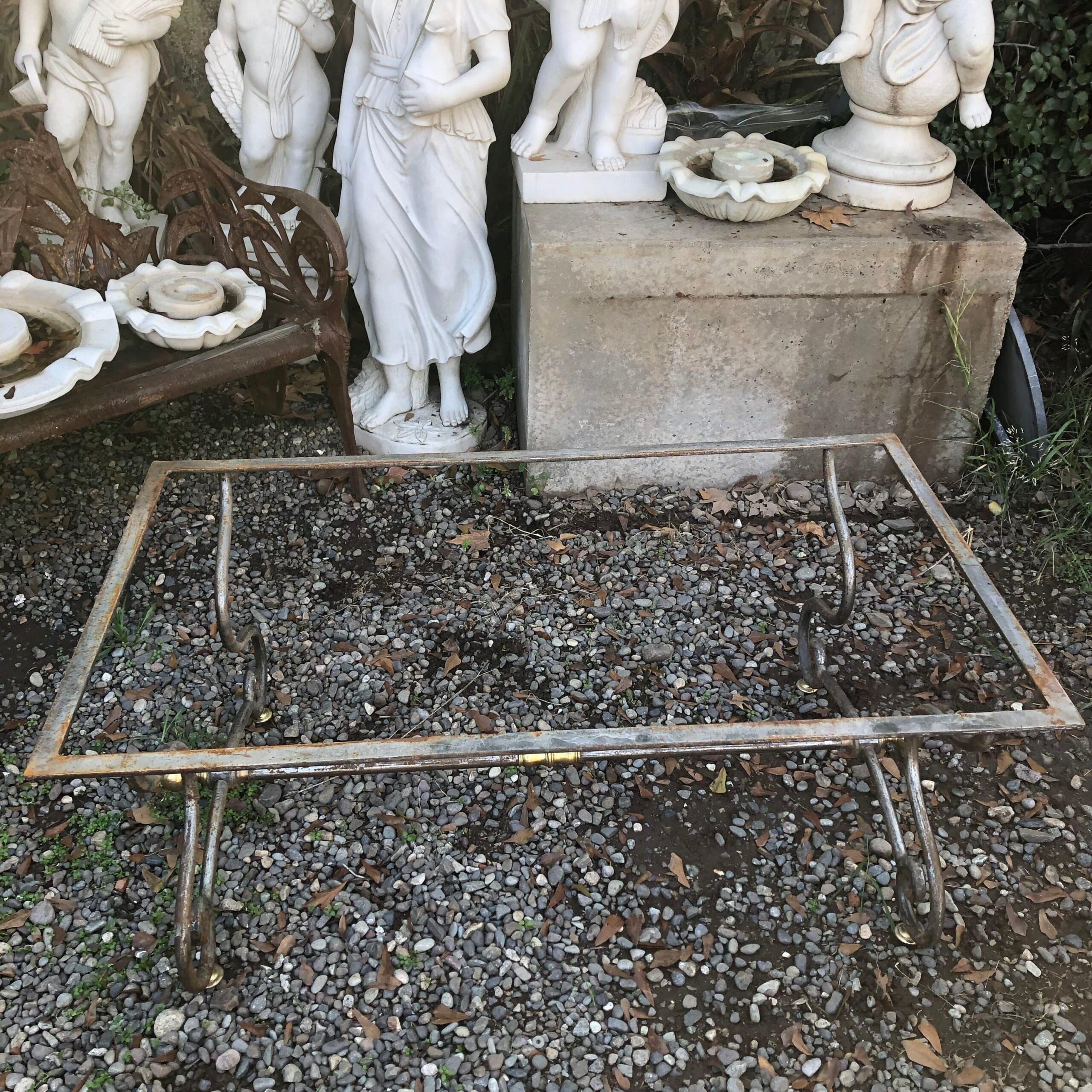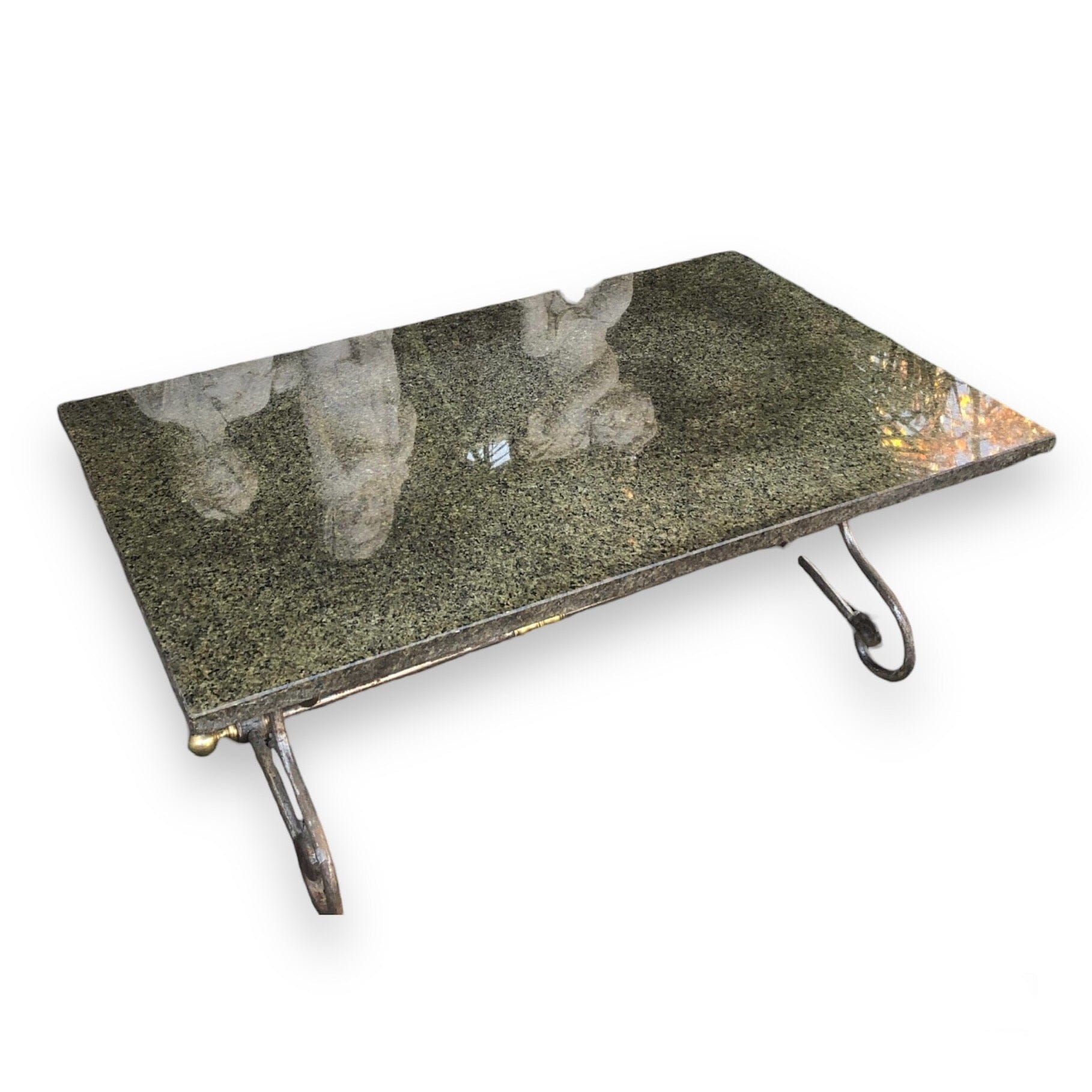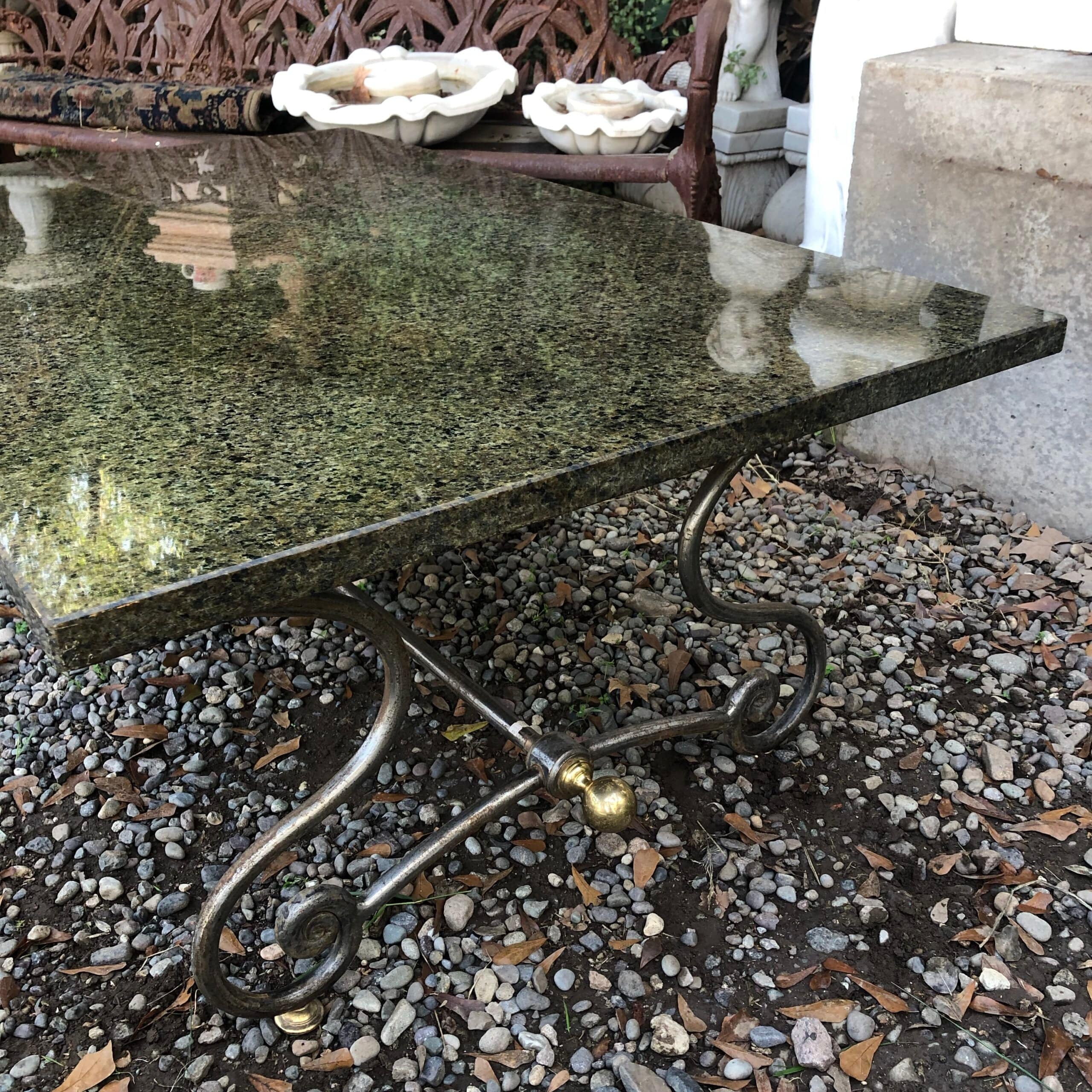 Mesa de exterior, estructura de fierro con aplicaciones de bronce y cubierta de mármol.