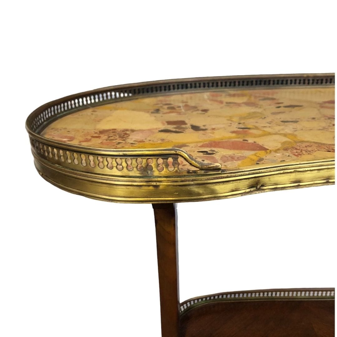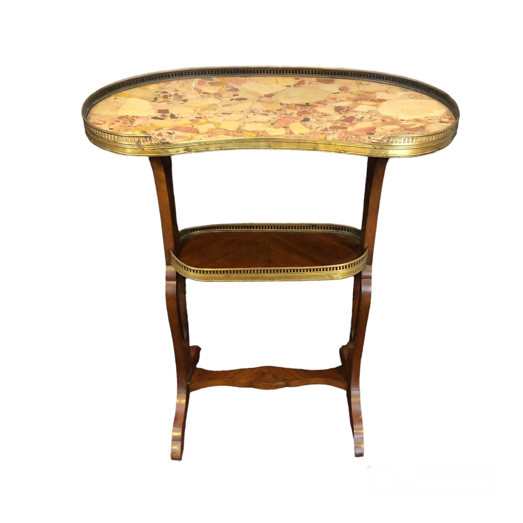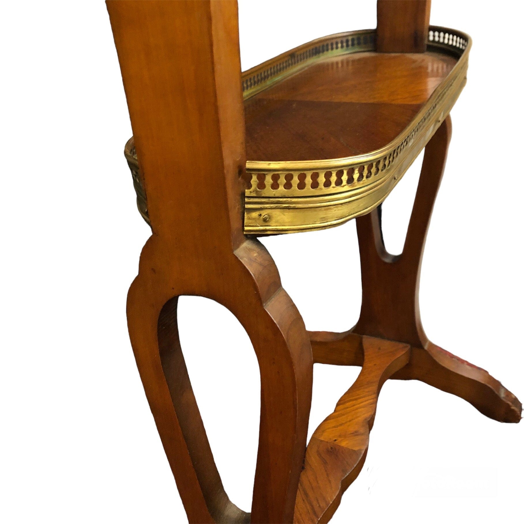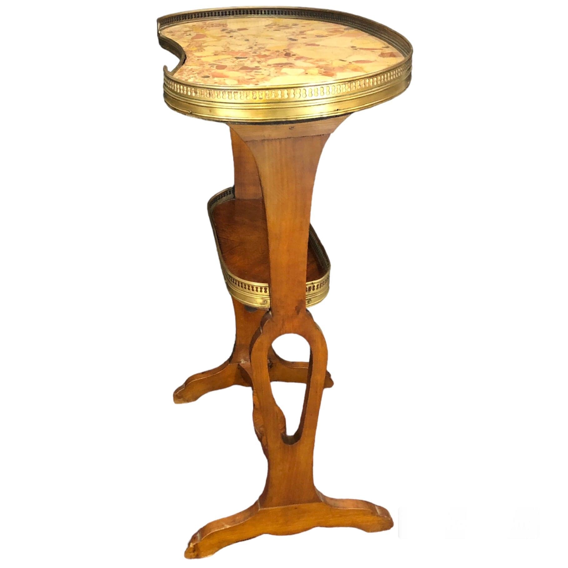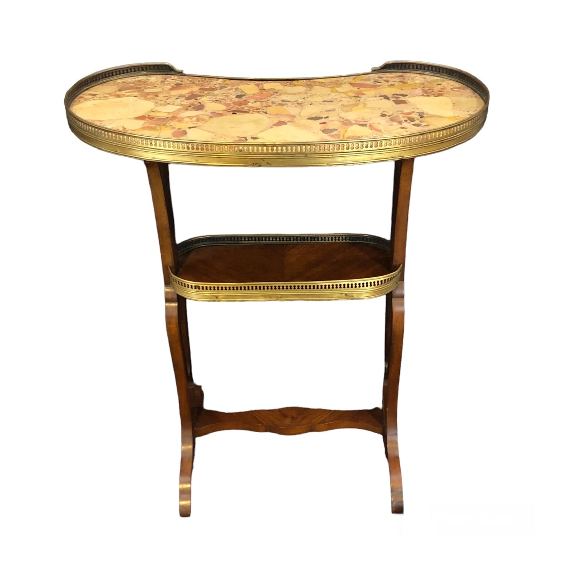 La cubierta superior es en mármol, la inferior en caoba. Guarniciones de bronce. Patas dipodhs.