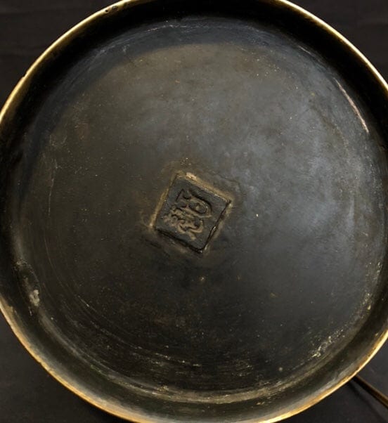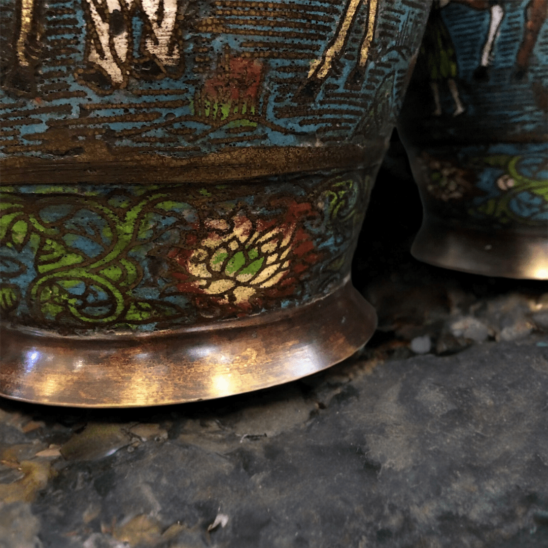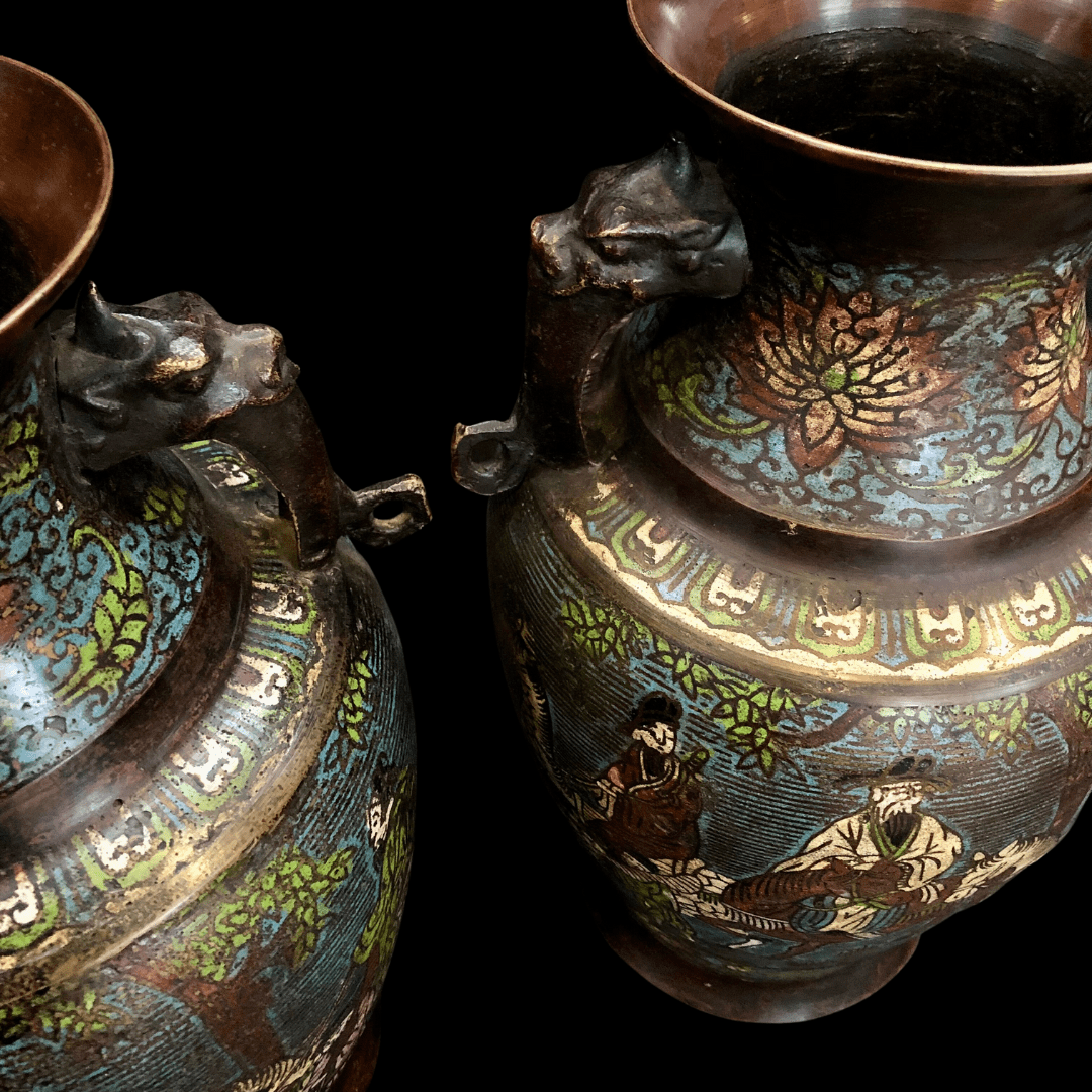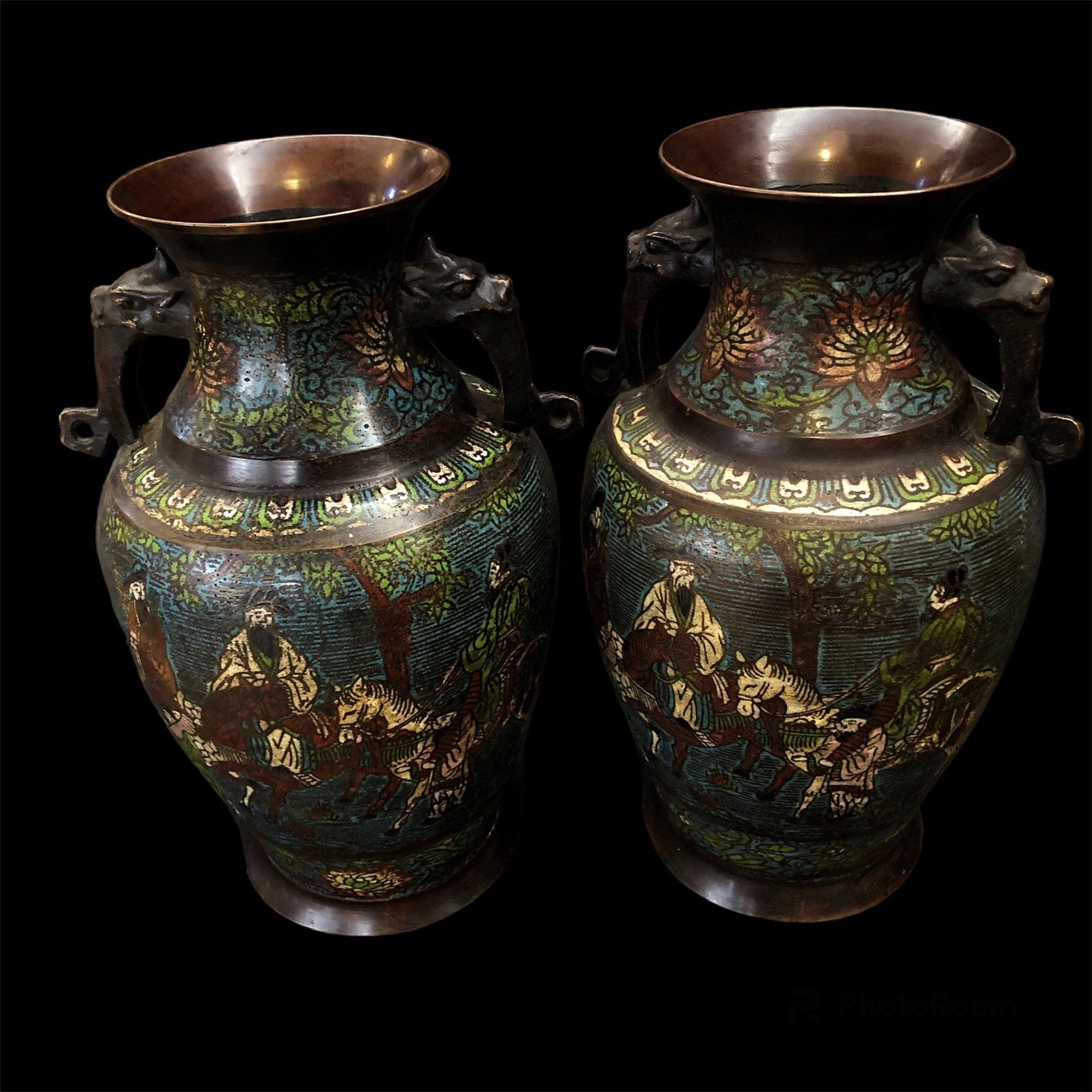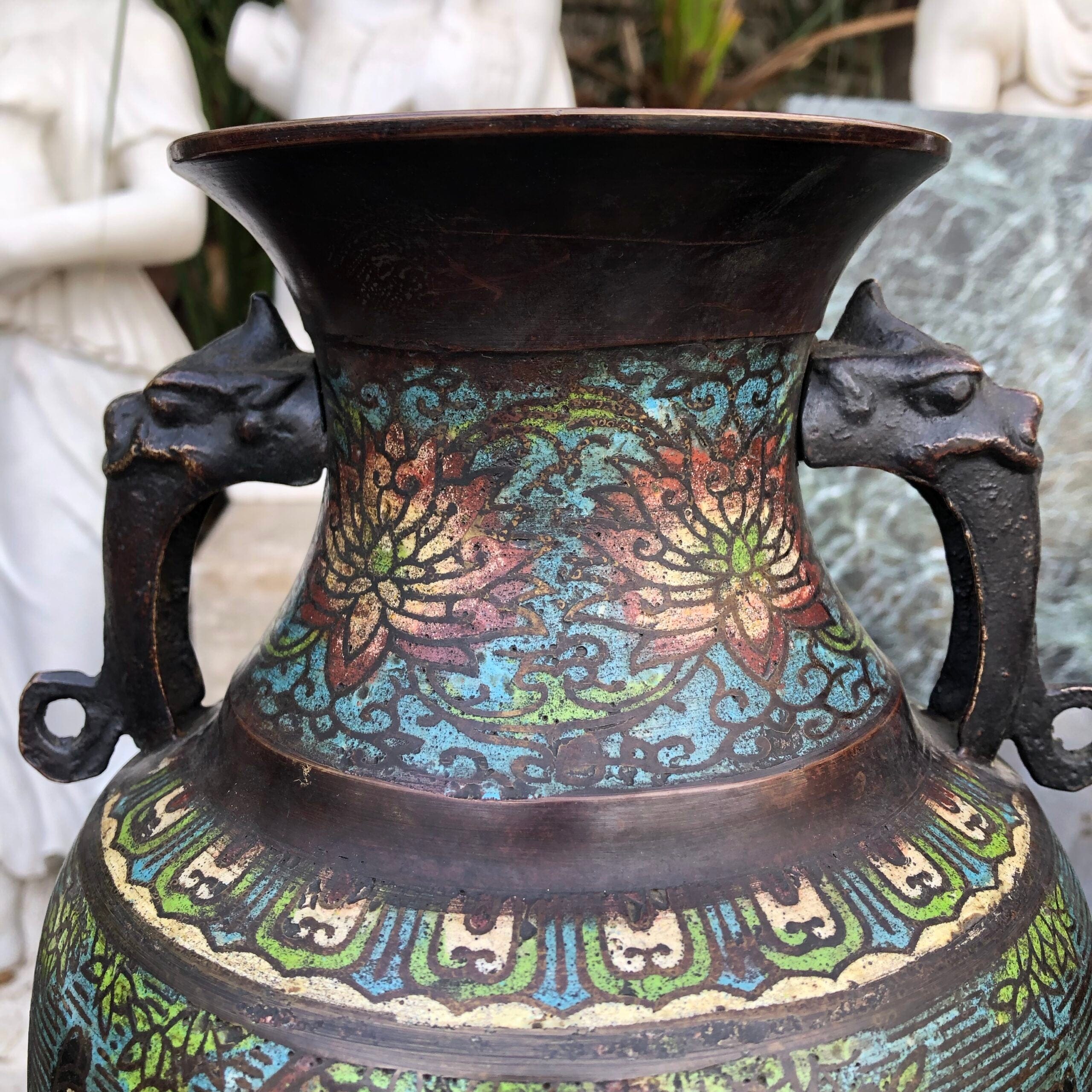 Bellos jarrones bronce cloissoné sin relieves, elegantes ensambles de colores, asas en bronce con forma de cabeza y trompa de elefante.