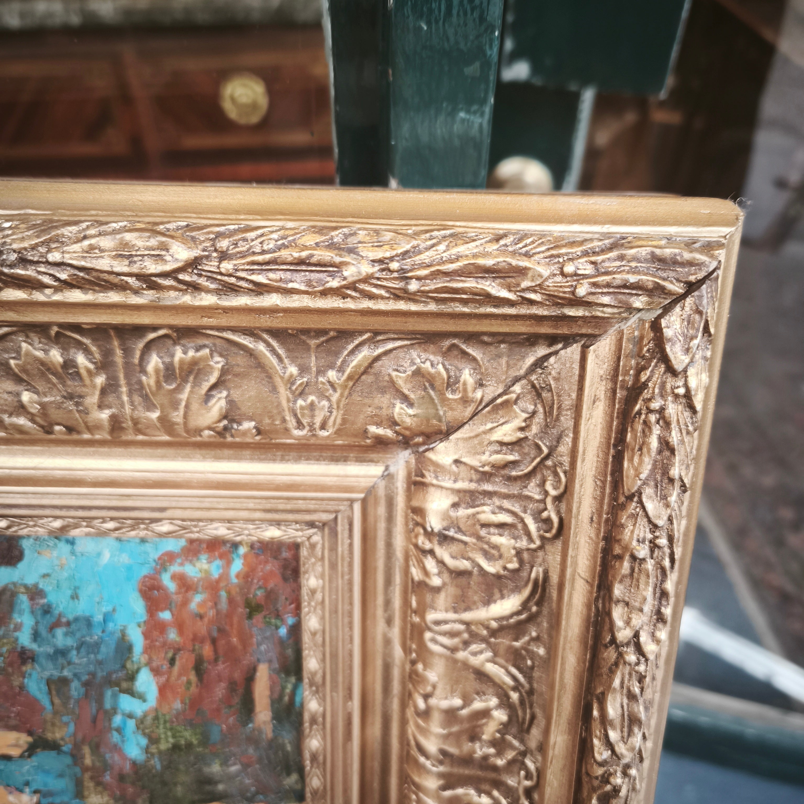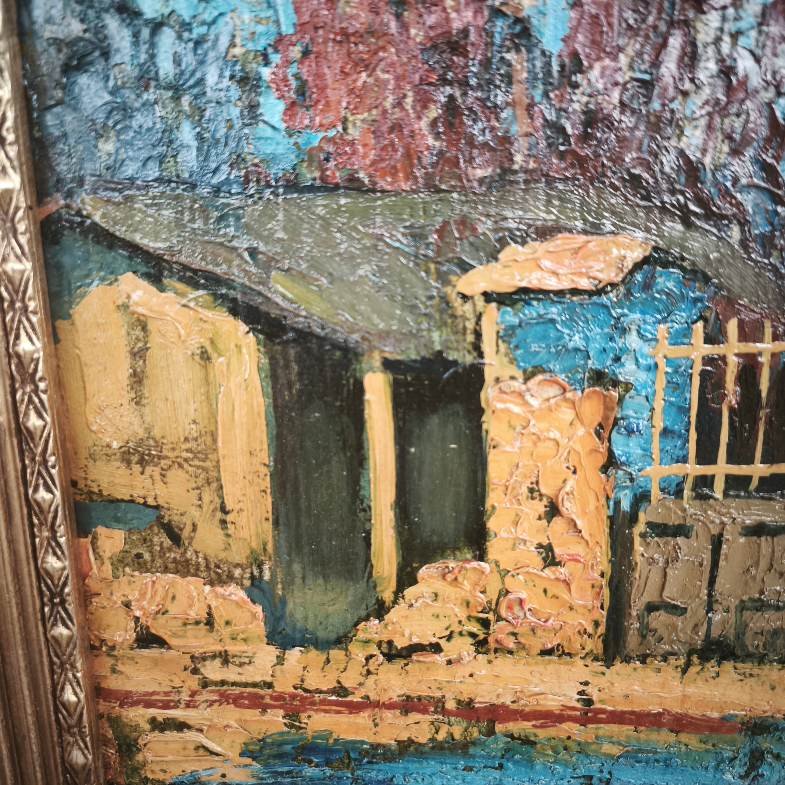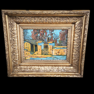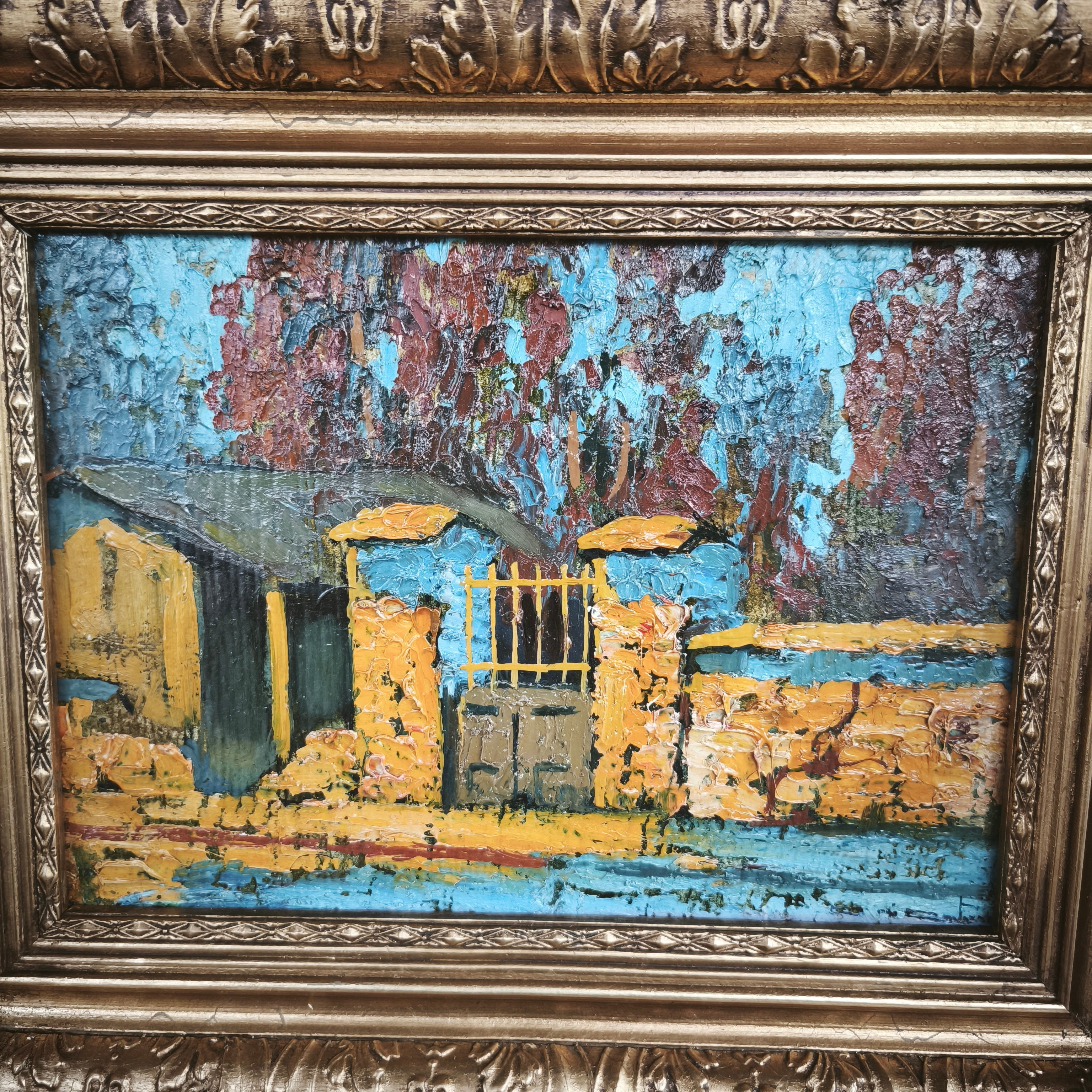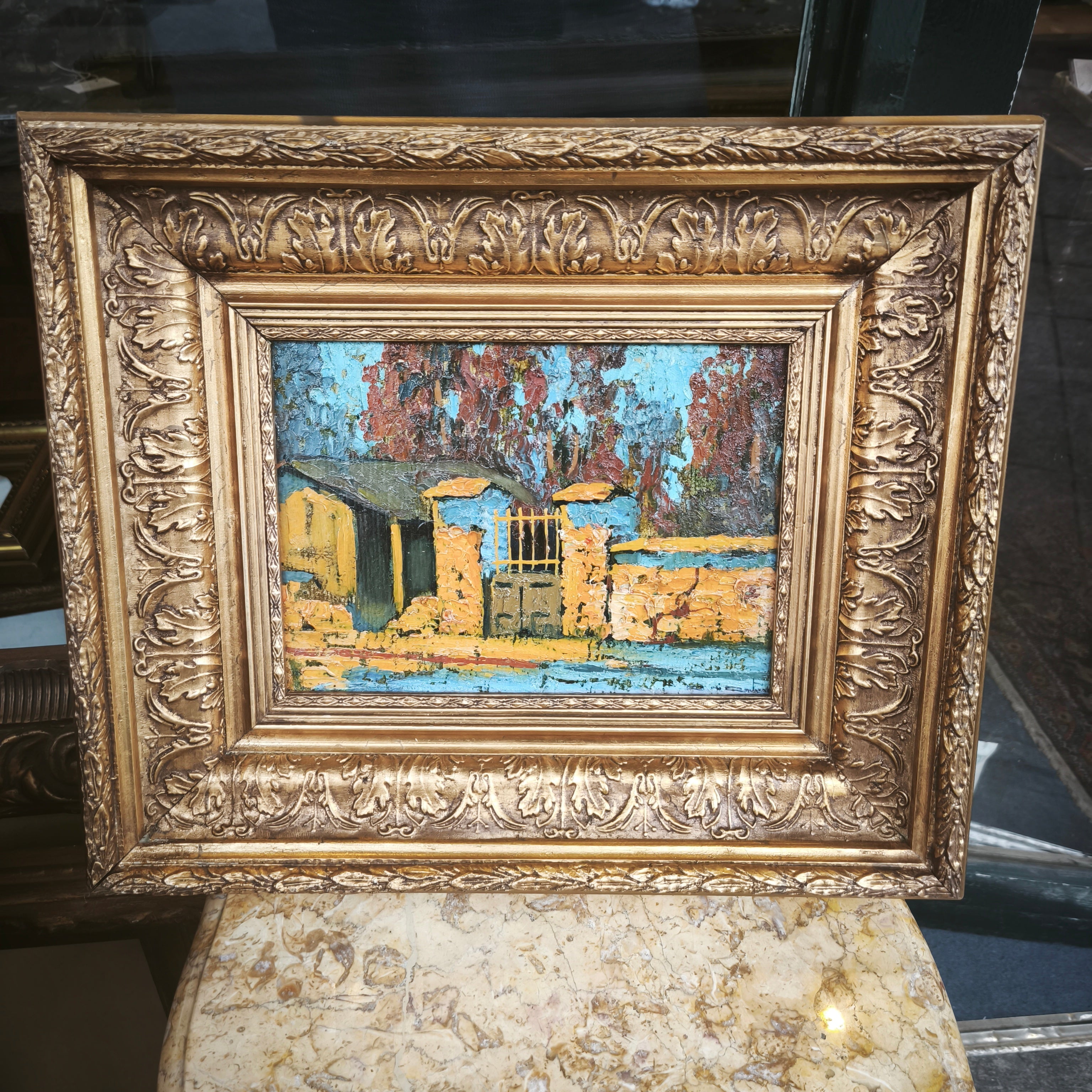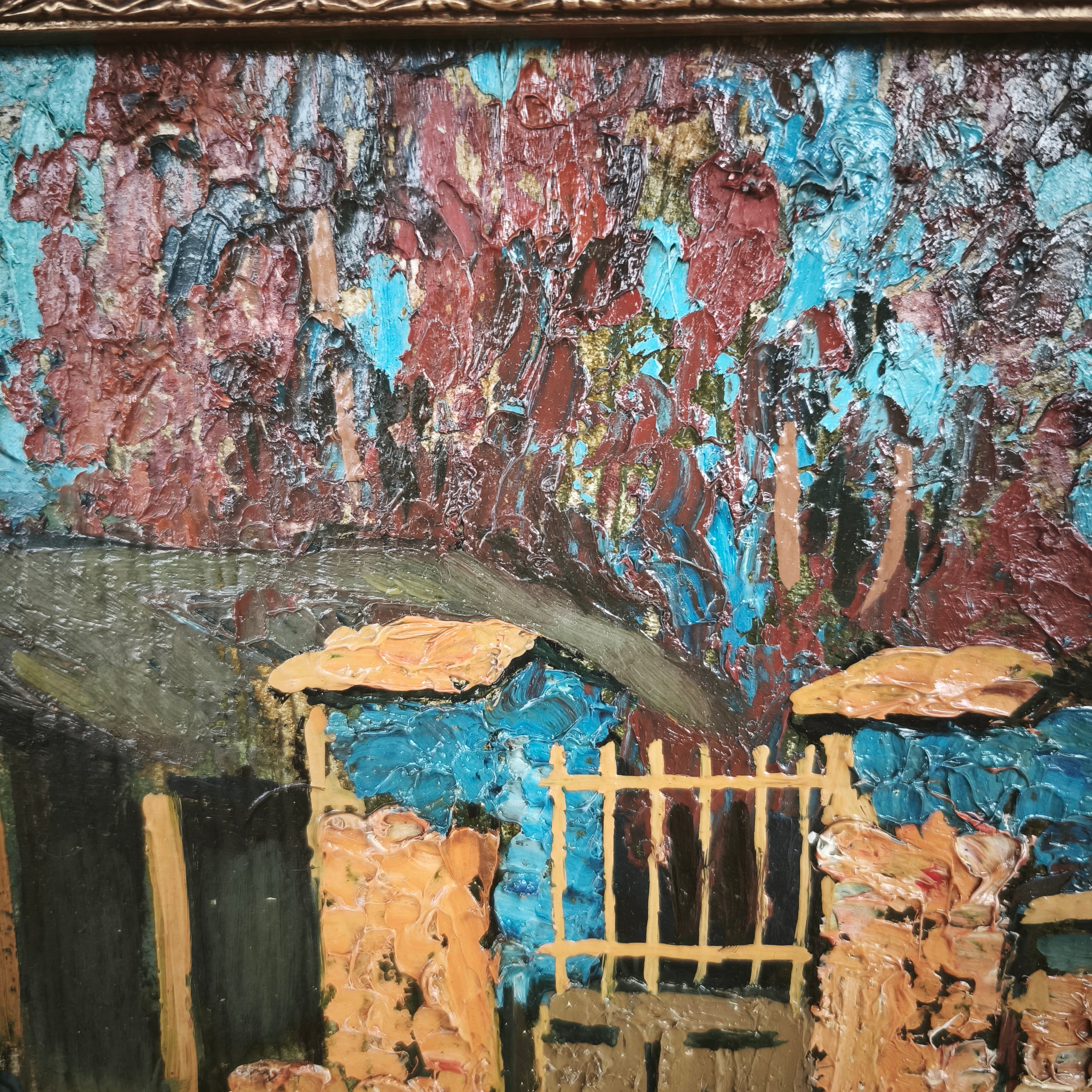 Bello óleo sobre madera, del artista de origen chileno Darío Contreras, representando una reconocible postal de sectores rurales de Chile, como es una reja con muro a media altura para entrar a una casa. Lo interesante es que se trata de un motivo clásico, representado a través de elementos impresionistas y expresivos en sus trazos, colores y uso de materia, generando una sensación y atmósfera particular. La obra, además, tiene un espectacular Marco dorado tallado en relieves y pintado de elegante dorado.