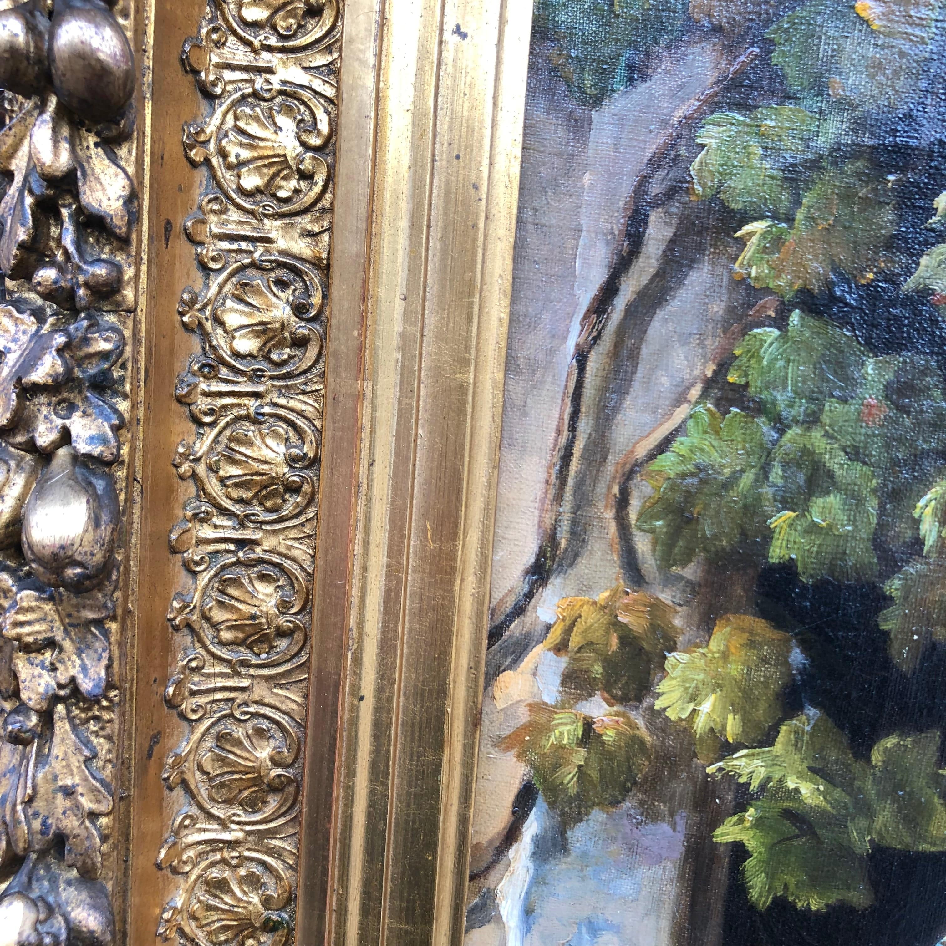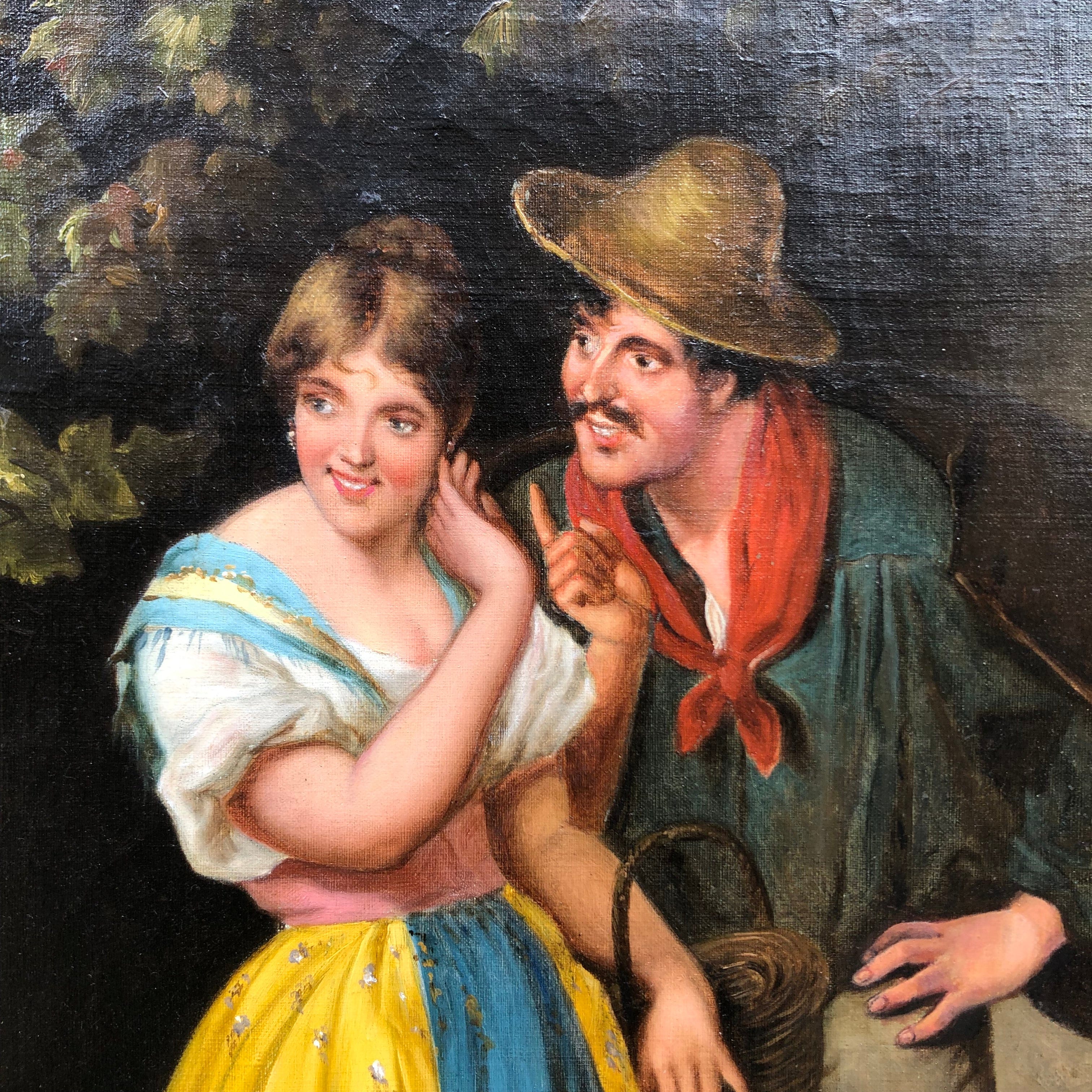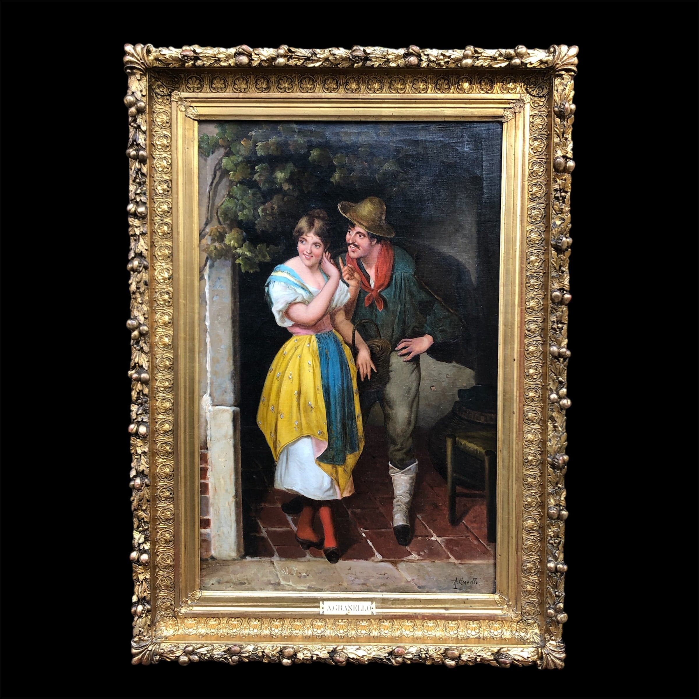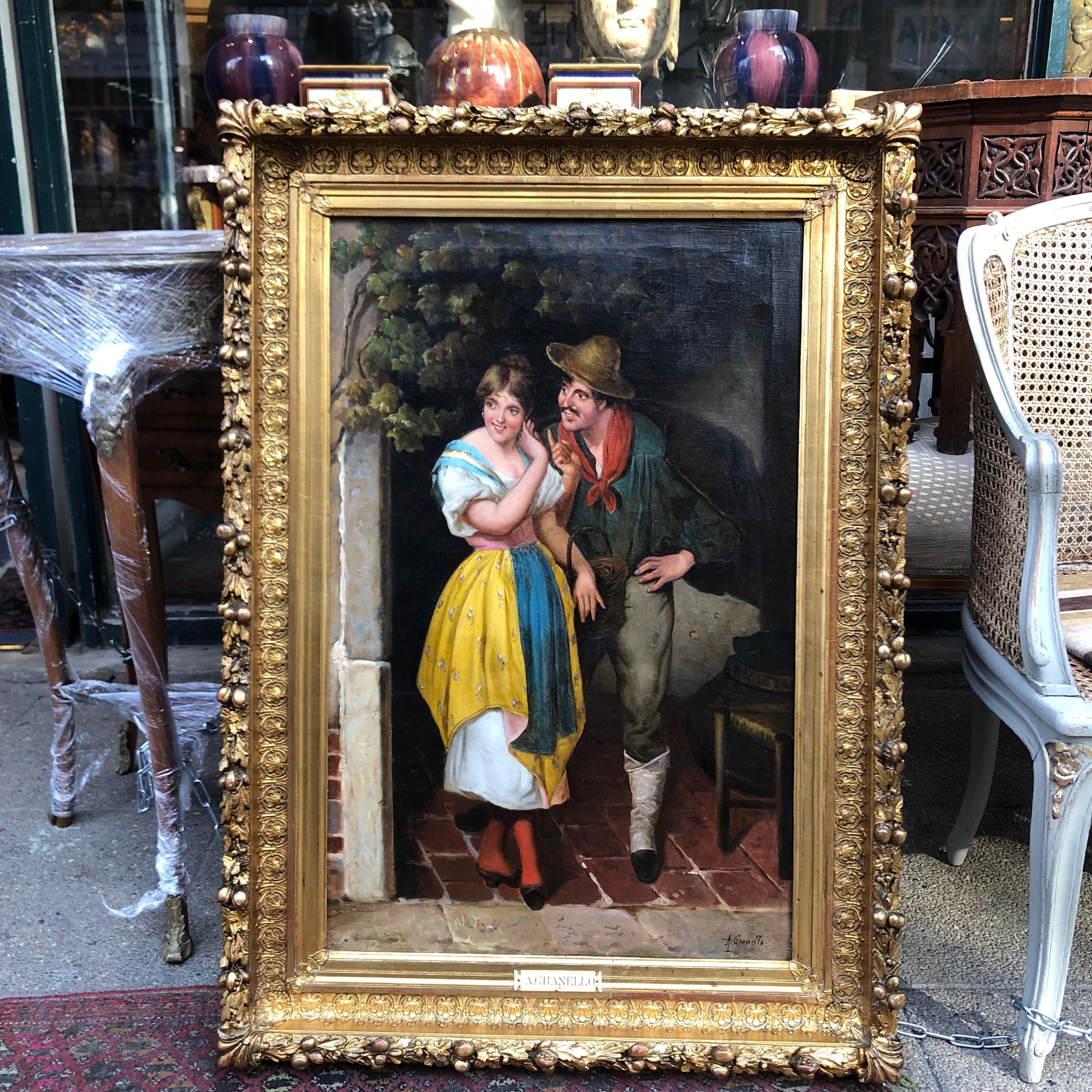 Oleo del artista italiano A. Granello, (Escuela italiana) una pareja que parece alegre en la entrada de una casa. Bello marco dorado de madera.
