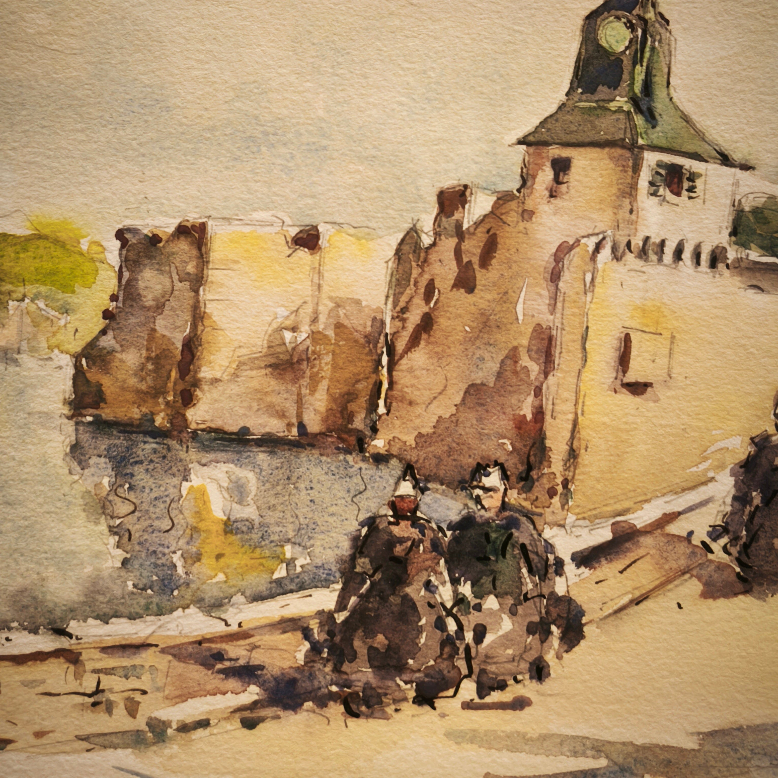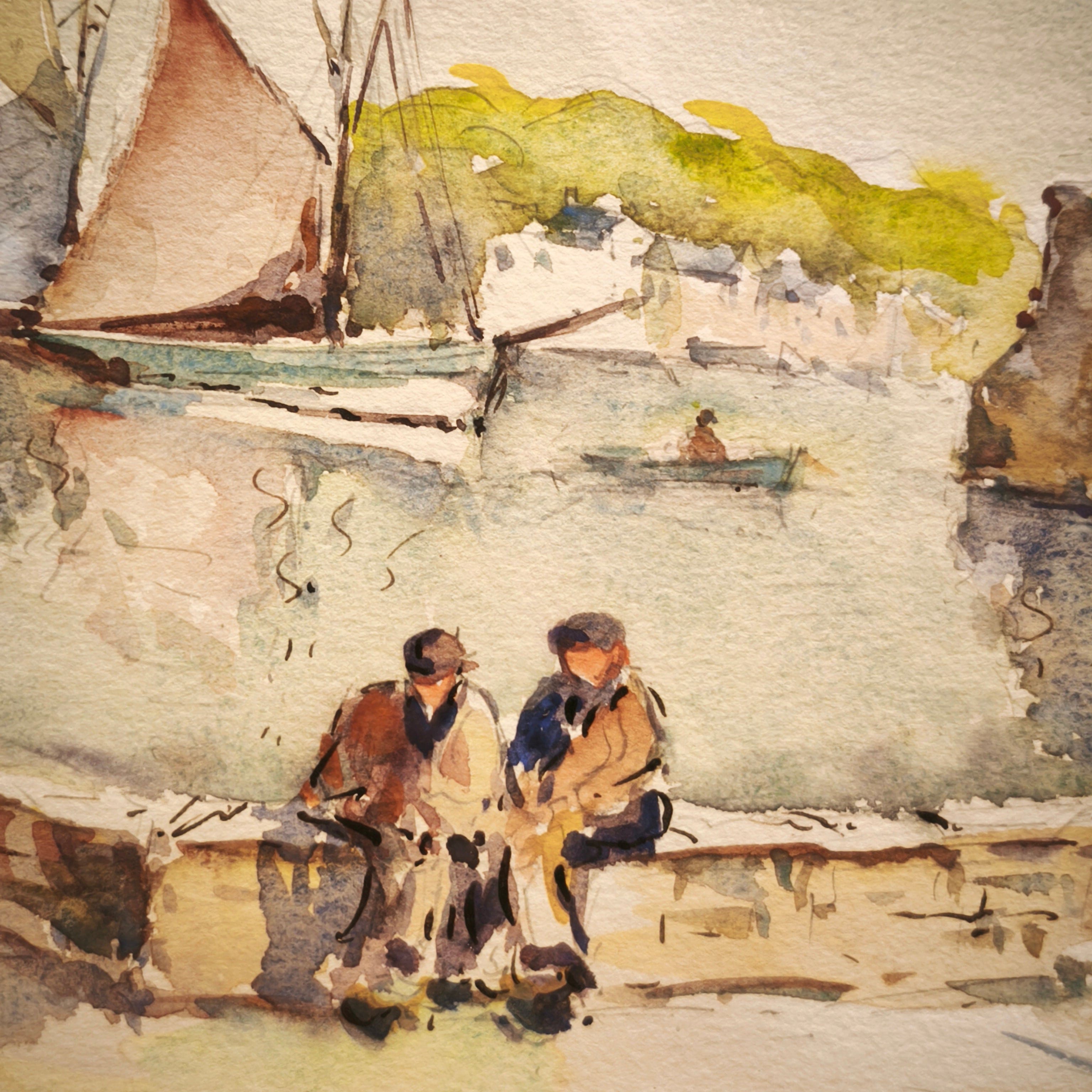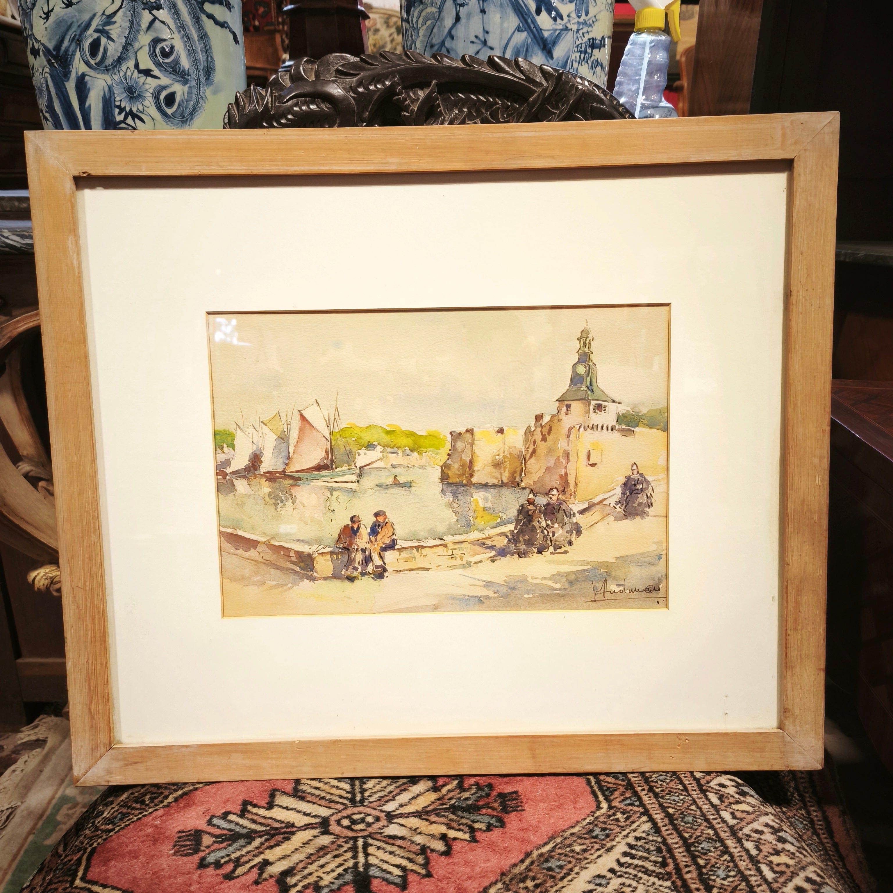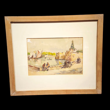 Bella acuarela de origen frances en la que vemos alguna ciudad con borde costero, retratando una avenida de tranqito de barcos y personas, con tonos suave y enmaracda en un marco de madera muy simple y sencillo que resalta tambien los colores de la obra.