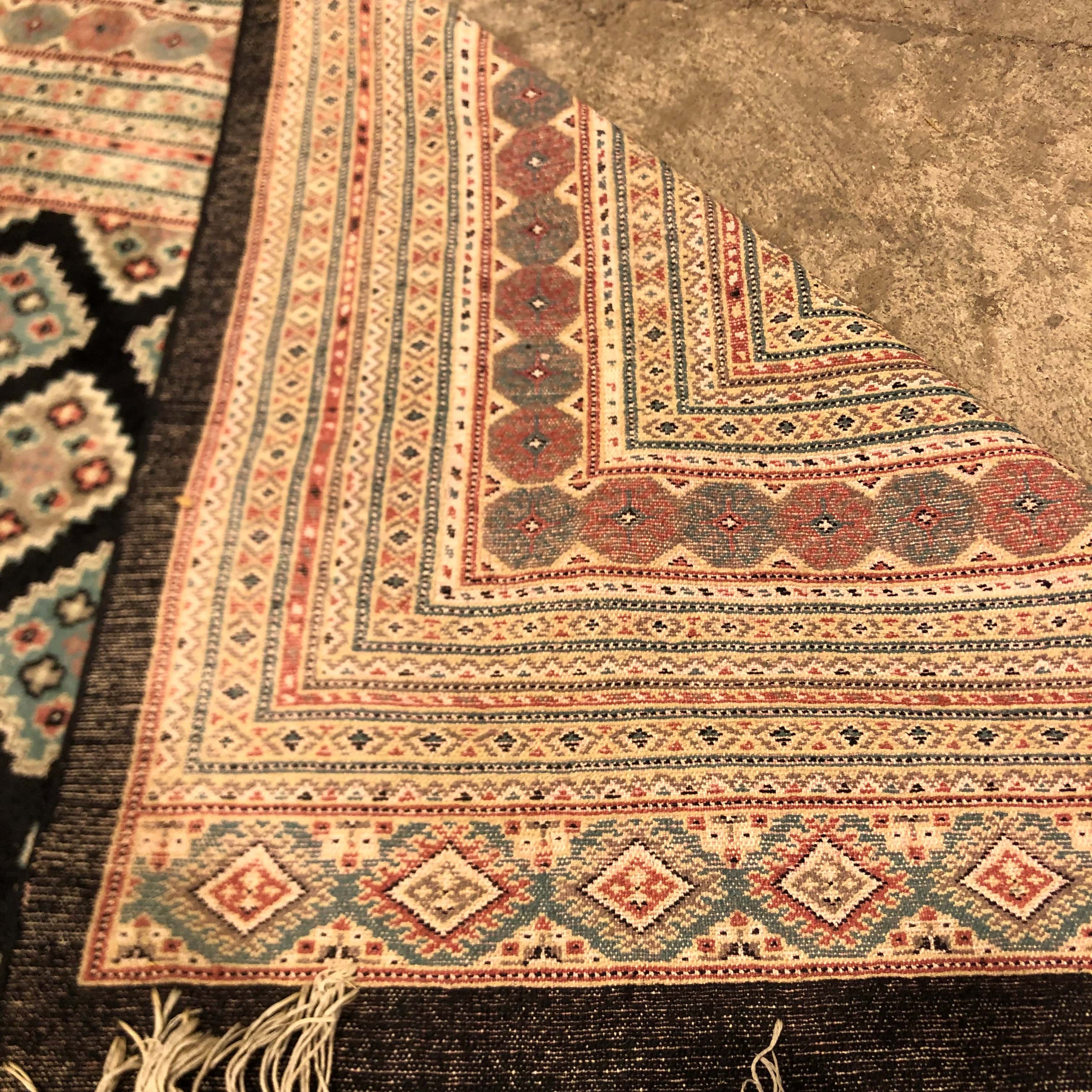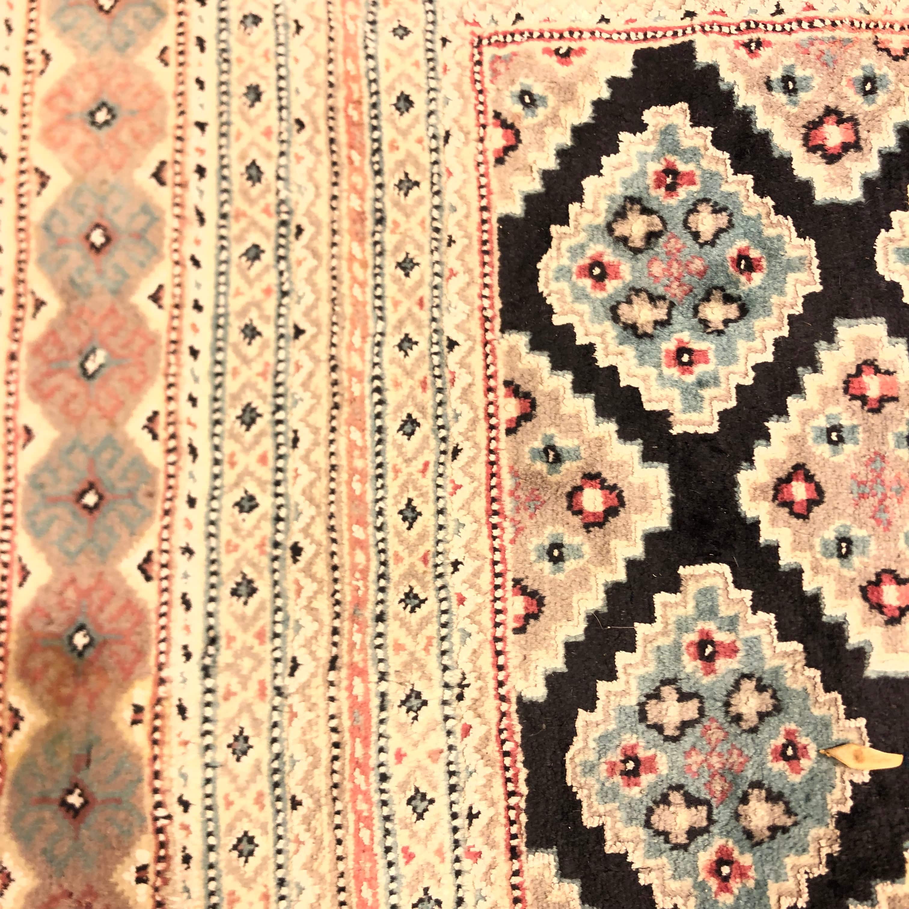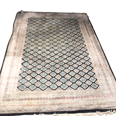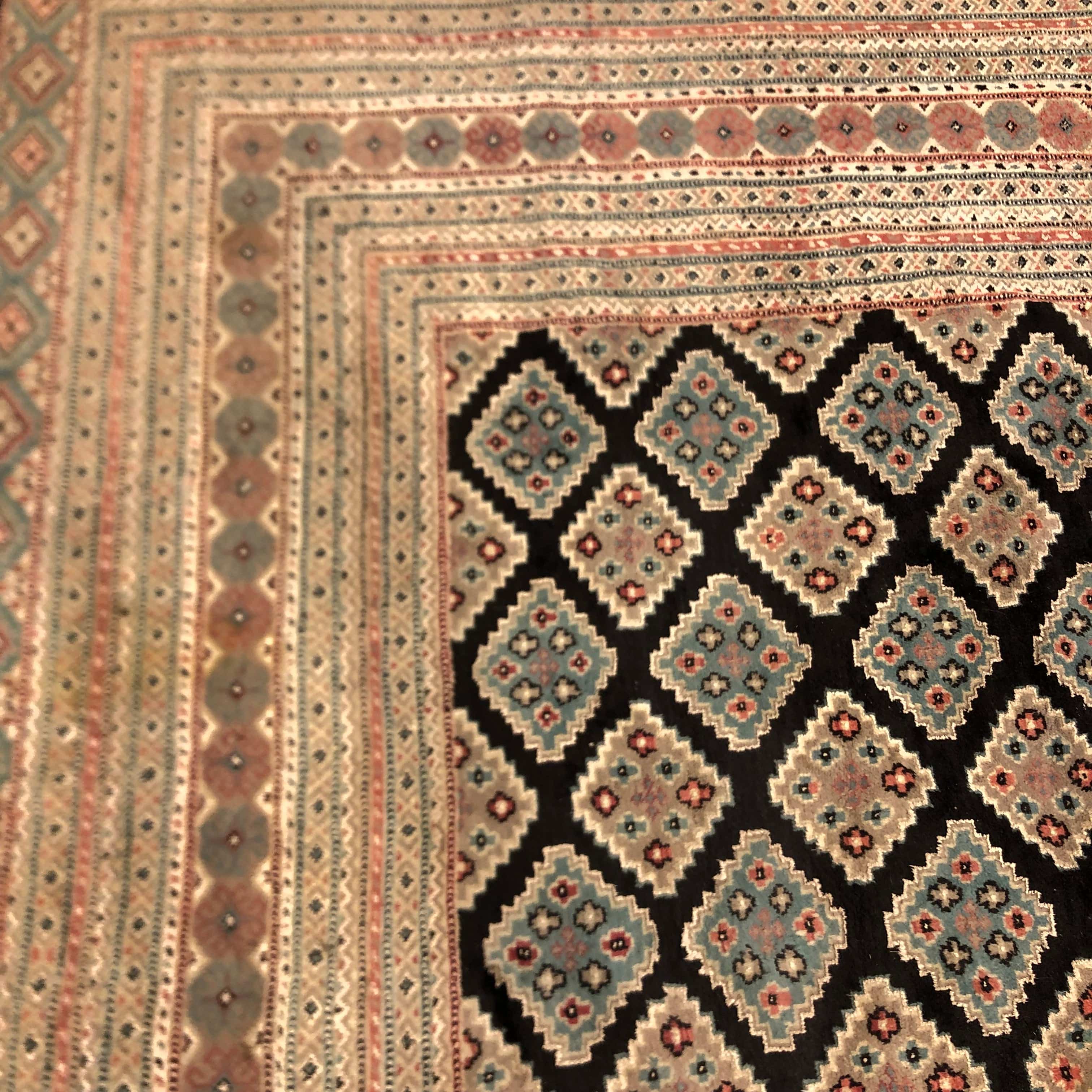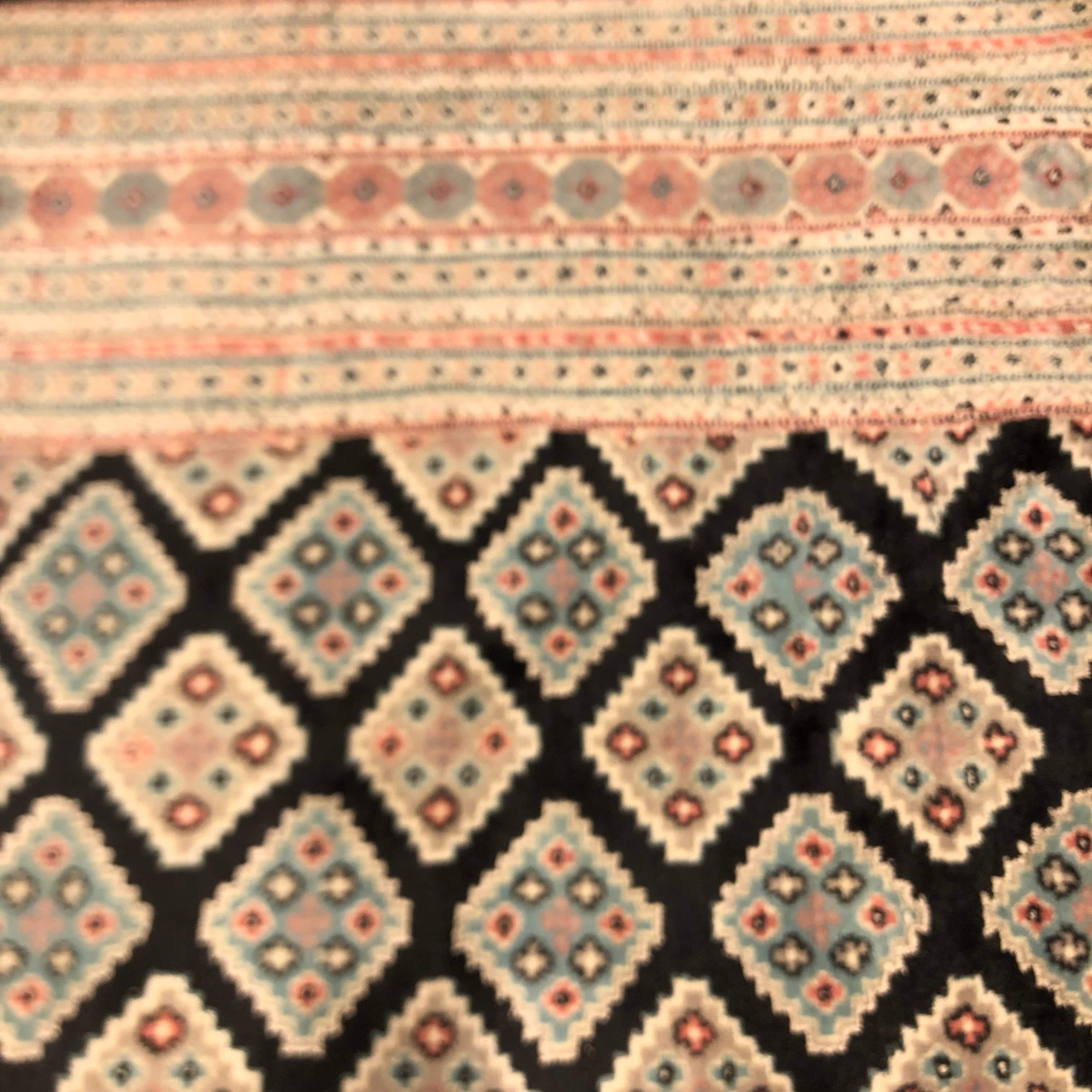 Exquisita alfombra del territorio de Turkistán, una región histórica situada en la emblemática Ruta de la Seda. Esta pieza única destaca por su diseño geométrico de gran carácter, con una vibrante combinación de colores en tonos rosa, azul y celeste, elegantemente distribuidos sobre un fondo amarillo crema.
