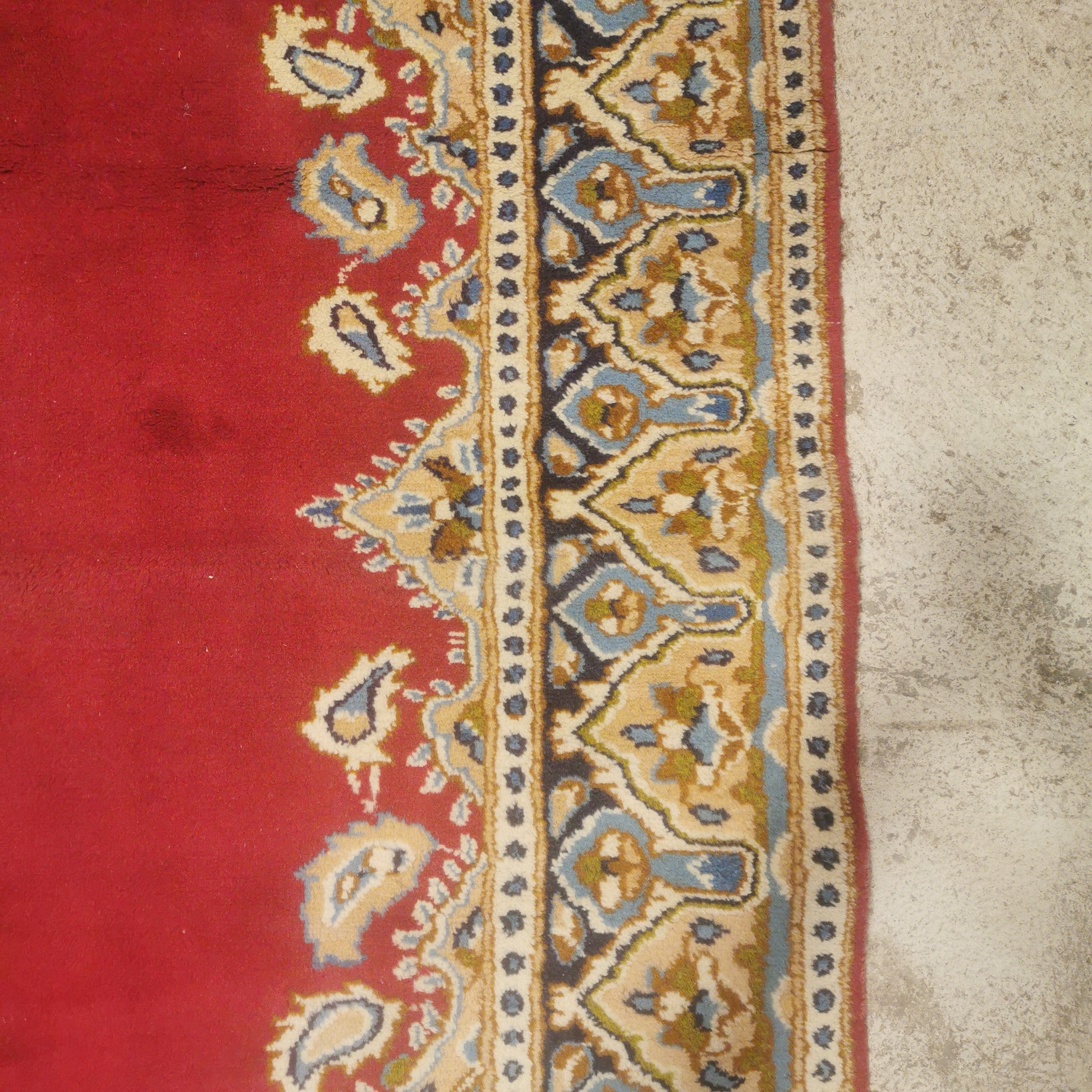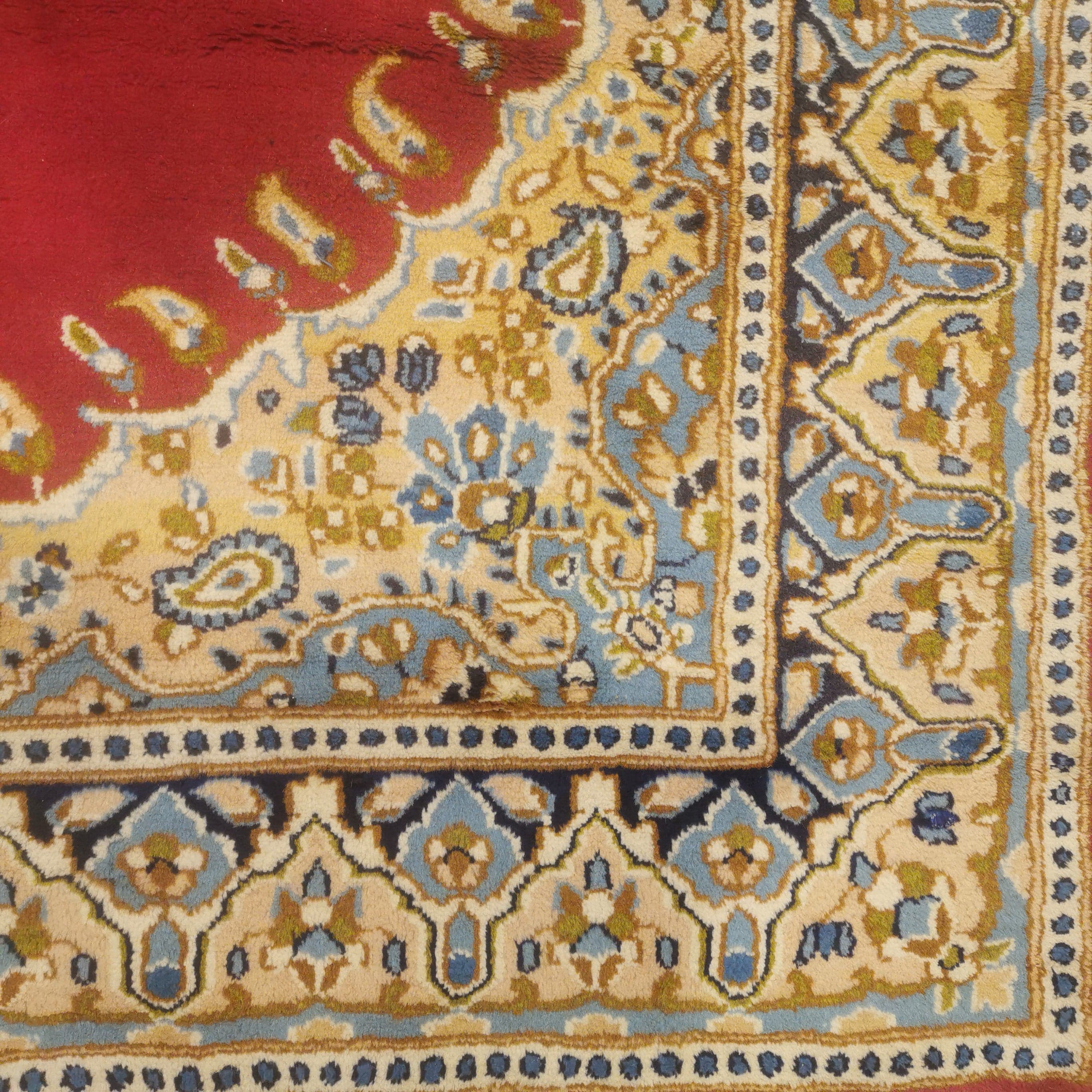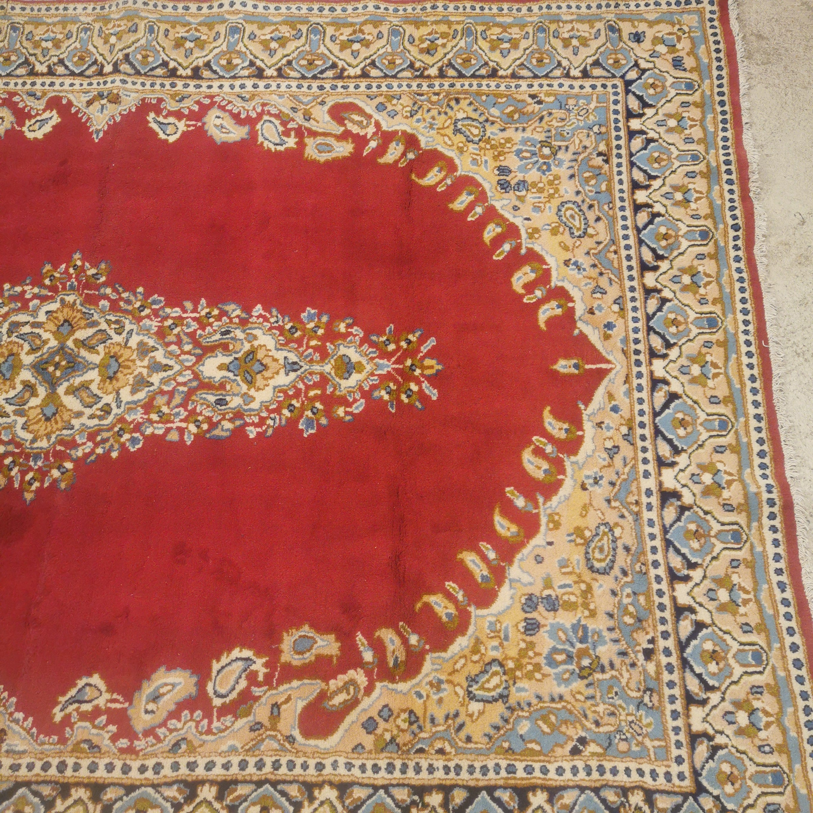 Elegante alfombra persa Kirman de lana de mediados del siglo XX. Conocidas por sus detalles florales y patrones geométricos en los bellos tonos rojizo, azul turquesa y azul marino.
