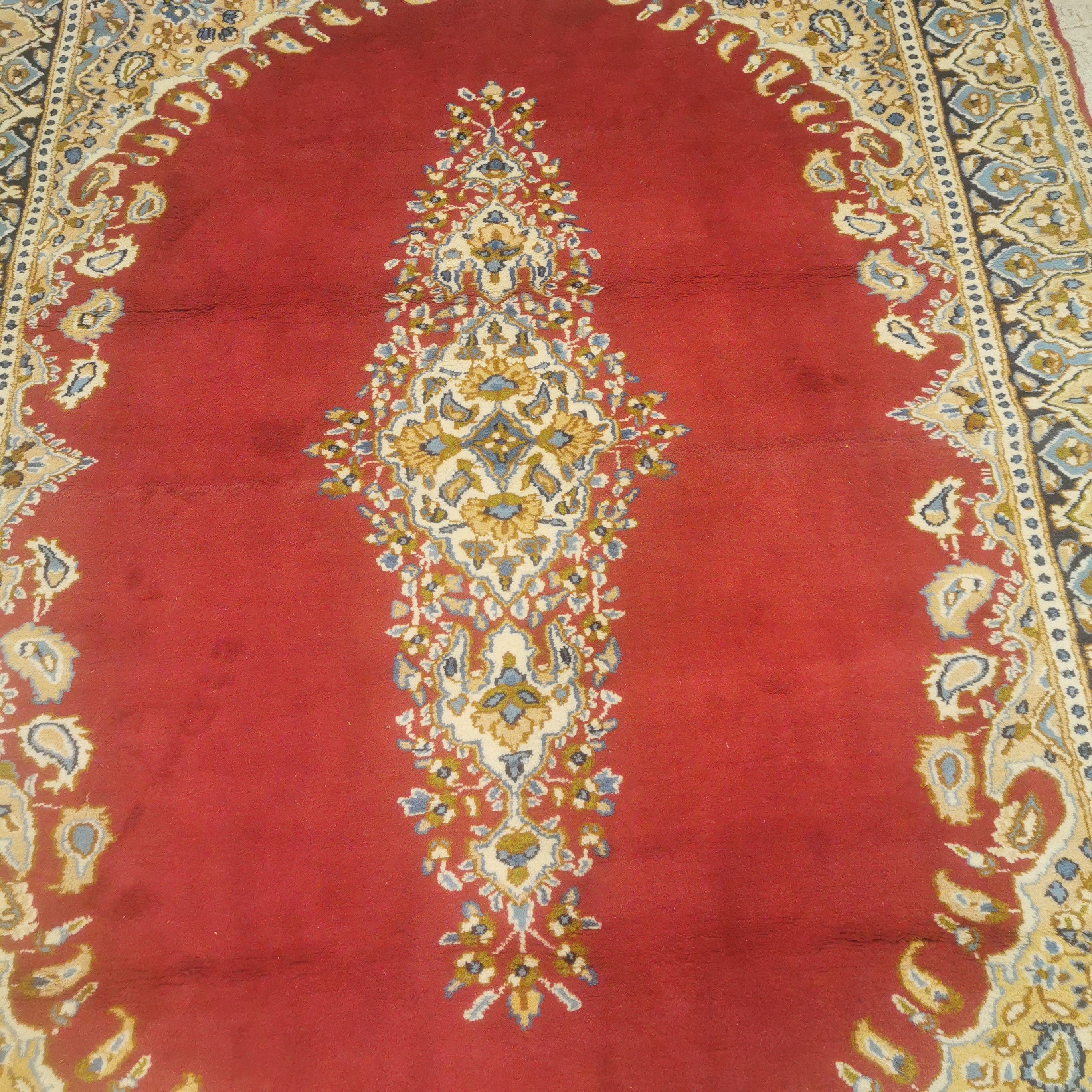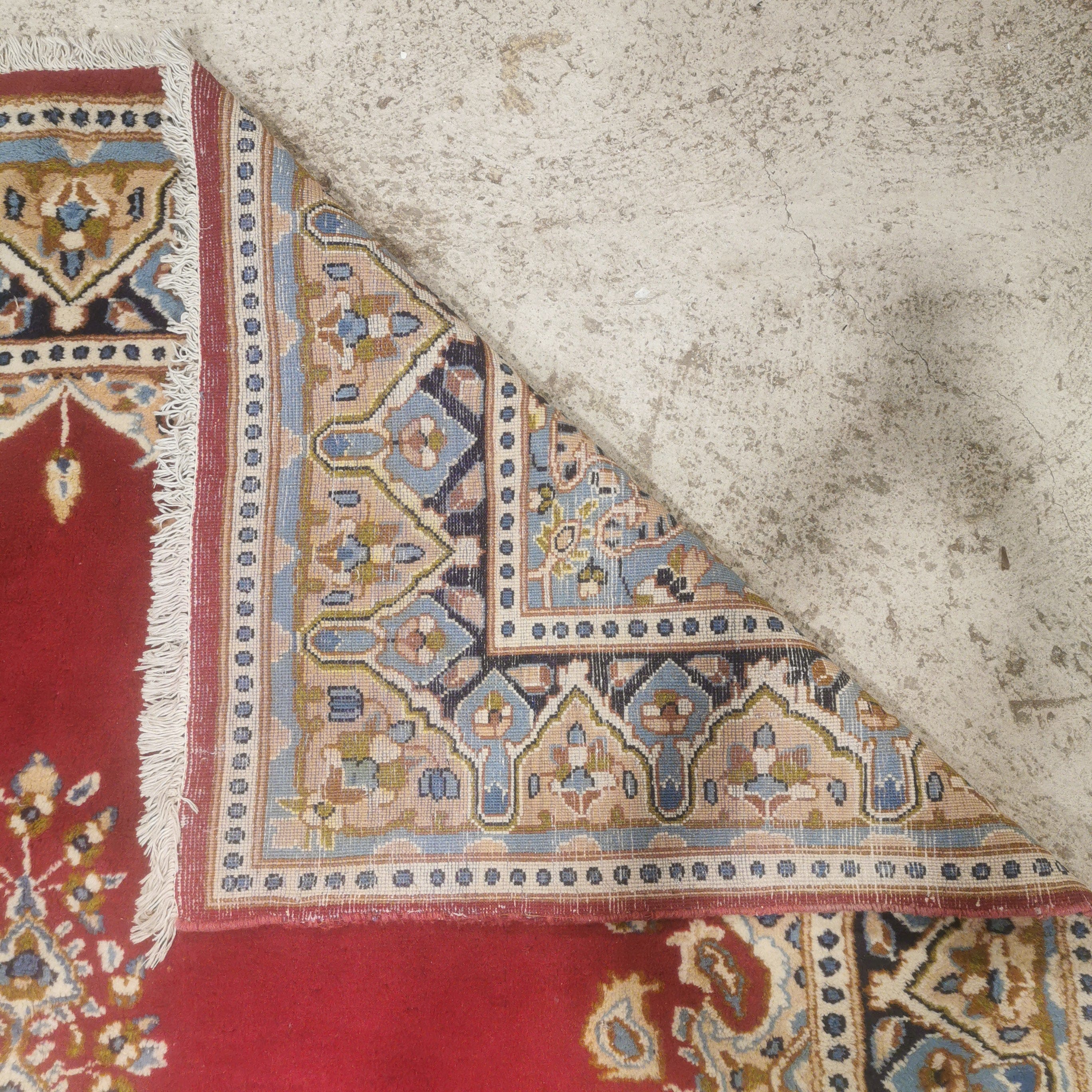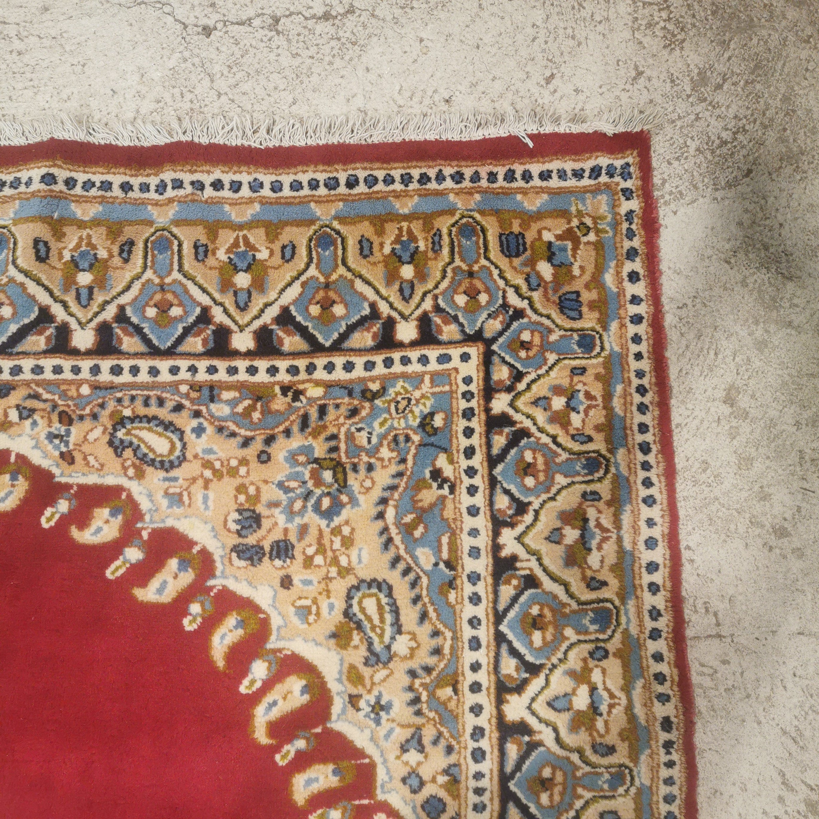 Elegante alfombra persa Kirman de lana de mediados del siglo XX. Conocidas por sus detalles florales y patrones geométricos en los bellos tonos rojizo, azul turquesa y azul marino.