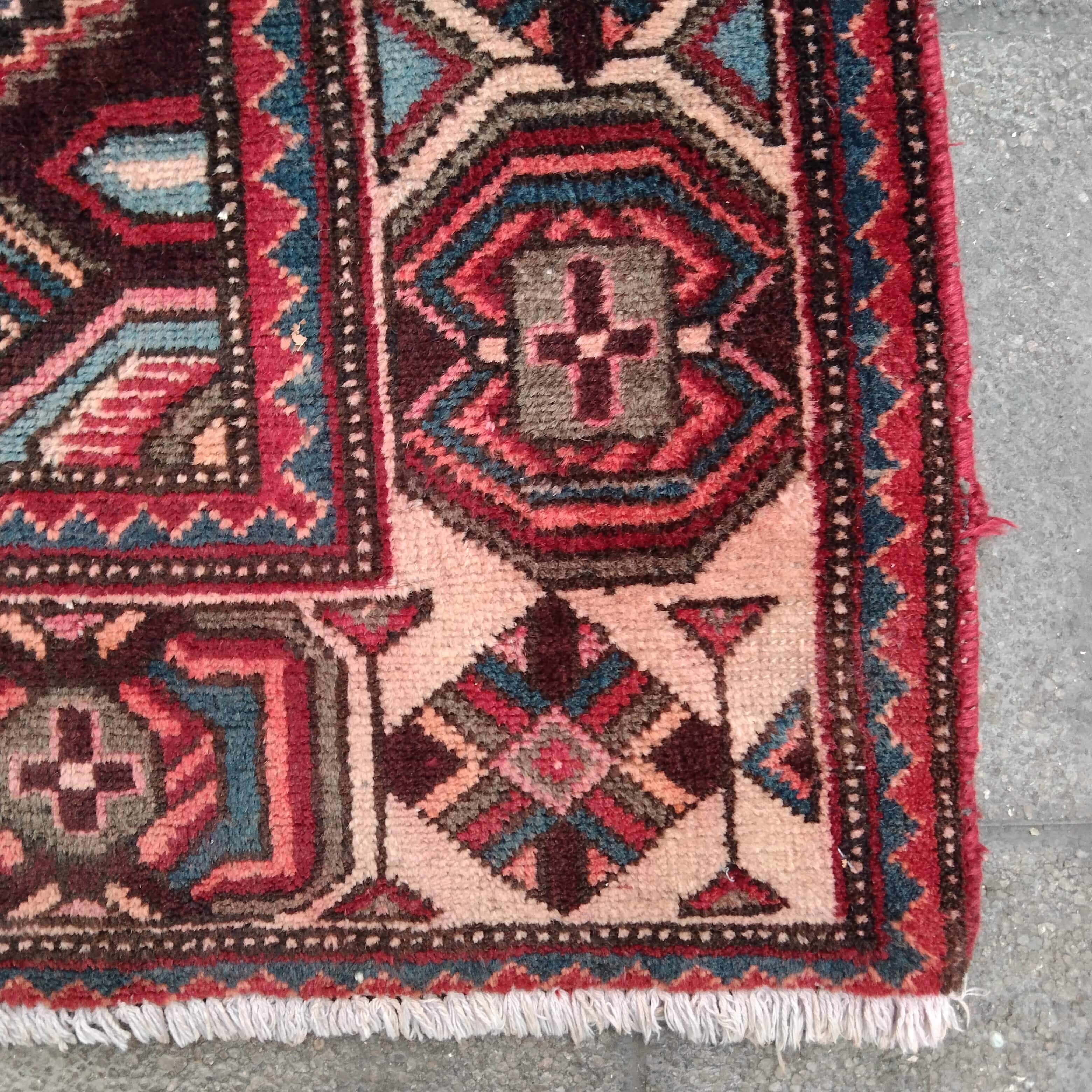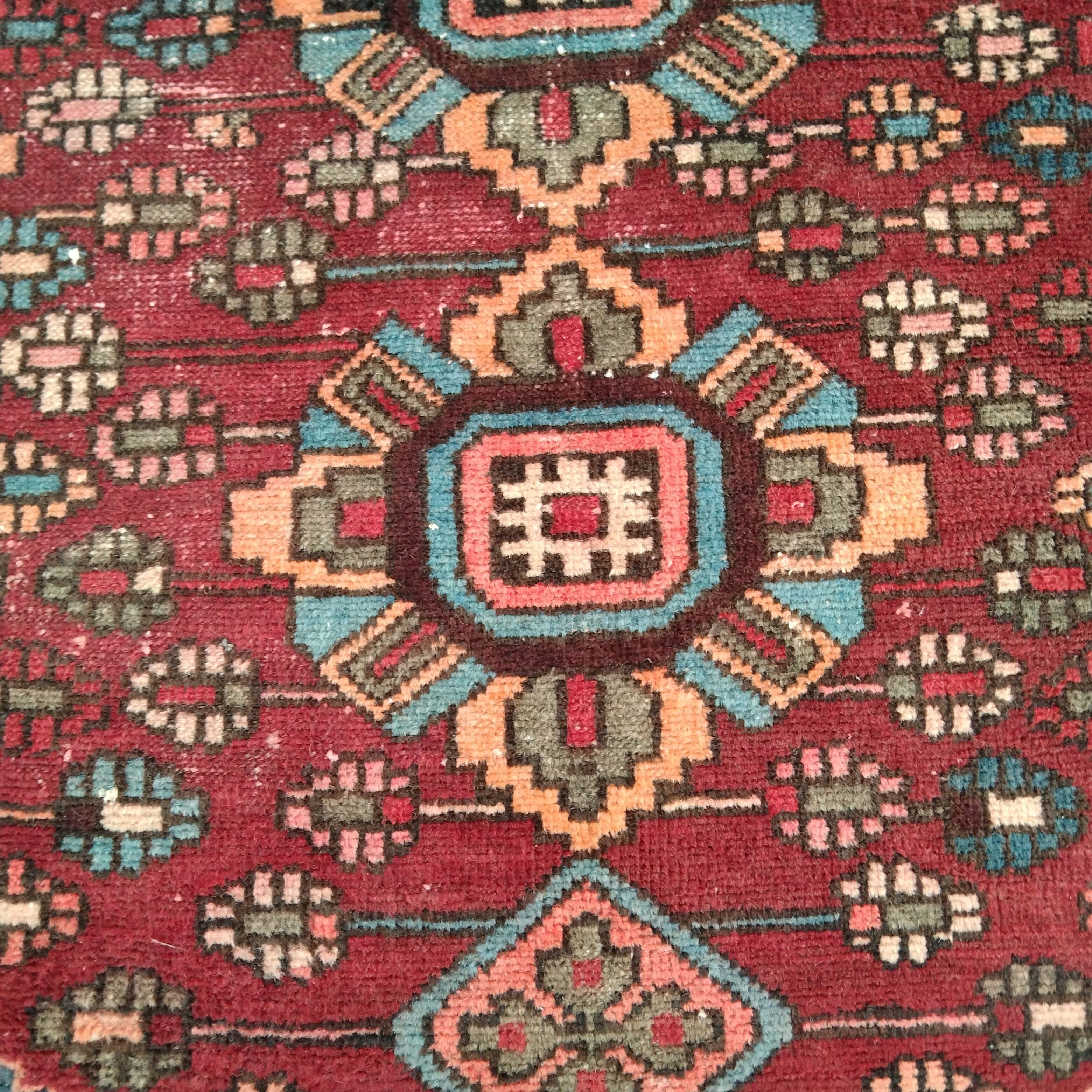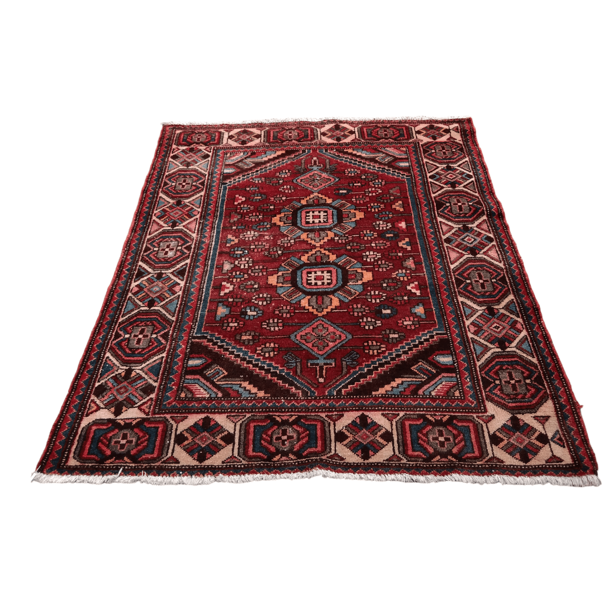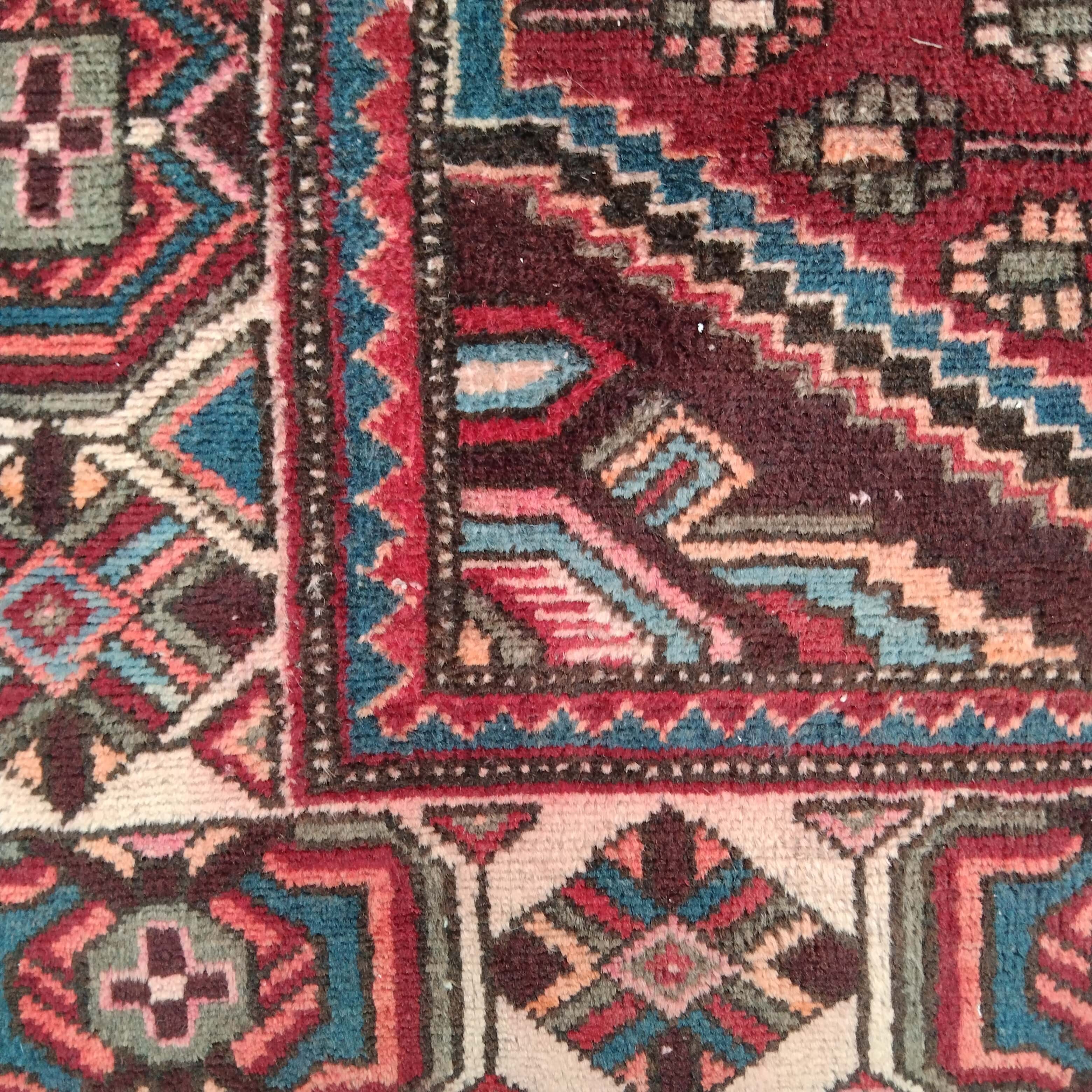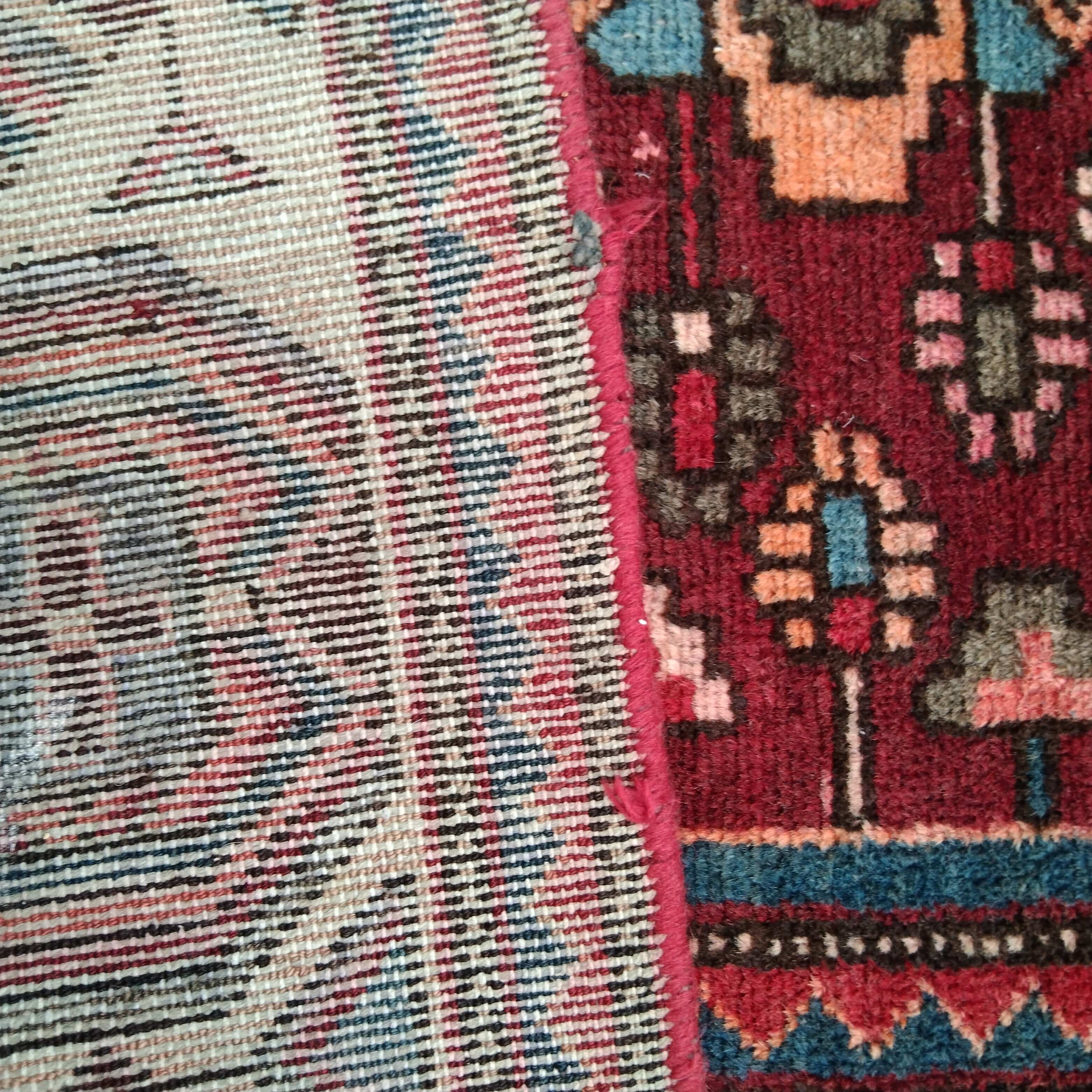 Bella alfombra de origen persa, anudada a mano, con bellos diseños geométricos en tonos azules, naranjas, rojos y amarillos. Su figura central representa unas flores que contienen todos los tonos de la alfombra.
