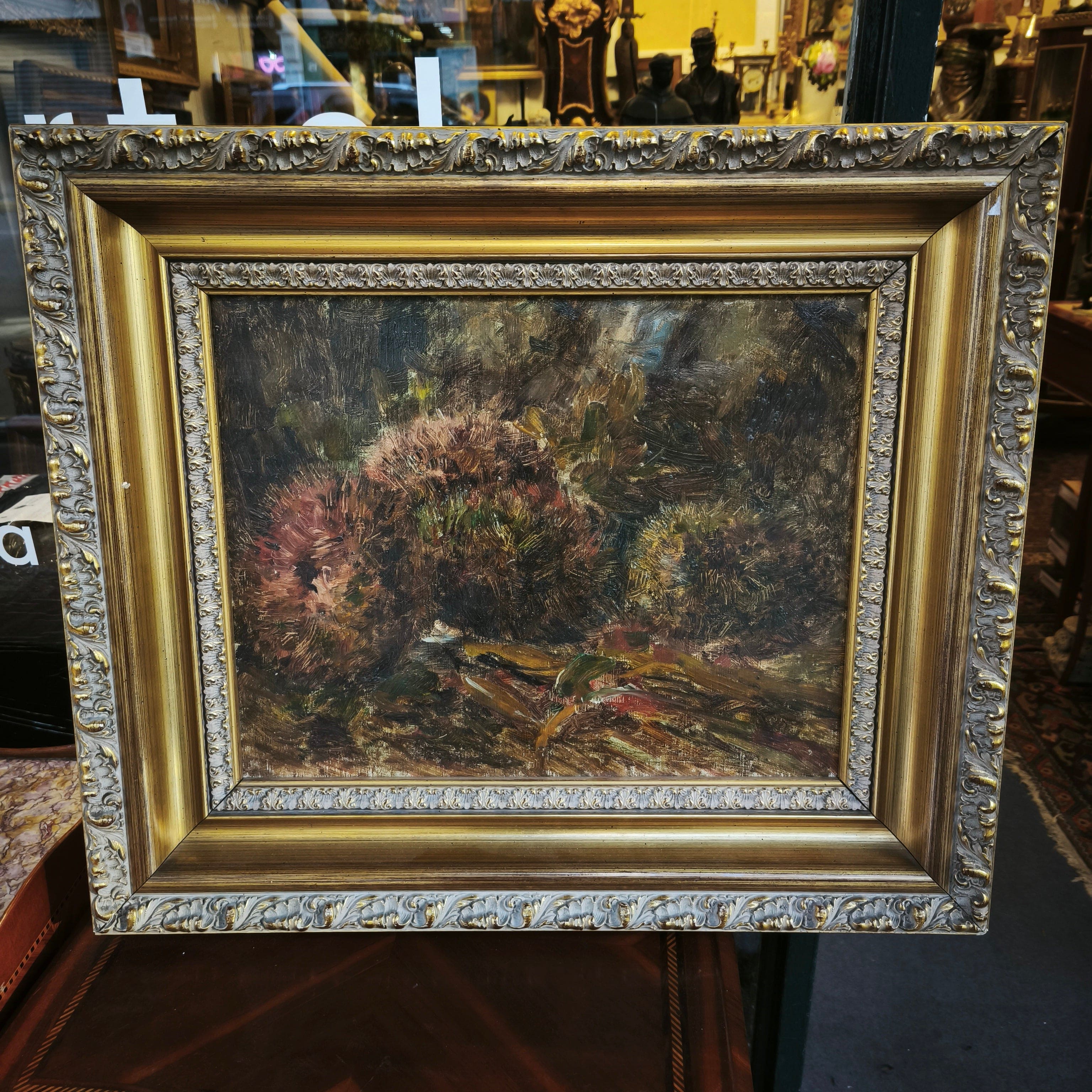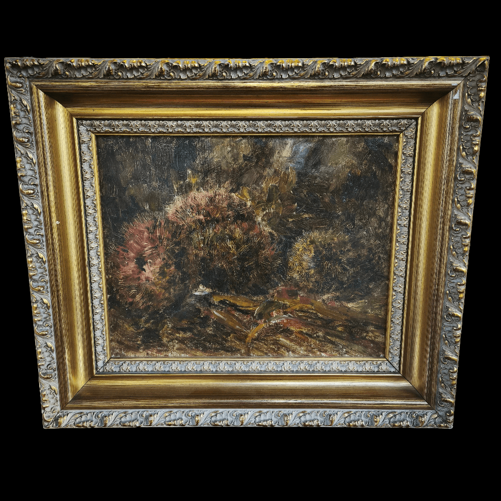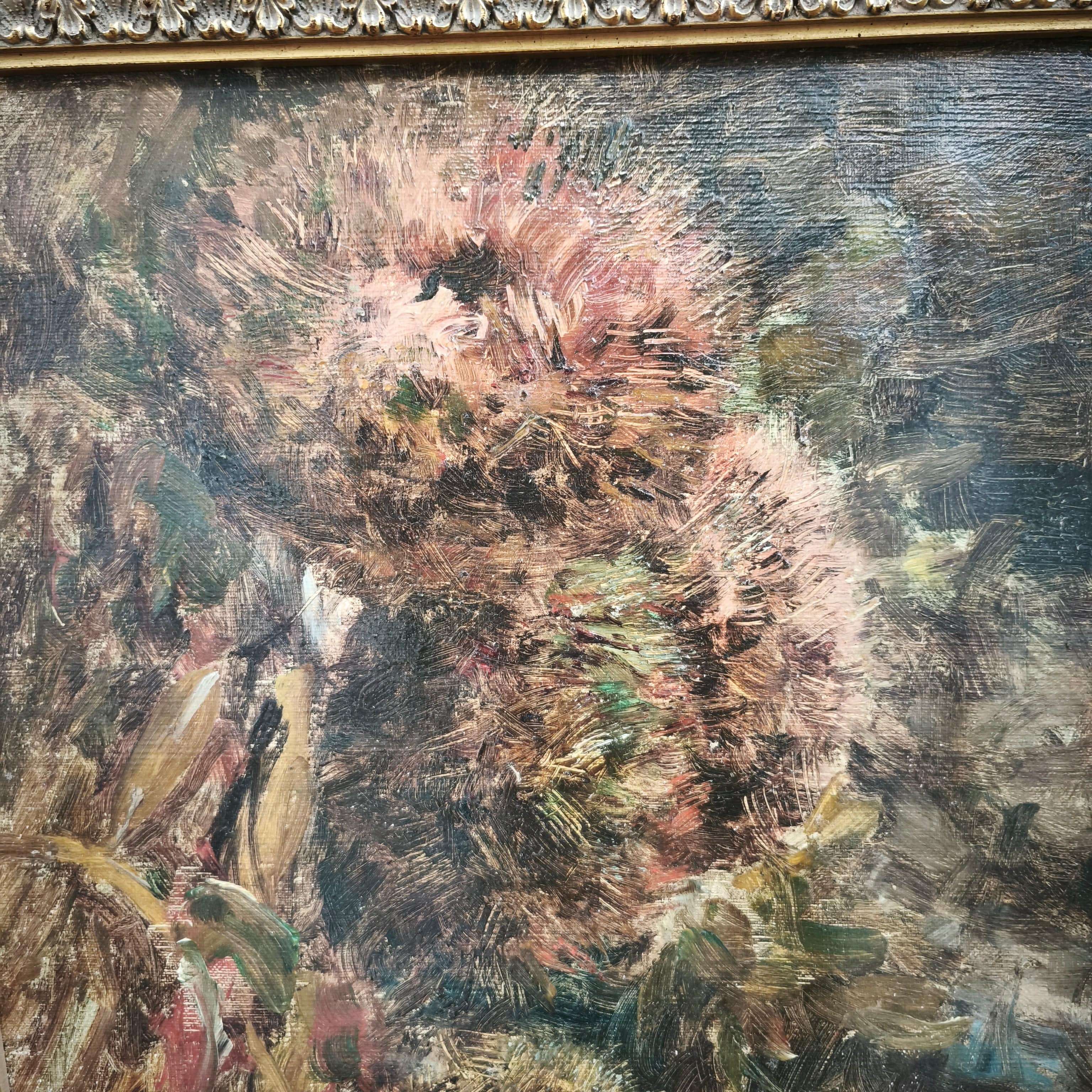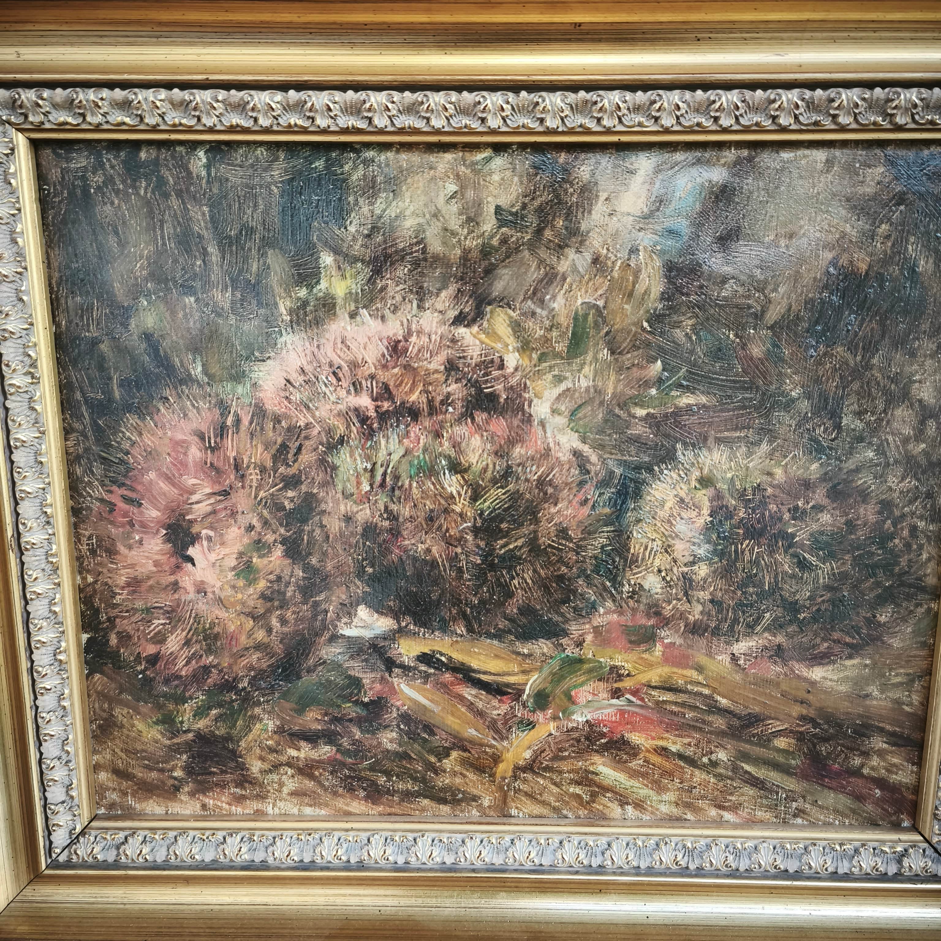 Particular bodegón atribuido al reconocido artista chileno Juan Francisco González, representando de manera expresiva unos cardos sobre una mesa. El trazo, lleno de carácter, desdibuja la representación, llevando la obra a un plano en el que resalta la textura, mediante el trazo y la cantidad de materia utilizada por el artista.