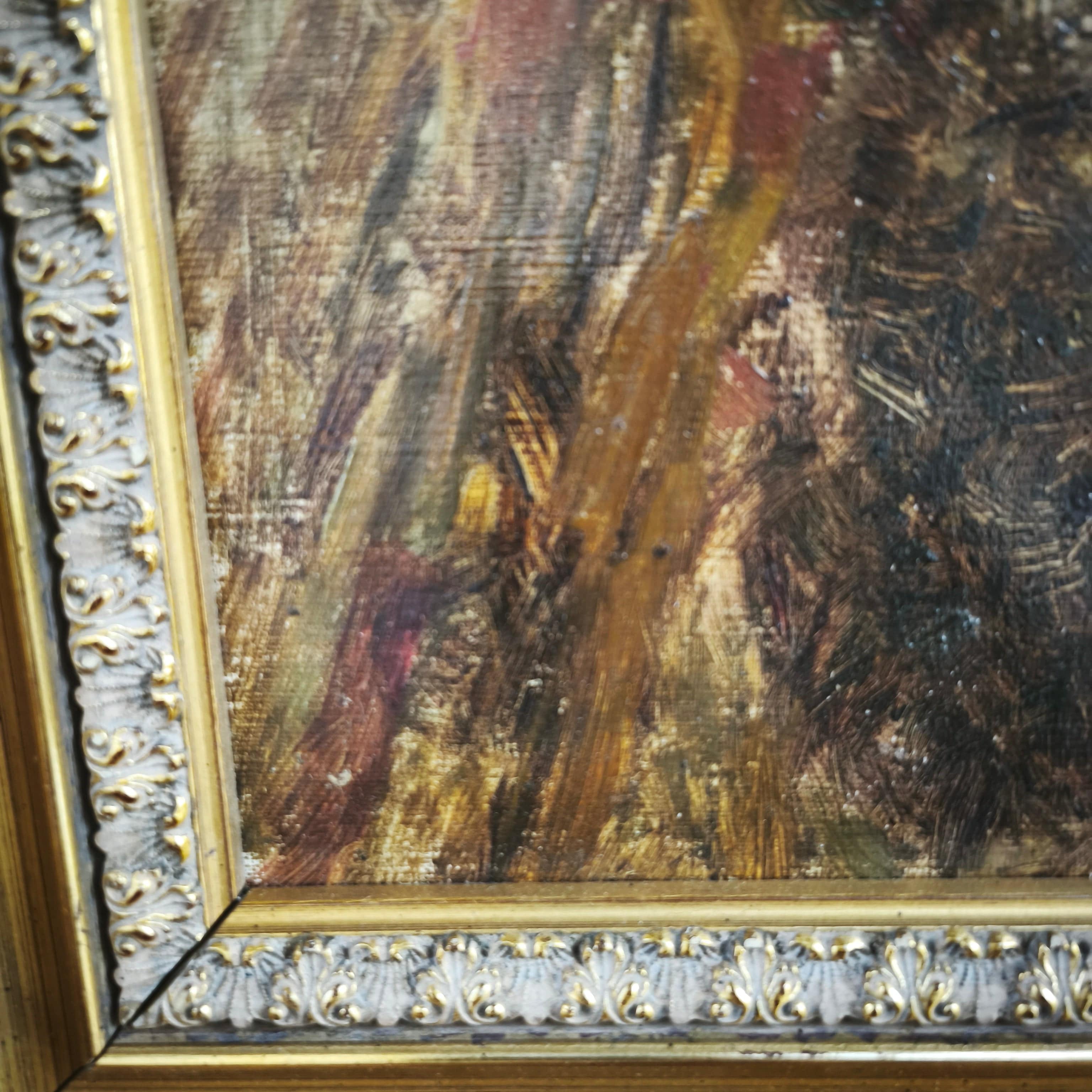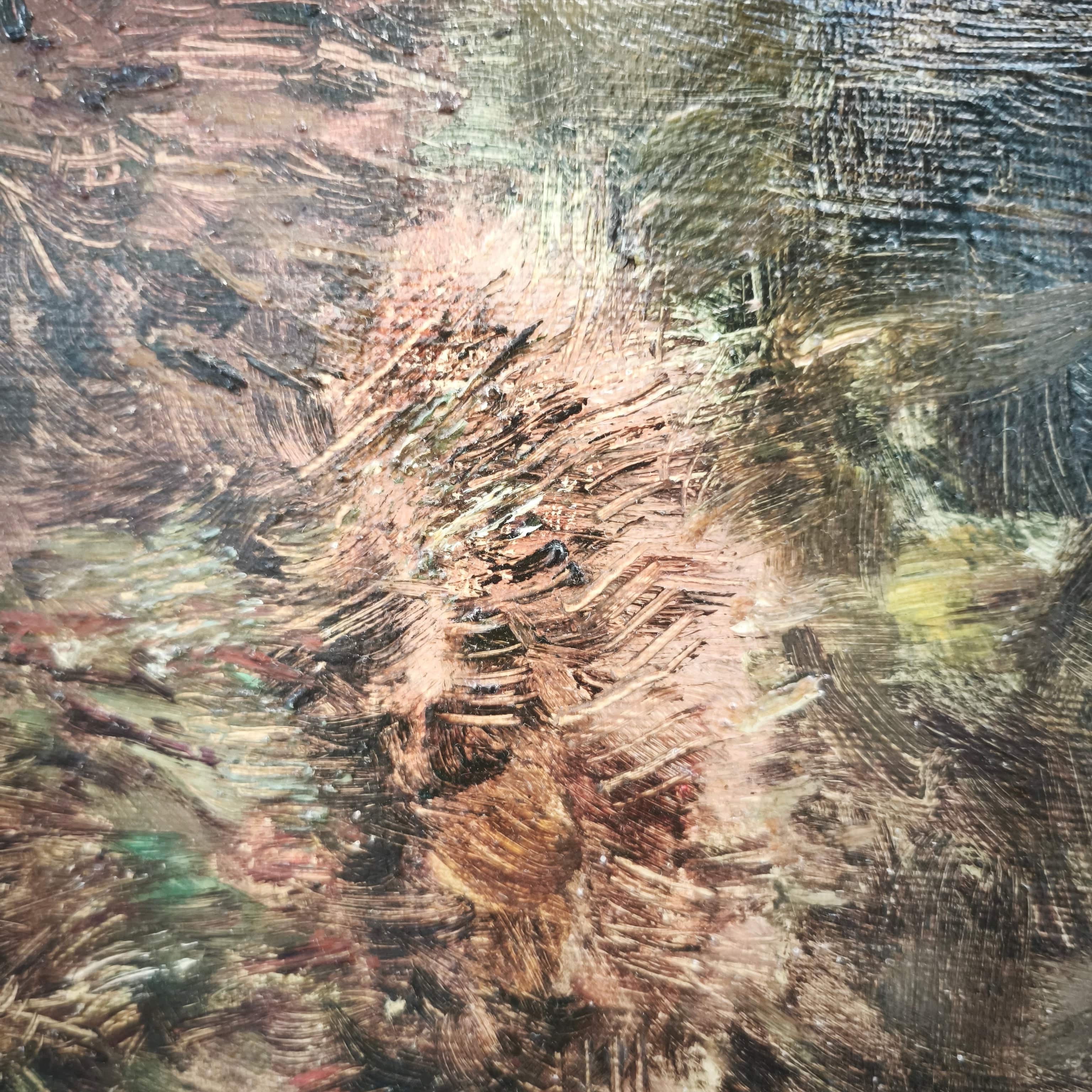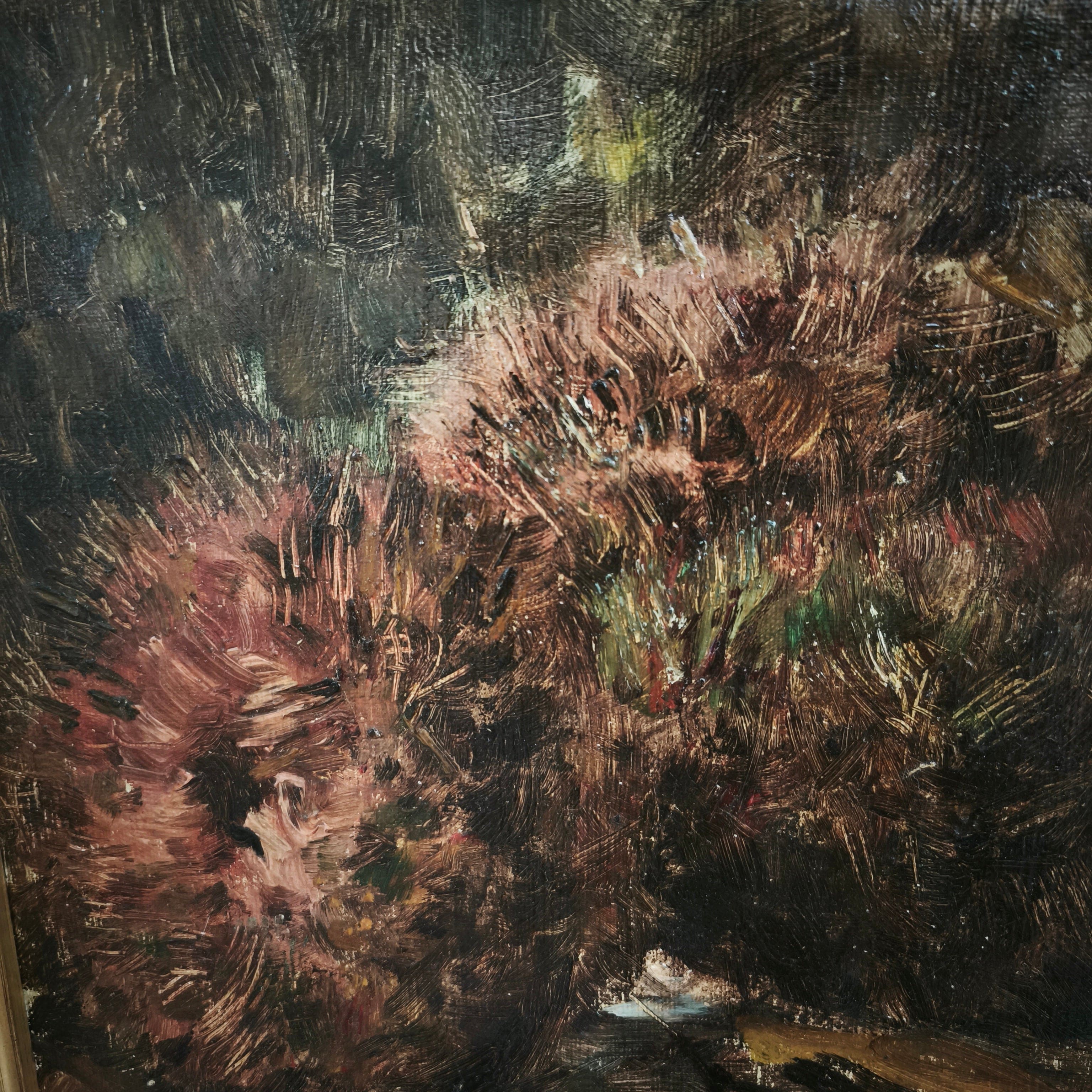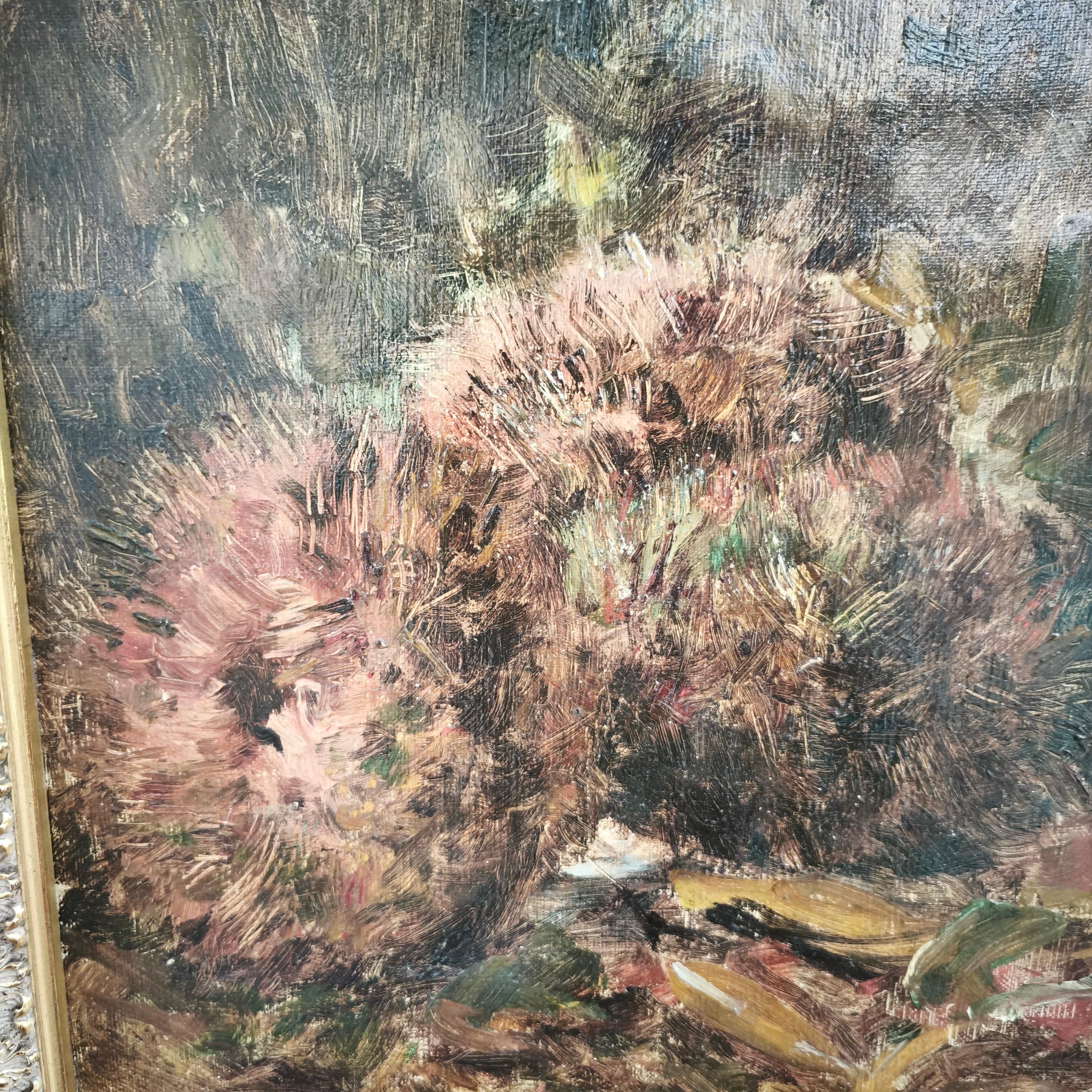 Particular bodegón atribuido al reconocido artista chileno Juan Francisco González, representando de manera expresiva unos cardos sobre una mesa. El trazo, lleno de carácter, desdibuja la representación, llevando la obra a un plano en el que resalta la textura, mediante el trazo y la cantidad de materia utilizada por el artista.