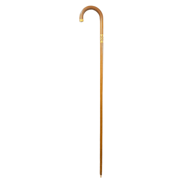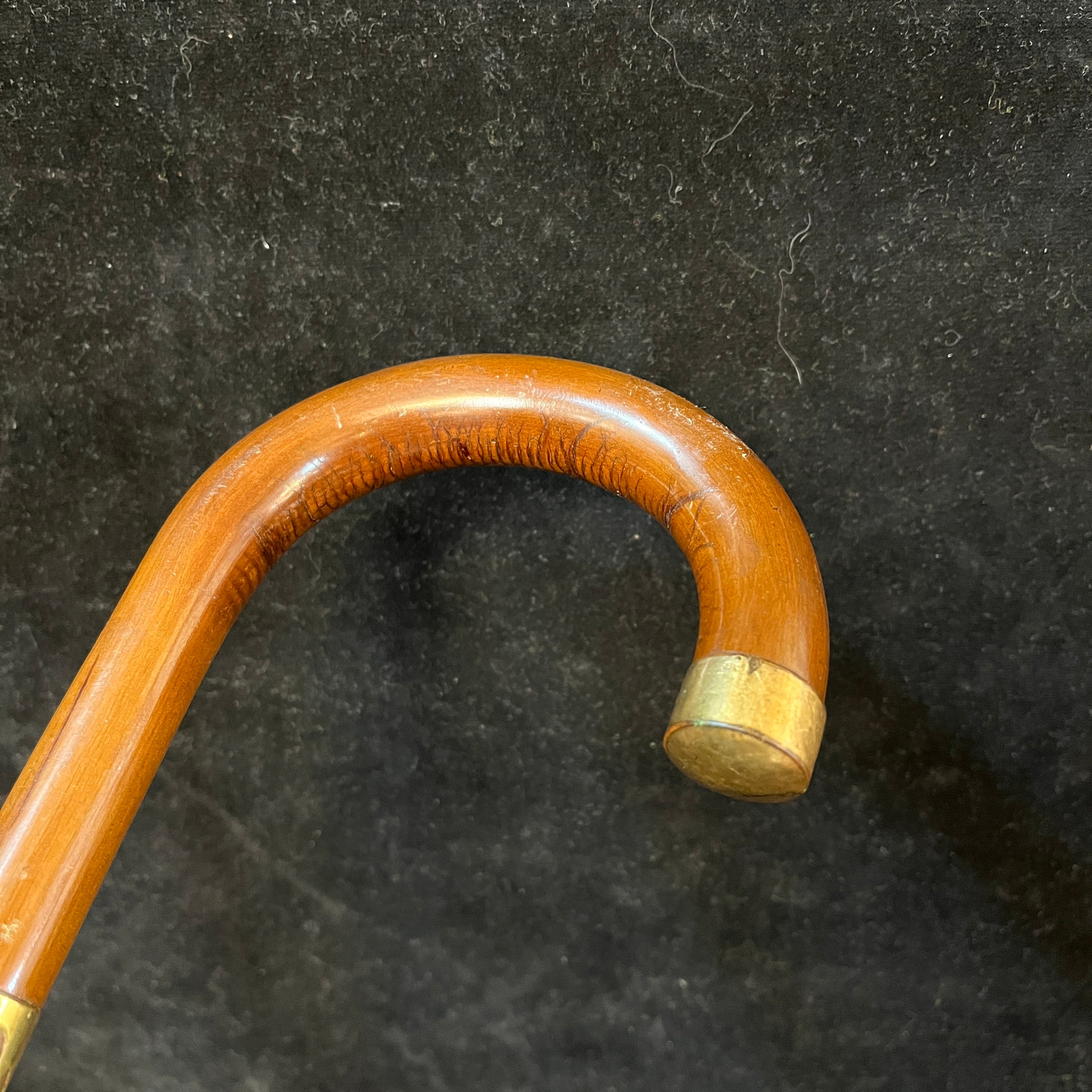 Elegante bastón de madera de caoba con aplicaciones en bronce en su punta, decorado en patrón y mango curvo.