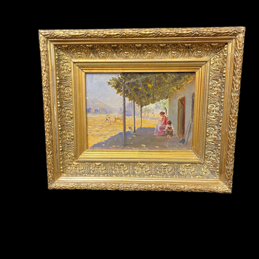Hermosa pintura del artista chileno Benito Rebolledo que con absoluta destreza captura una escena familiar en un paisaje rural. Una mujer sentada bordando, a sus pies un pequeño niño descalzo leyendo y a la distancia a quien podemos imaginar como un padre labrando la tierra. Ambos madre e hijo bajo la sombra verde de una enredadera. La pintura transmite esa complicidad silenciosa de la vida familiar donde cada integrante coexiste a partir del otro.