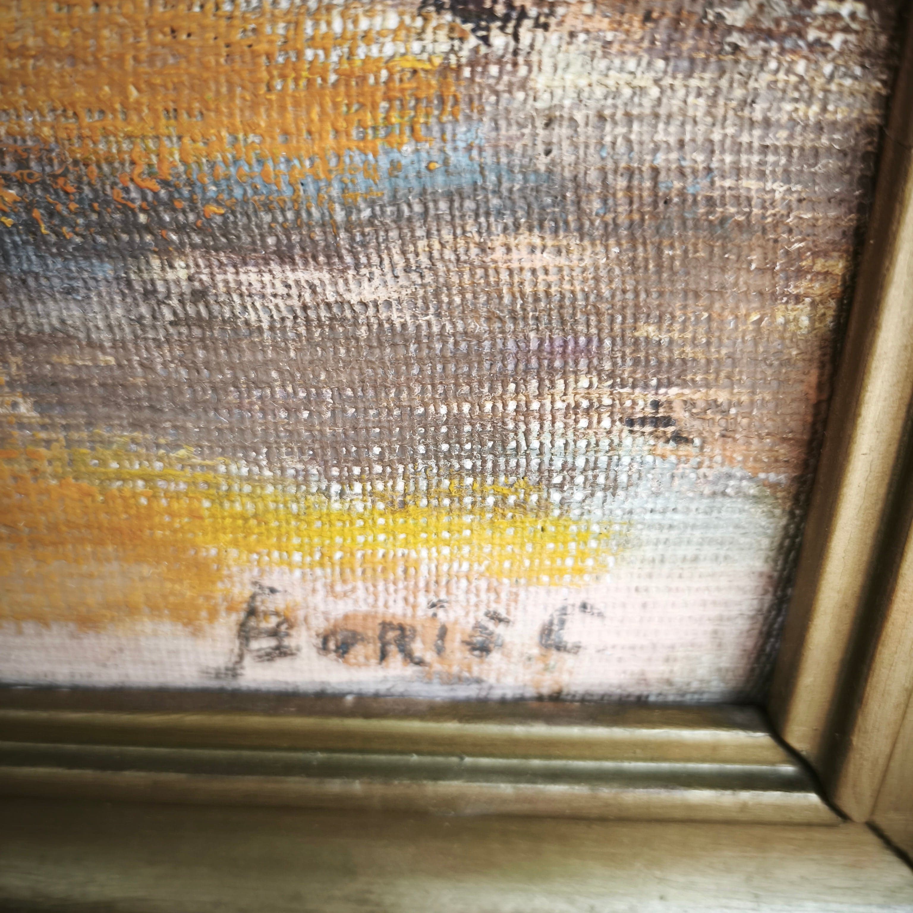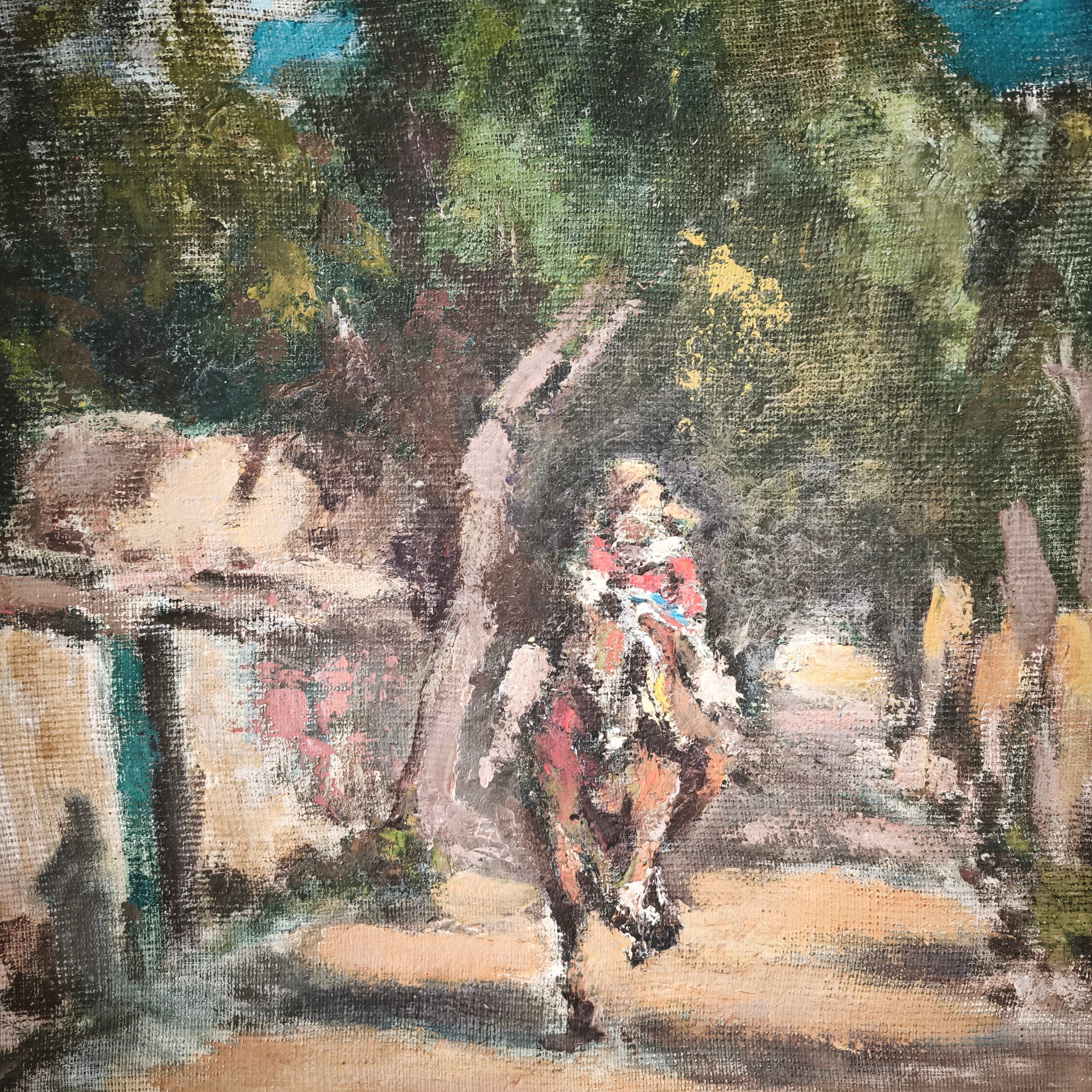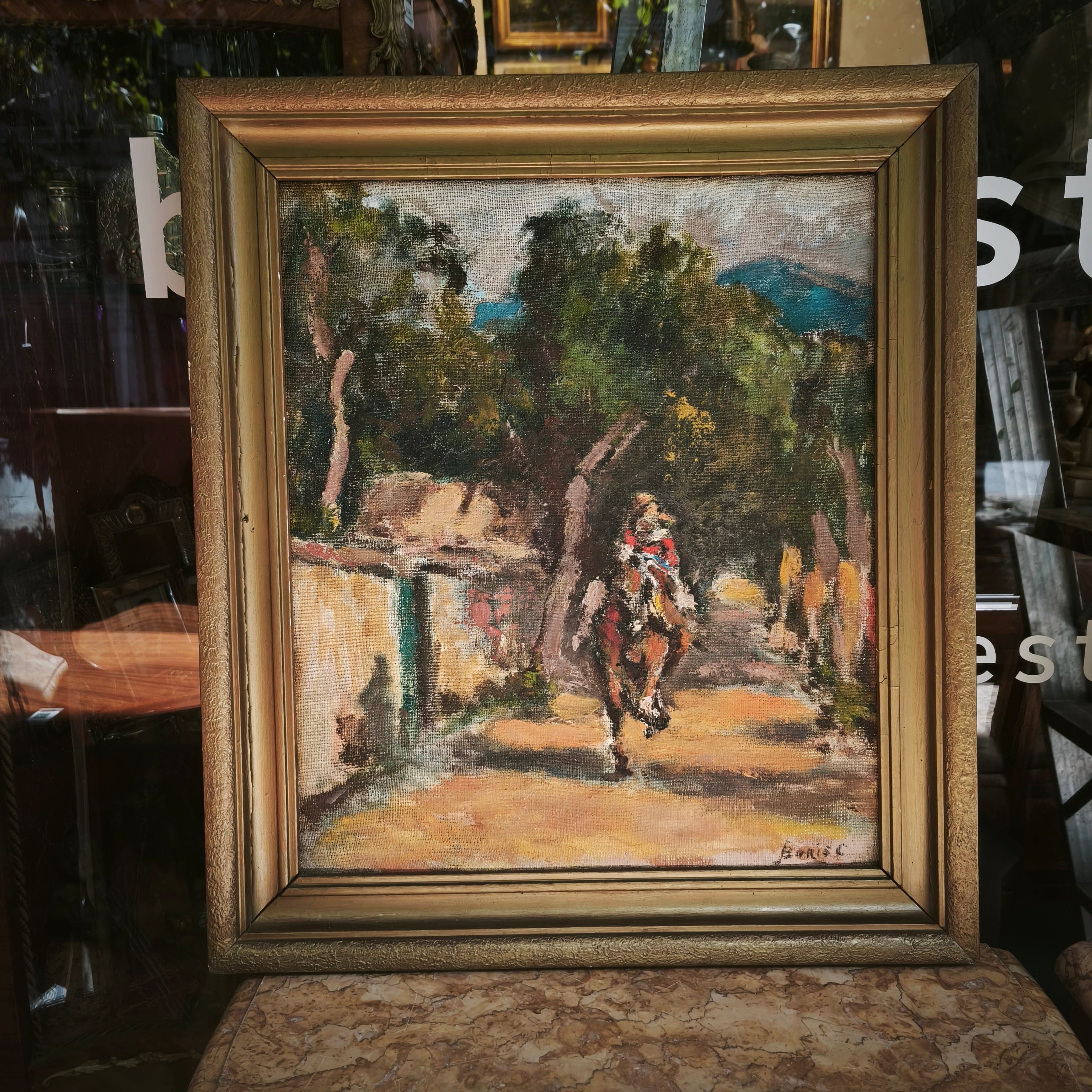 Oleo sobre tela firmado por el artista de origen catalán, Boris Casanova (1897-1989), español de cuna pero maulino de corazón. En la obra vemos una pequeña avenida rural por donde va pasando un jinete y su caballo. Colores vibrantes de estilo impresionista.