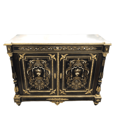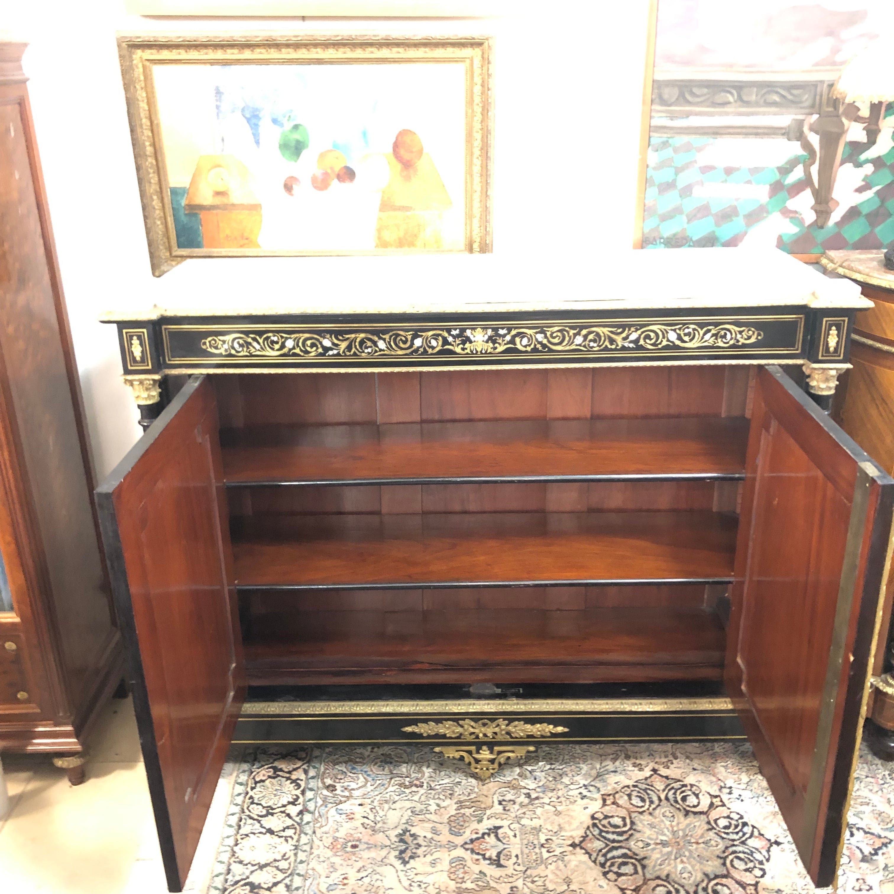 Bello Boulle francés de dos puertas, estilo Imperio, con maderas de caoba ebanizadas y cubierta de mármol. Cuenta con finos detalles en bronce ormolú, marquetería de bronce, nácar y dos repisas en su interior.