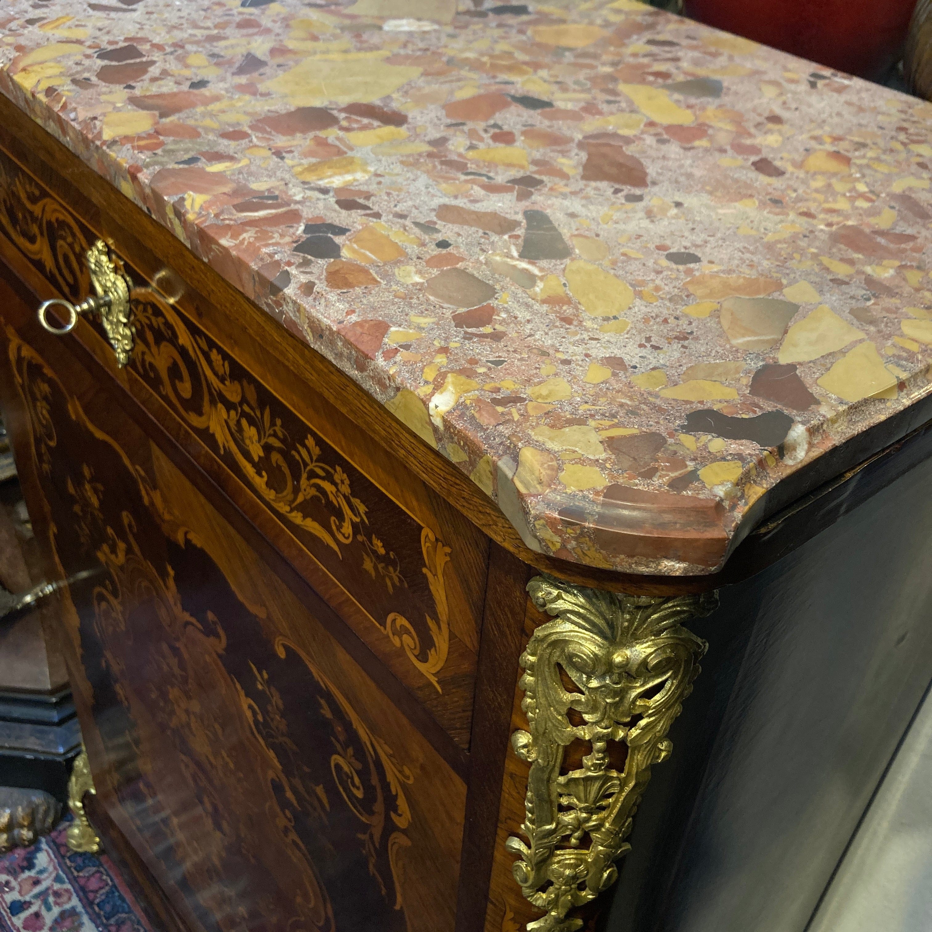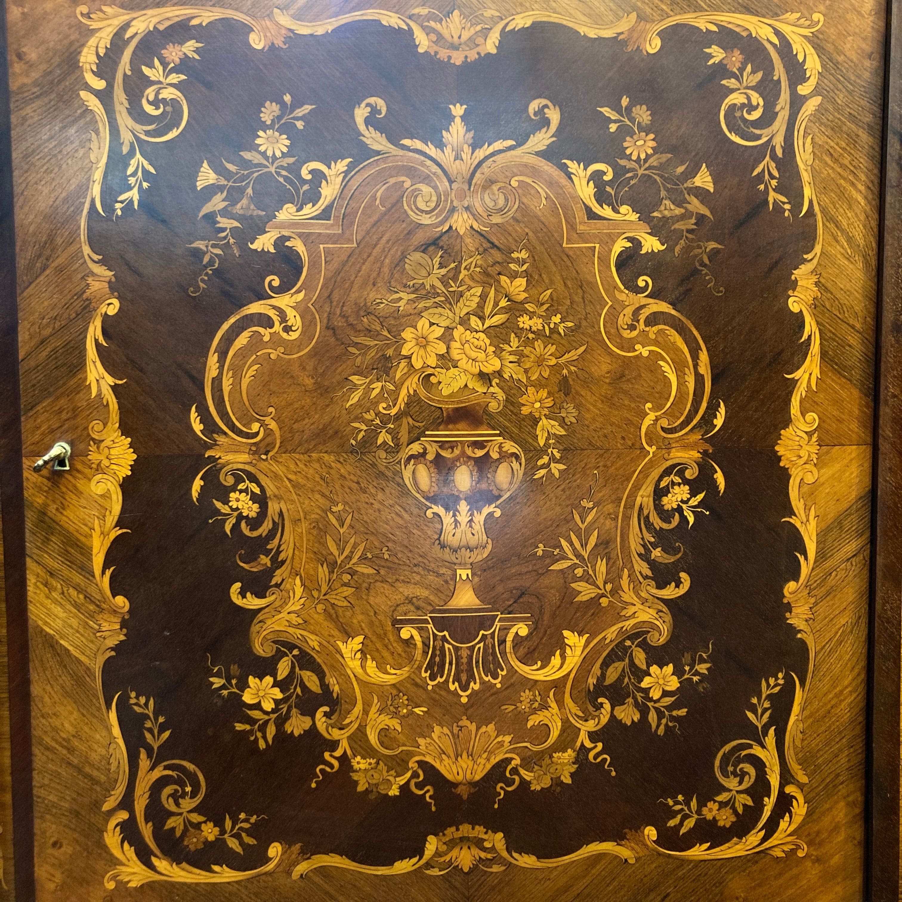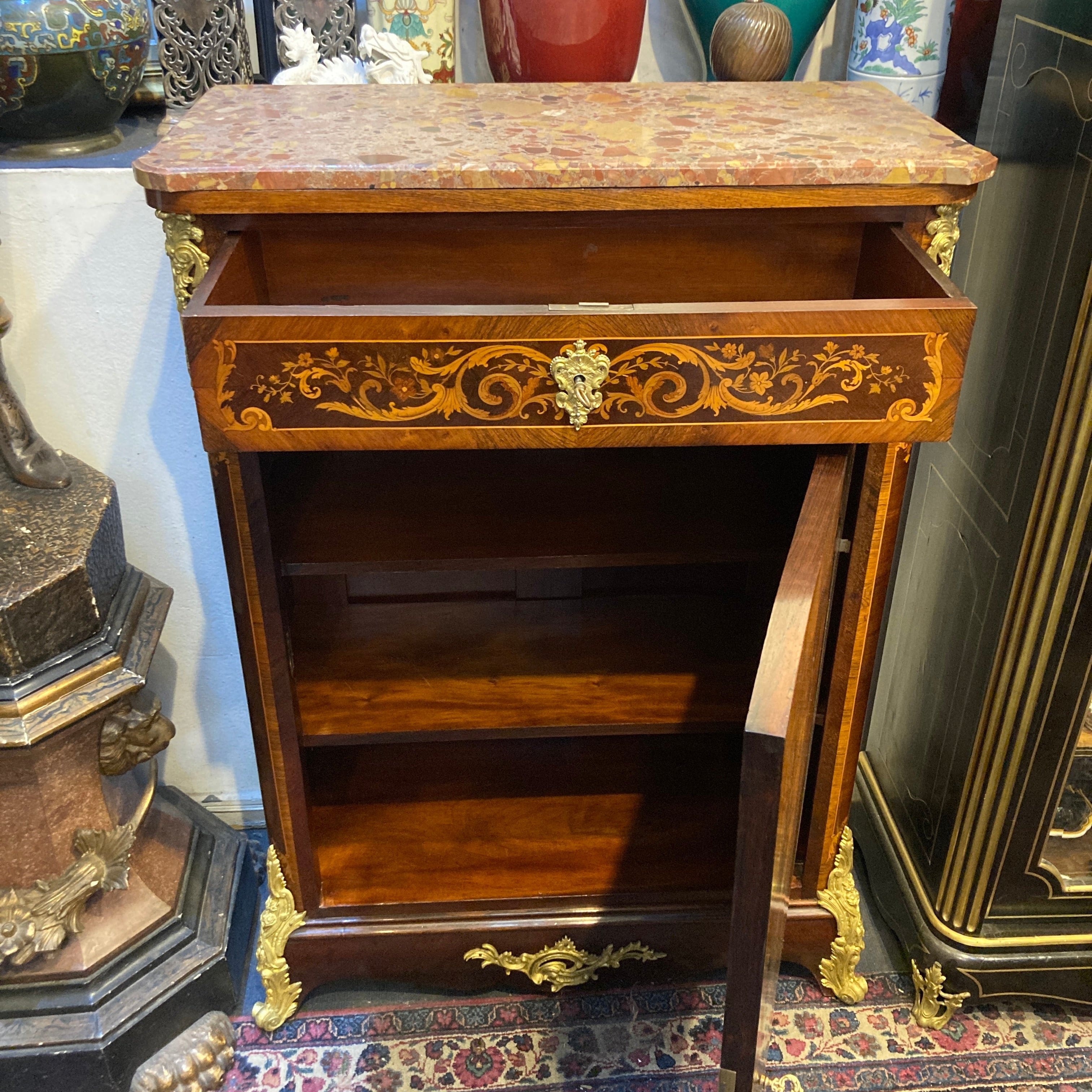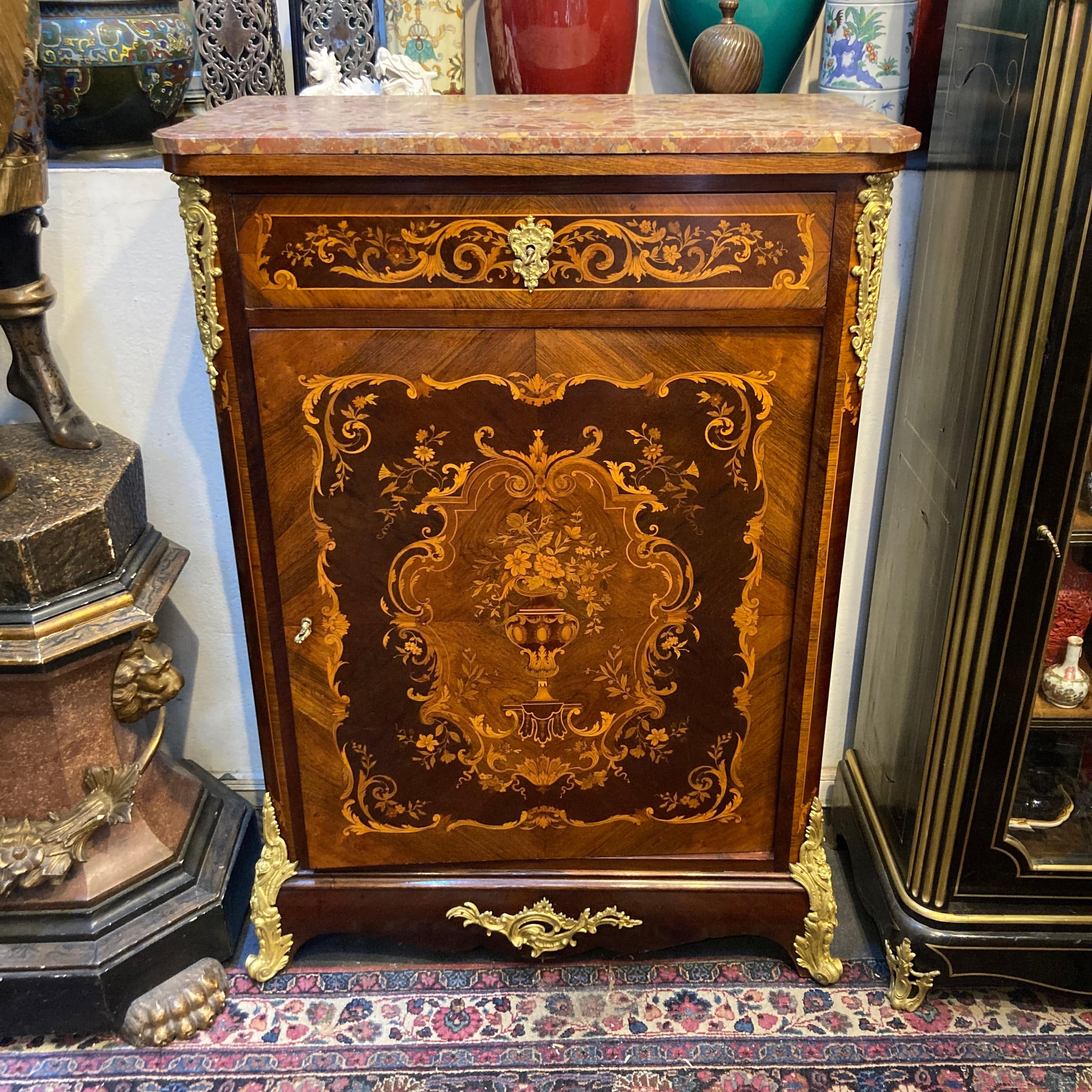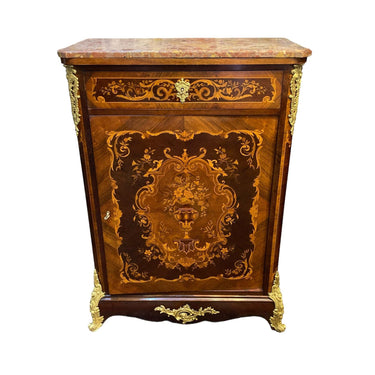 Bello boulle francés de una puerta, estilo Imperio Napoléon III. Cuenta con finas aplicaciones en bronce, bello diseño de marquetería y cubierta de mármol. Su interior contempla dos repisas, y un cajón superior.