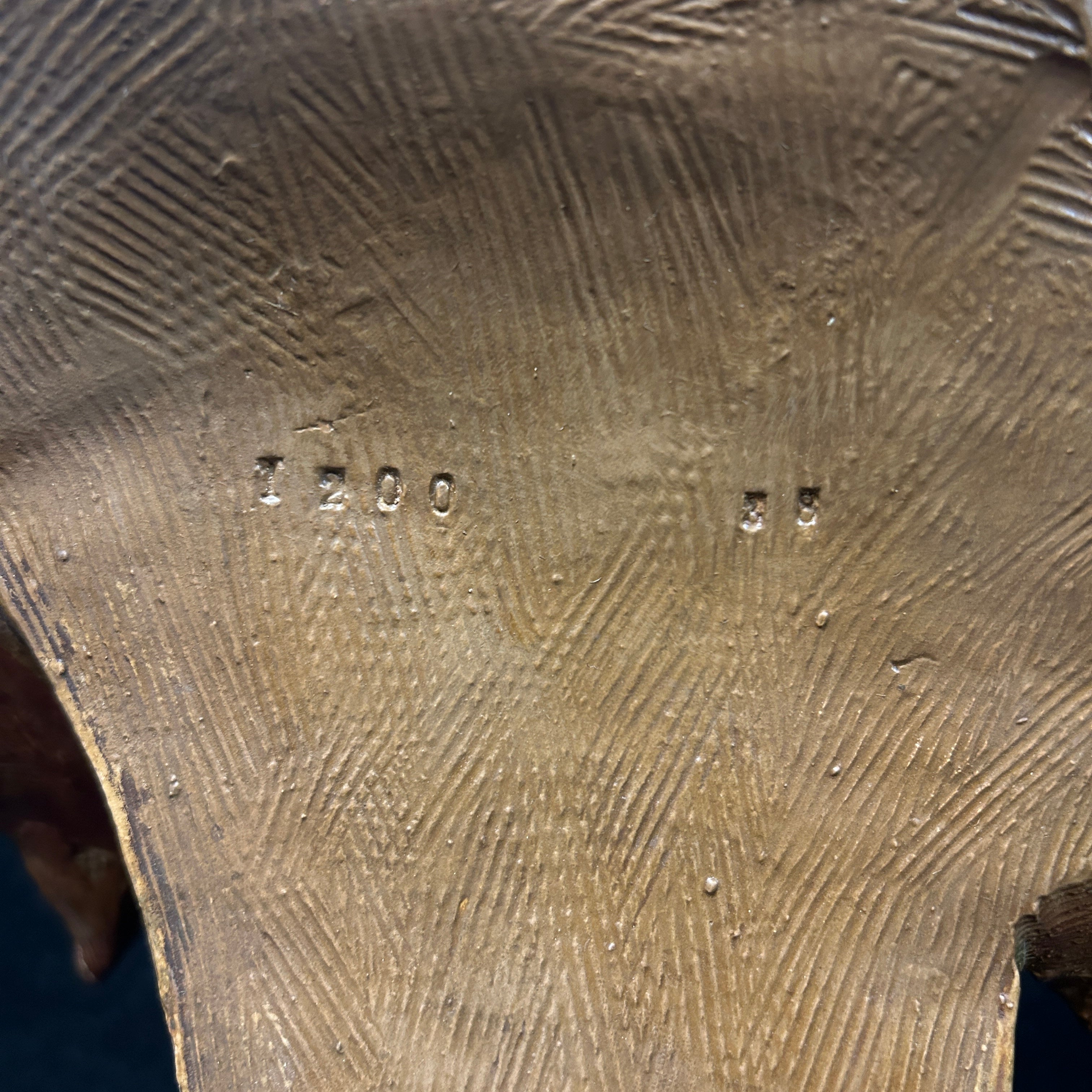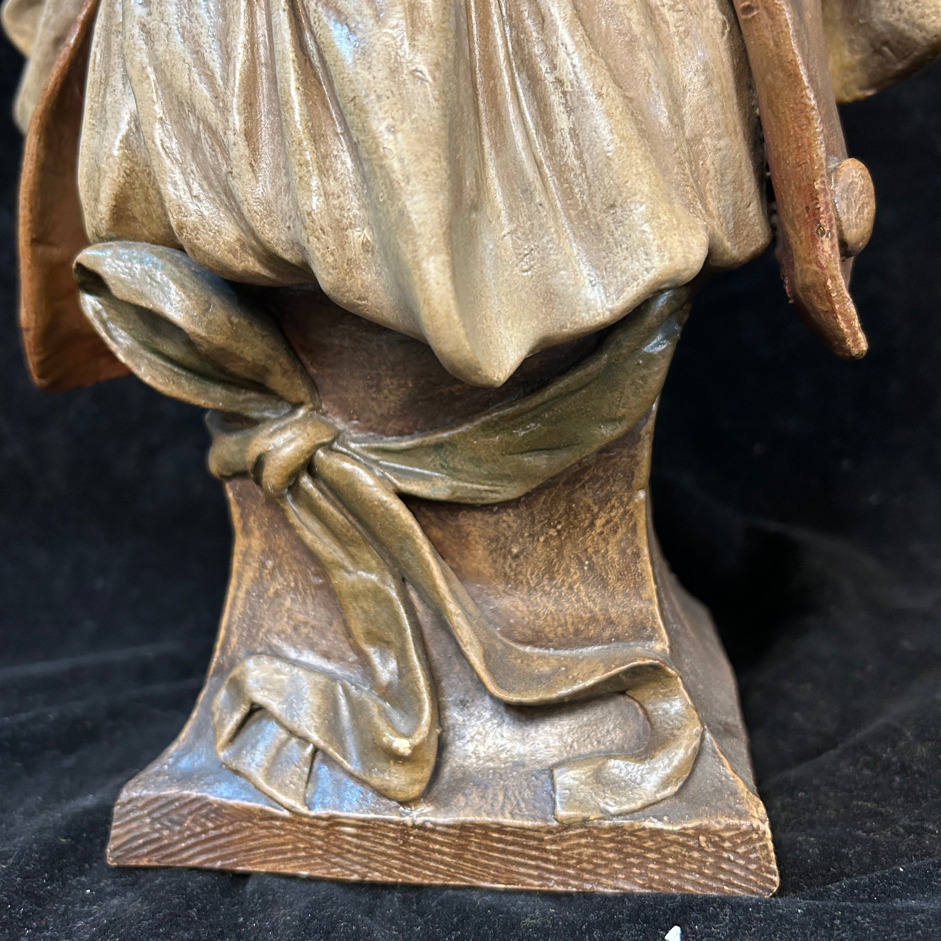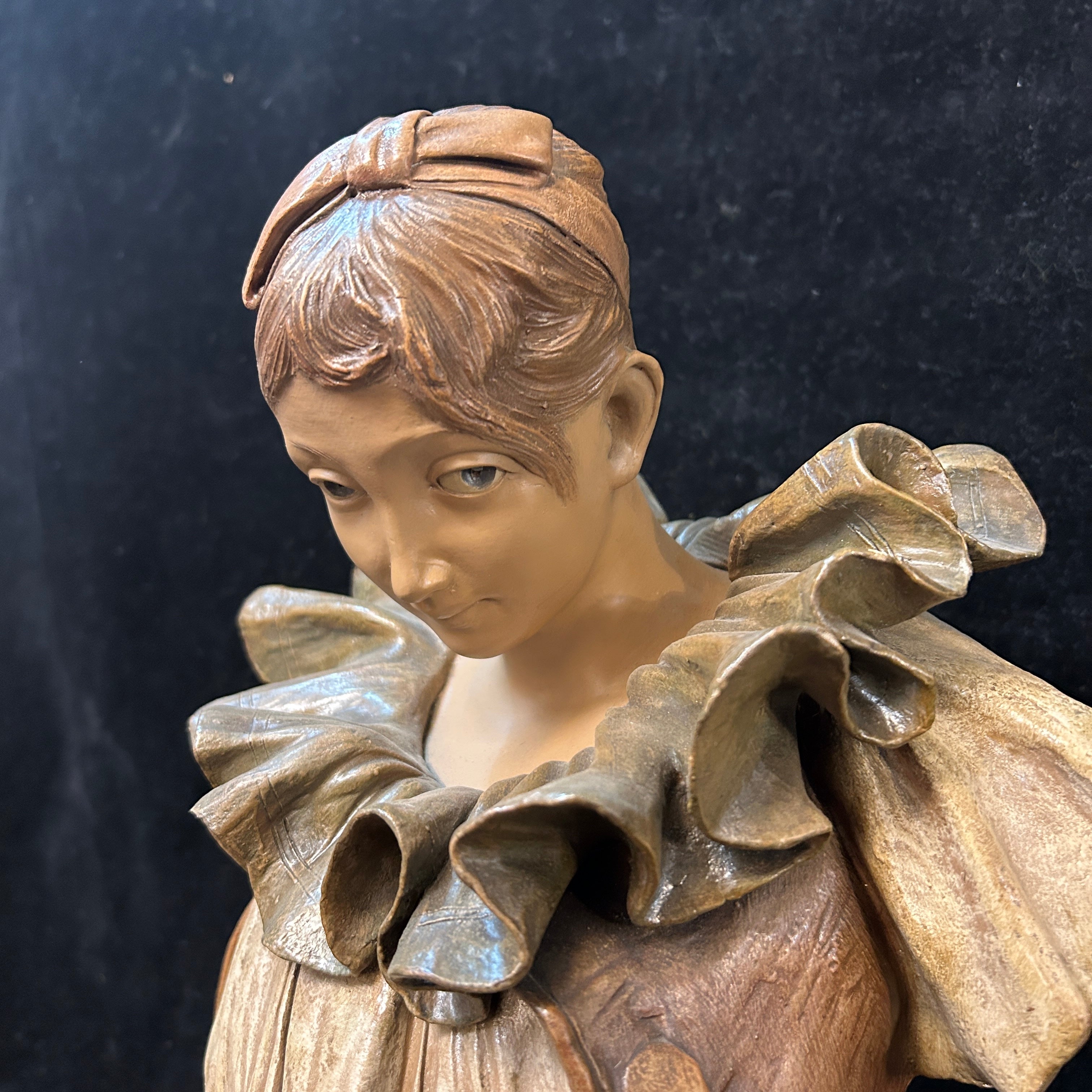 Bello busto francés en terracota patinada, representando a una mujer con camisa y cuello isabelino. Con un complejo gesto, que puede ser leído como timidez a la vez que picardía, esta figura y su sugiere una relación con la tradición del teatro italiano de la Comedia dell’ Arte o su adaptación en el teatro francés como La Comédie Française. El personaje de la Colombina, personaje que no utiliza máscara, cumple el rol de compañera y musa entre los sirvientes, tentación y cebo para los viejos, confidente y aliada de los jóvenes. El busto se encuentra numerado en su parte posterior.