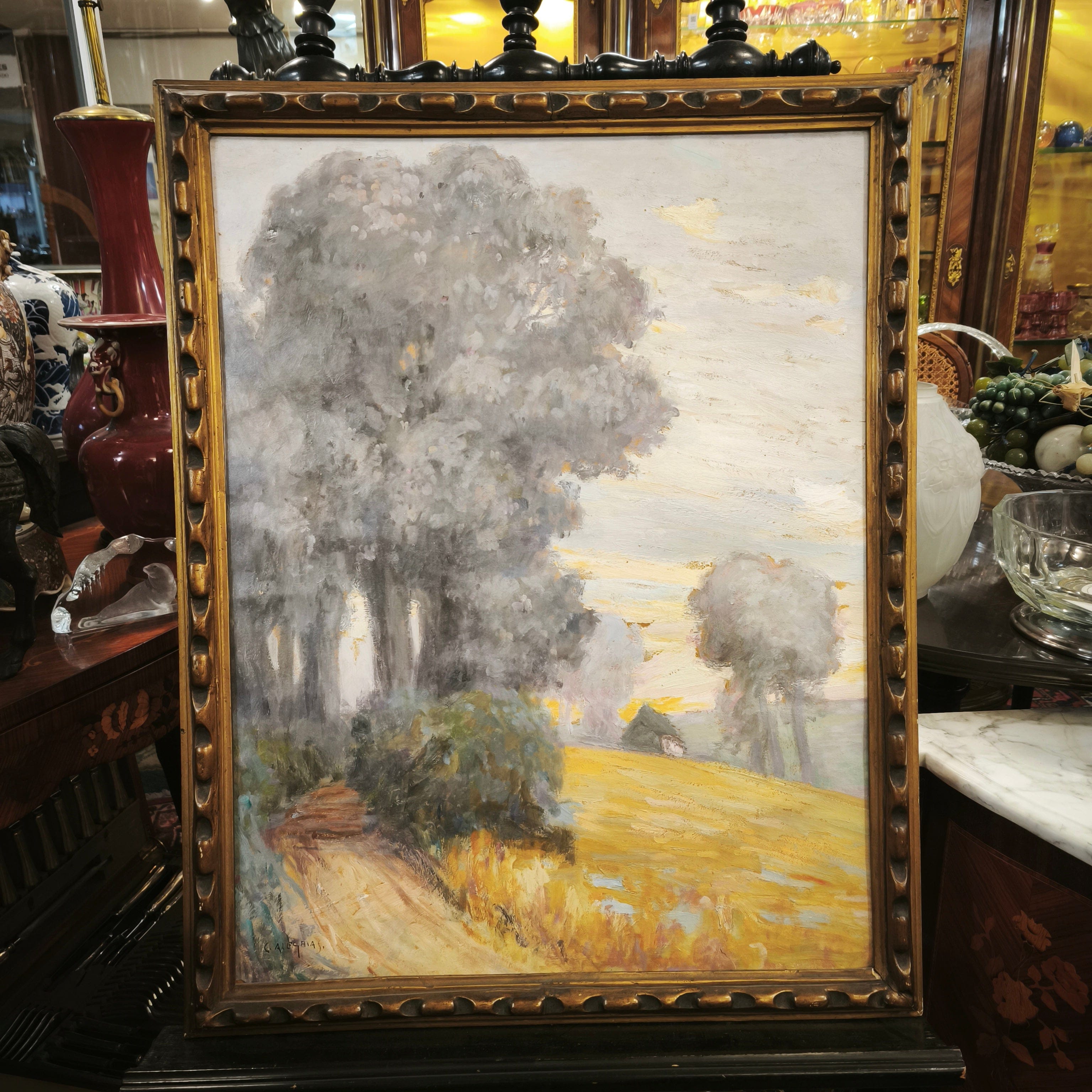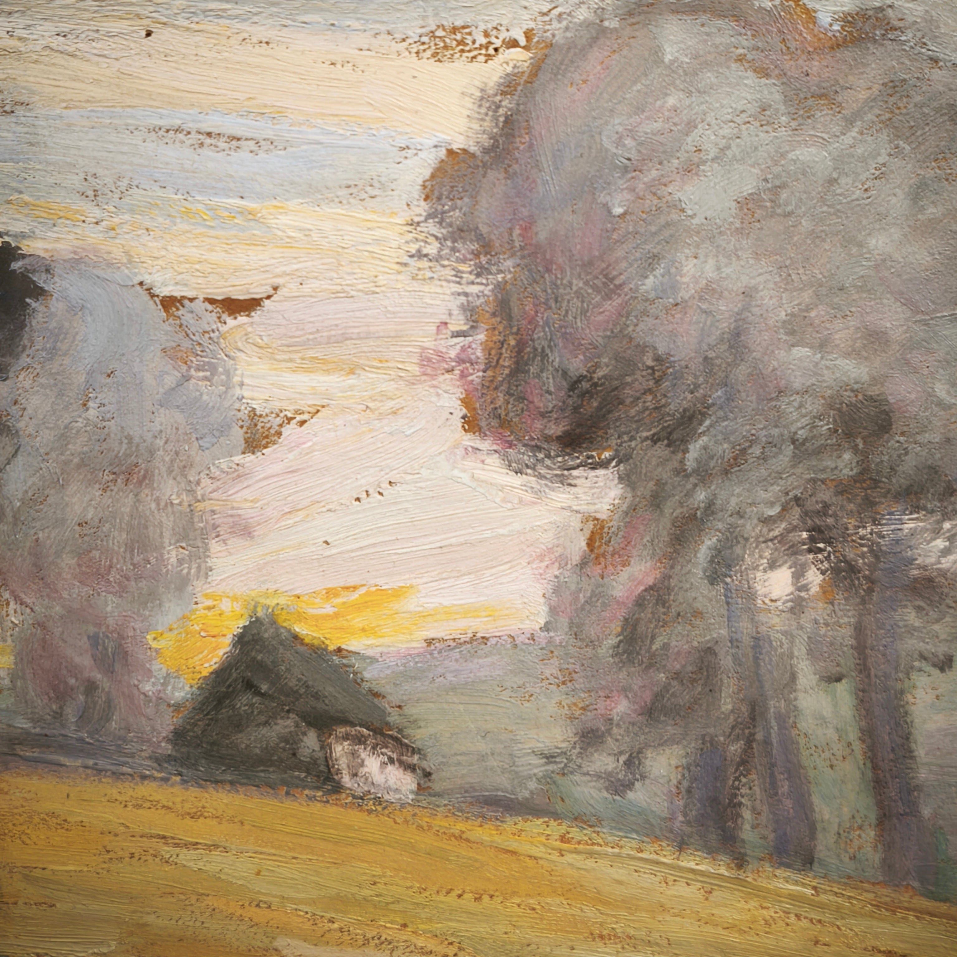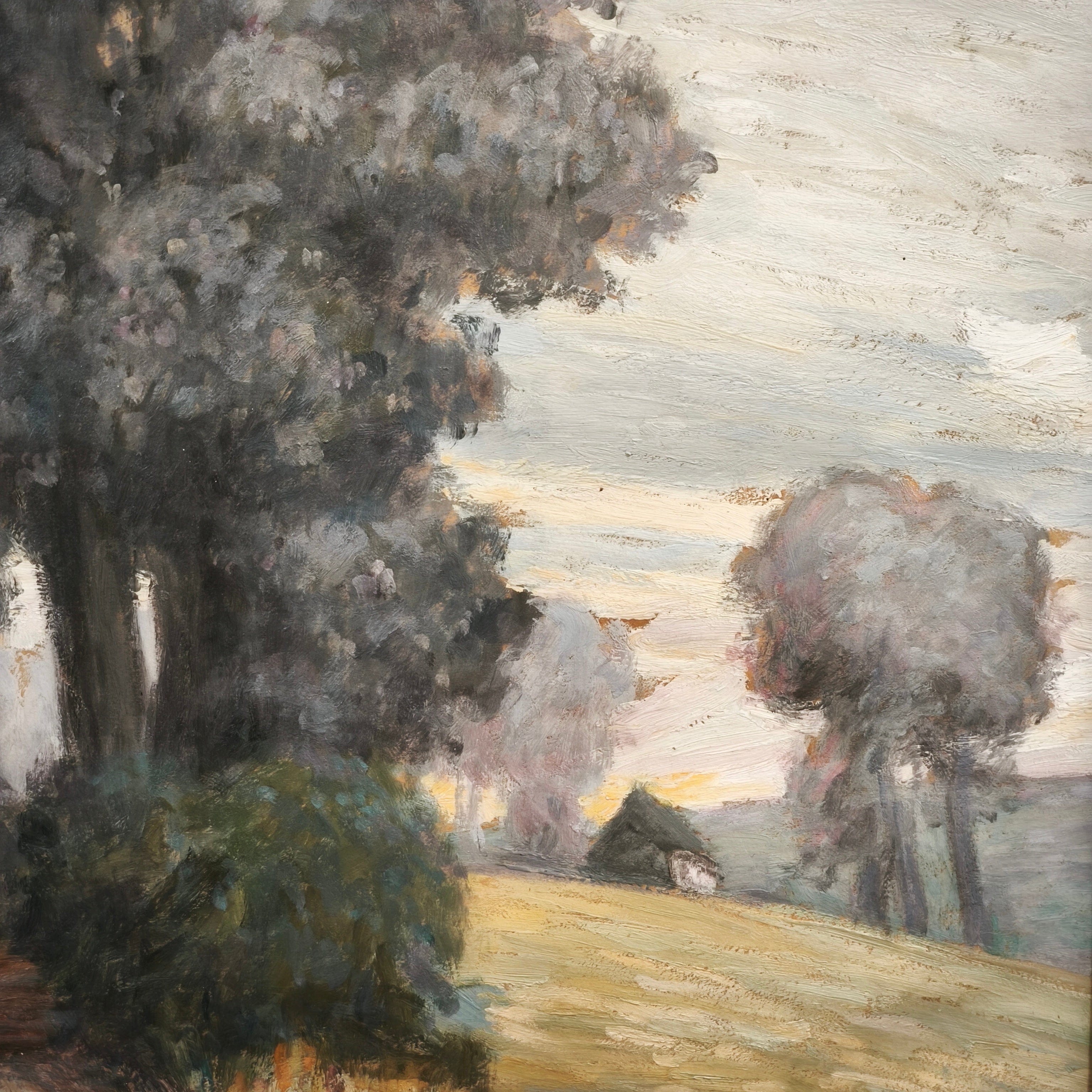 En esta obra vemos un paisaje rural con una casa al fondo iluminada por un cielo que por sus colores amarillos y naranjos pareciera retratar un atardecer.