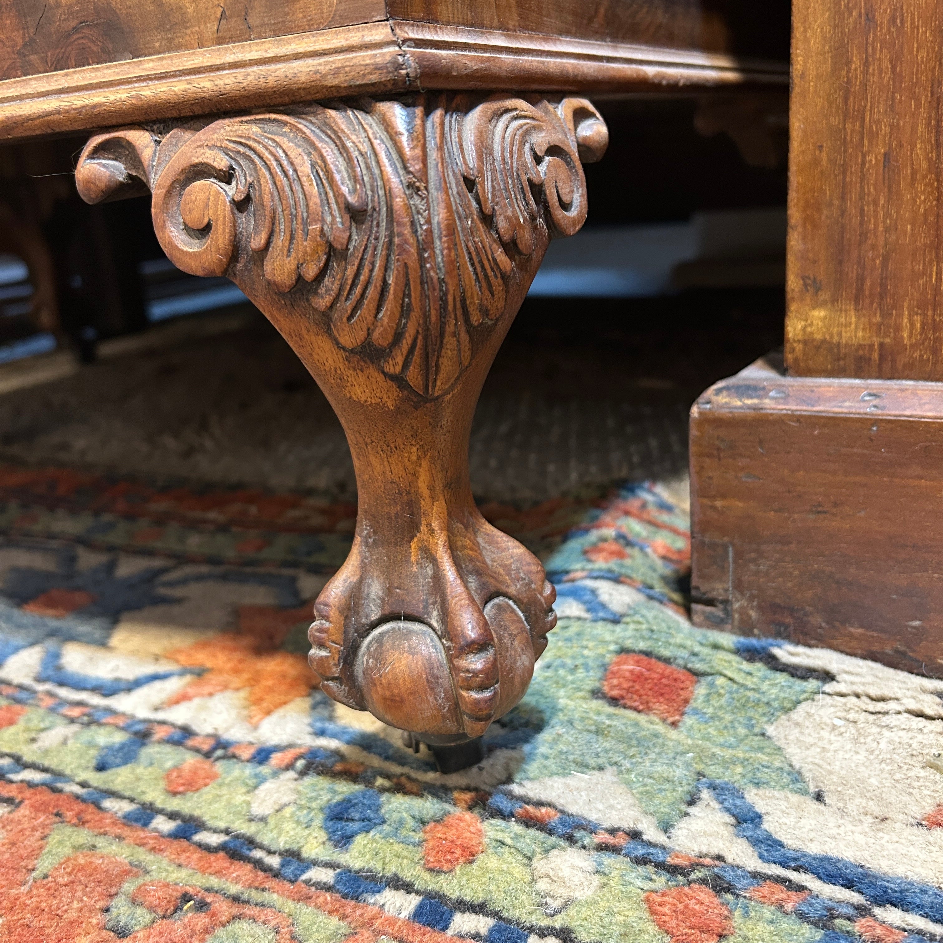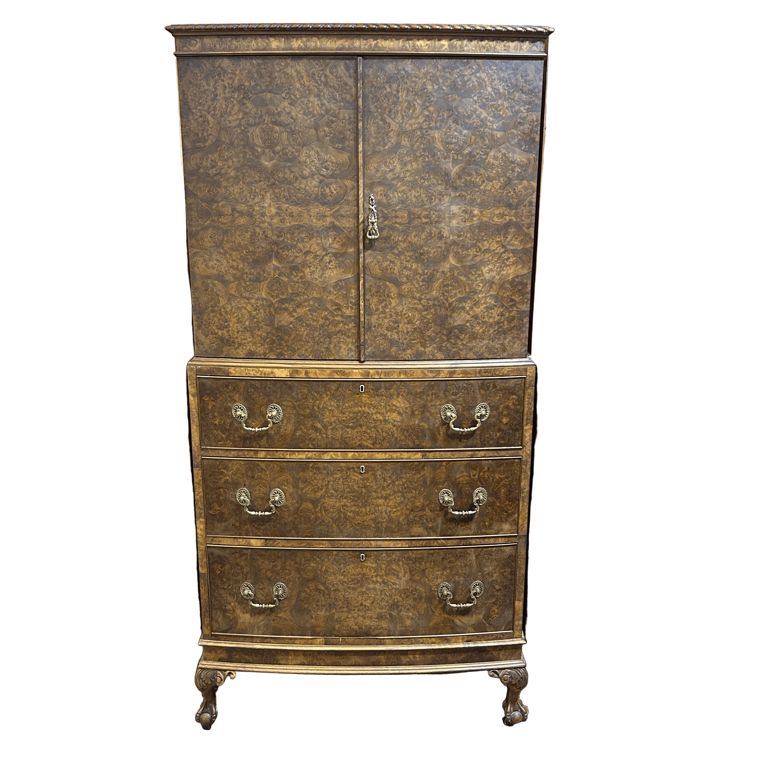 Espléndido cabinet chiffonier inglés Chippendale con nogal y raíz de nogal en su exterior y caoba satinada en su interior. La superficie realza la textura de la madera. Tiene un amplio espacio con doble puerta y llave, ideal para usar como licorera o mueble bar. Además posee tres cajoneras inferiores con sus tiradores de bronce originales. El cajón inferior es más profundo que los dos superiores. Las patas tienen forma de garra de águila talladas manualmente, vienen con ruedas para facilitar su desplazamiento. Su cubierta tiene un trenzado de nogal en todo su borde exterior que le entrega una hermosa terminación. El mueble posiblemente es de la mitad del siglo XX.