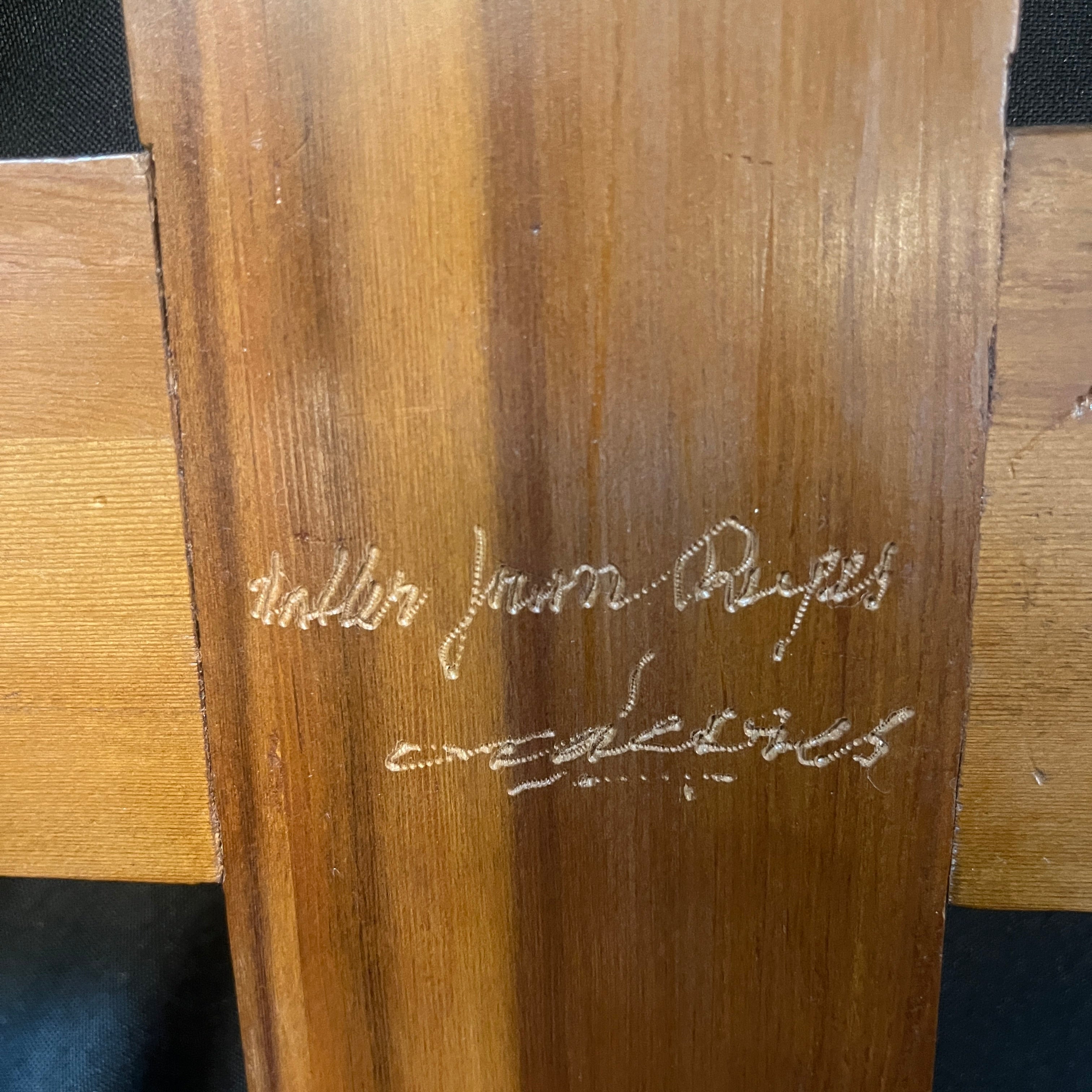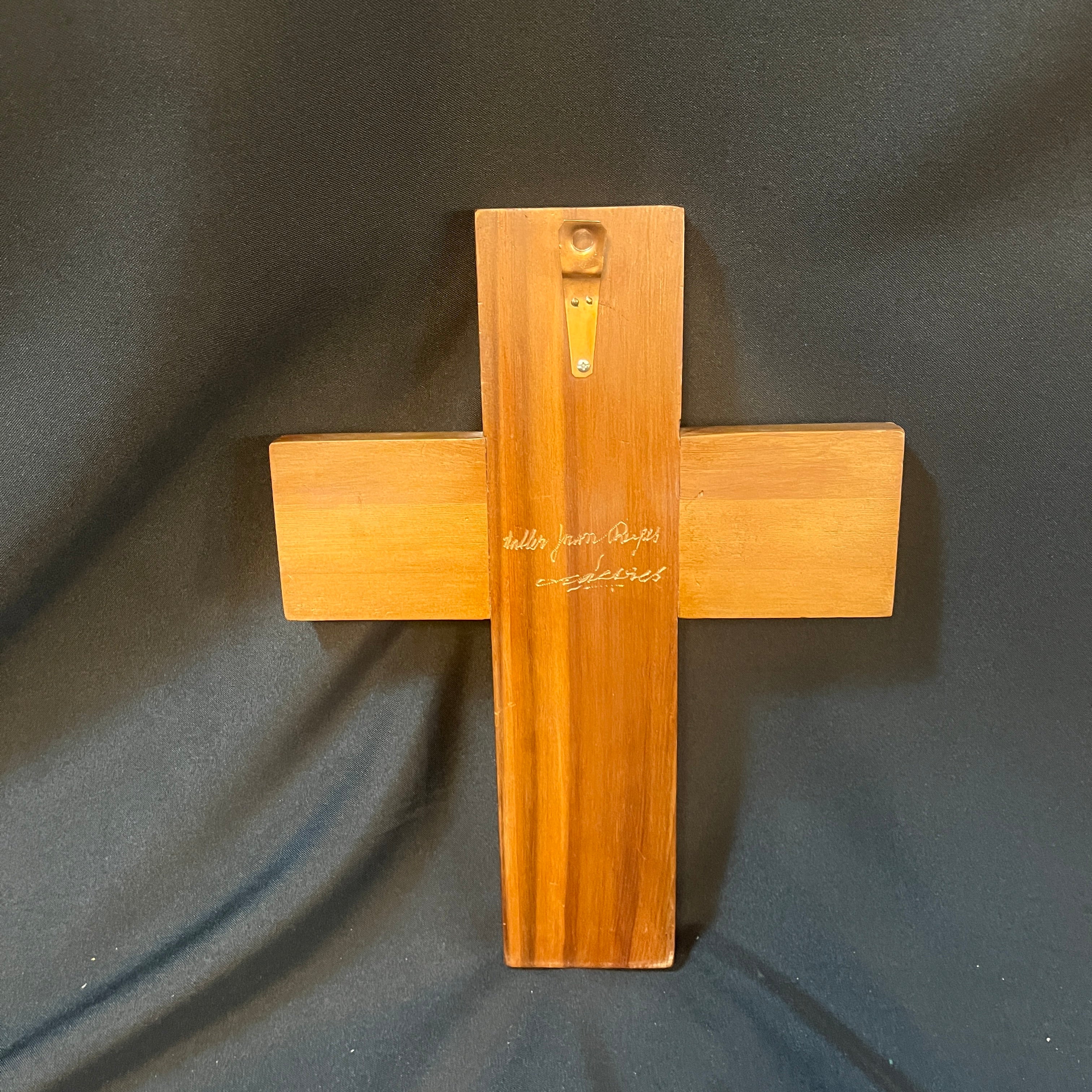 Particular cruz realizada por los artesanos urbanos Alicia Cáceres (destacada con la Orden al Mérito Artístico y Cultural Pablo Neruda) y Juan Reyes firmada como "taller Juan Reyes Cáceres". La pieza es una cruz de madera con otra cruz superpuesta en bronce con bellísimas incrustaciones en lapislázuli, turquesa y ágata. El bronce al buril, otorga estas "estrías" irregulares en toda su superficie que se mezclan con las piedras. En su parte trasera tiene la firma de ambos artistas "Taller Juan Reyes Cáceres".
