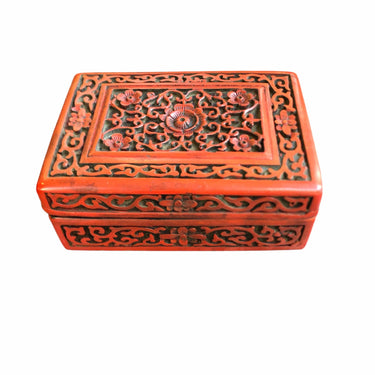Hermosa y antigua caja rectangular china, lacada y finamente tallada.