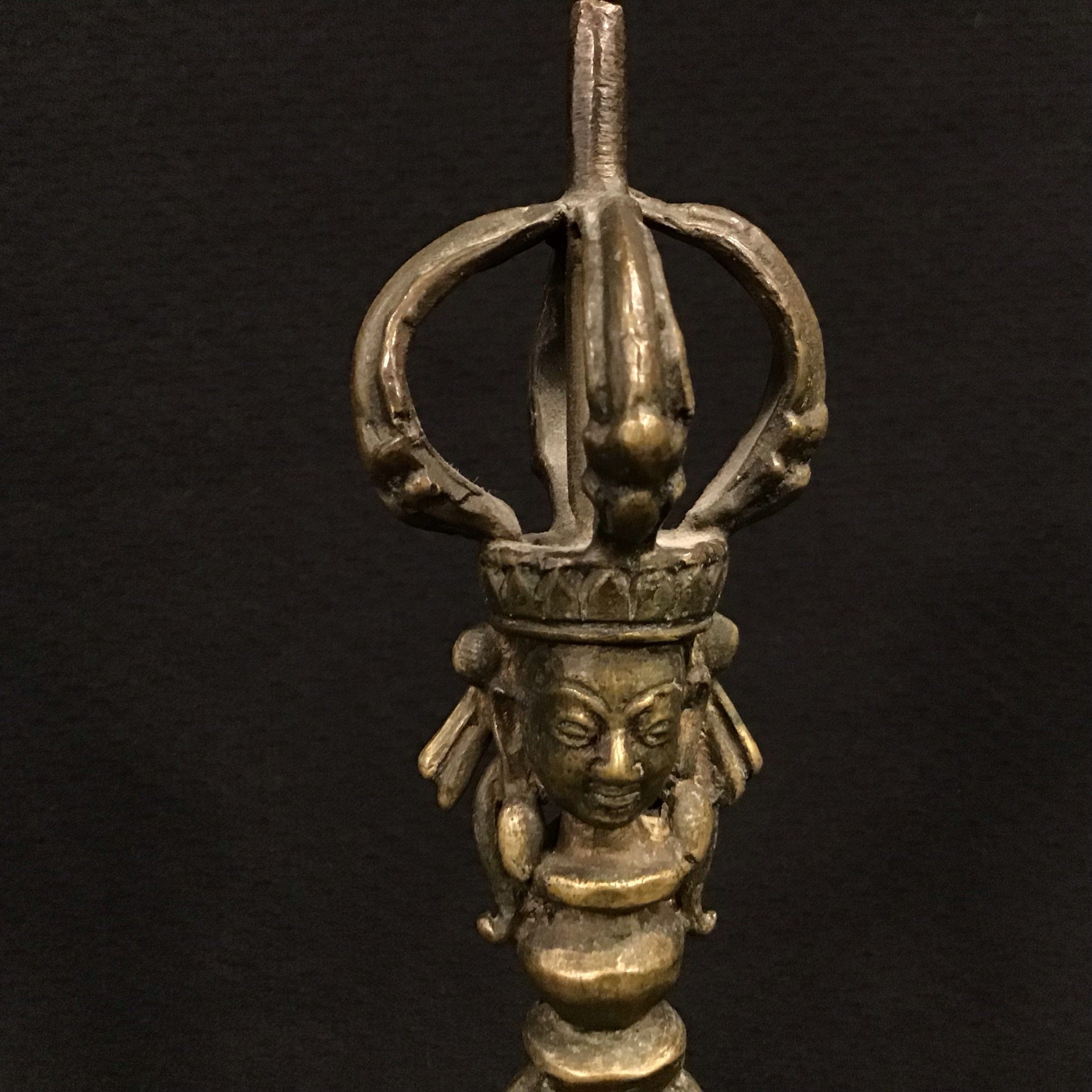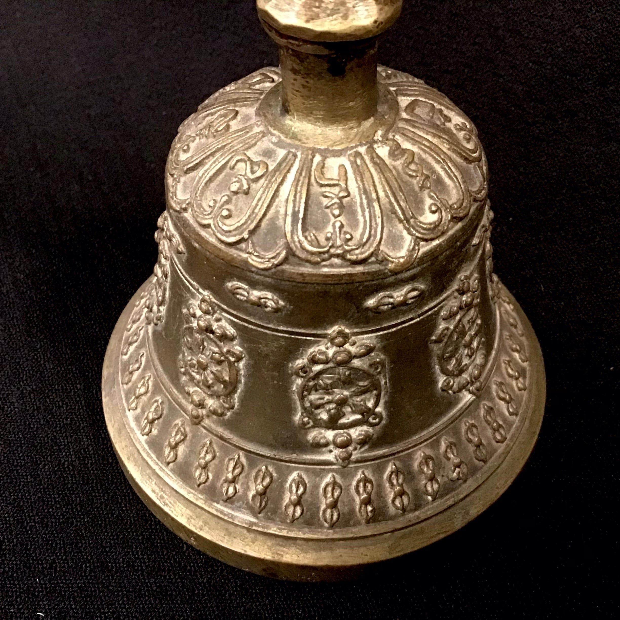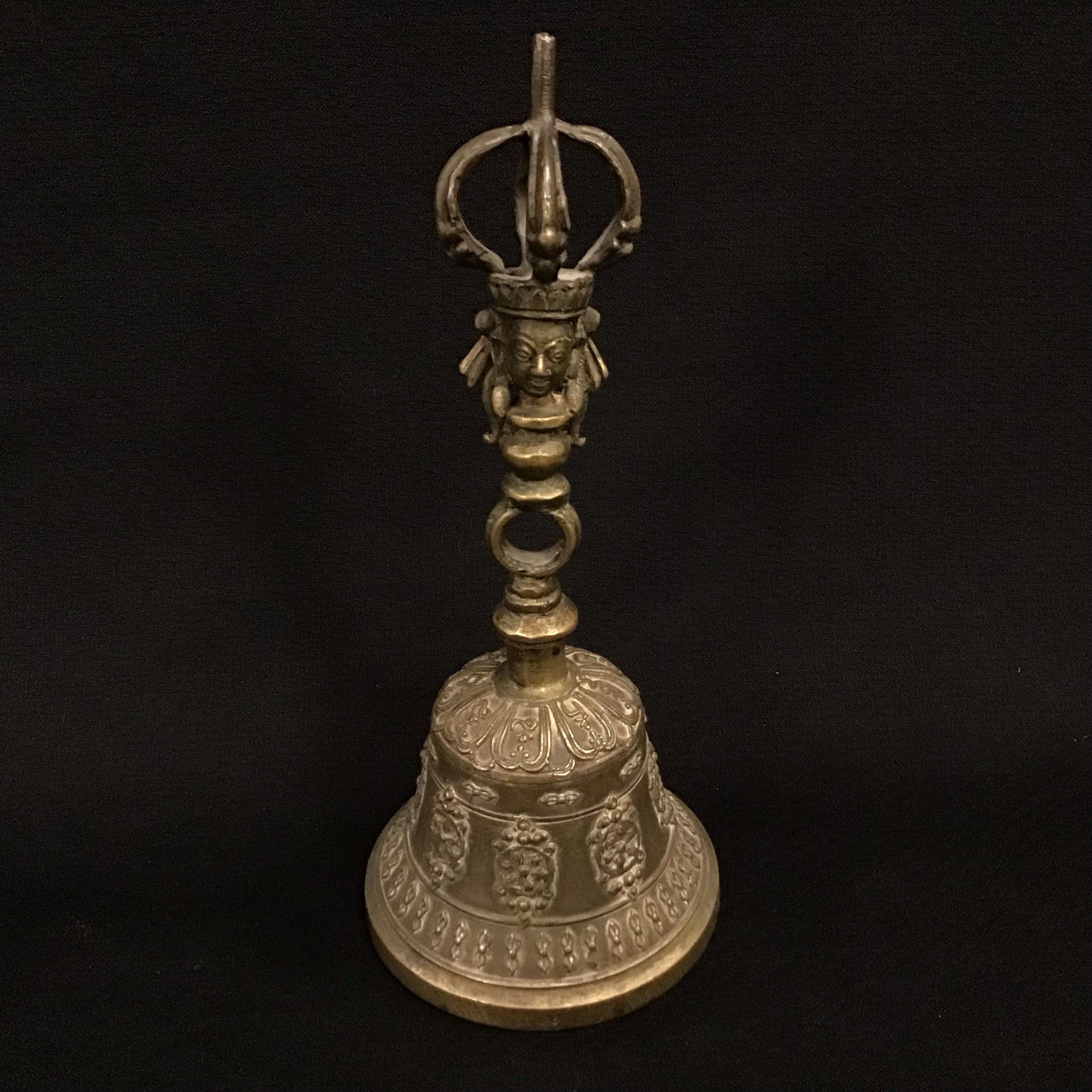 Campana de bronce con corona y rostro en el mango. El cuerpo de la campana tiene figuras en relieve.