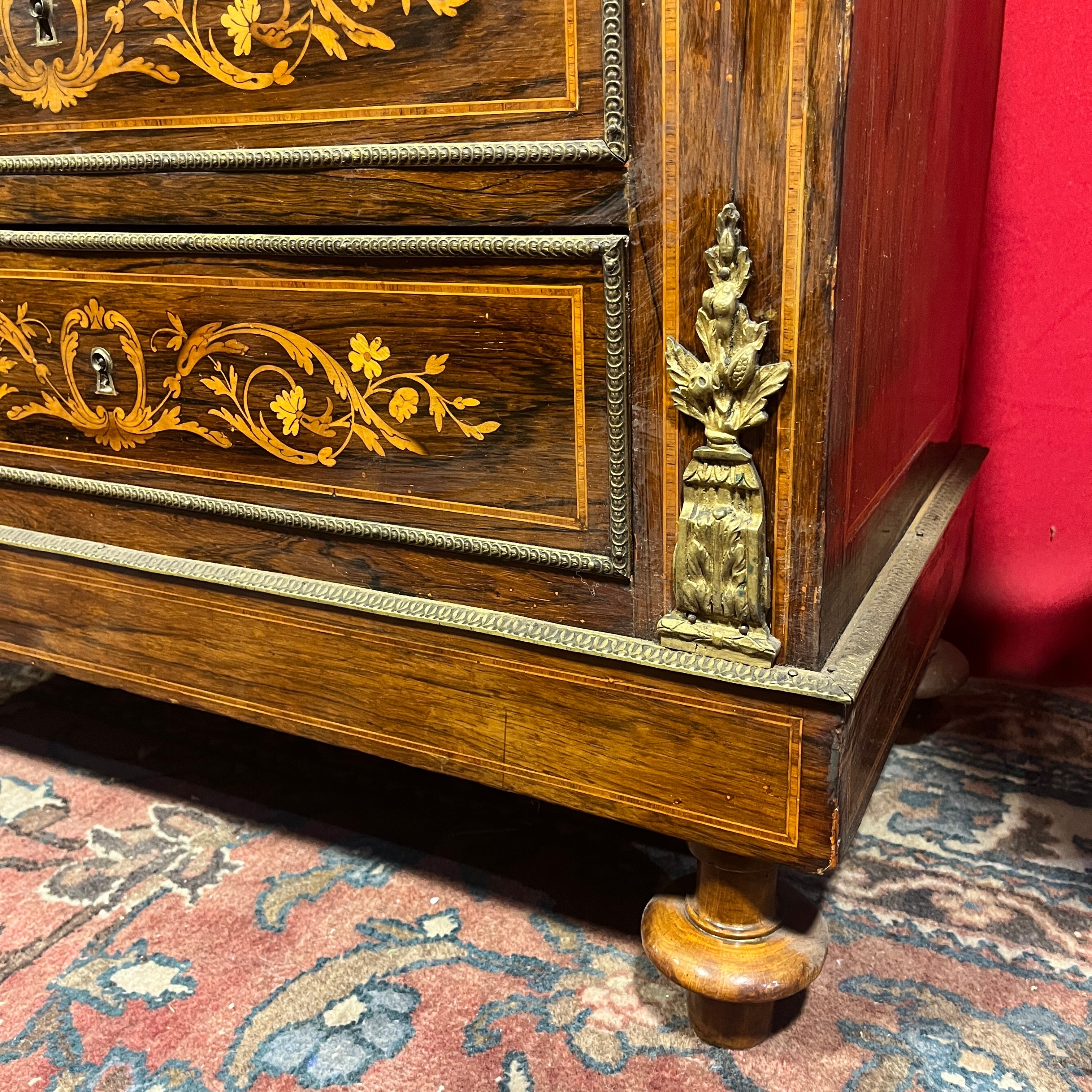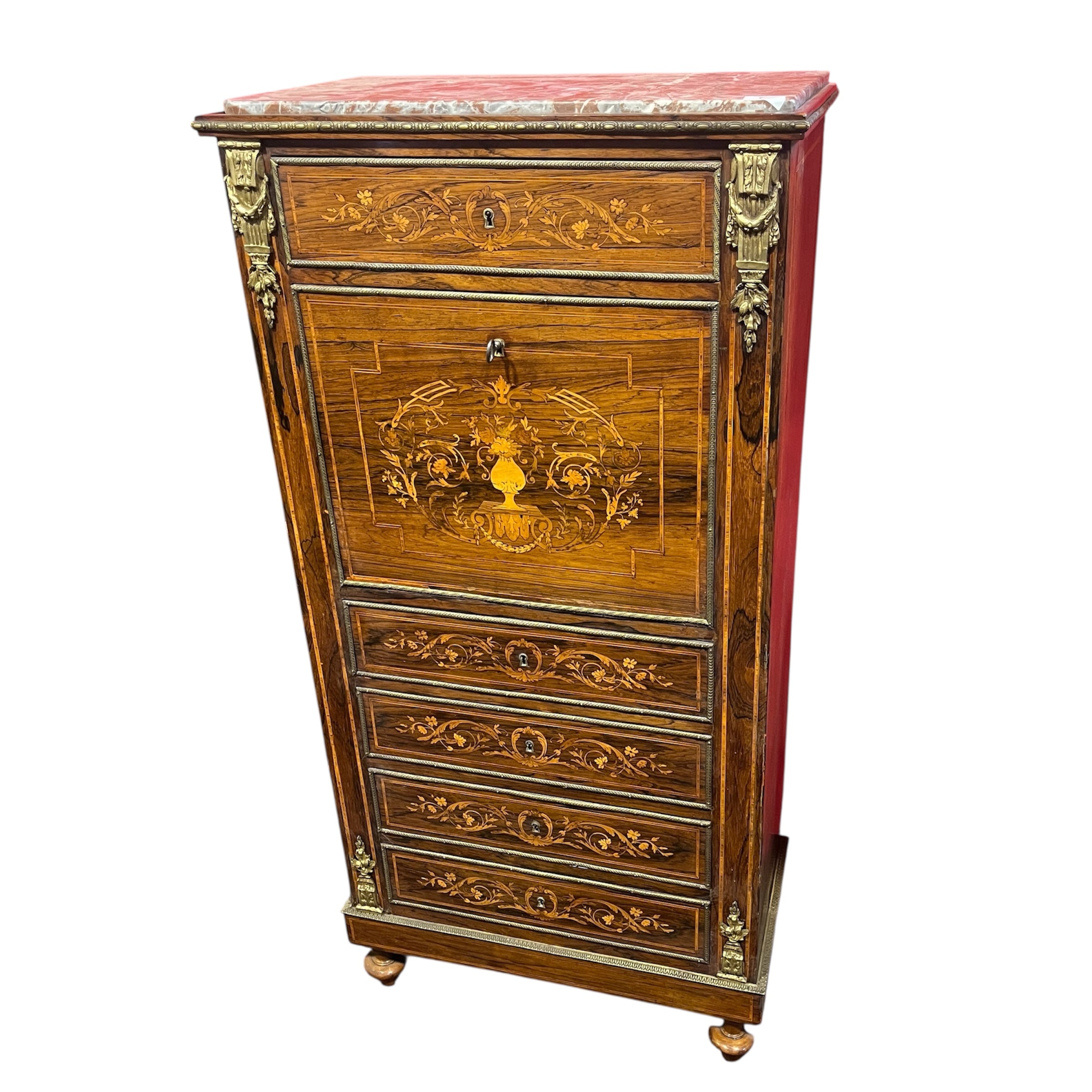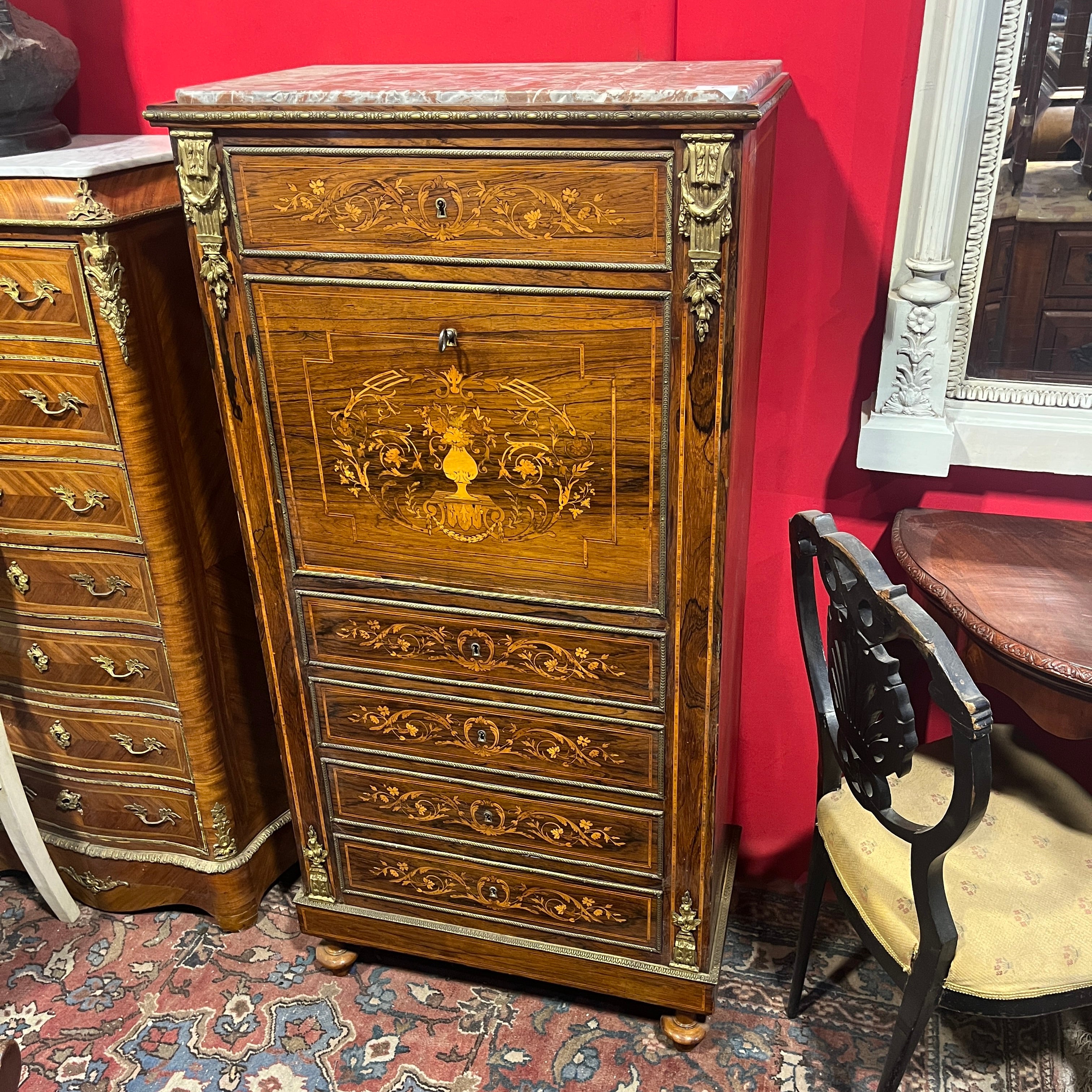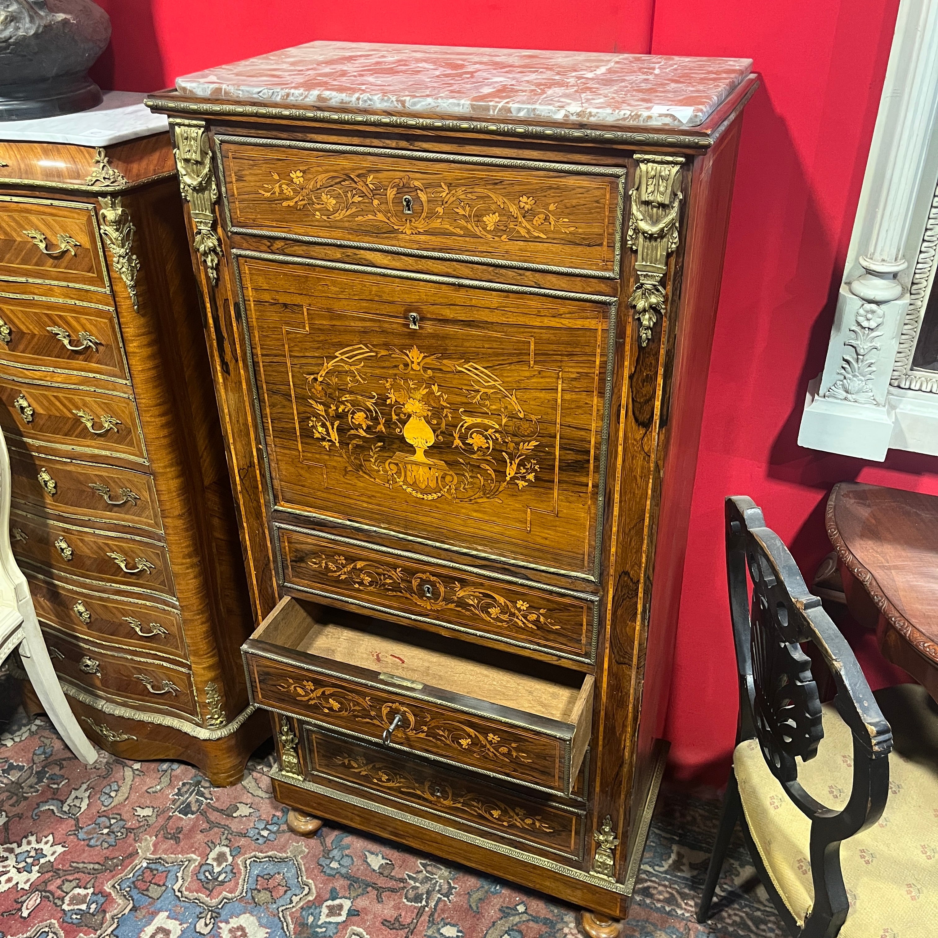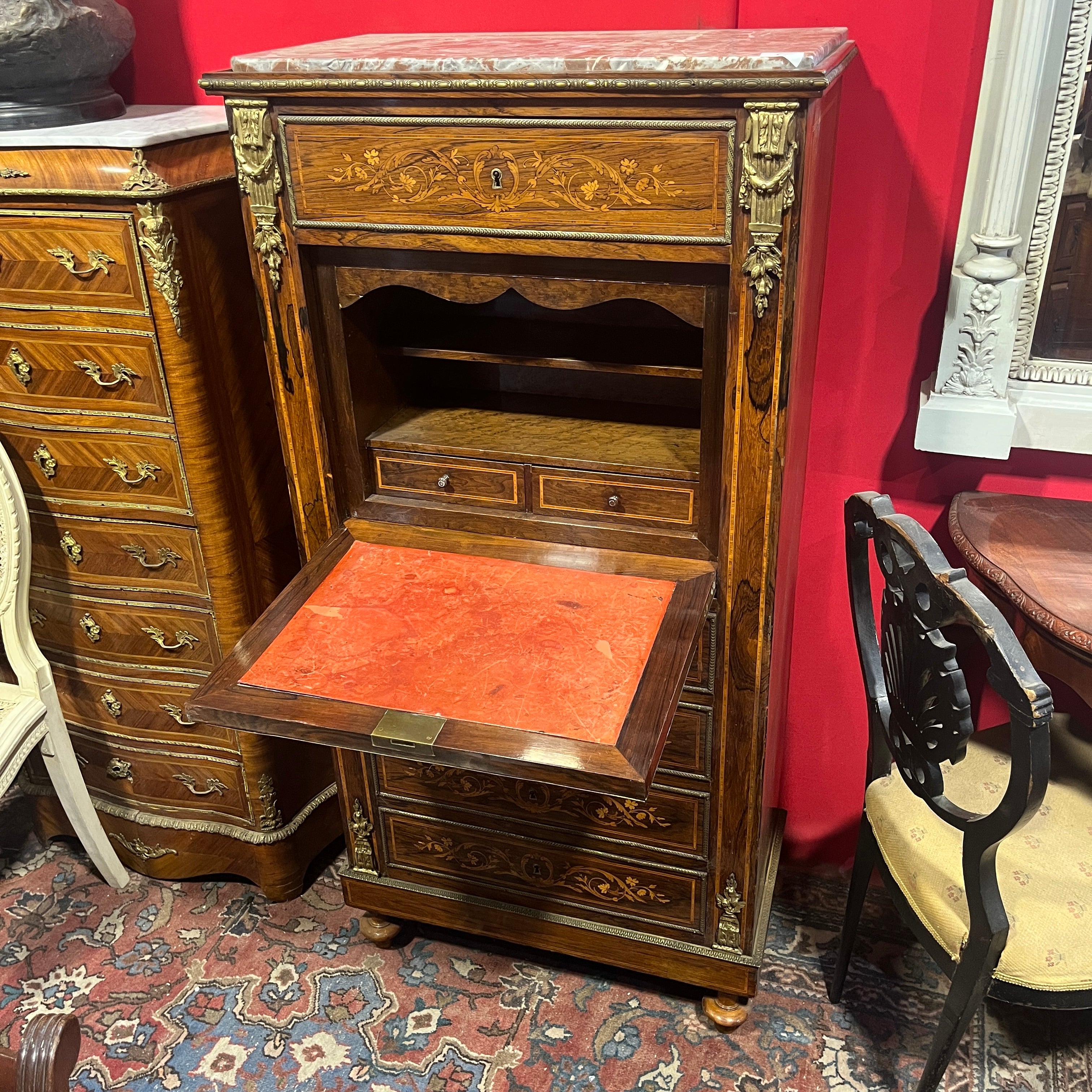 Elegante Chiffonier francés estilo Luis XVI con fina marquetería floral, aplicaciones en bronce, cubierta de mármol y escritorio interior de cuero ruleteado de color rojo. La pieza tiene un cajón superior, cuatro cajones inferiores y una puerta de acceso a su zona de escritorio, con dos cajoncitos menores y una cubierta de cuero.