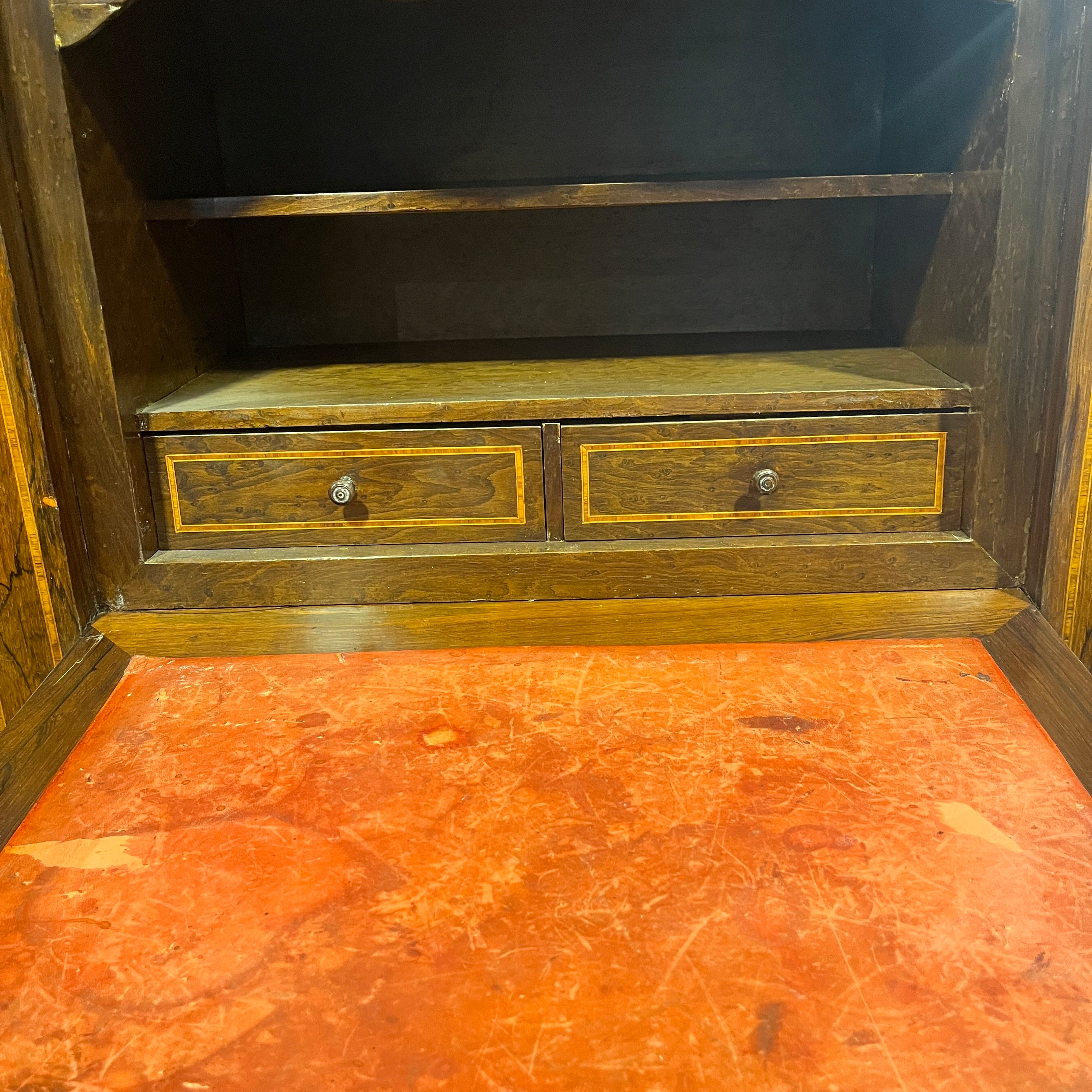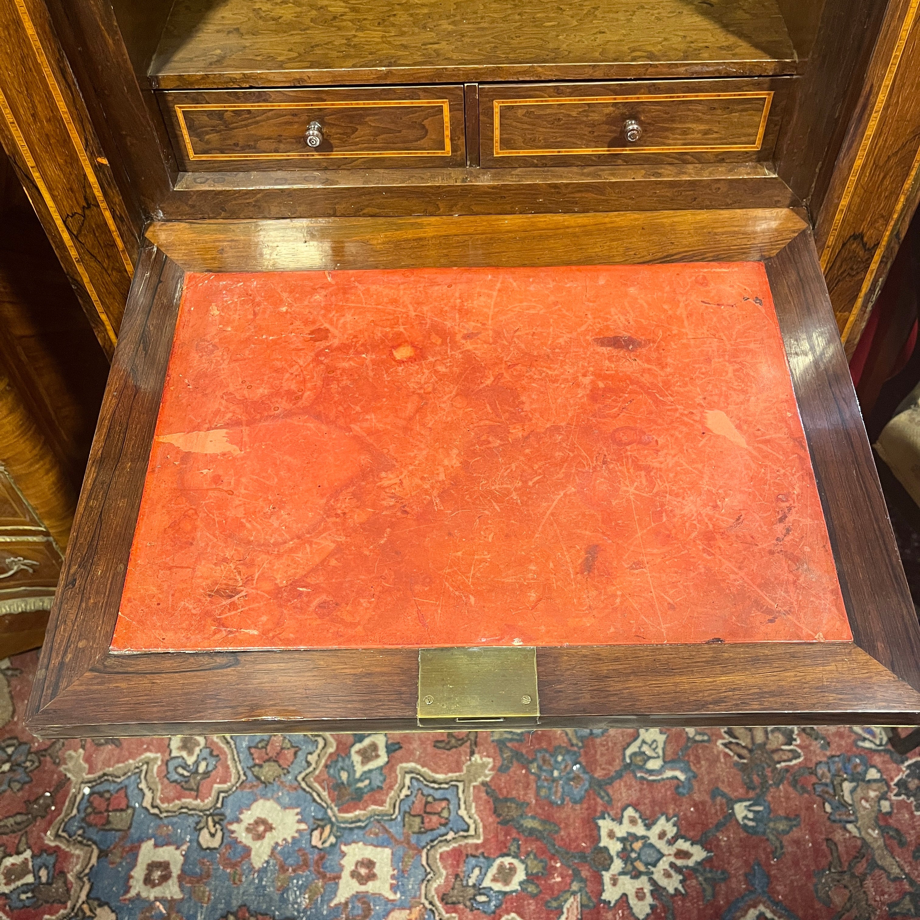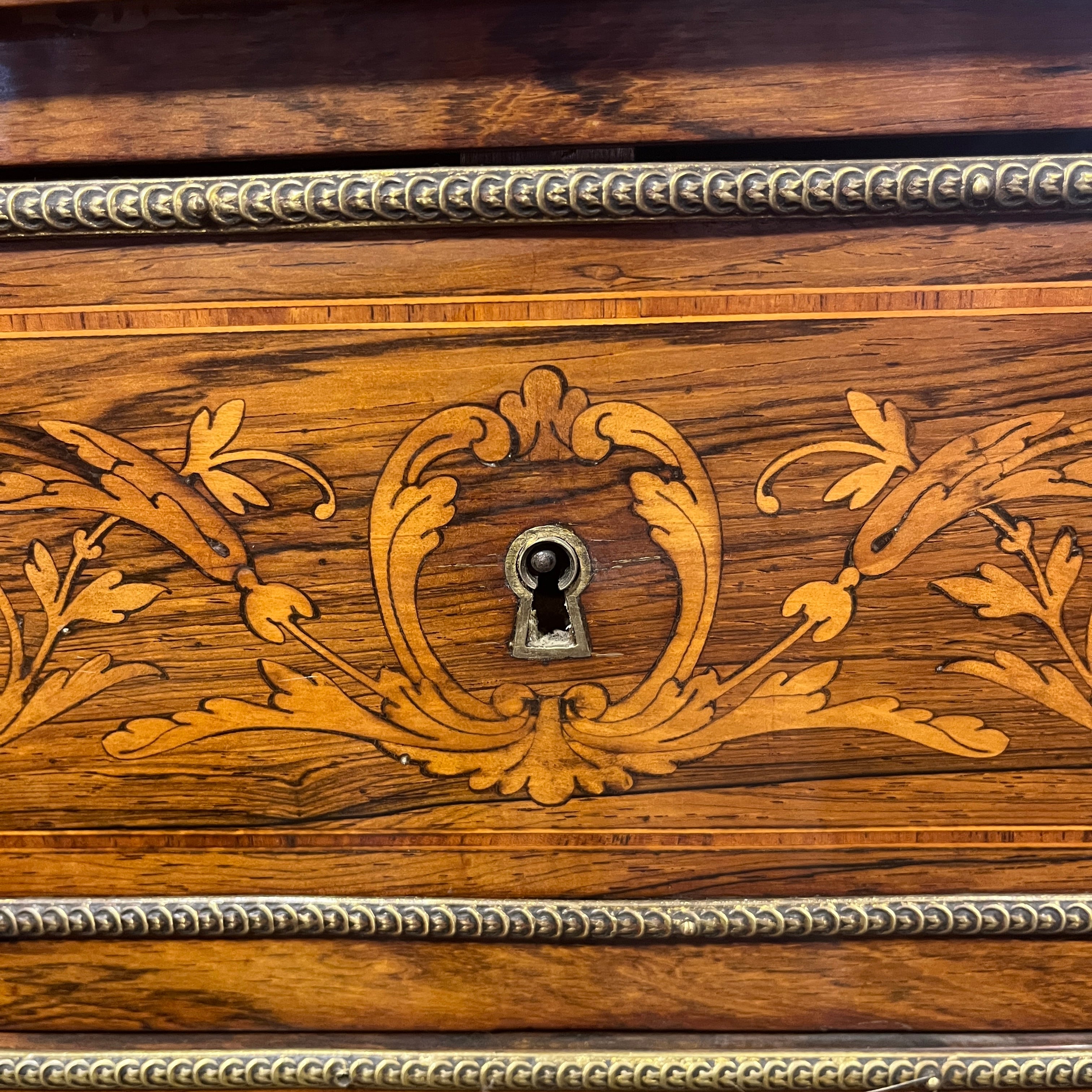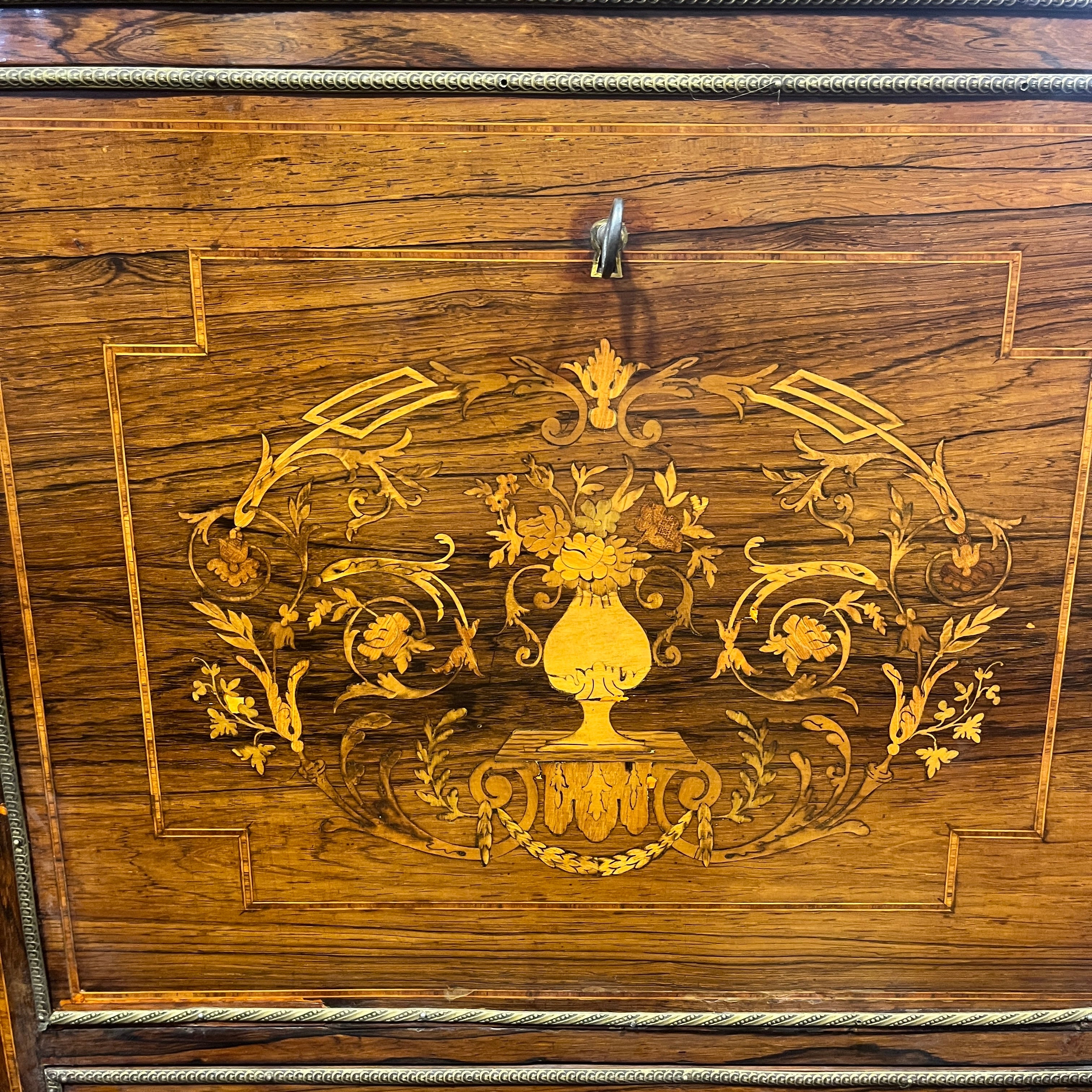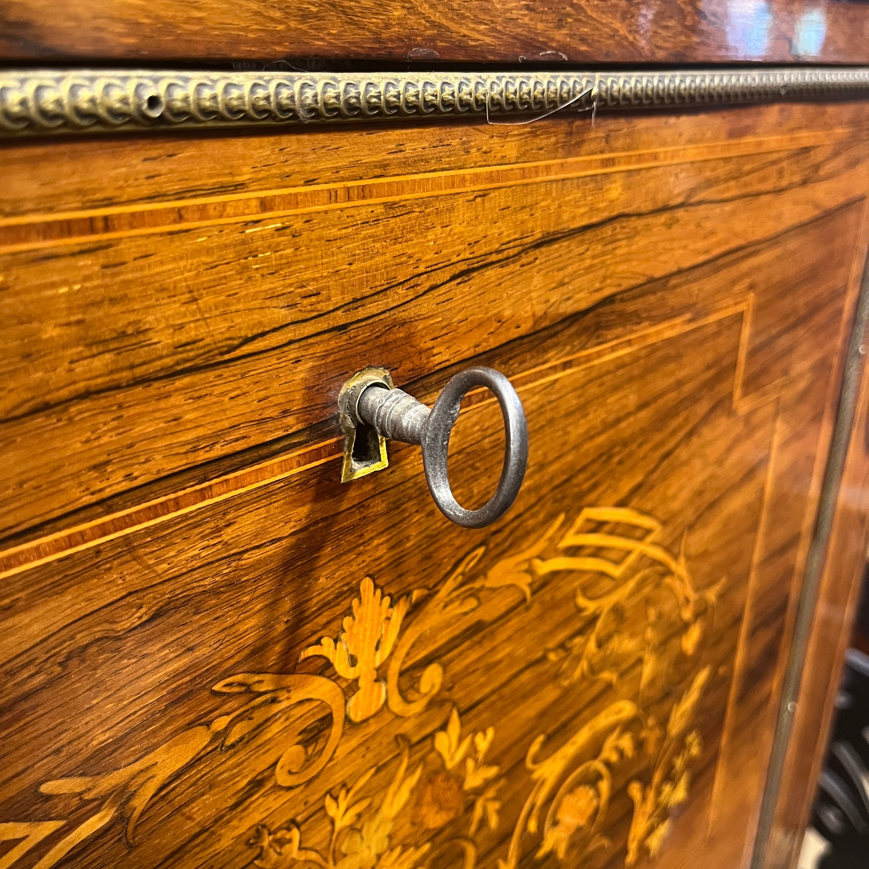 Elegante Chiffonier francés estilo Luis XVI con fina marquetería floral, aplicaciones en bronce, cubierta de mármol y escritorio interior de cuero ruleteado de color rojo. La pieza tiene un cajón superior, cuatro cajones inferiores y una puerta de acceso a su zona de escritorio, con dos cajoncitos menores y una cubierta de cuero.