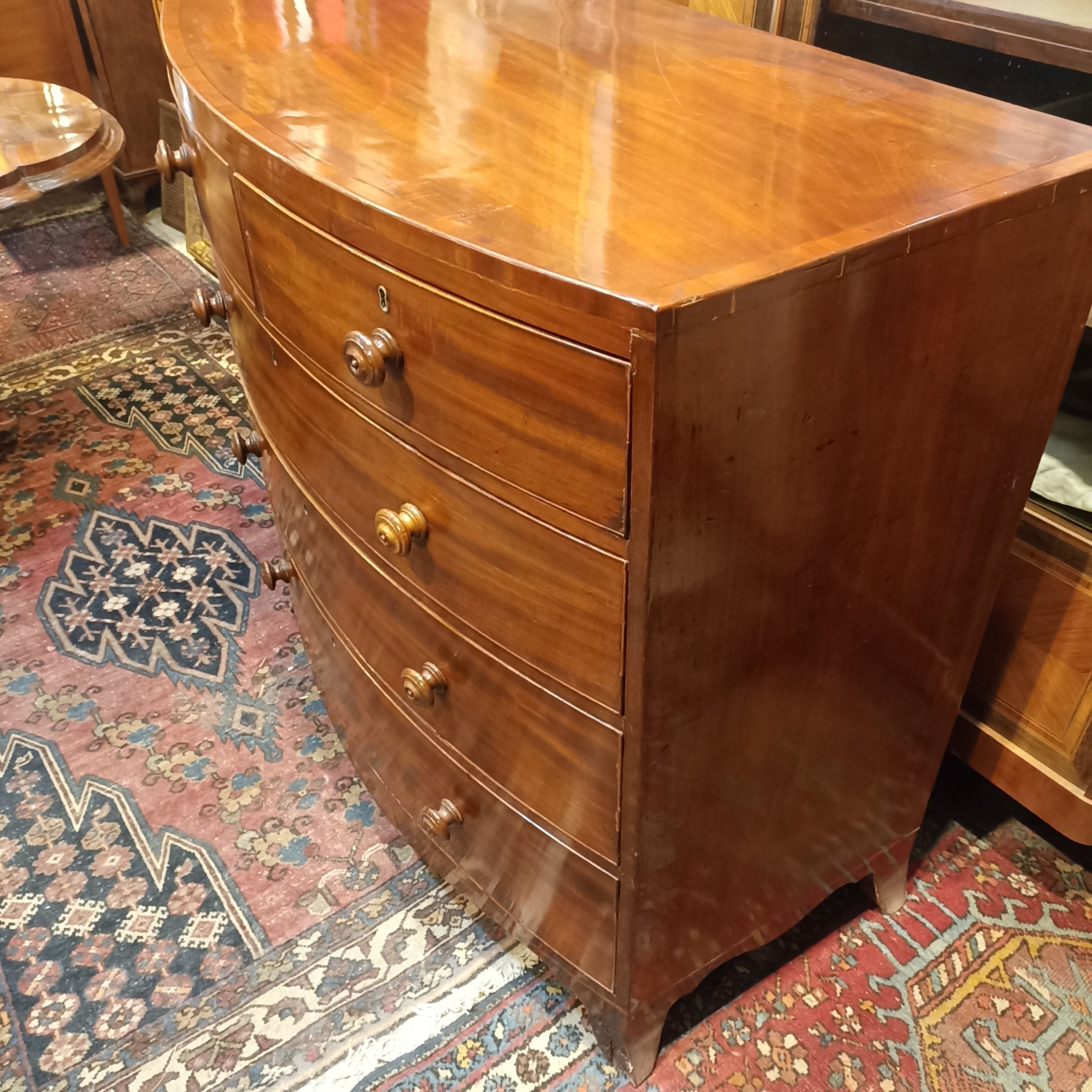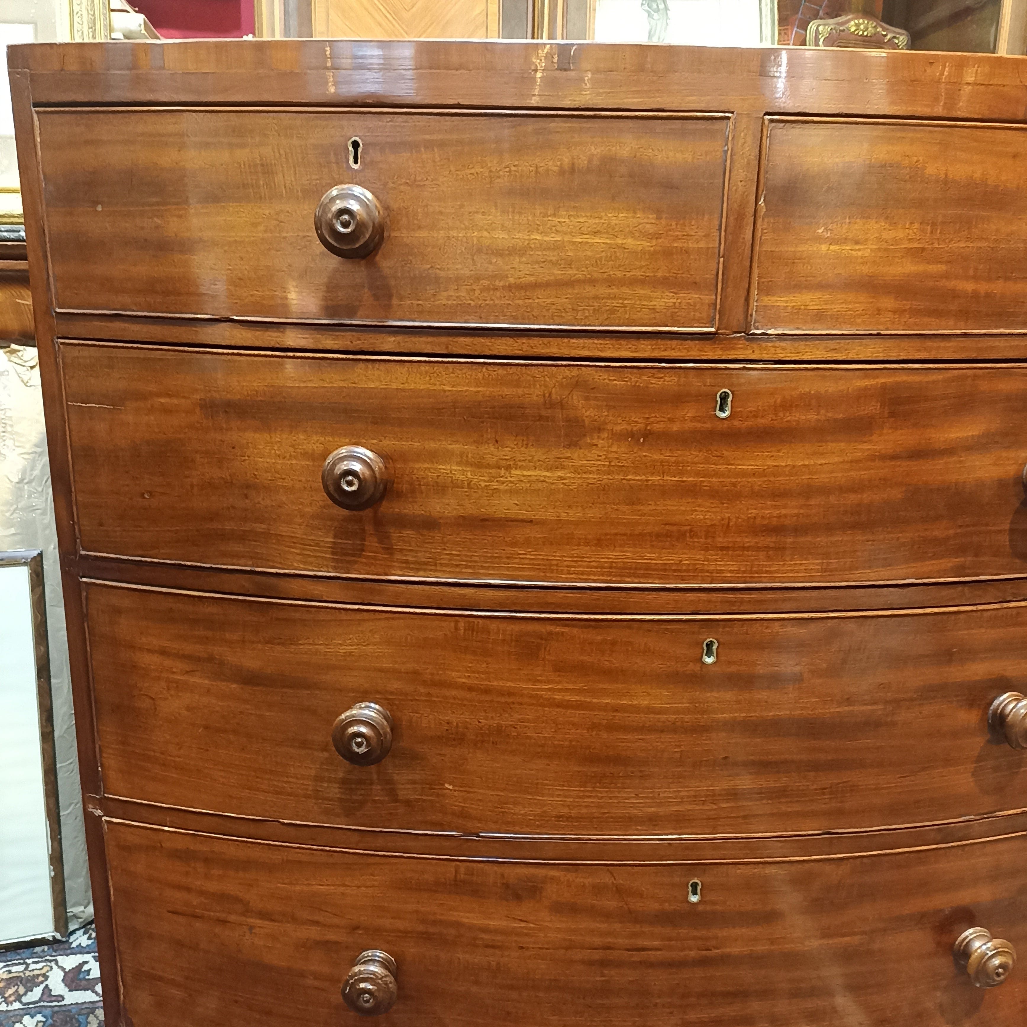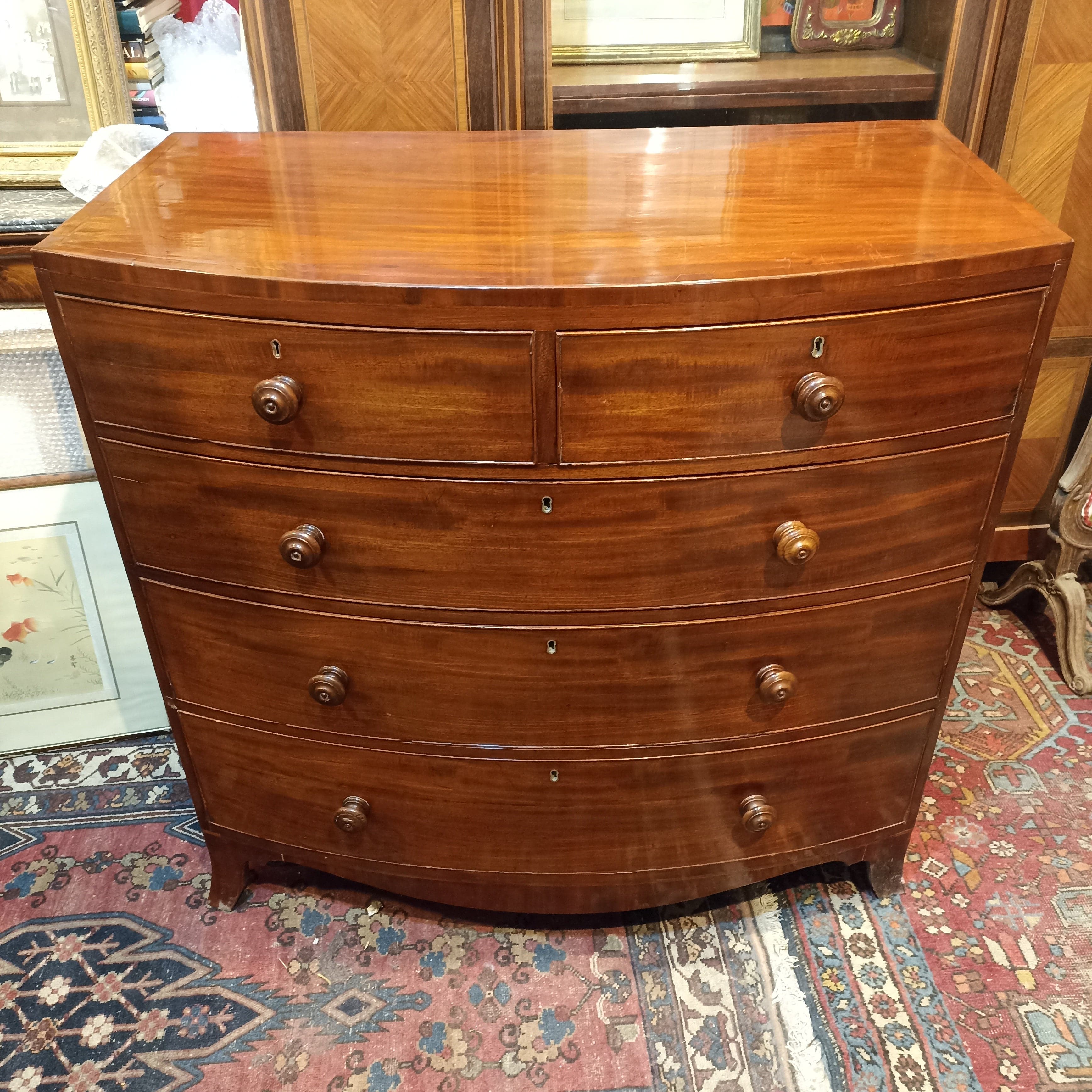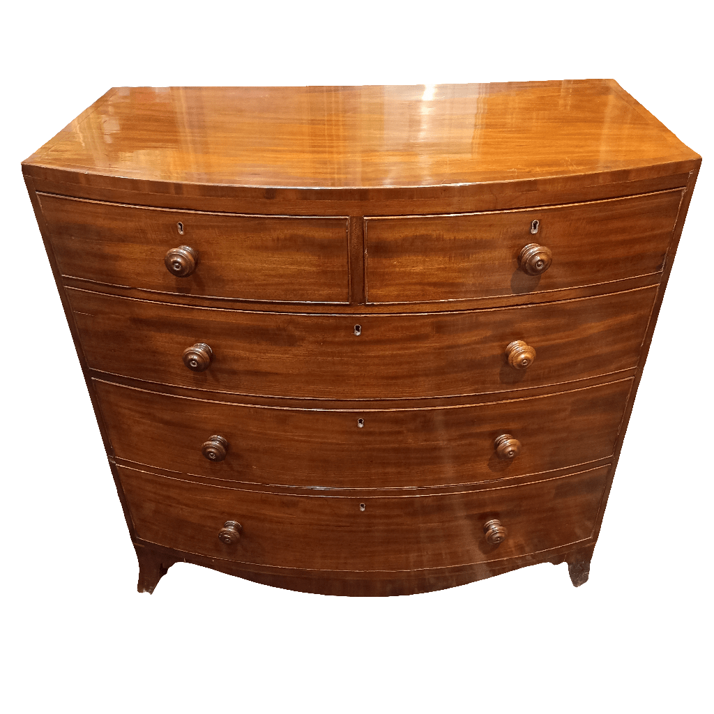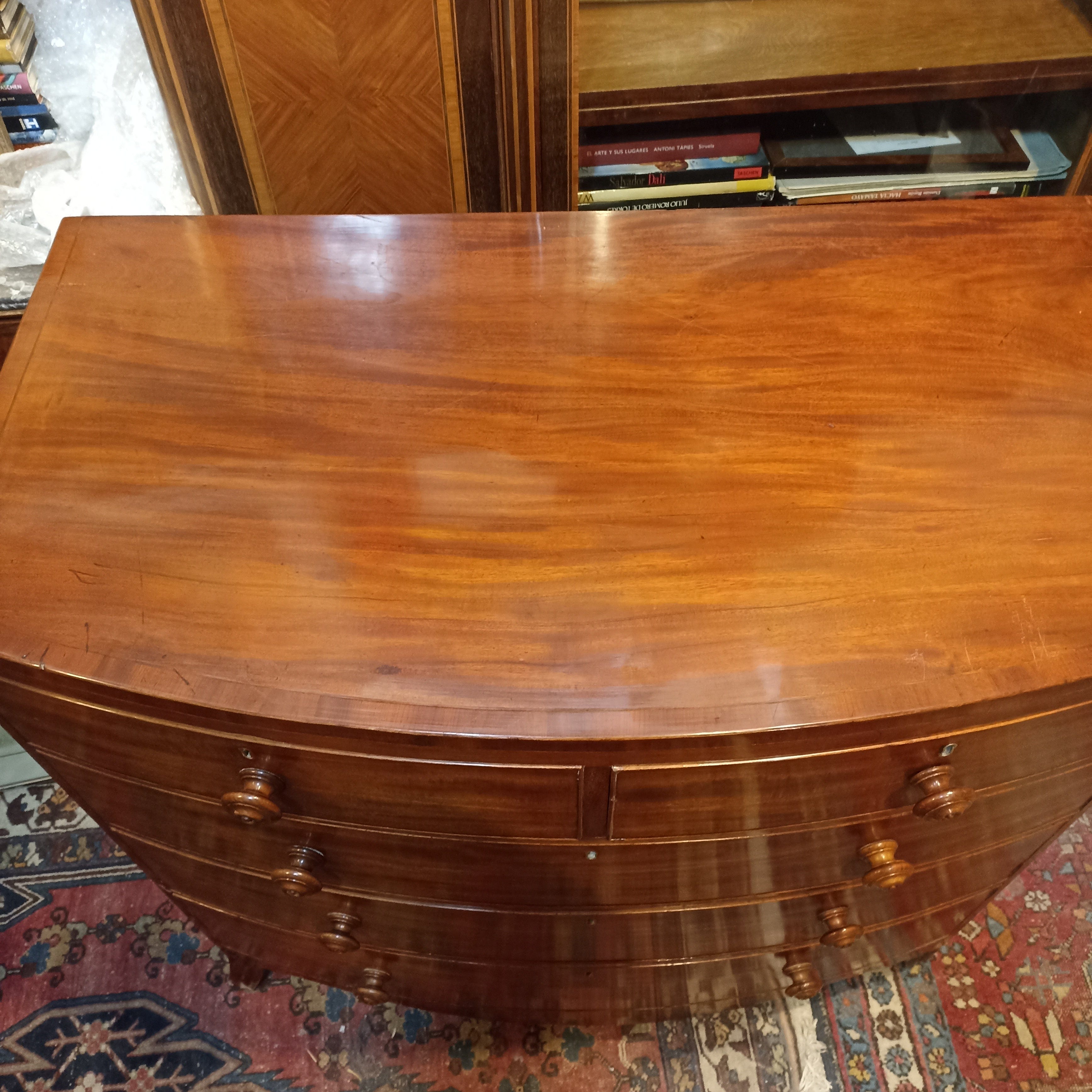 Elegante cómoda inglesa bombé, estilo Regencia, con sobrio diseño en Caoba y tiradores tallados. La pieza cuenta con dos cajones superiores medianos y tres cajons grandes.